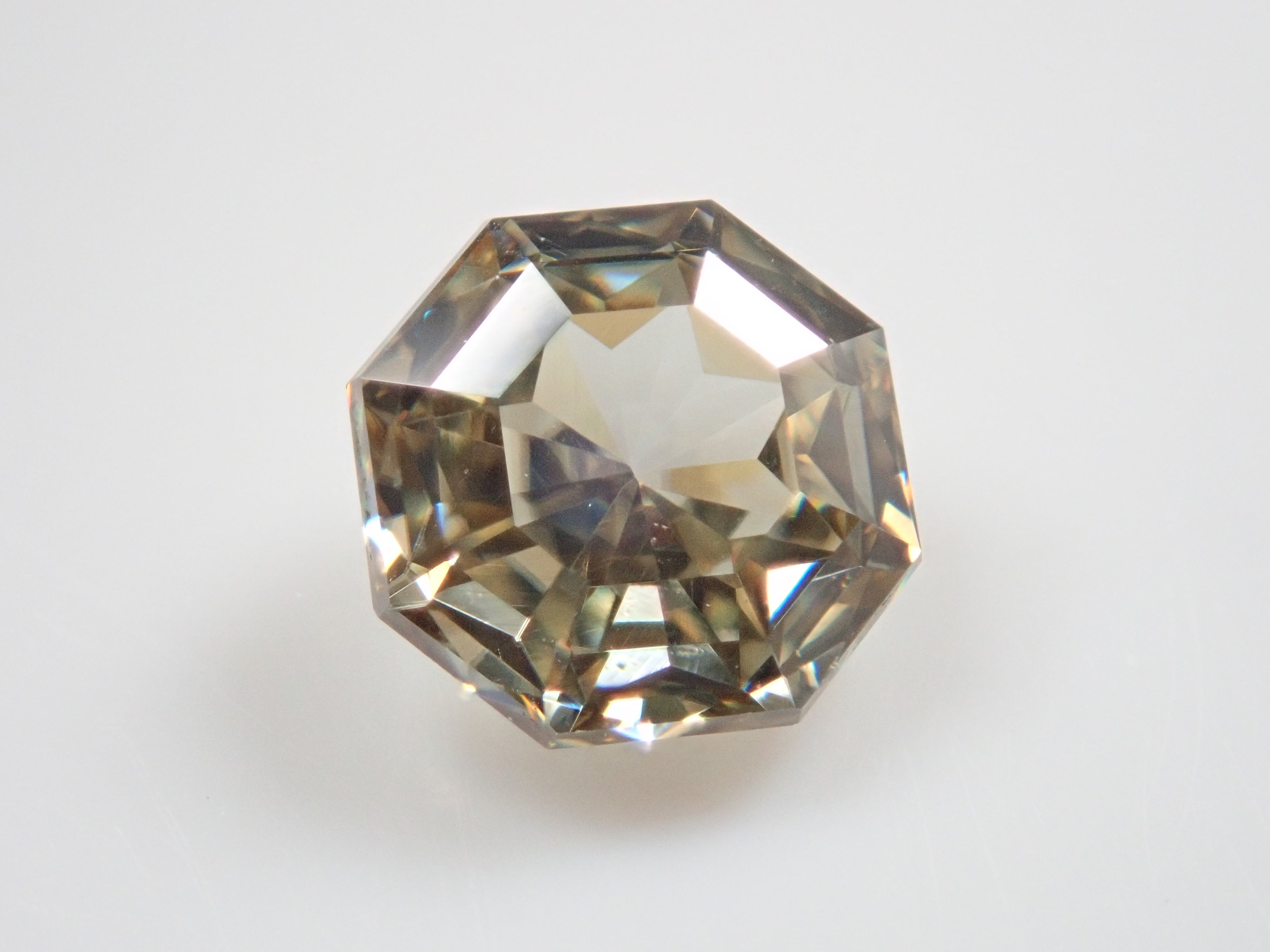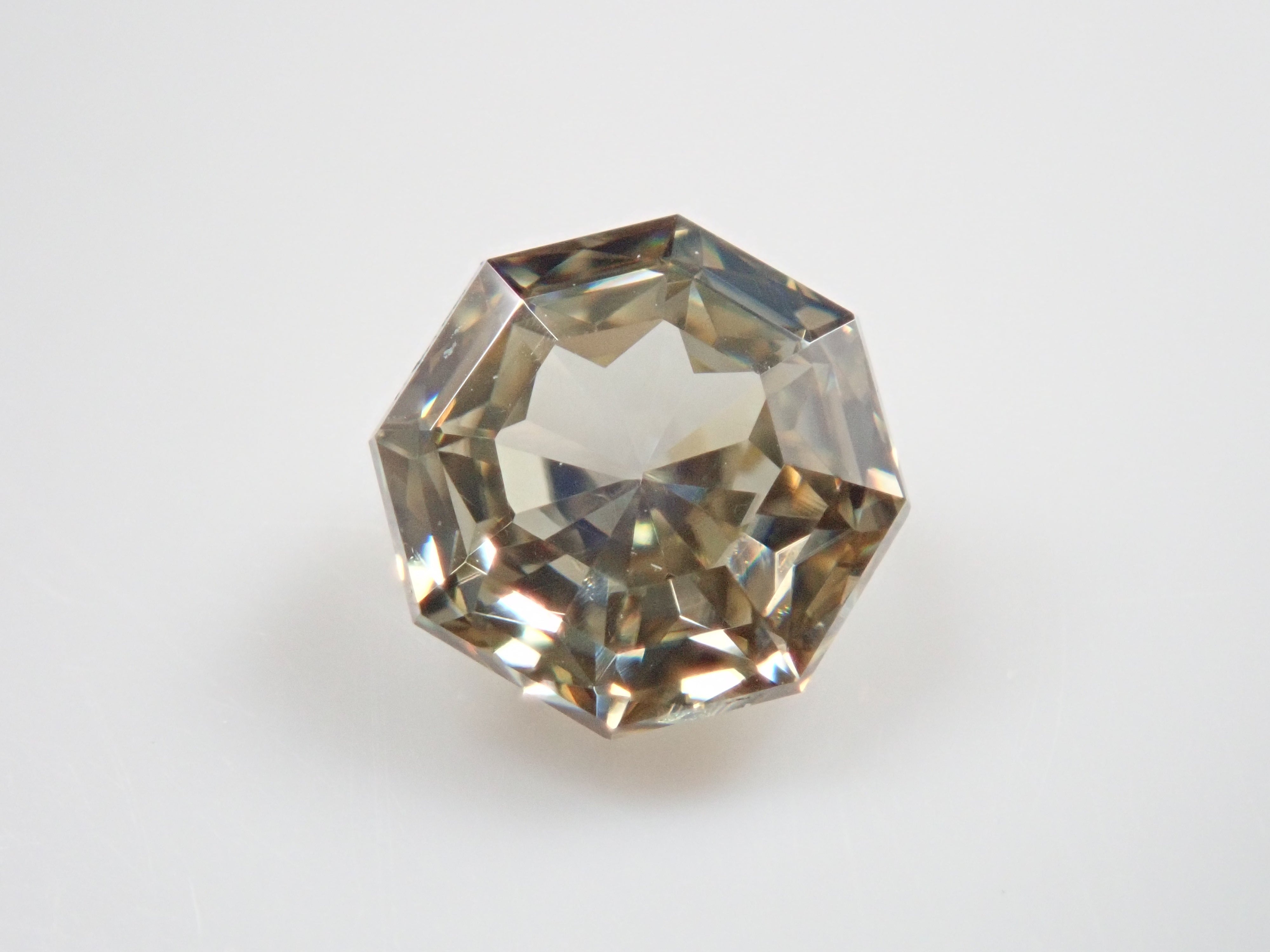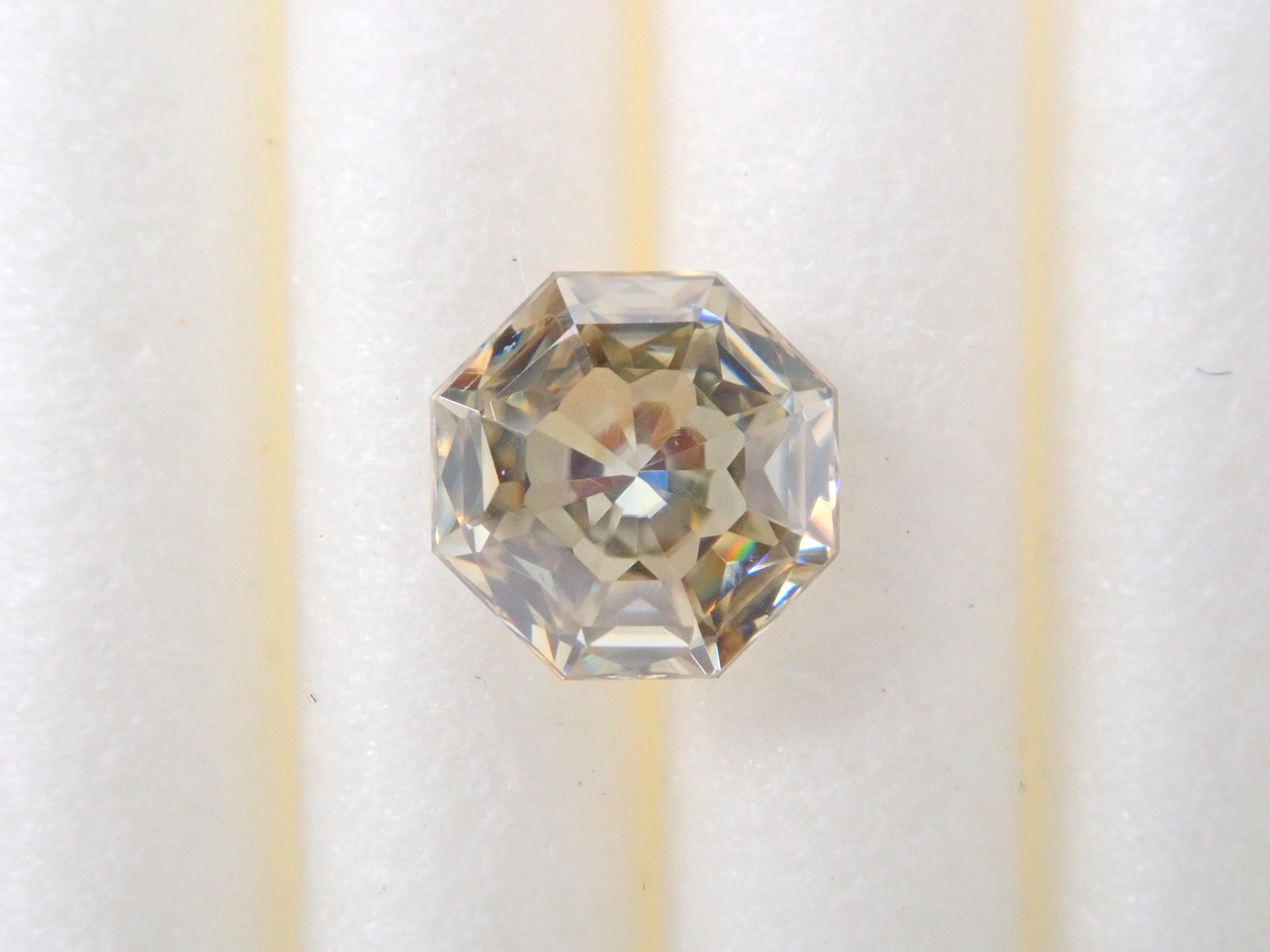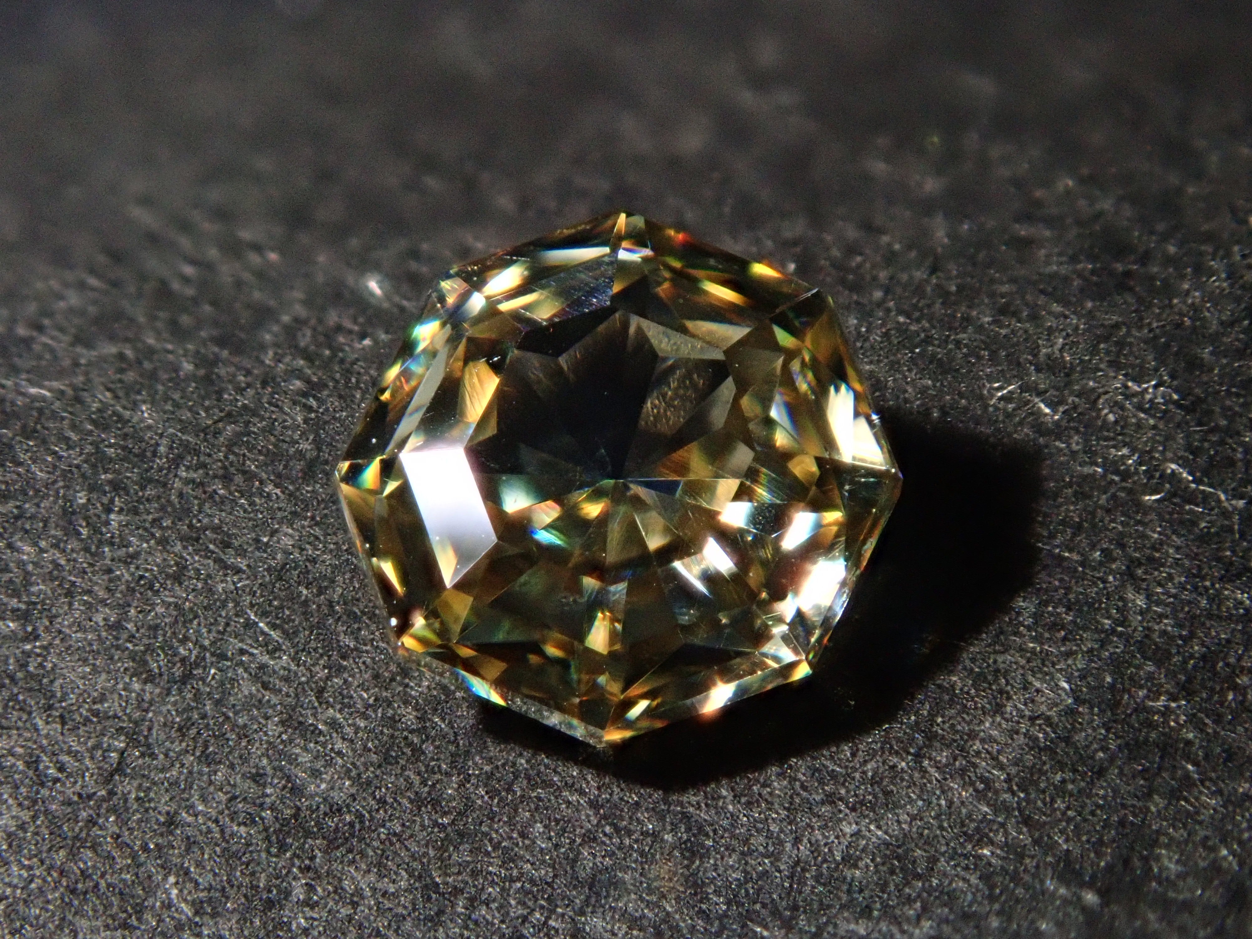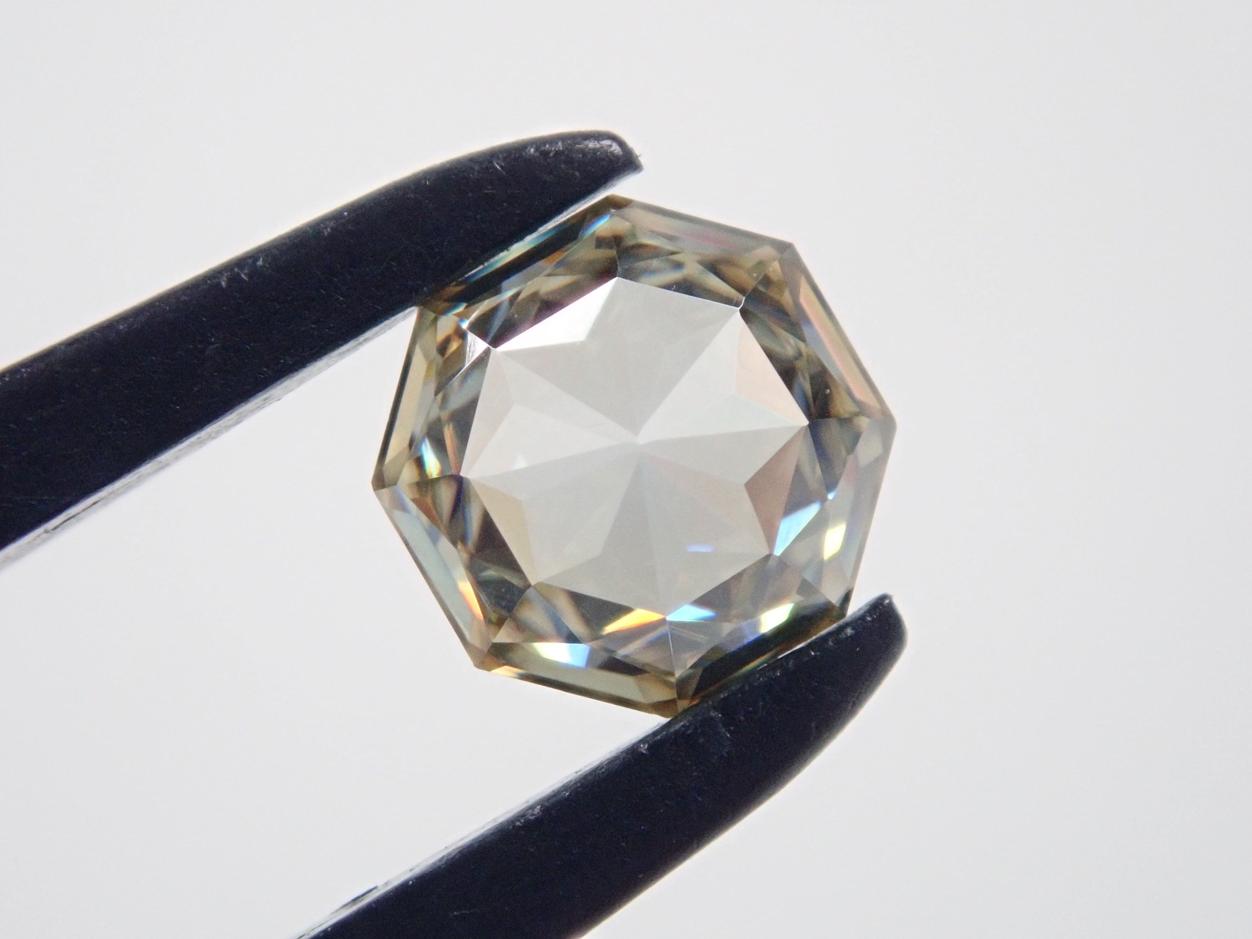 莫桑石的硬度為9.5,僅次於硬度為10的鑽石,並且比鑽石、榍石、濃綠榴石石榴石的分散率更高。事實上,它是一種適合寶石的礦物。由於天然寶石極為罕見,因此常見的是合成寶石。這也是一種合成莫桑石。莫桑石有多種顏色,因此收藏起來很有趣。請盡情享受眼前這耀眼的光芒。由斯里蘭卡拋光師 Sanjay 切割的合成莫桑石。