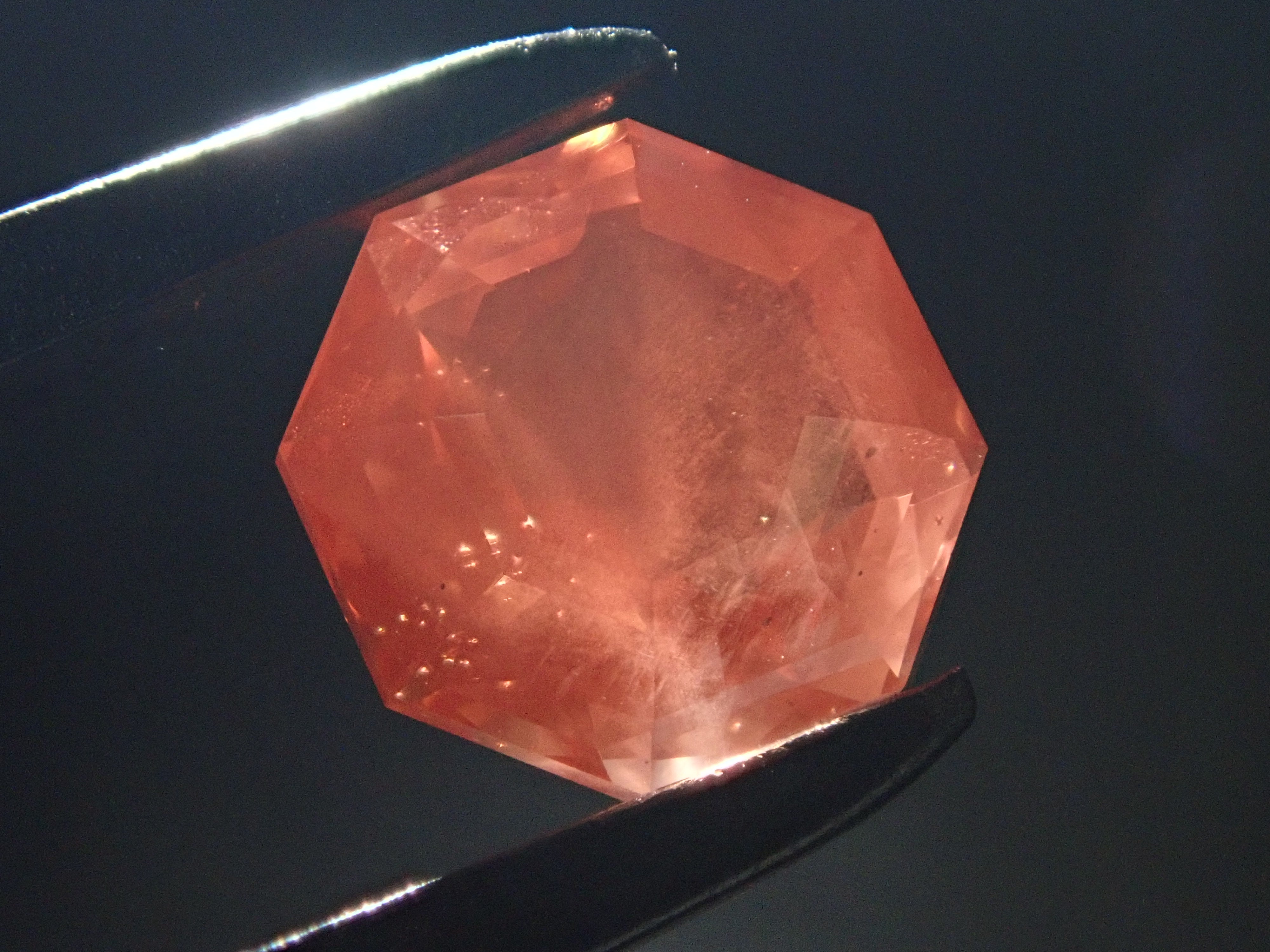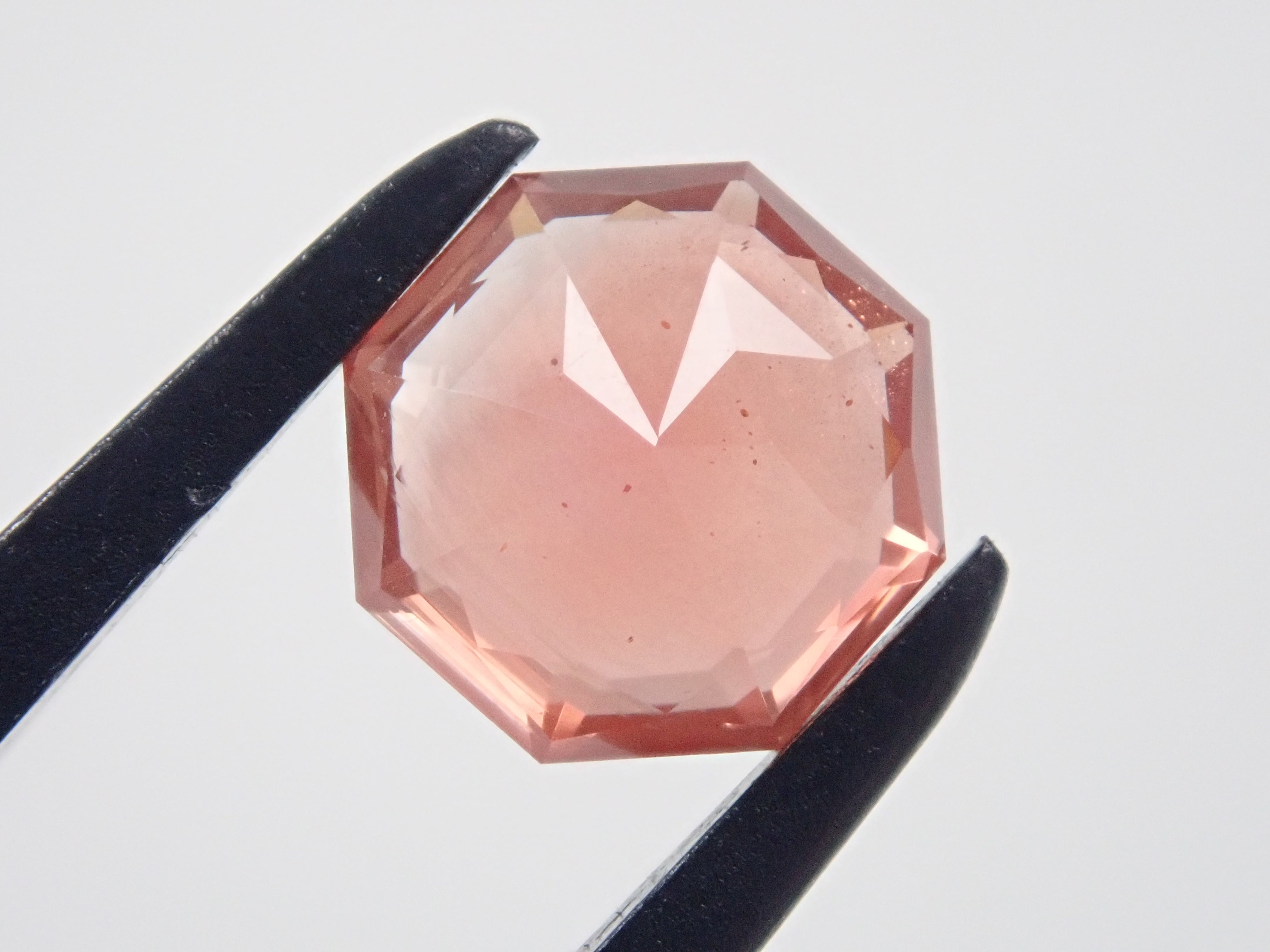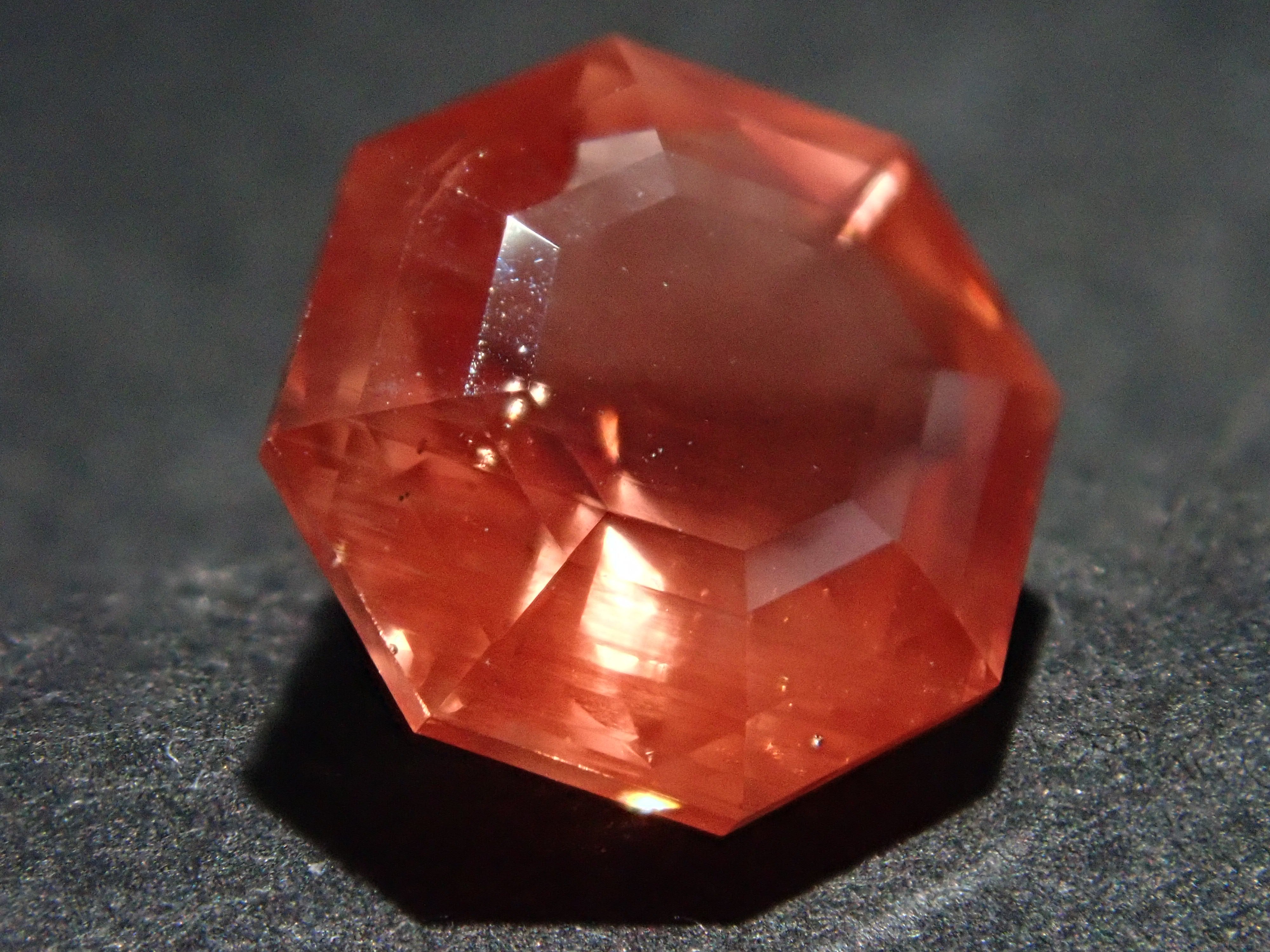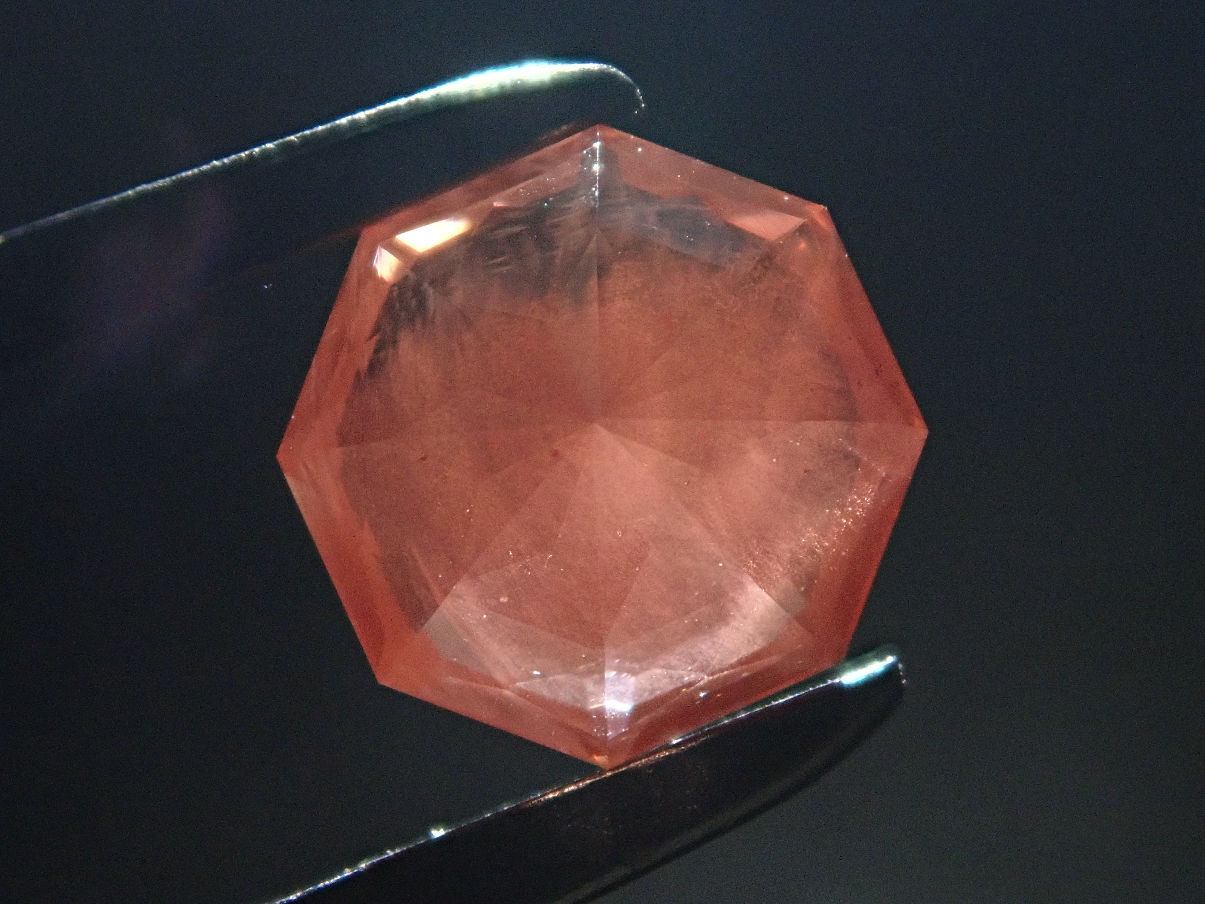 俄勒岡州太陽石被譽為世界上最美麗的拉長石。近年來,這種寶石越來越受歡迎。有些寶石的內含物會像閃光一樣反射,這種現象稱為灑金現象(席勒效應)。為了更好地呈現這種光學效果,攝影時會使用筆型手電筒。這是一顆來自美國的經過特殊切割的俄勒岡州太陽石。
