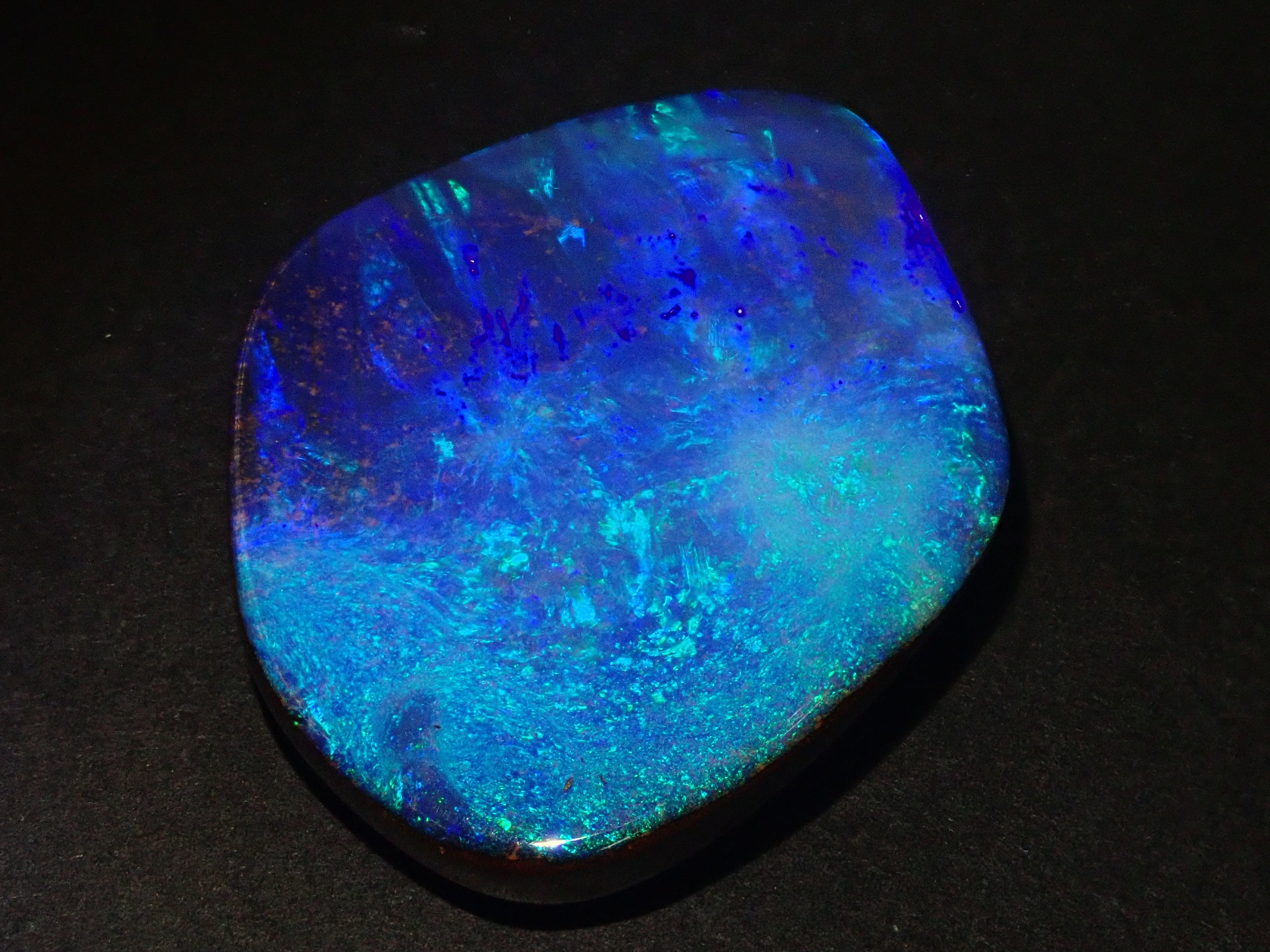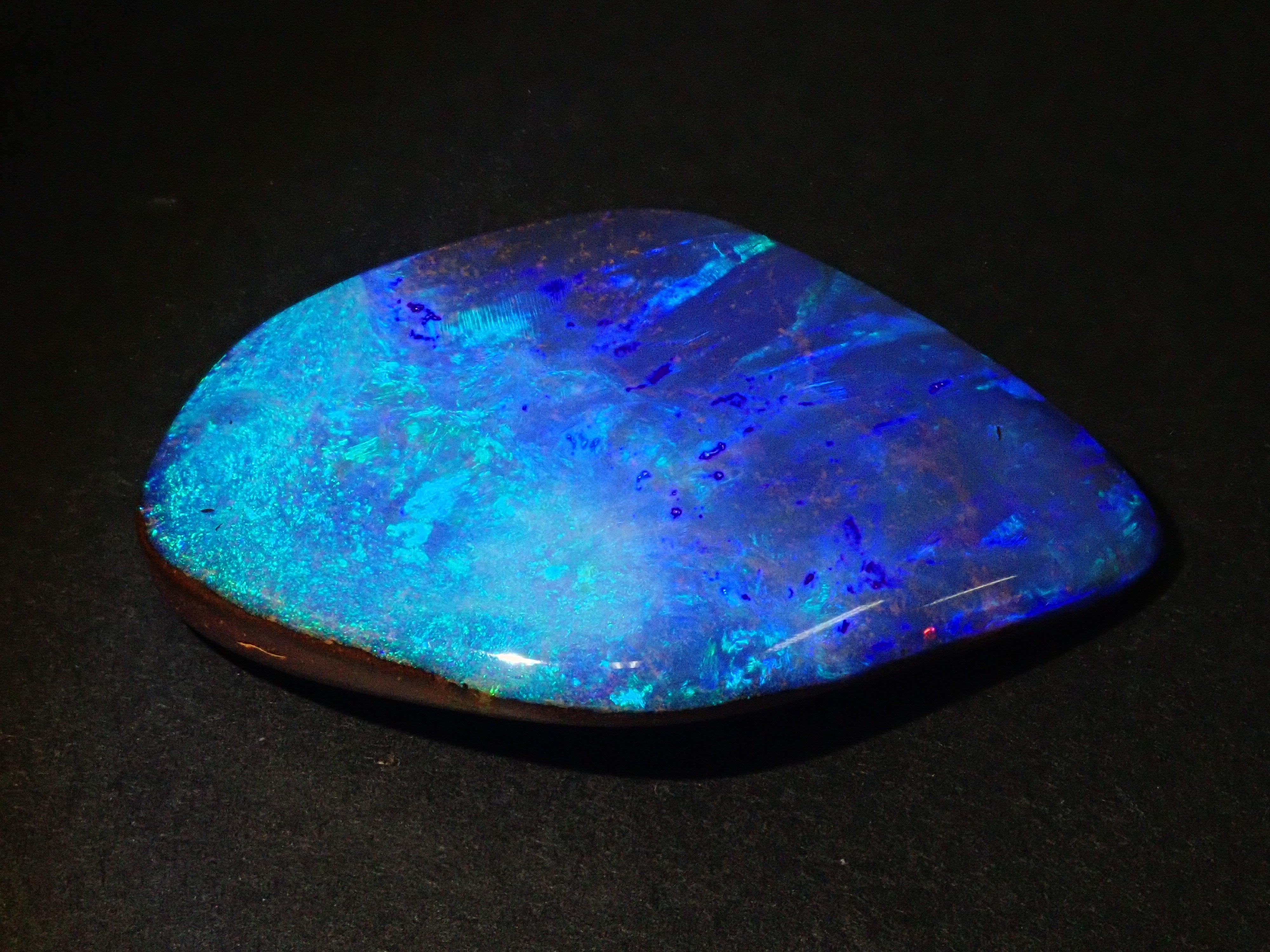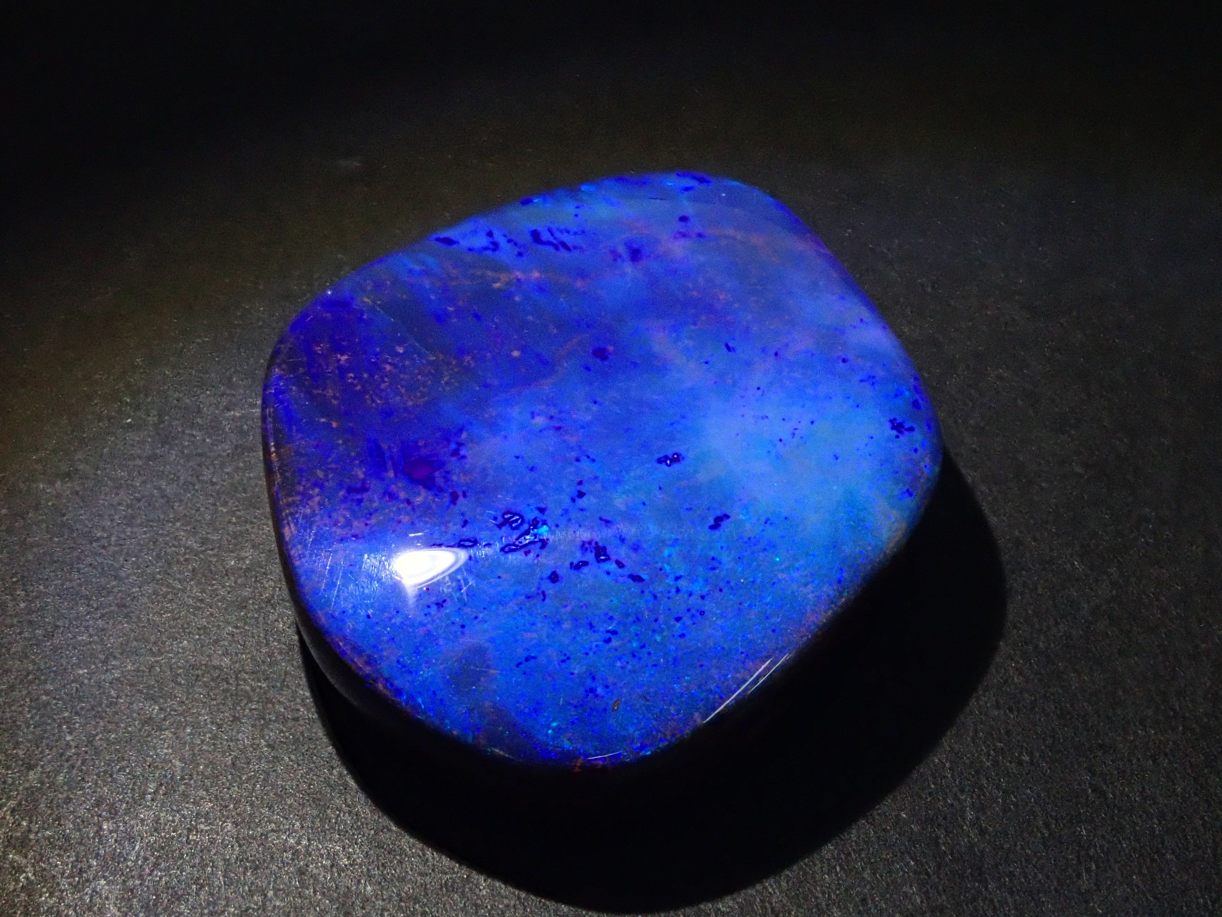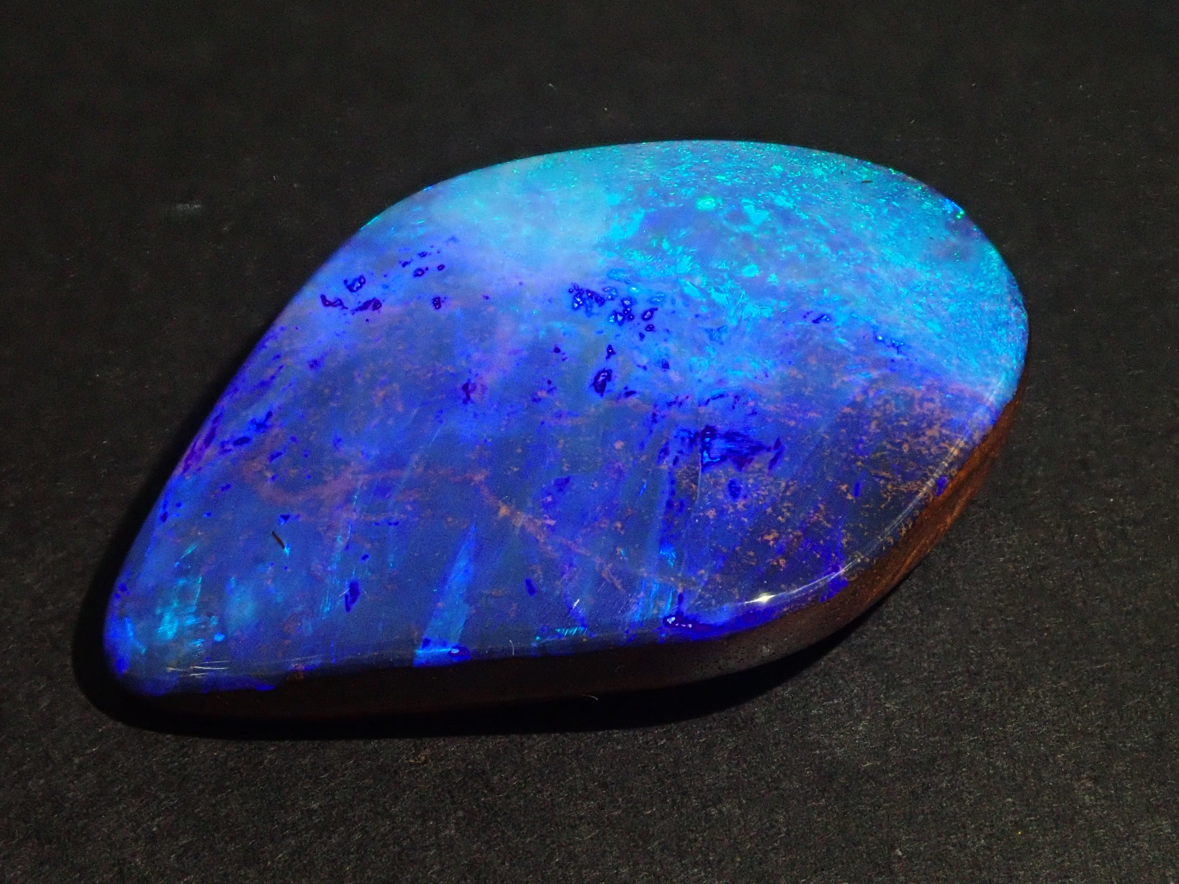 蛋白石是一種閃爍著彩虹色光芒的寶石。蛋白石有多種類型,其中,礫石蛋白石是指仍附著主岩的蛋白石。有些照片是用筆燈拍攝的。這是一顆帶有變彩的澳洲礫石蛋白石。這是一顆美麗的澳洲巨石蛋白石,有著亮藍色的色彩。
