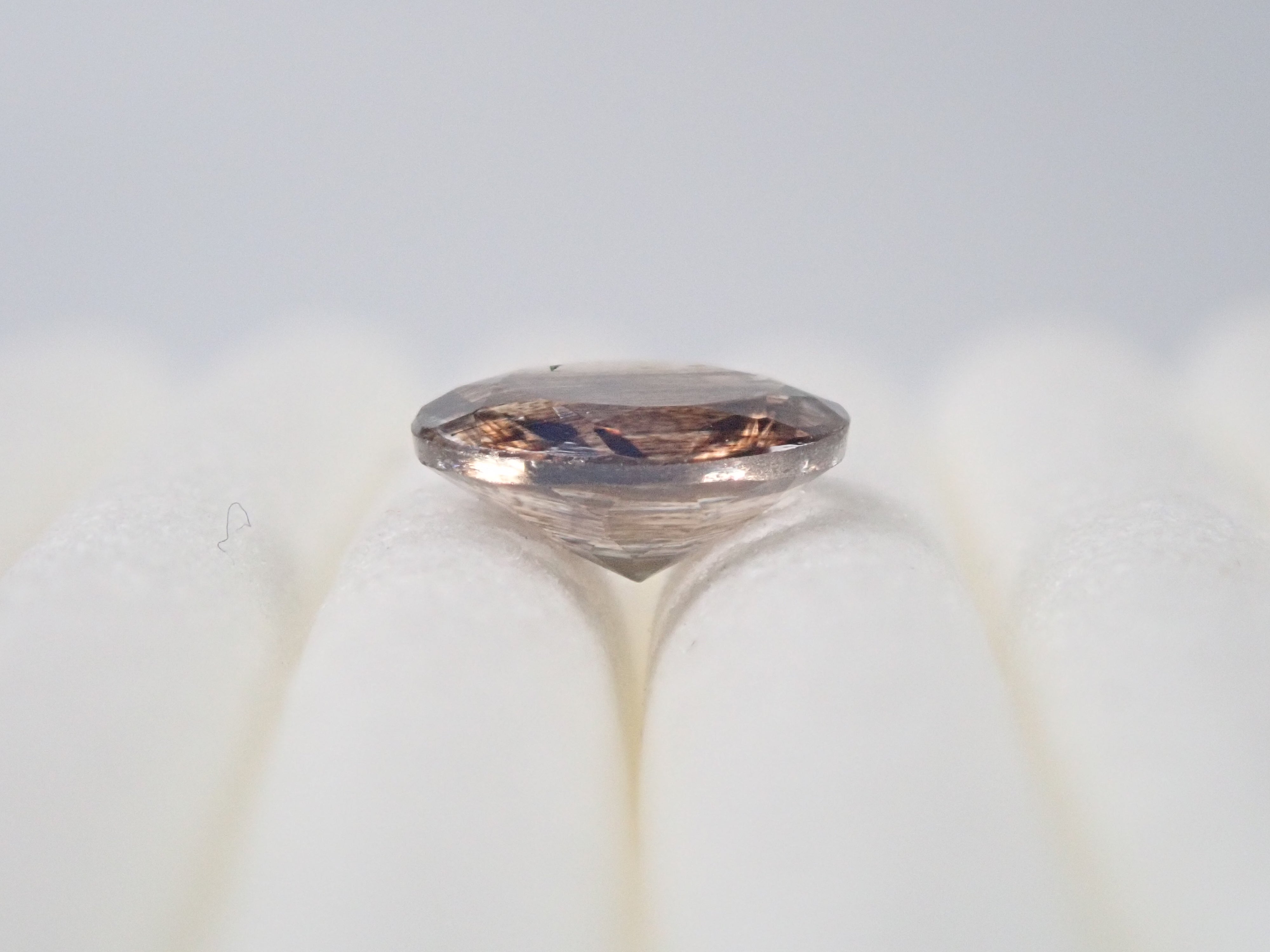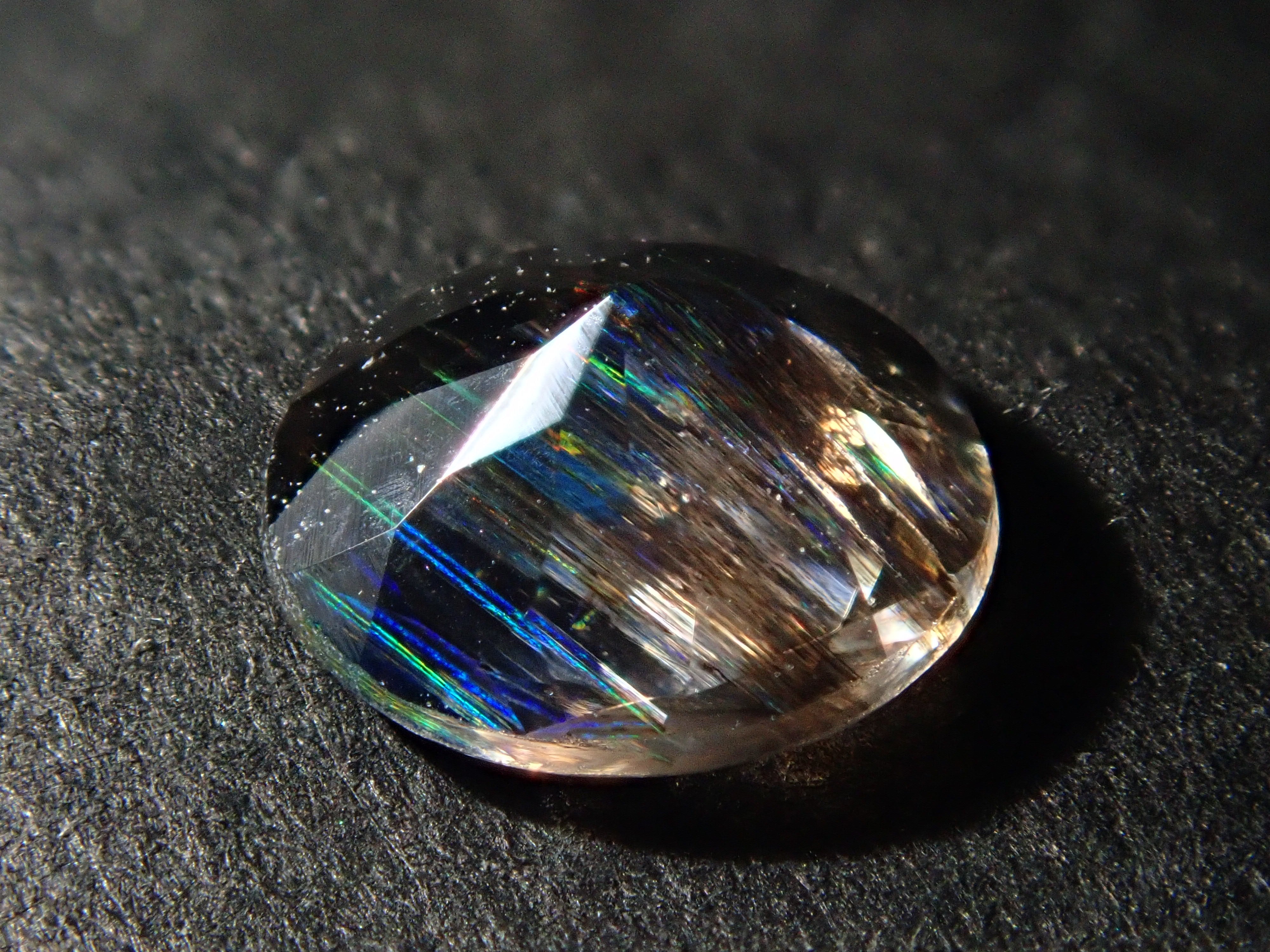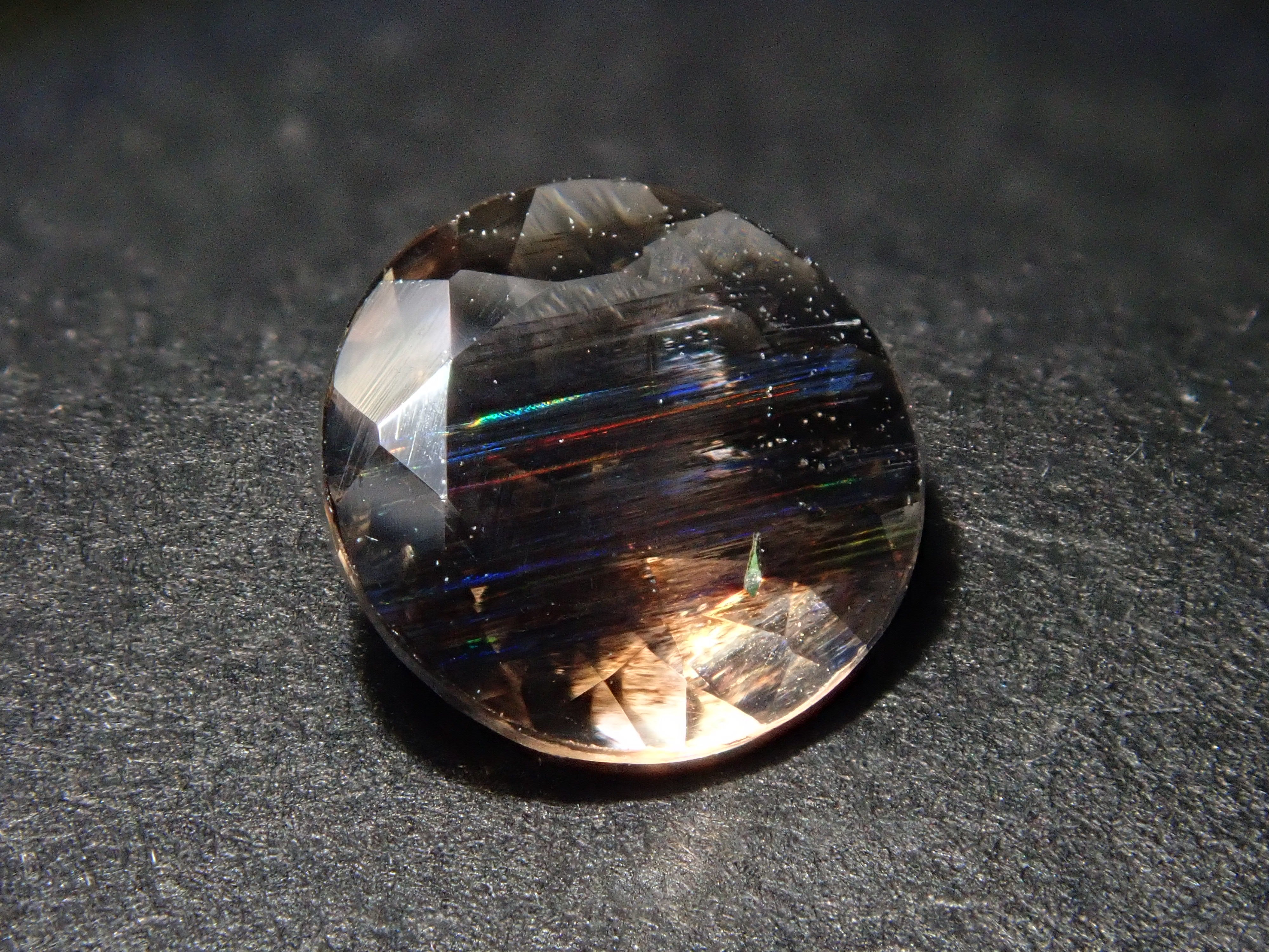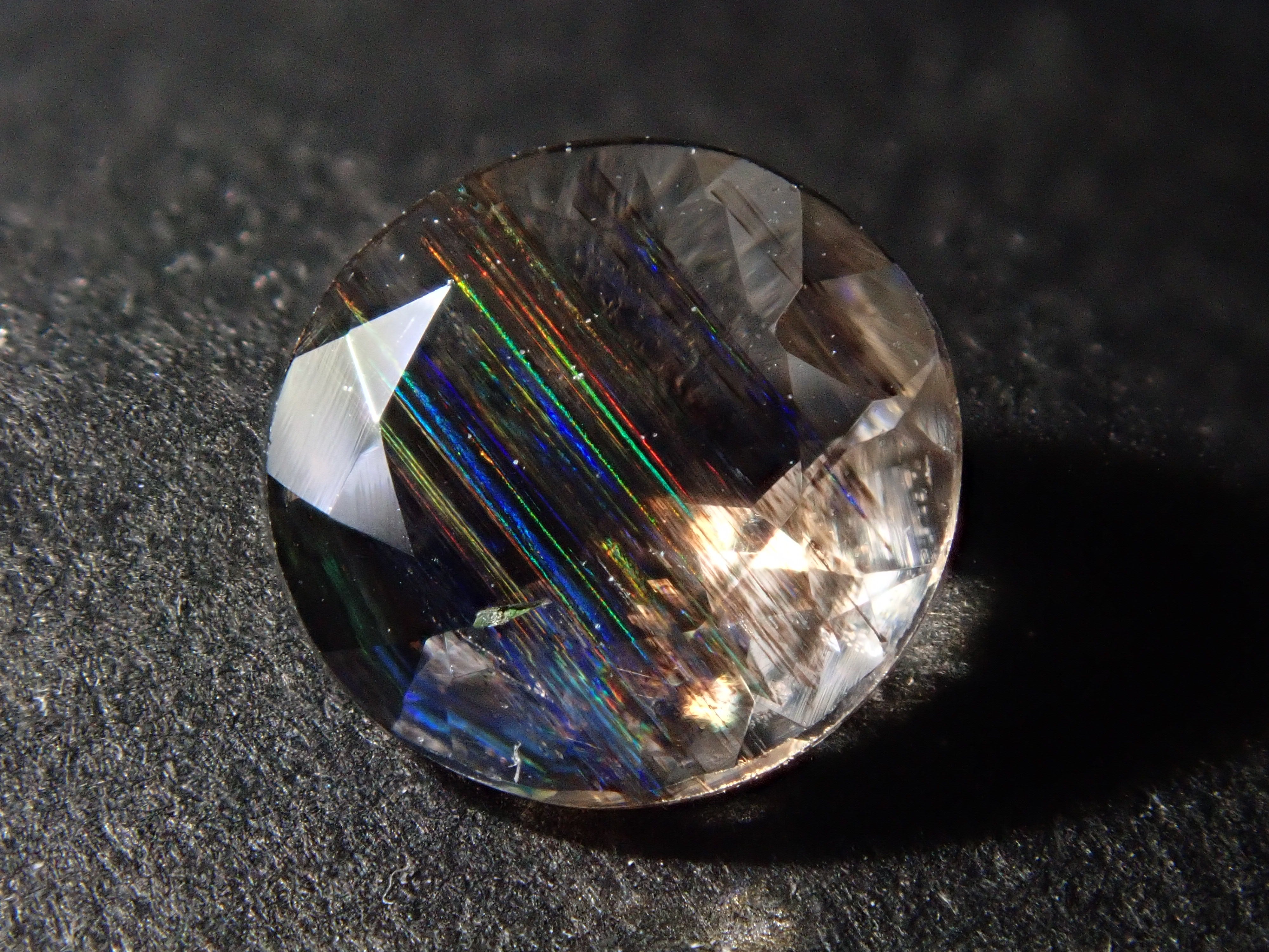 這就是所謂的“彩虹方柱石”,它展現出孔雀羽毛般鮮豔的色彩。方柱石是一種具有「多色性」的寶石,從不同角度觀看會呈現出不同的顏色。拍攝這張照片時,我用筆型電筒捕捉了這種神祕的色彩。它是一顆直徑6毫米的圓形切割寶石。
