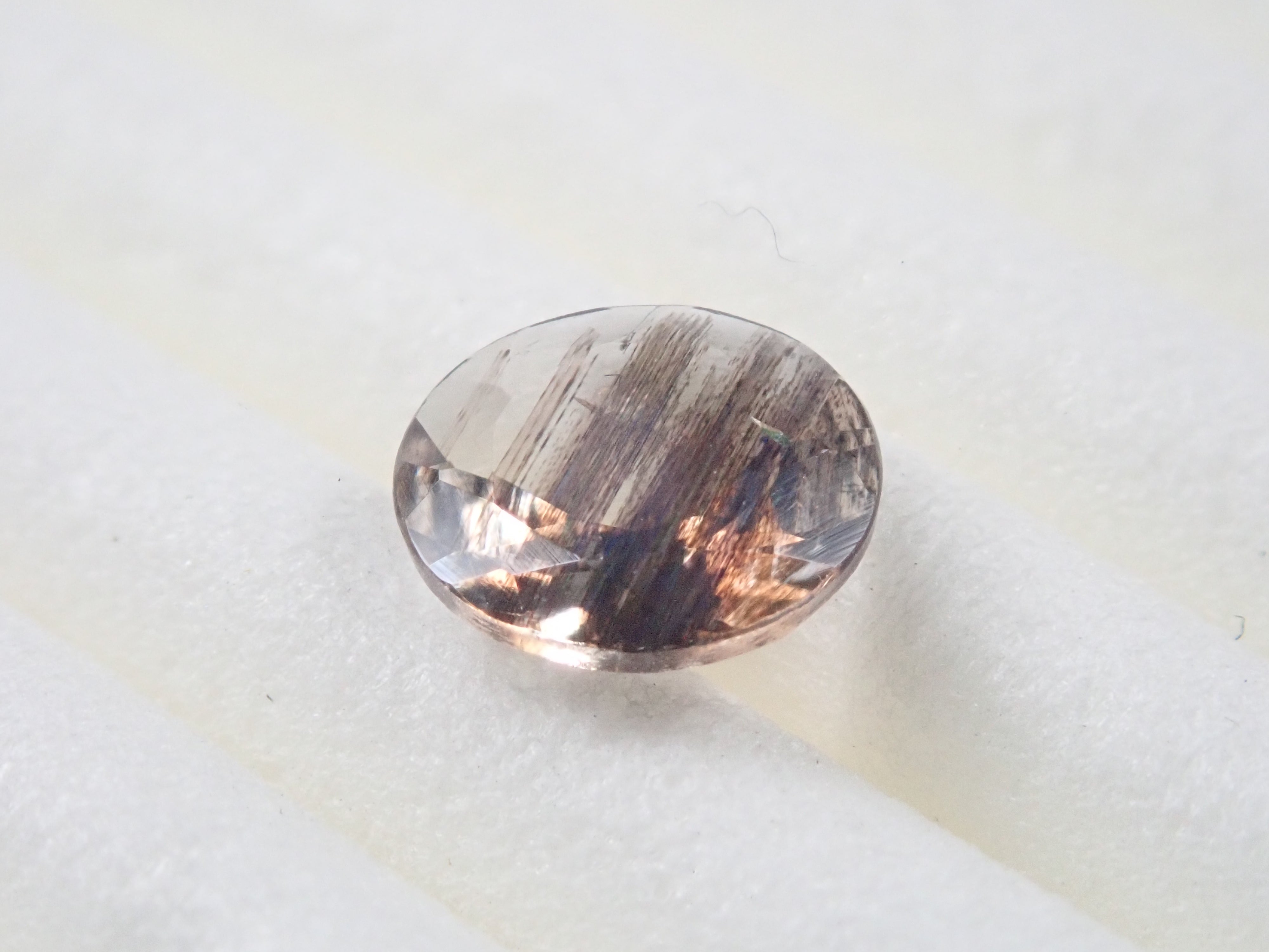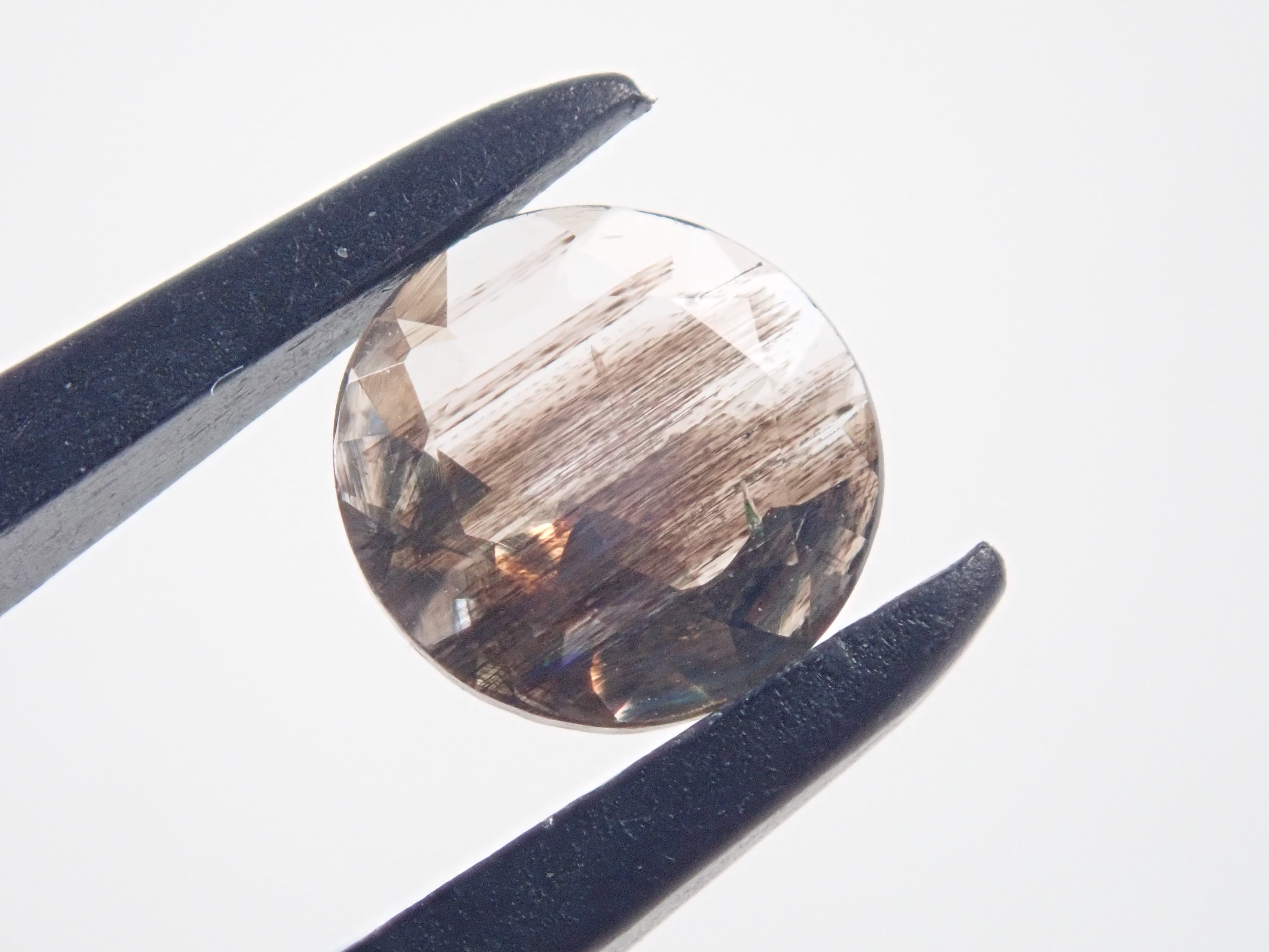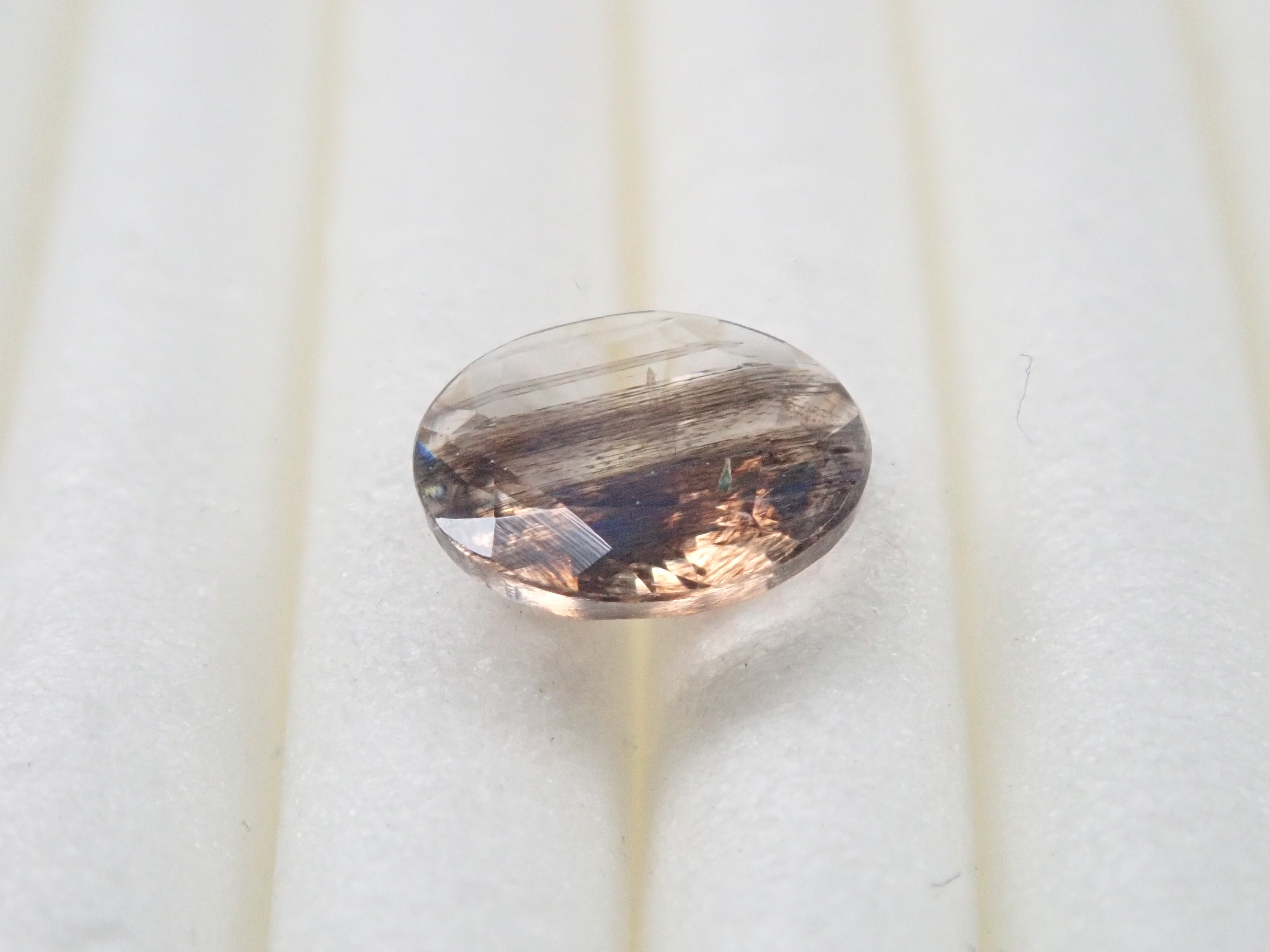 這就是所謂的“彩虹方柱石”,它展現出孔雀羽毛般鮮豔的色彩。方柱石是一種具有「多色性」的寶石,從不同角度觀看會呈現出不同的顏色。拍攝這張照片時,我用筆型電筒捕捉了這種神祕的色彩。它是一顆直徑6毫米的圓形切割寶石。