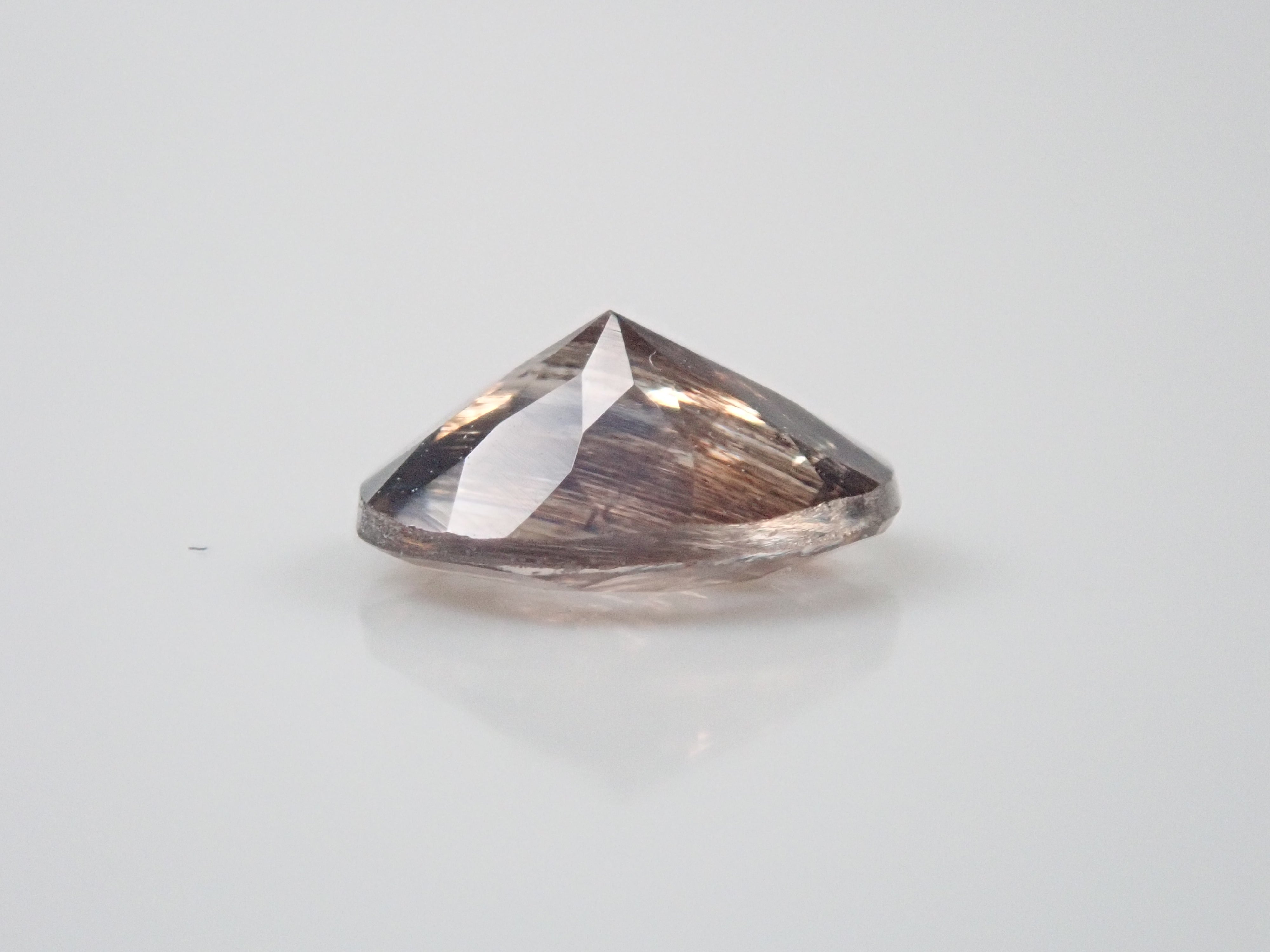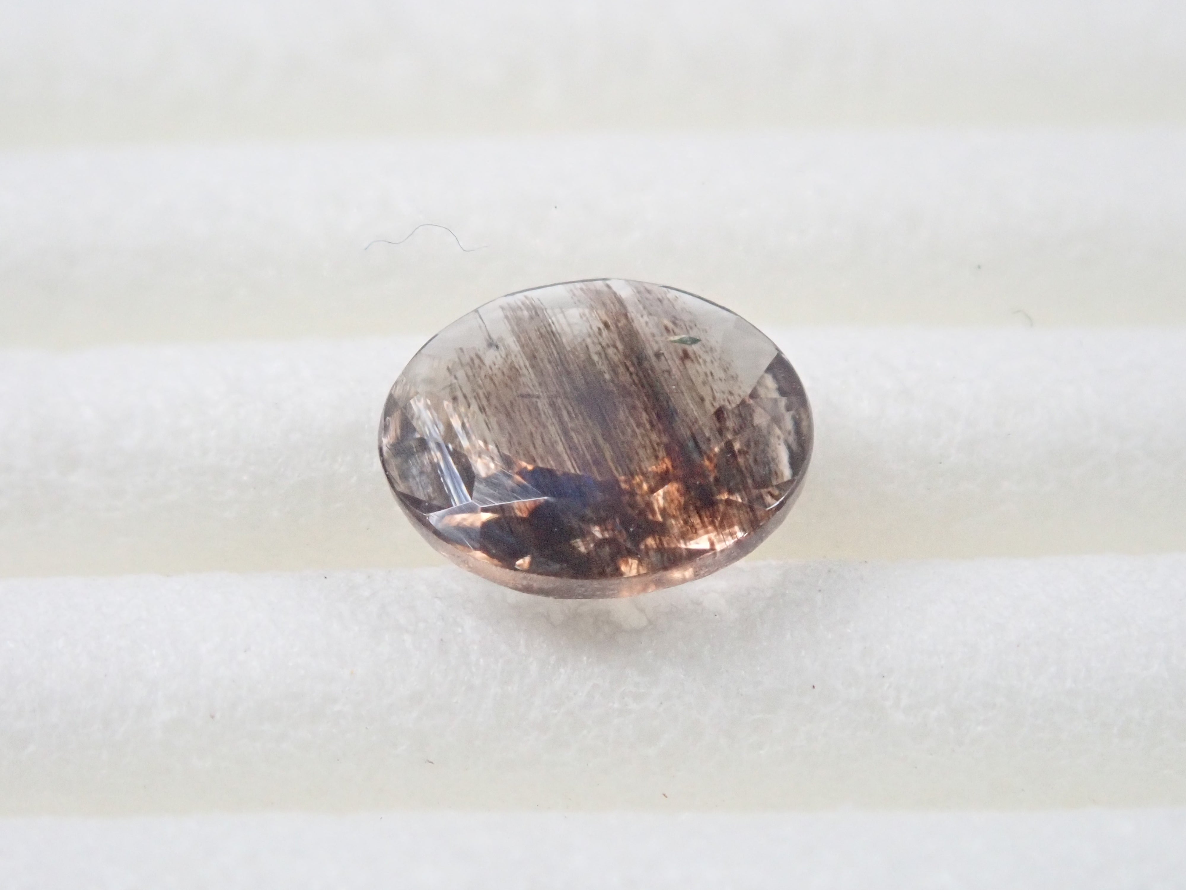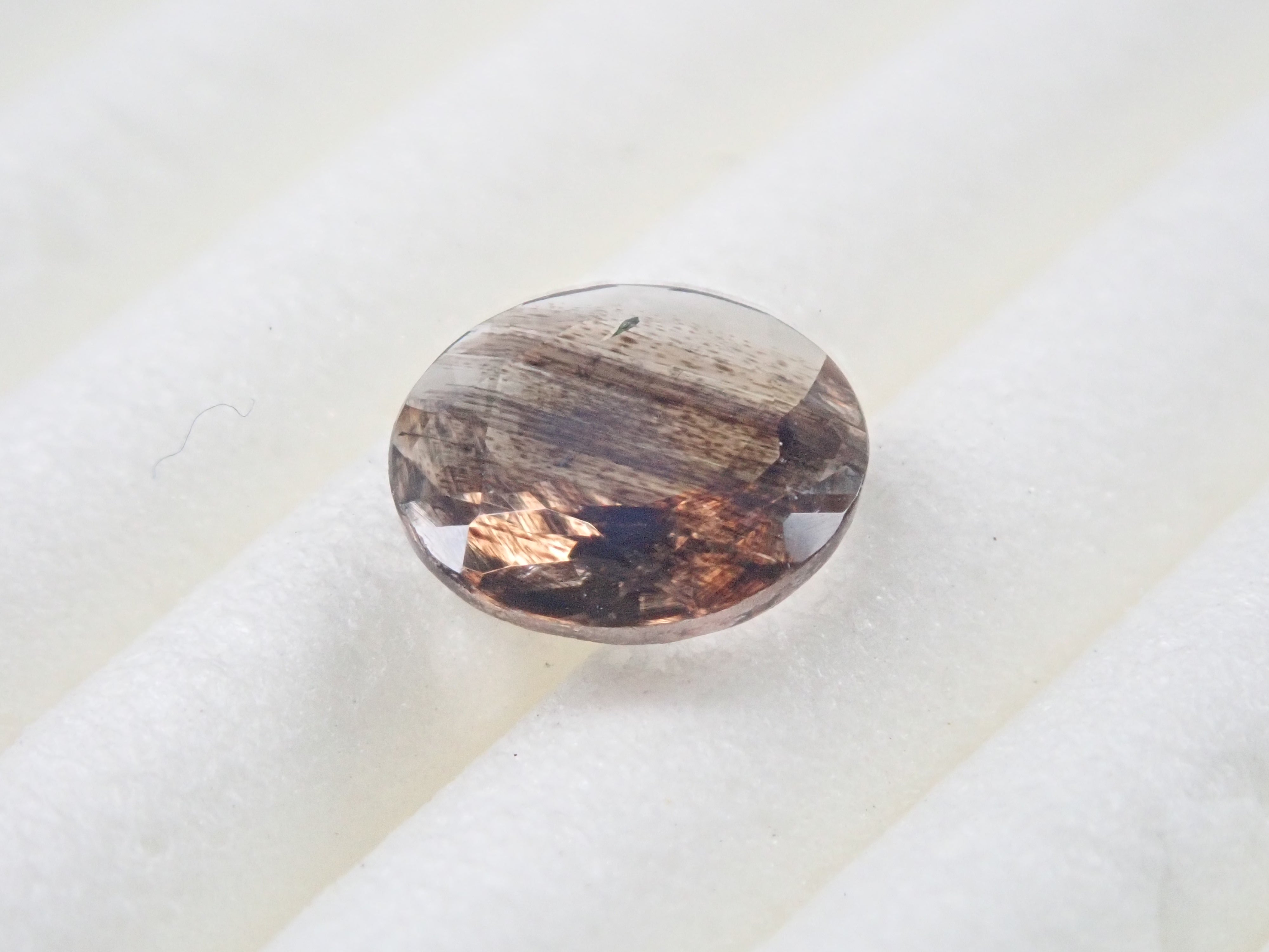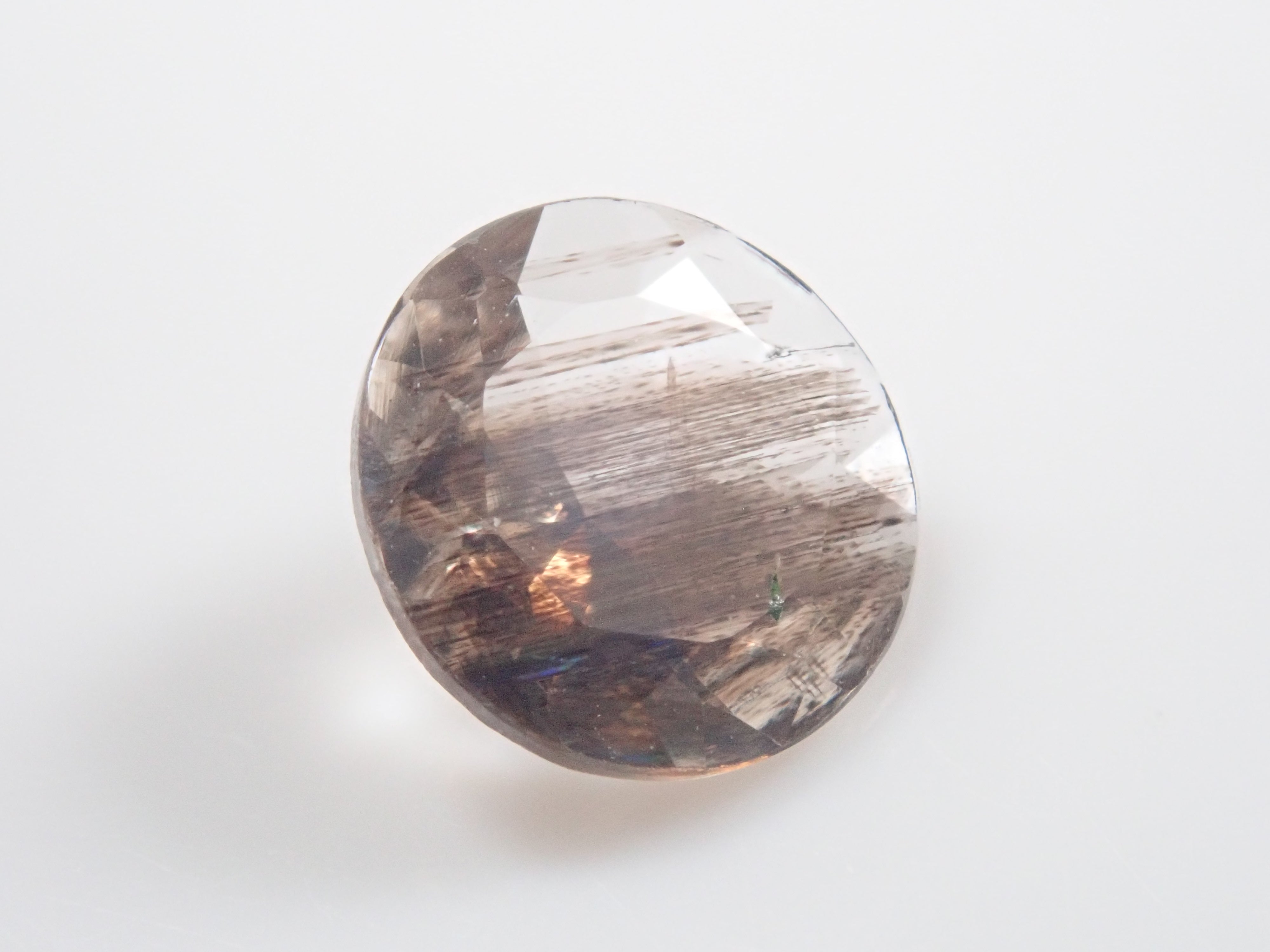 這就是所謂的“彩虹方柱石”,它展現出孔雀羽毛般鮮豔的色彩。方柱石是一種具有「多色性」的寶石,從不同角度觀看會呈現出不同的顏色。拍攝這張照片時,我用筆型電筒捕捉了這種神祕的色彩。它是一顆直徑6毫米的圓形切割寶石。