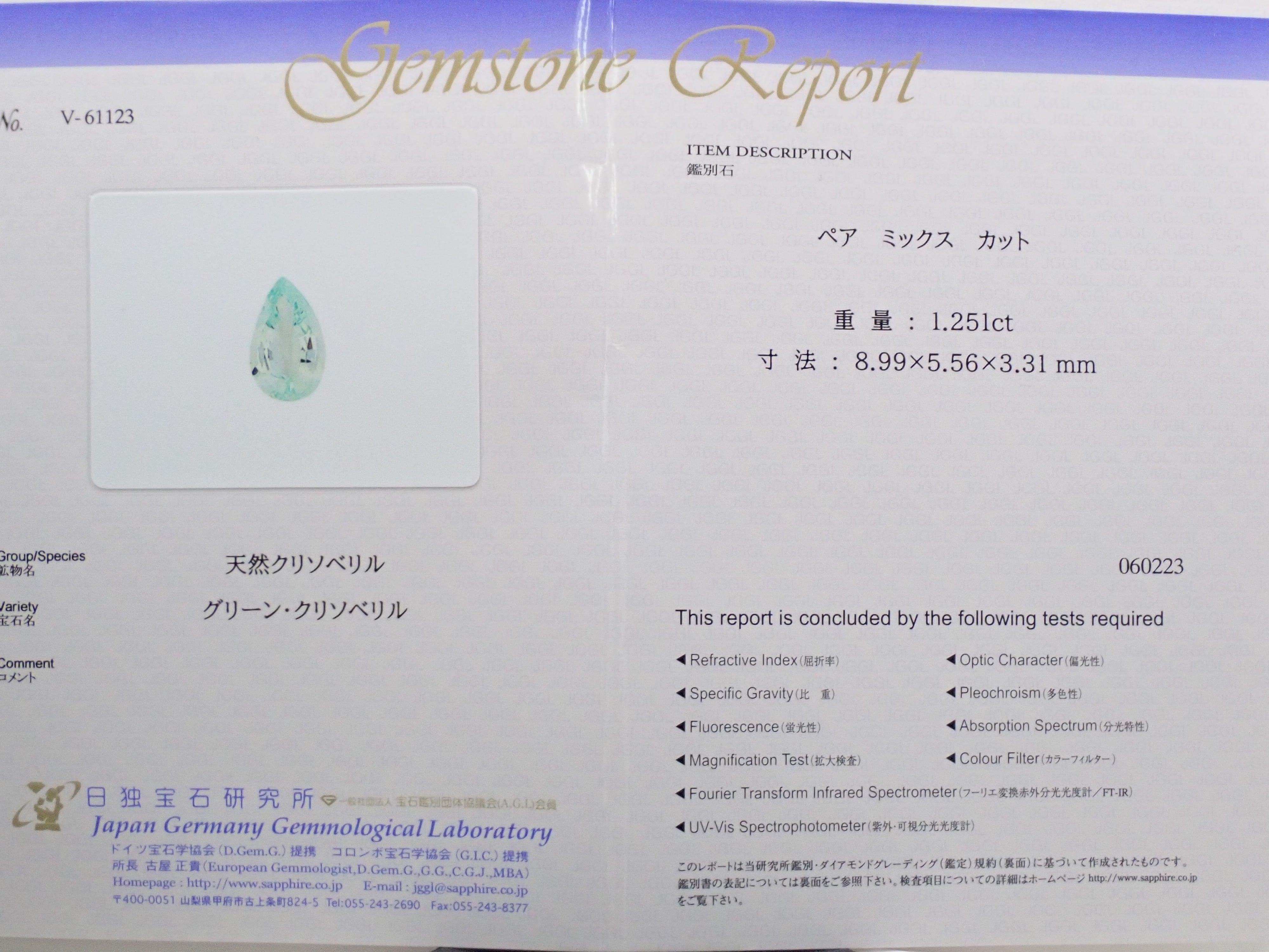 金綠寶石具有高莫氏硬度和美麗的硬光澤。這種石頭有多種色調,從淺黃色到綠色到深棕色。它以亞歷山大變石的礦物名稱而聞名,但即使沒有像這種鬆散的變色效果,它也充滿了作為寶石的魅力。薄荷綠金綠寶石在金綠寶石中比較少見。附有日德寶石研究所頒發的鑑定證書。
