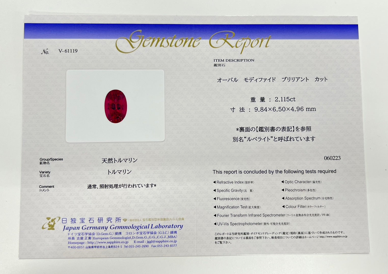 【9月5日晚上10點售出】巴西紅碧璽2.115ct裸石,日德認證