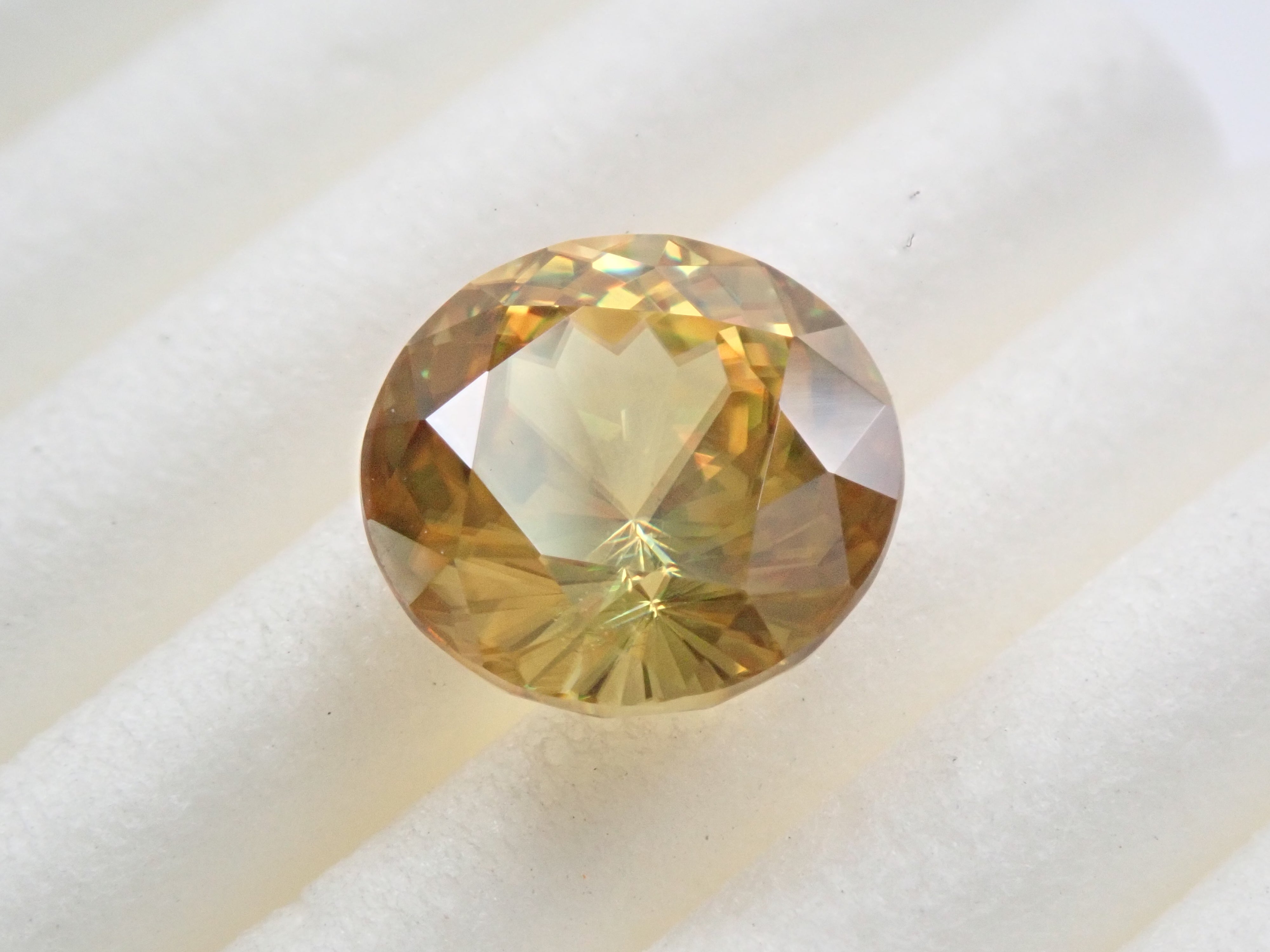 呈現出金色光芒和奢華火焰的榍石。它作為一種有吸引力的寶石而受到收藏家的歡迎,它散發出比鑽石更強大的火彩。輝度隨角度而快速變化的榍石。請在陽光下在手中滾動並觀察。請注意,有些照片是使用筆燈拍攝的。圓形約 7.6 毫米。這是一種可以用火來享受的高品質榍石。