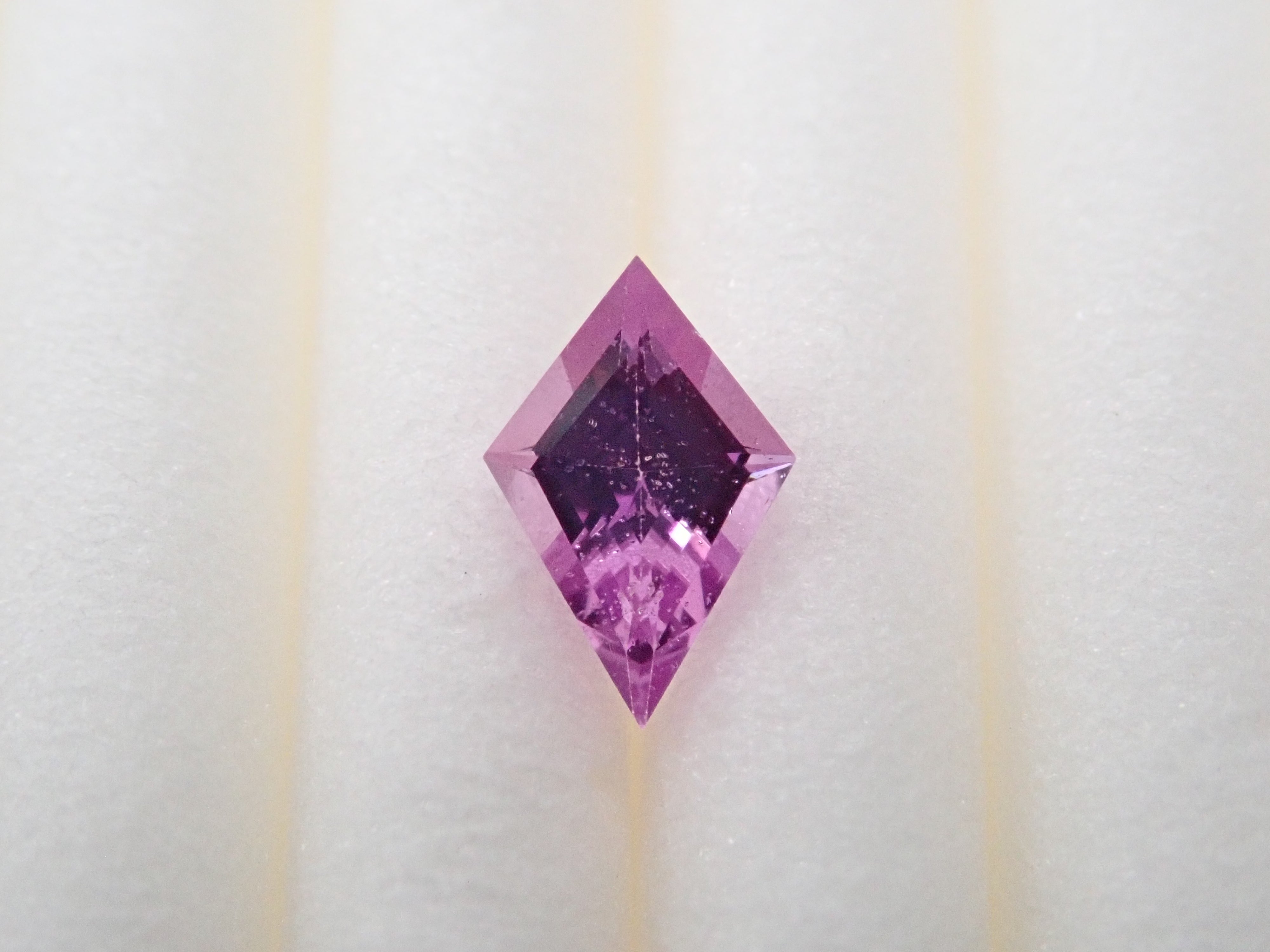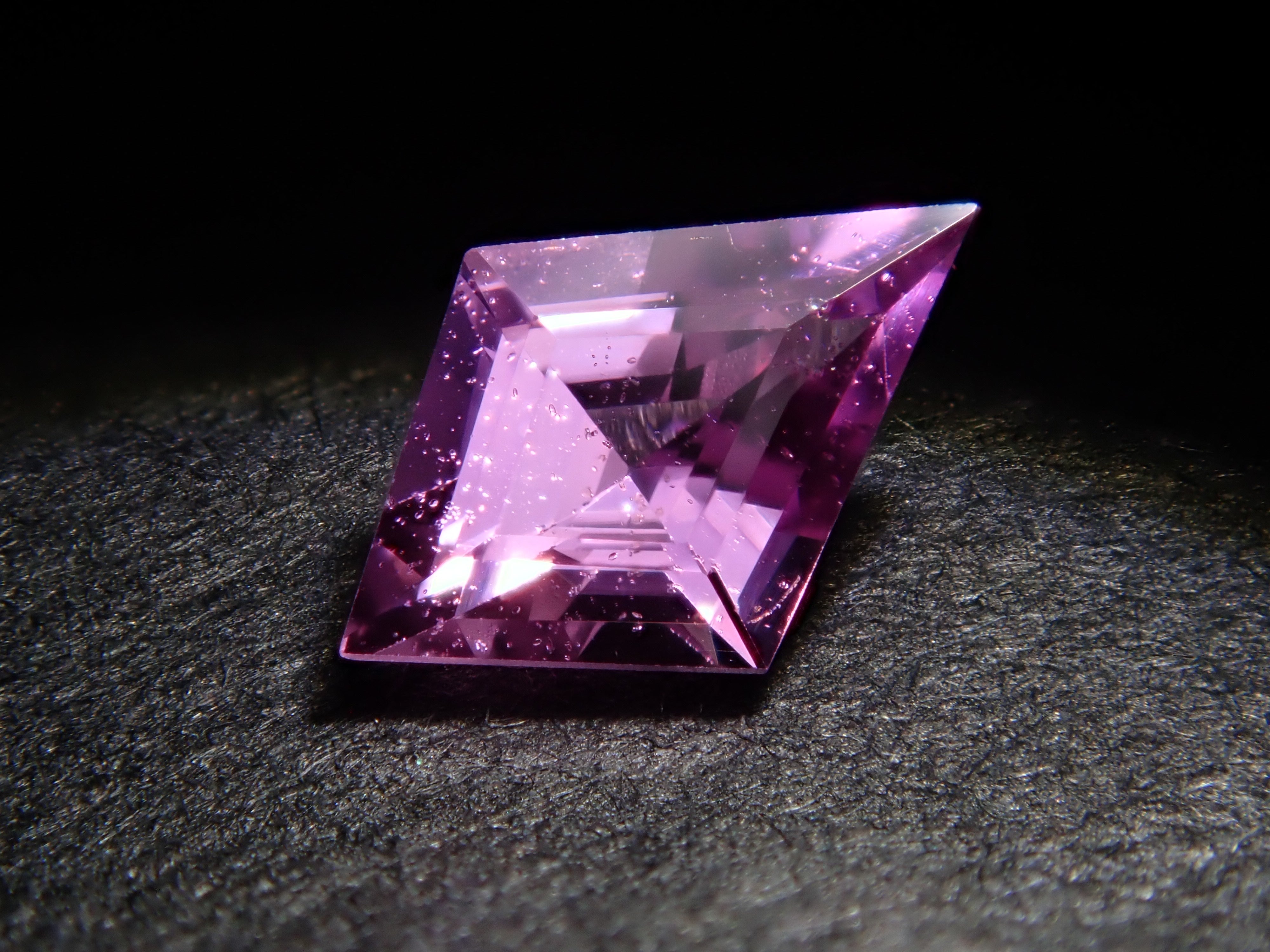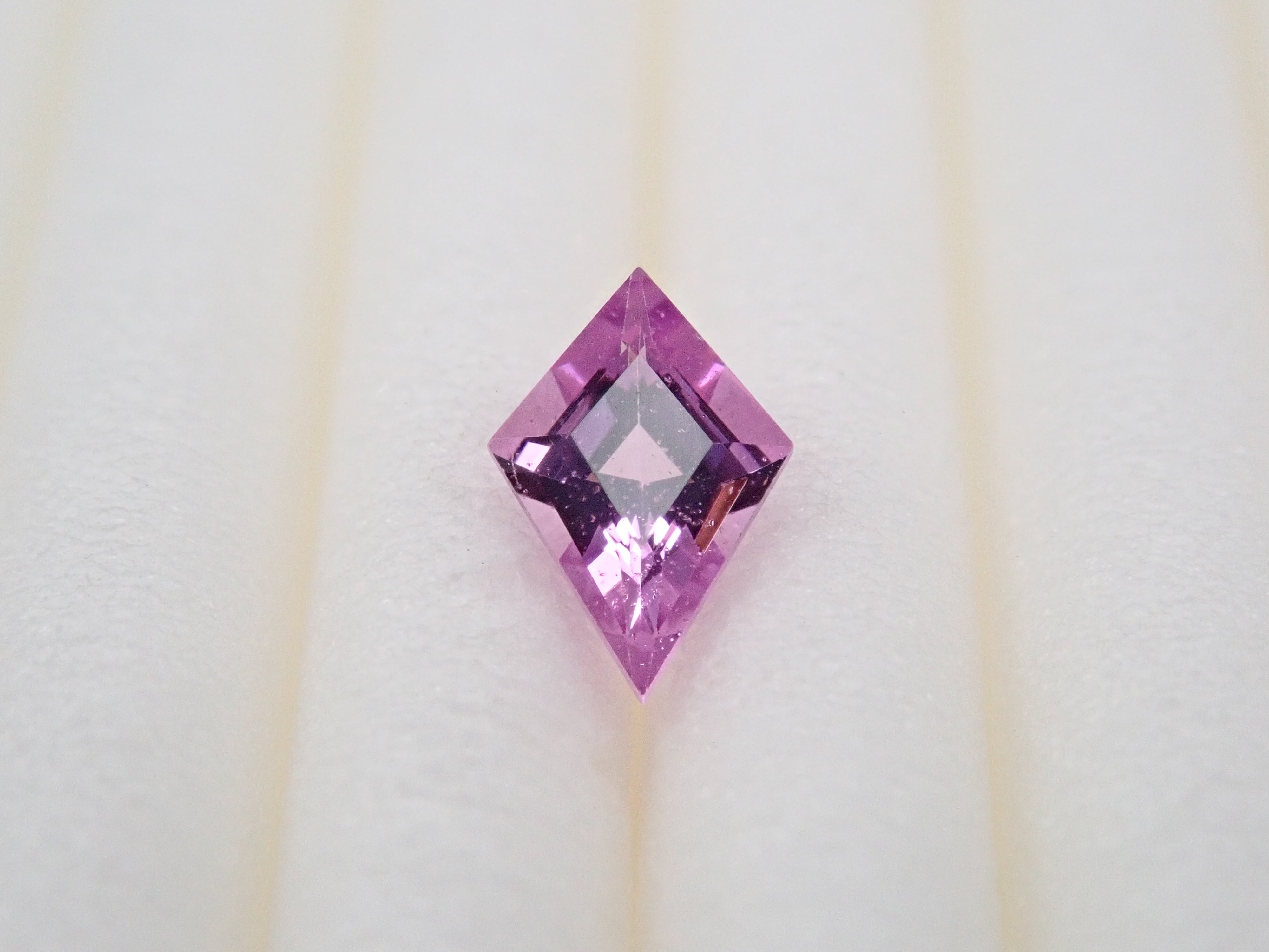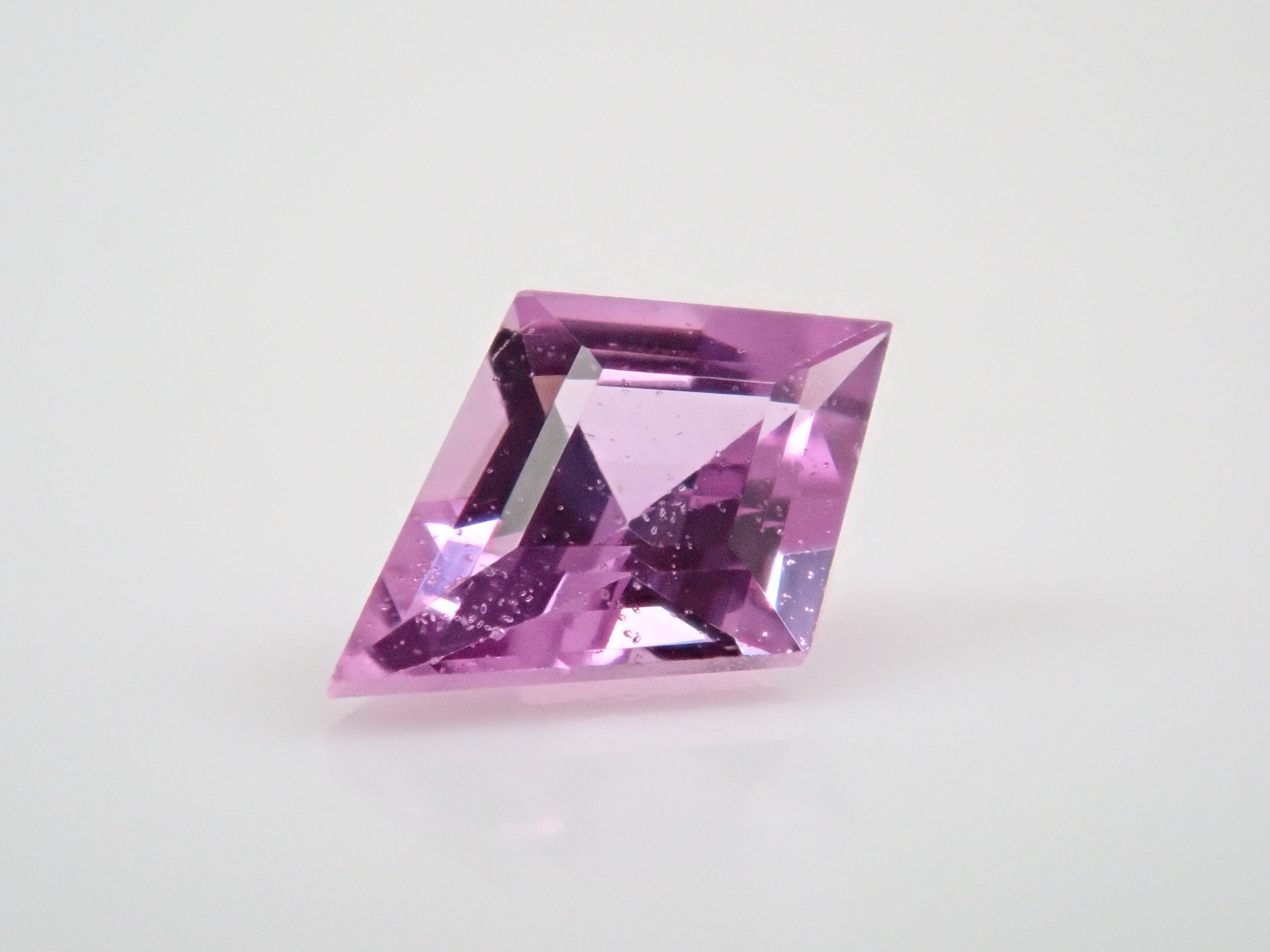 藍寶石是一種著名的寶石。礦物為剛玉,與紅寶石相同,但除紅色以外的所有剛玉稱為藍寶石。這是一顆帶有鮮明桃色的粉紅色藍寶石。藍寶石的硬度為 9,是僅次於鑽石的第二硬寶石,是一種高度堅韌、穩定且易於護理的寶石。這是一顆高品質紫色藍寶石,重 0.199 克拉,菱形切工,透明度高。它是粉紫色的。