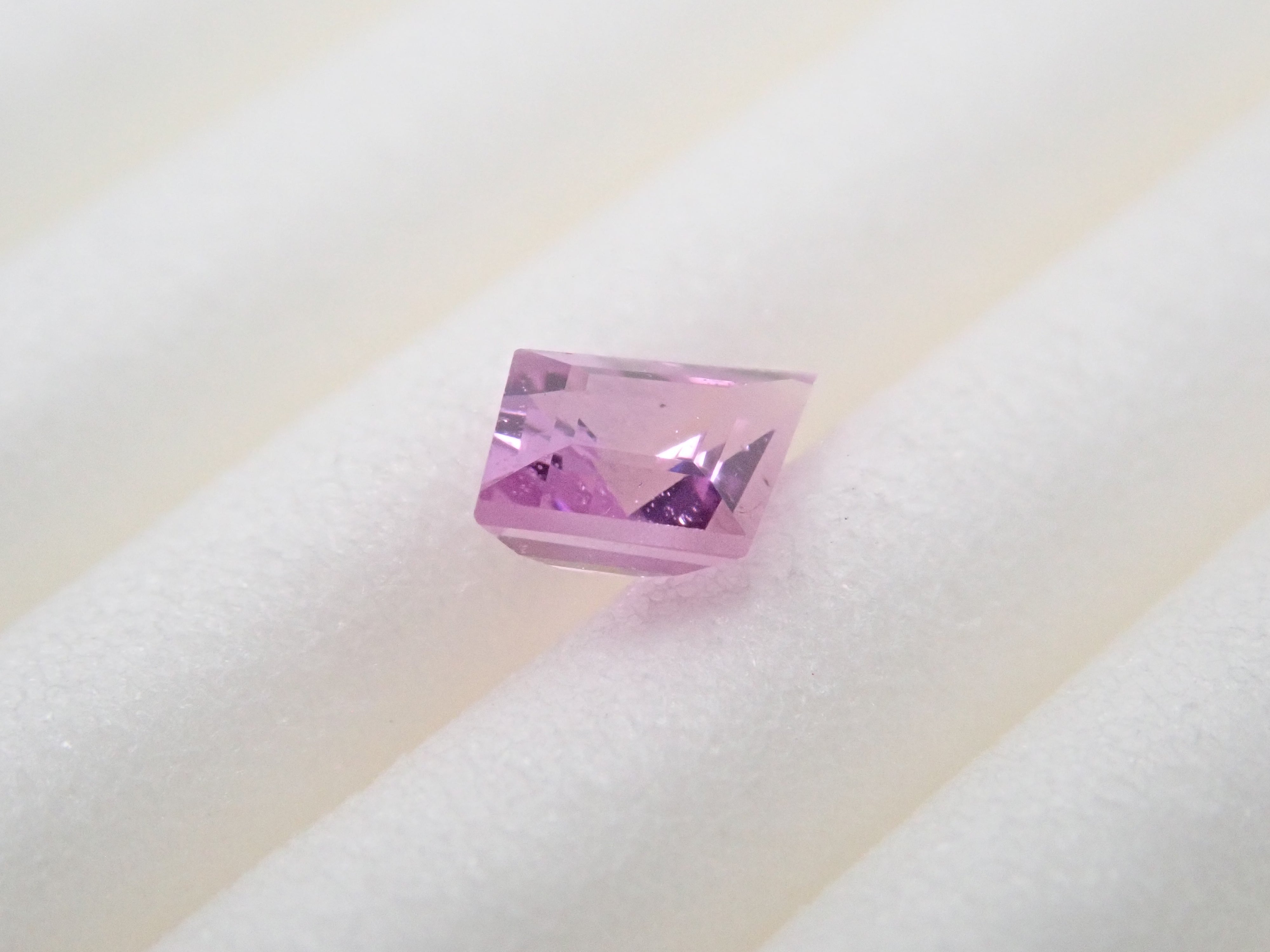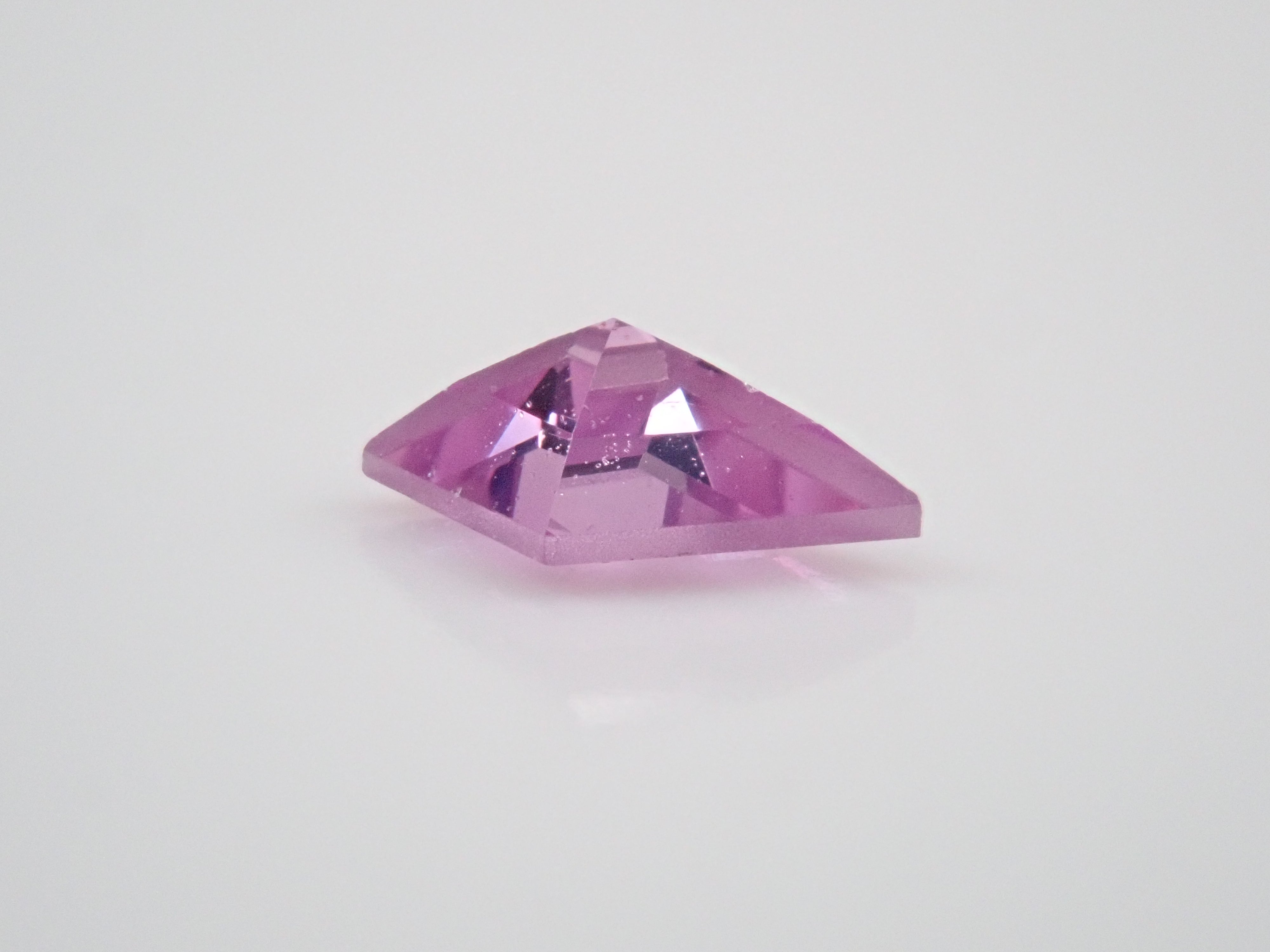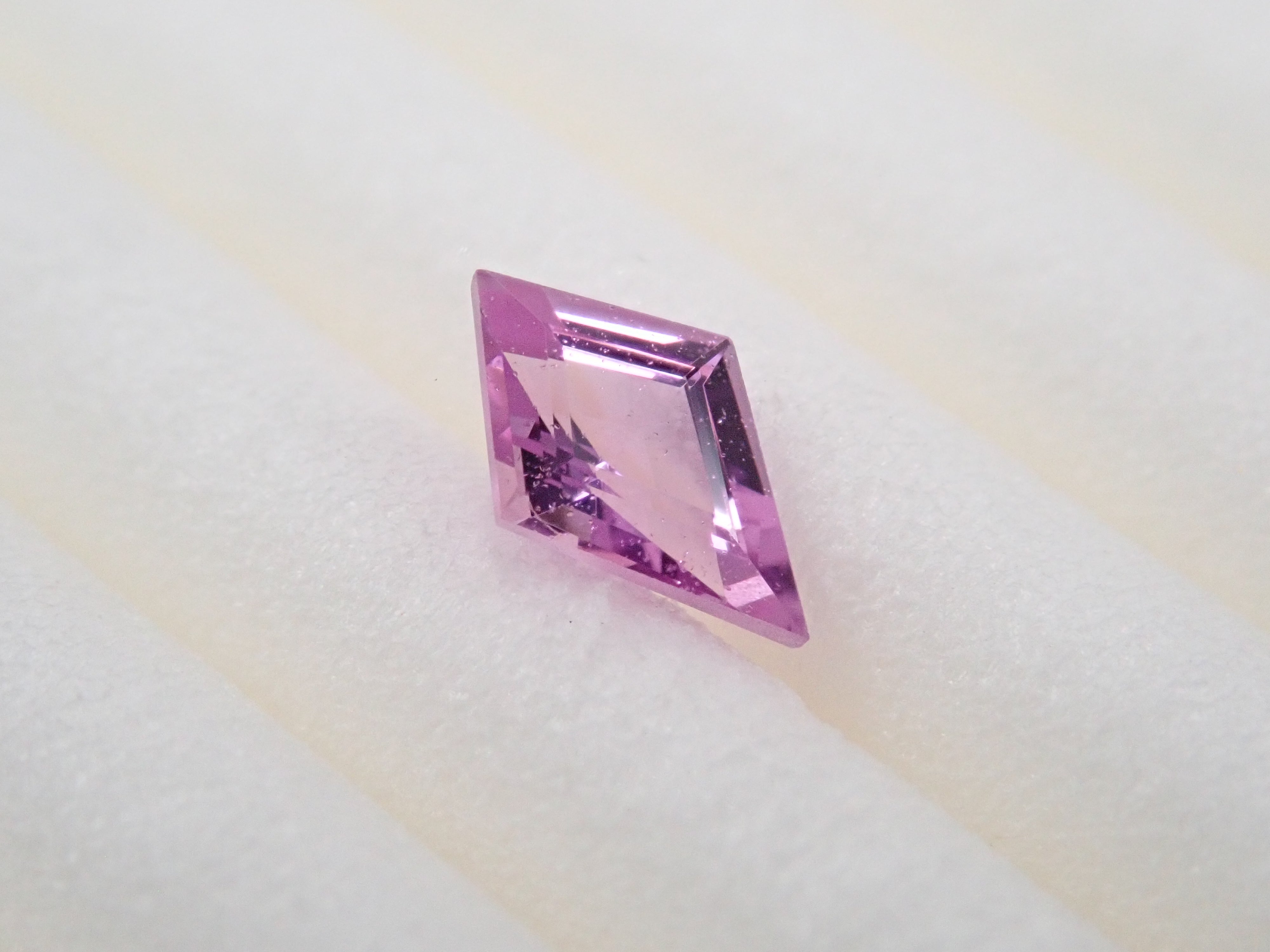 藍寶石是一種著名的寶石。礦物為剛玉,與紅寶石相同,但除紅色以外的所有剛玉稱為藍寶石。這是一顆帶有鮮明桃色的粉紅色藍寶石。藍寶石的硬度為 9,是僅次於鑽石的第二硬寶石,是一種高度堅韌、穩定且易於護理的寶石。這是一顆高品質紫色藍寶石,重 0.199 克拉,菱形切工,透明度高。它是粉紫色的。