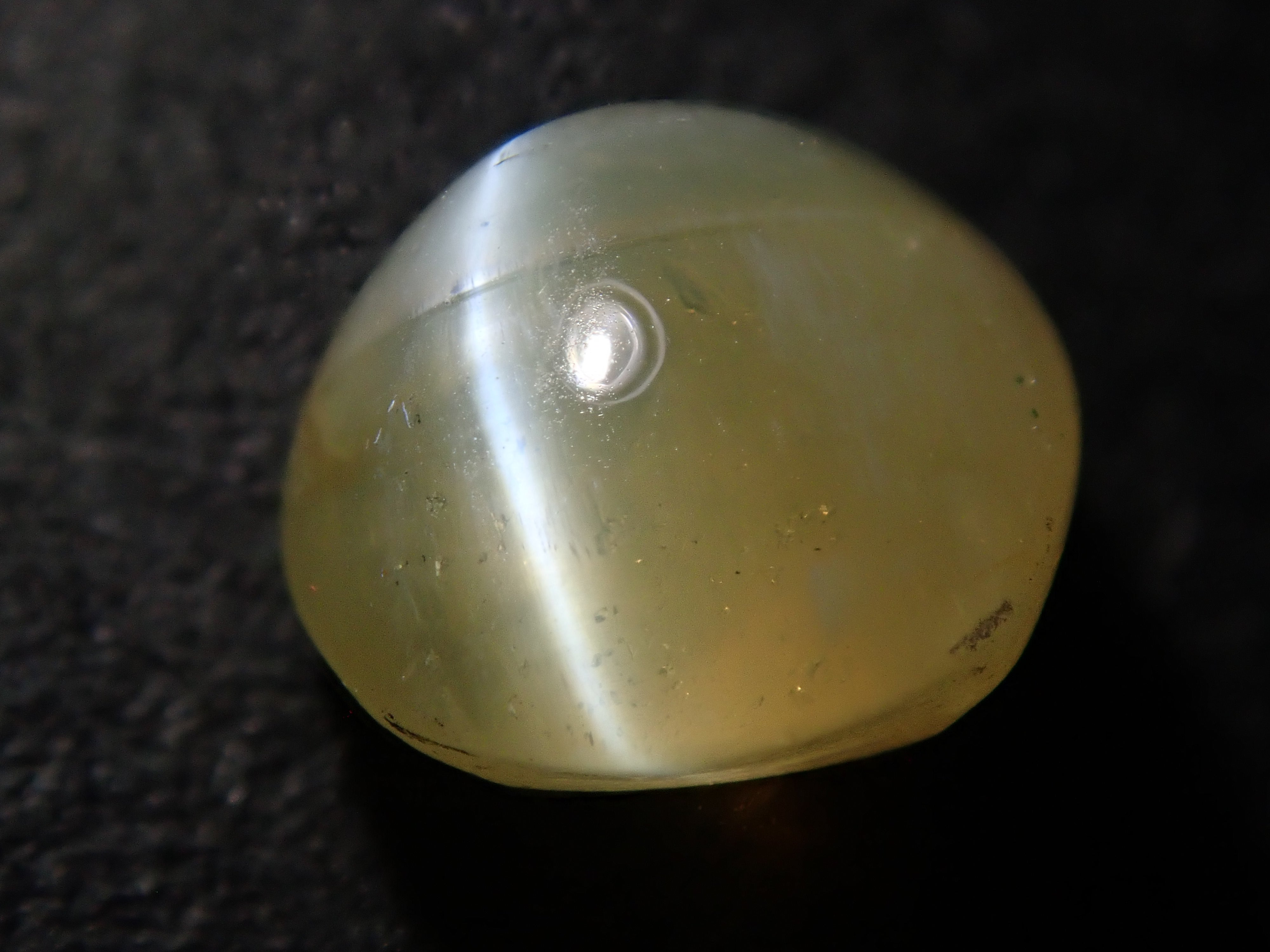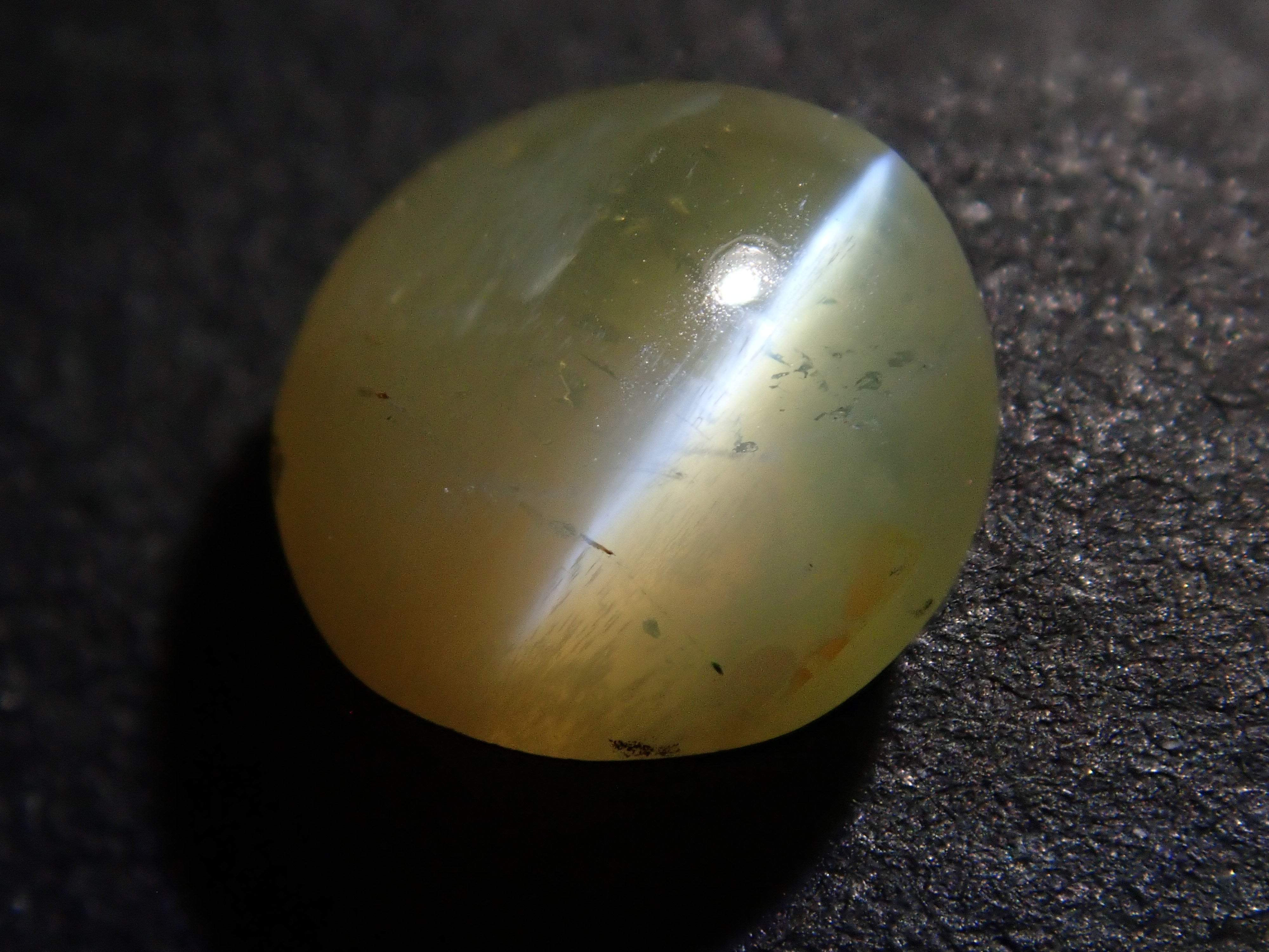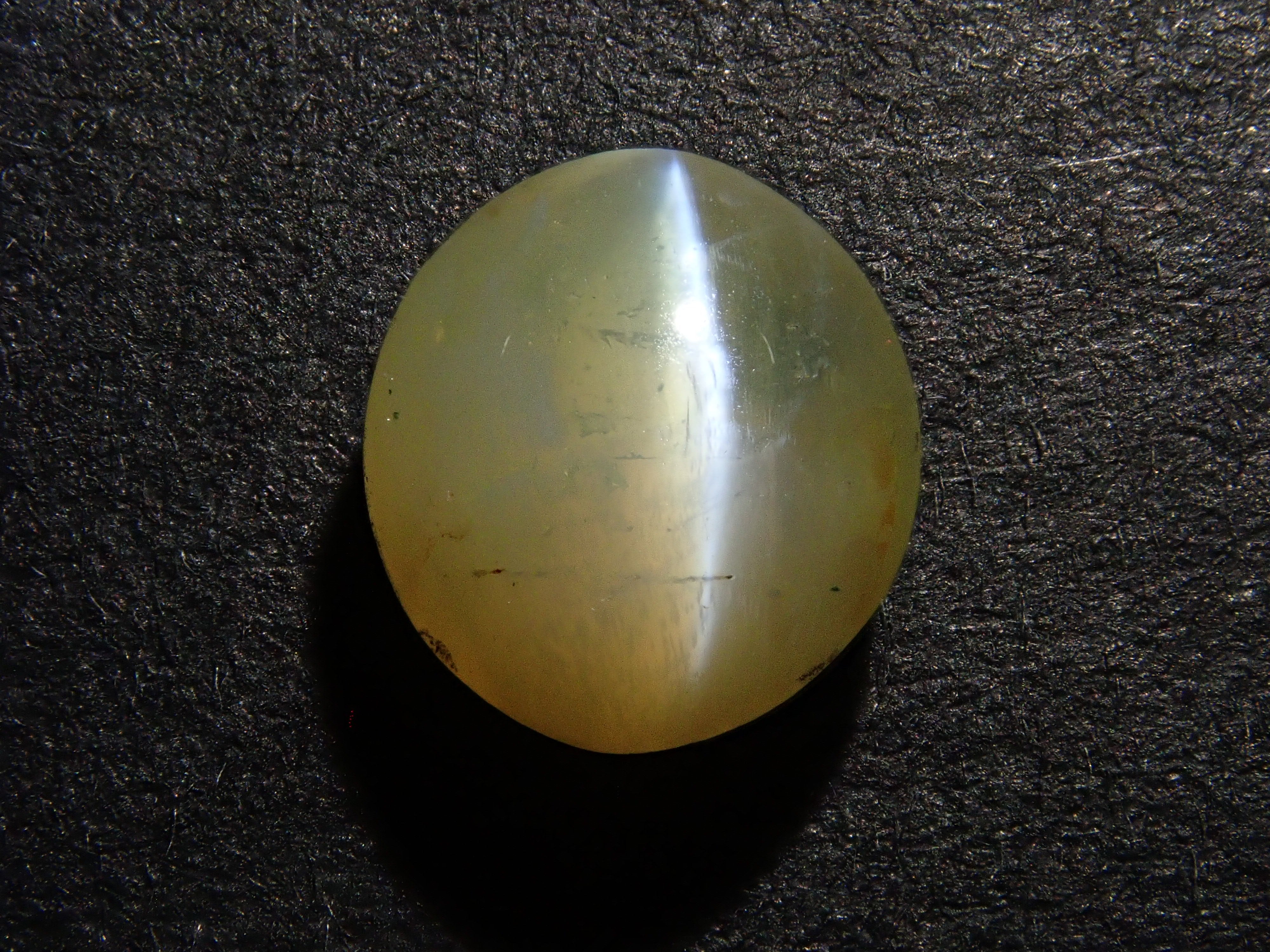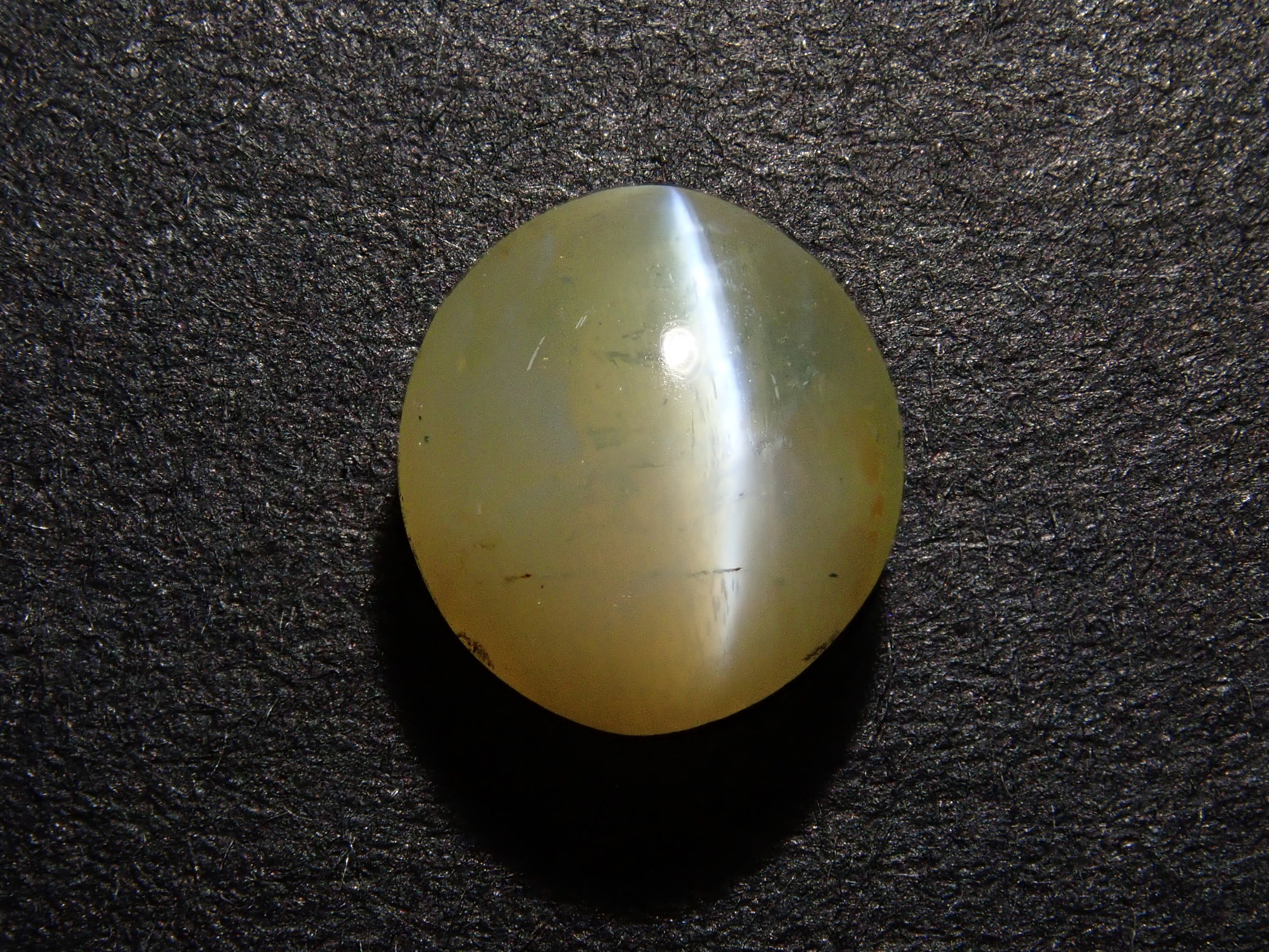 金綠寶石是一種有多種色調的寶石,從淺黃色到綠色再到深棕色。它是一種堅硬耐用的寶石。這是可以看到貓眼效果的類型,使用筆燈拍攝。石頭的背面基本上是未拋光的。有兩種類型的光:一種從石頭上方照射,另一種從石頭側面照射。