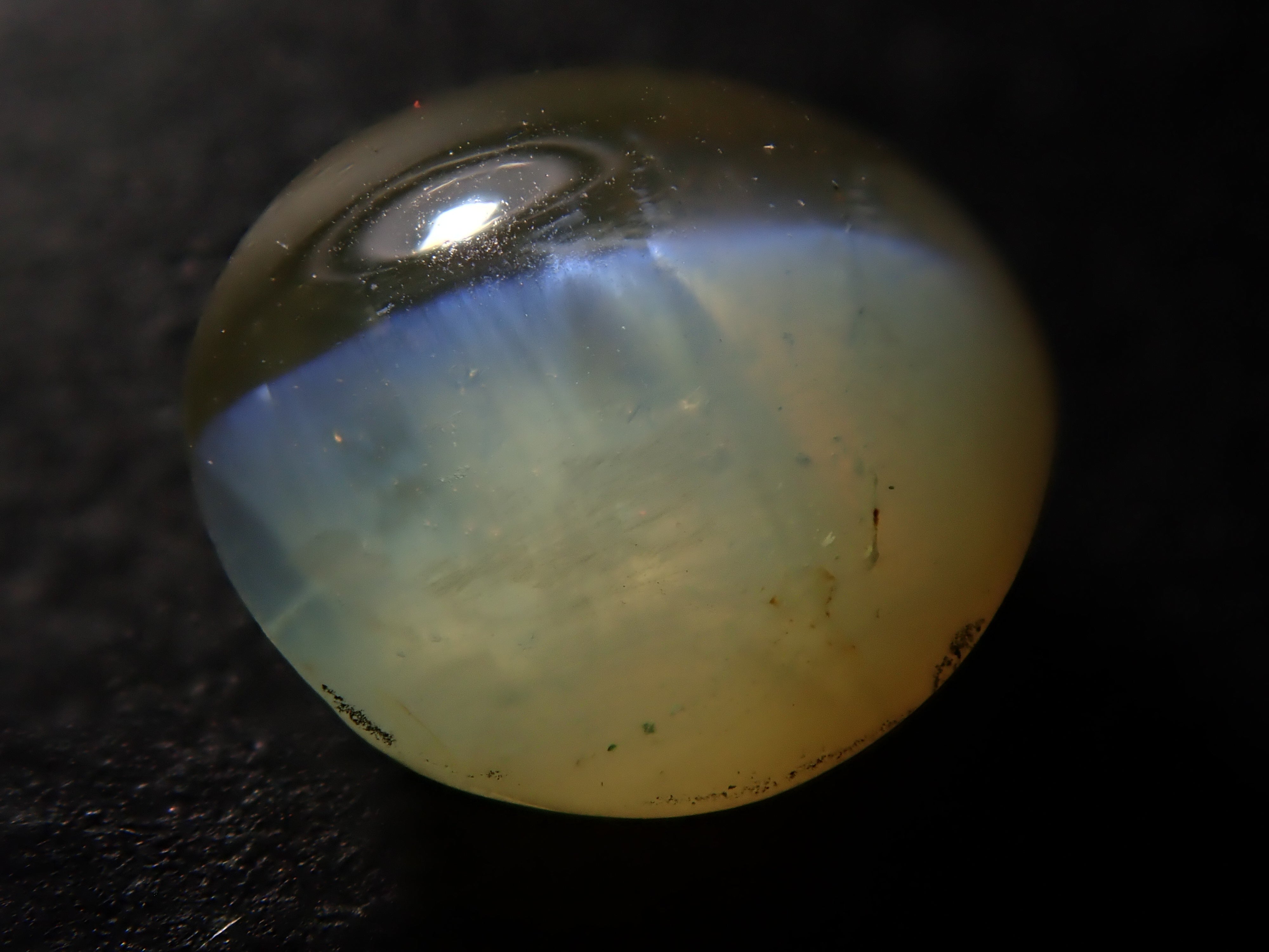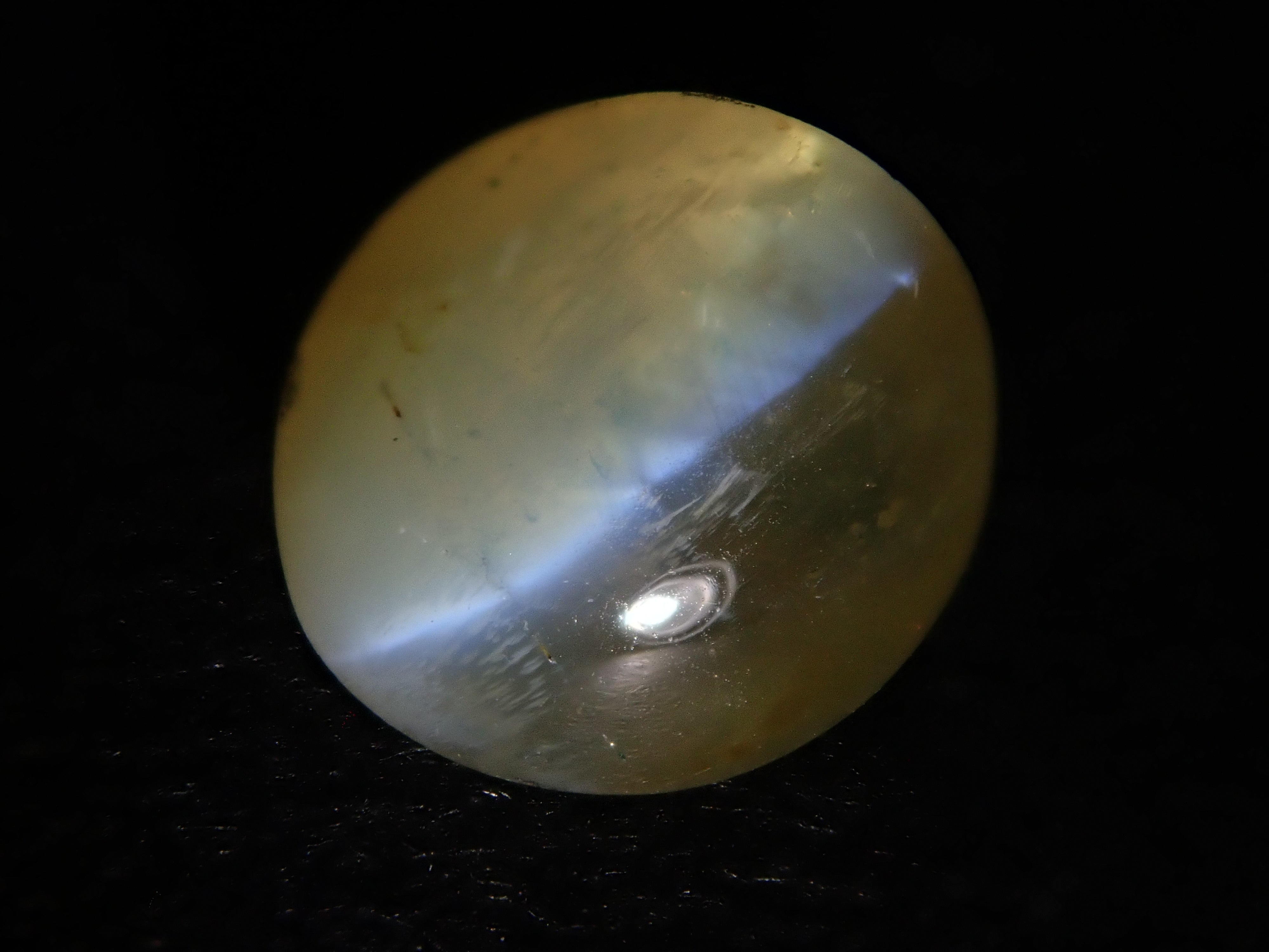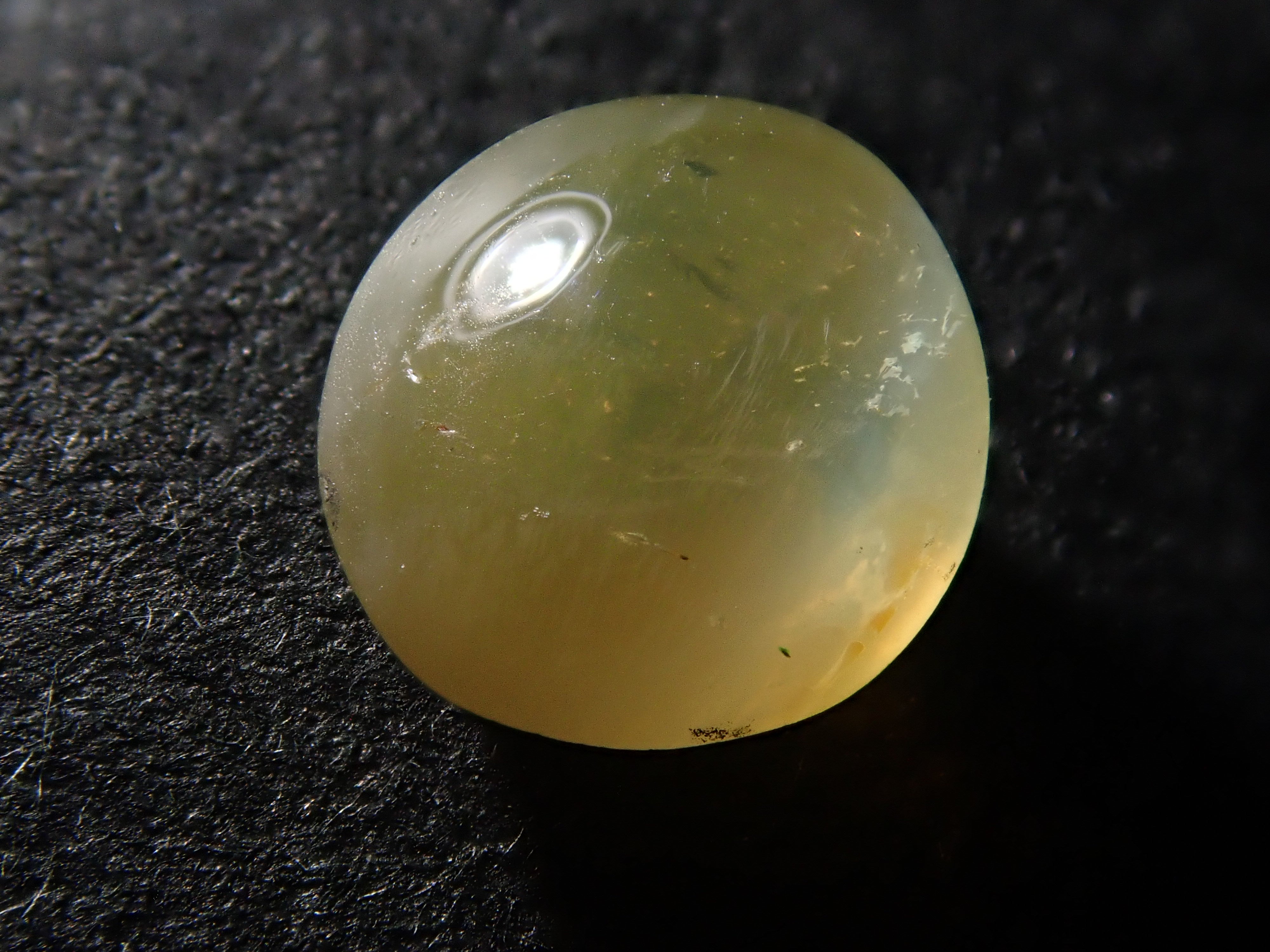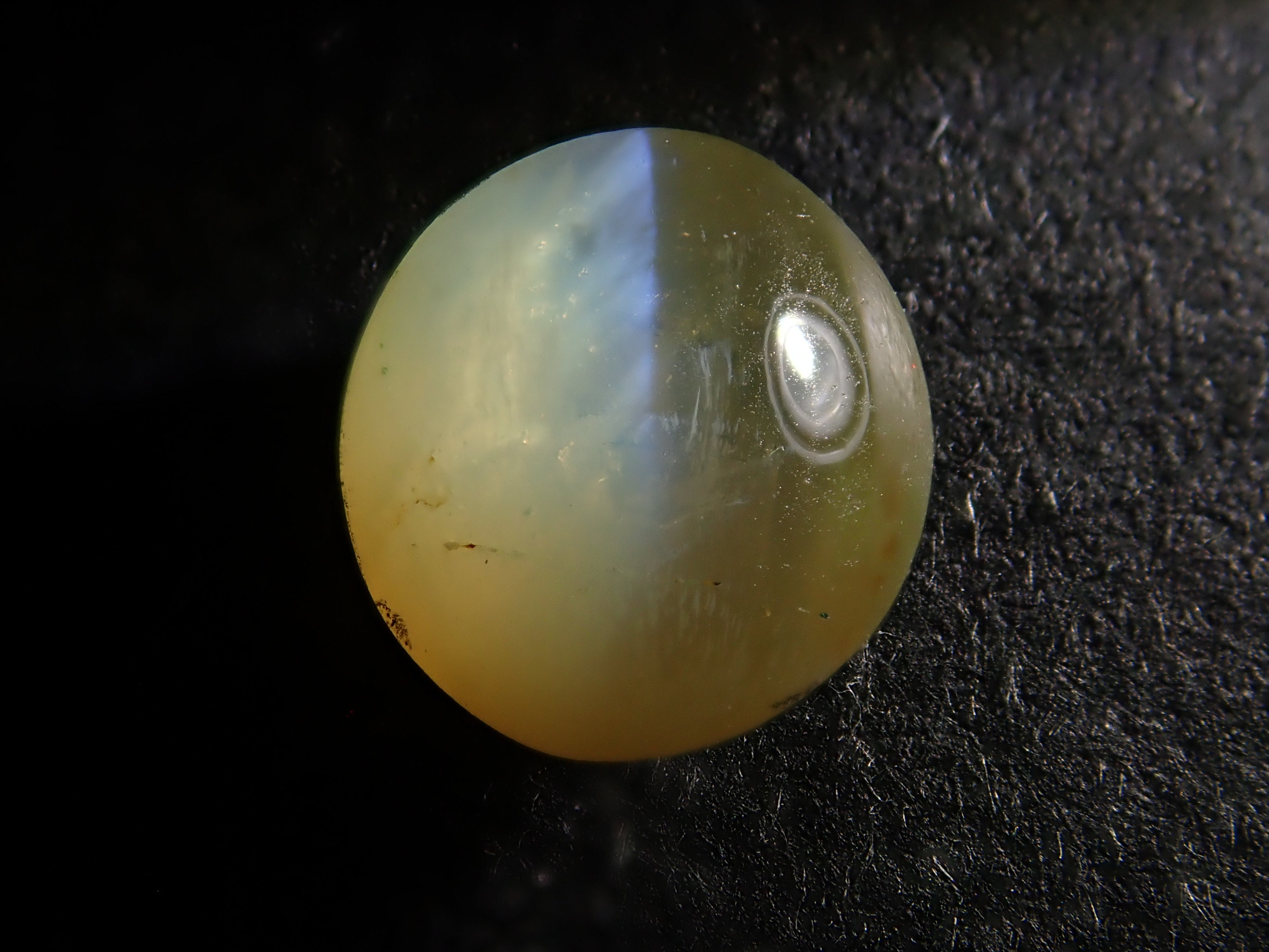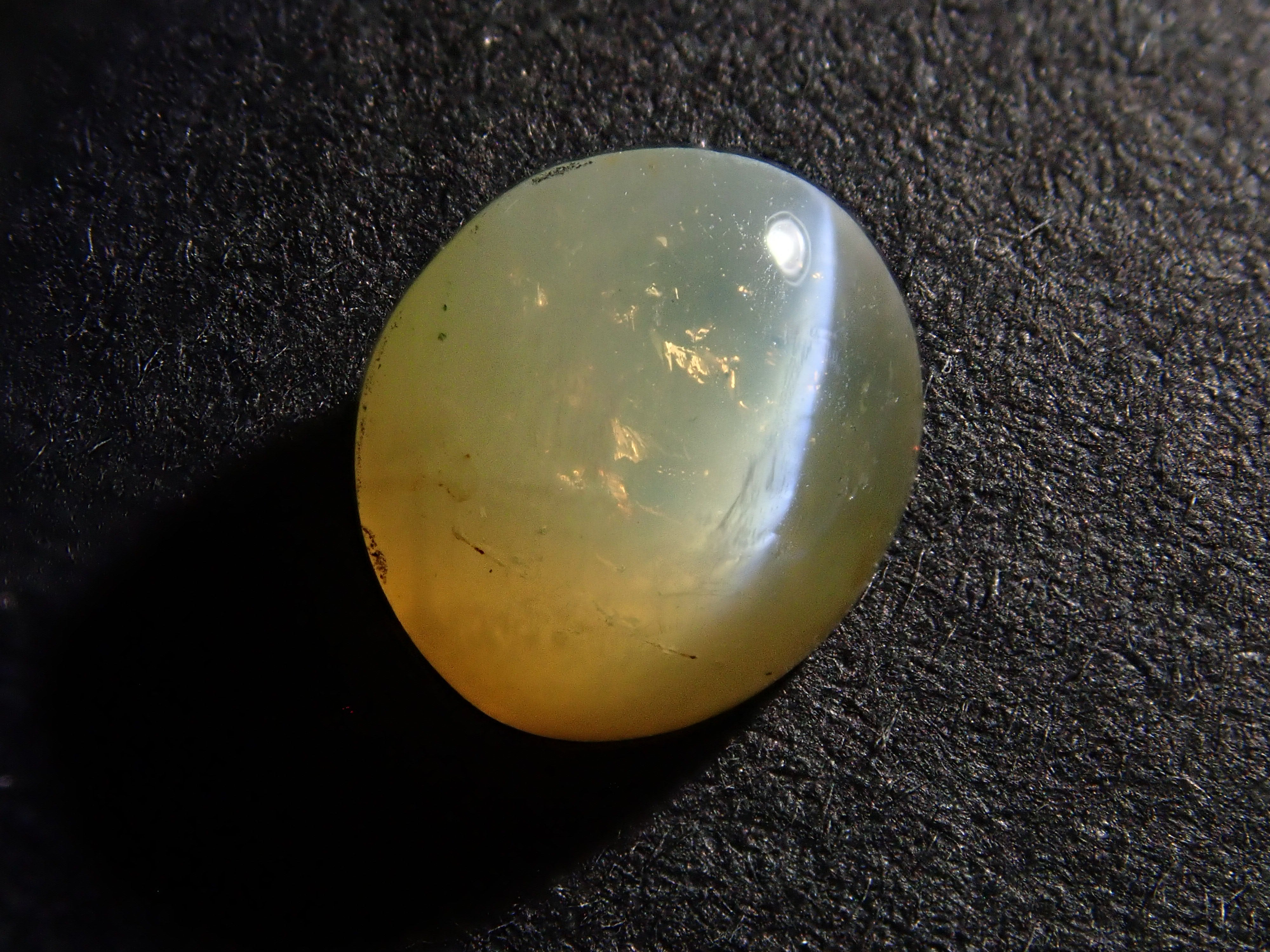 金綠寶石是一種有多種色調的寶石,從淺黃色到綠色再到深棕色。它是一種堅硬耐用的寶石。這是可以看到貓眼效果的類型,使用筆燈拍攝。石頭的背面基本上是未拋光的。有兩種類型的光:一種從石頭上方照射,另一種從石頭側面照射。