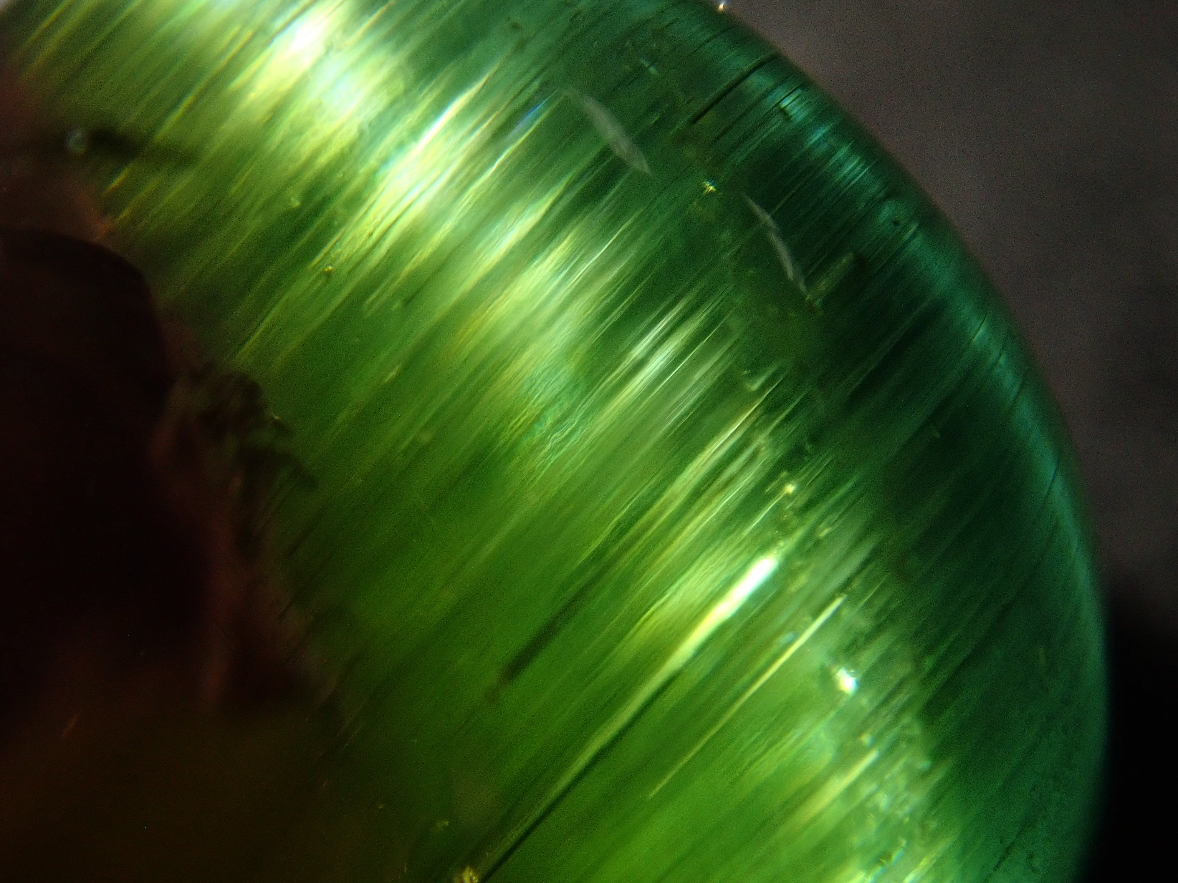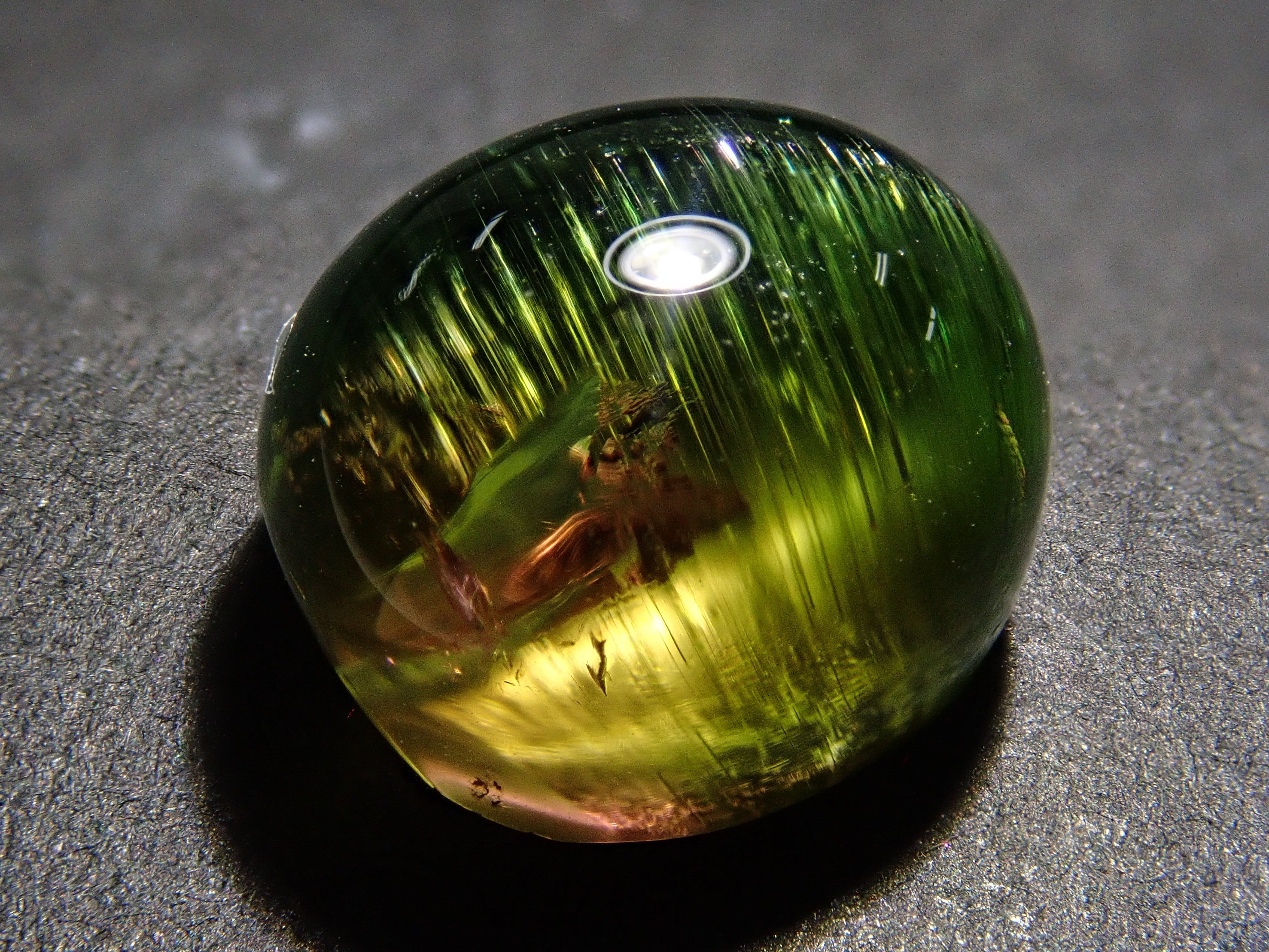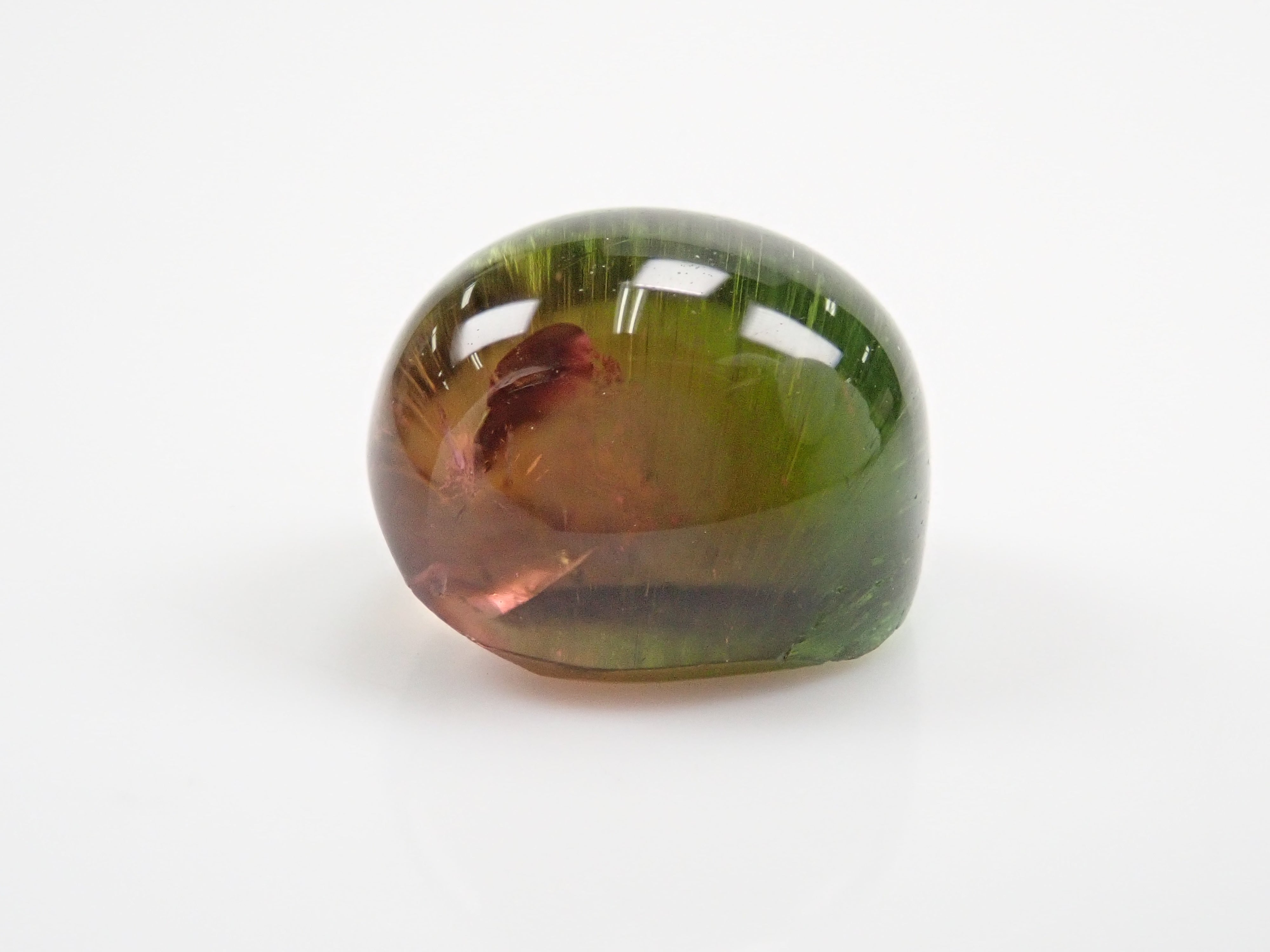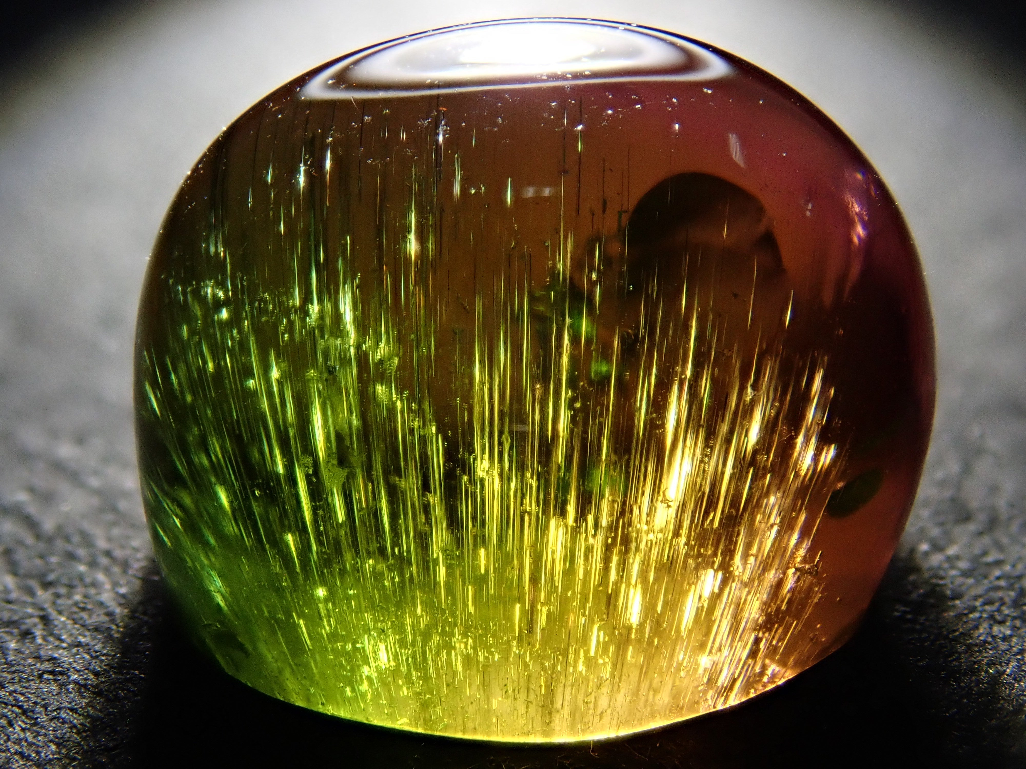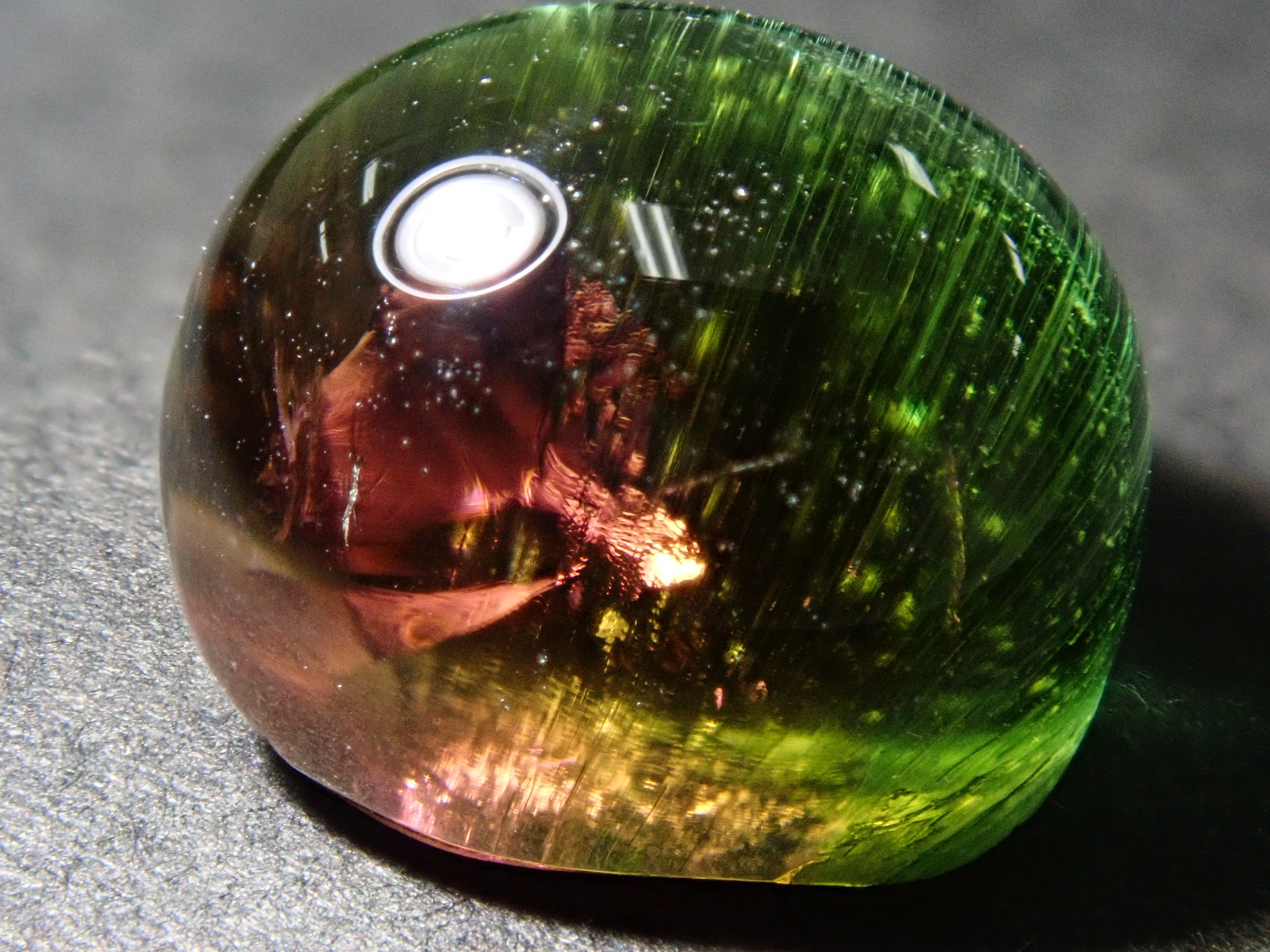 碧璽被稱為色彩寶庫。它有無數豐富的顏色,包括粉紅色、紅色、藍色、綠色、靛藍、橙色、紫色、黑色和棕色。在這種類型中,您可以在一顆寶石中看到兩種顏色並具有貓眼效果。筆燈用於攝影。石頭的背面基本上是未拋光的。