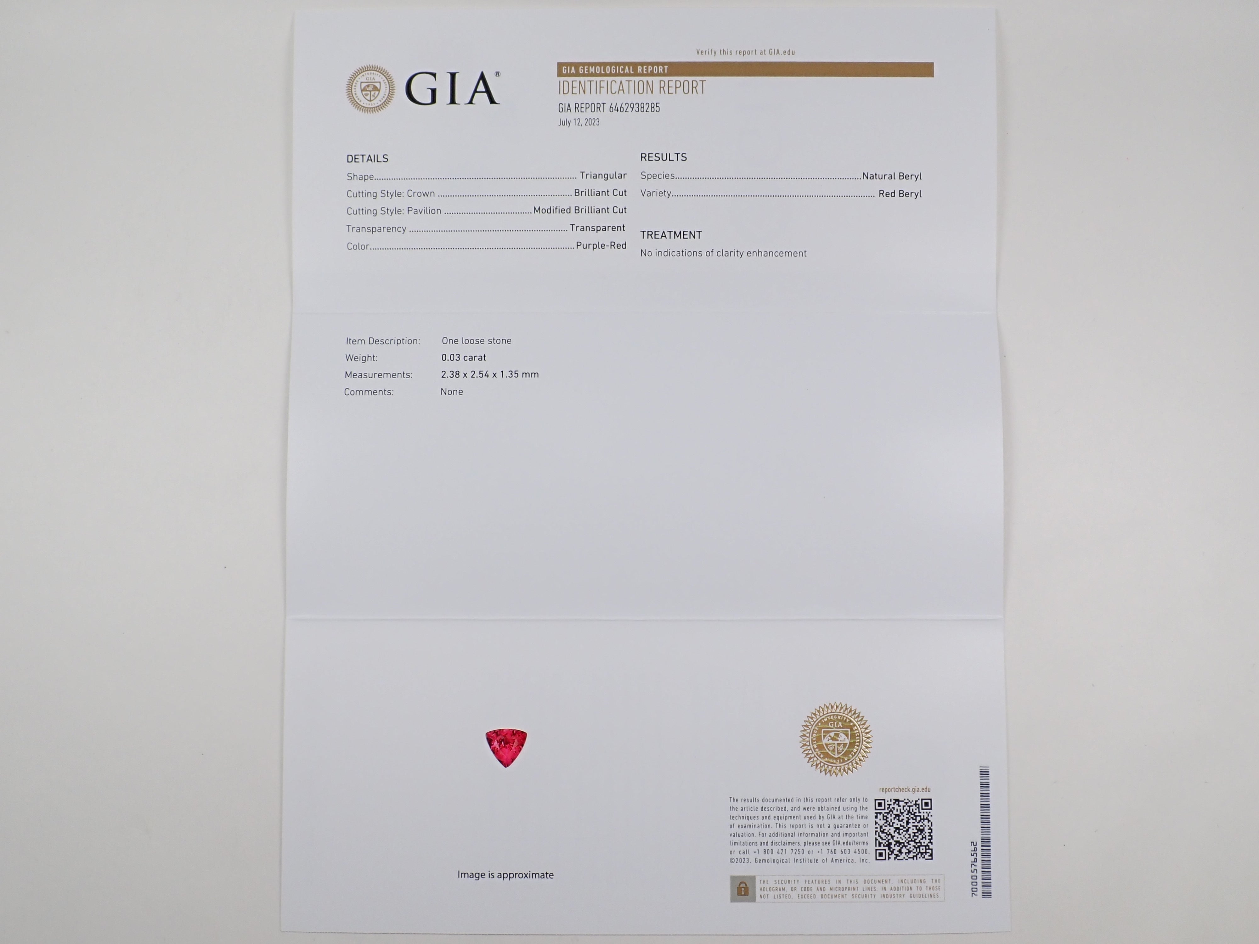 無油紅色綠柱石 0.030 克拉裸石 GIA