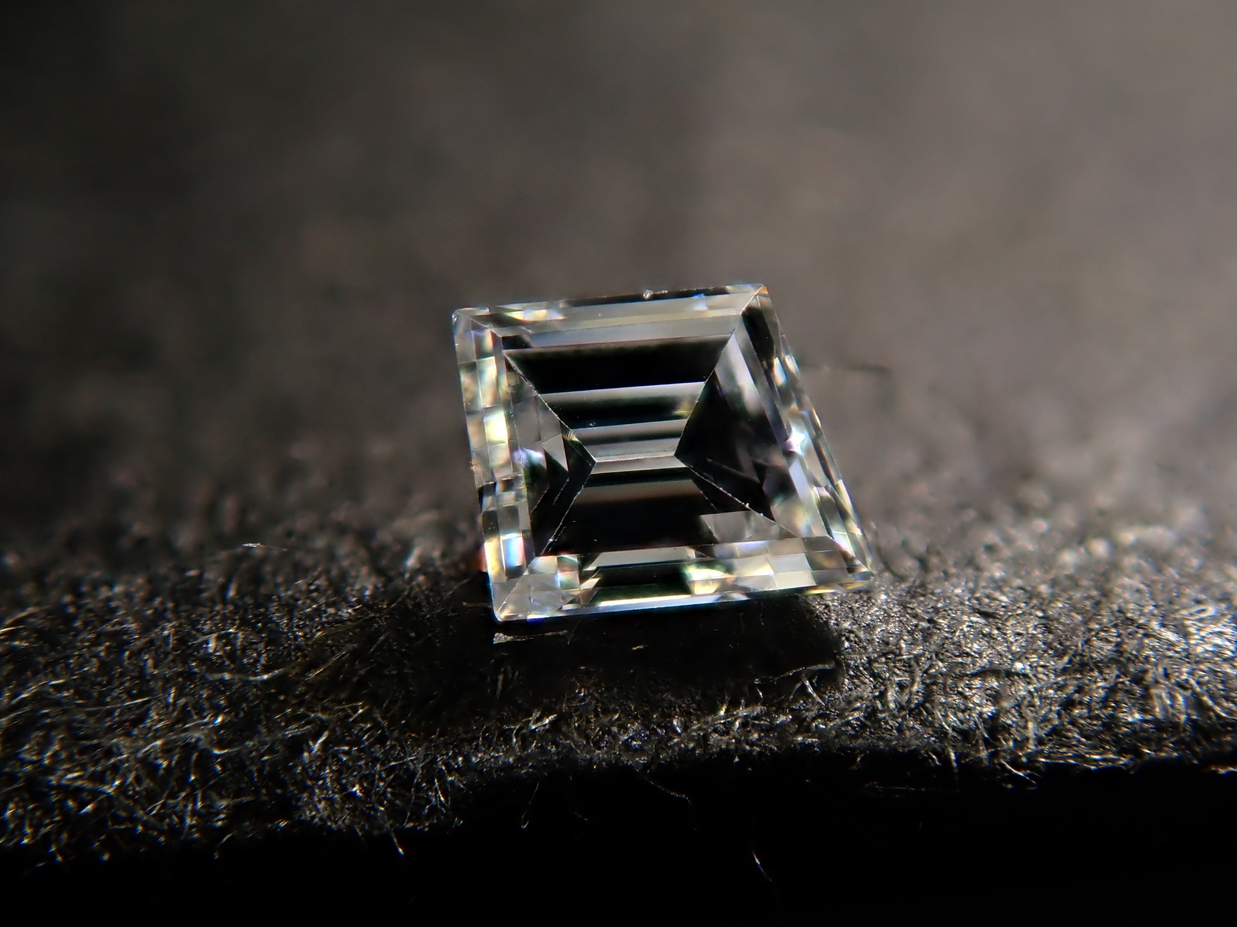 如果有螢光照片,它們是在暗室中在強黑光下拍攝的。如果您想在家中觀看螢光,可以透過將房間調暗或用手掌遮住珠寶來欣賞美麗的螢光。這是一顆梯形切割(梯形切割)無色鑽石,相當於 VS 級。