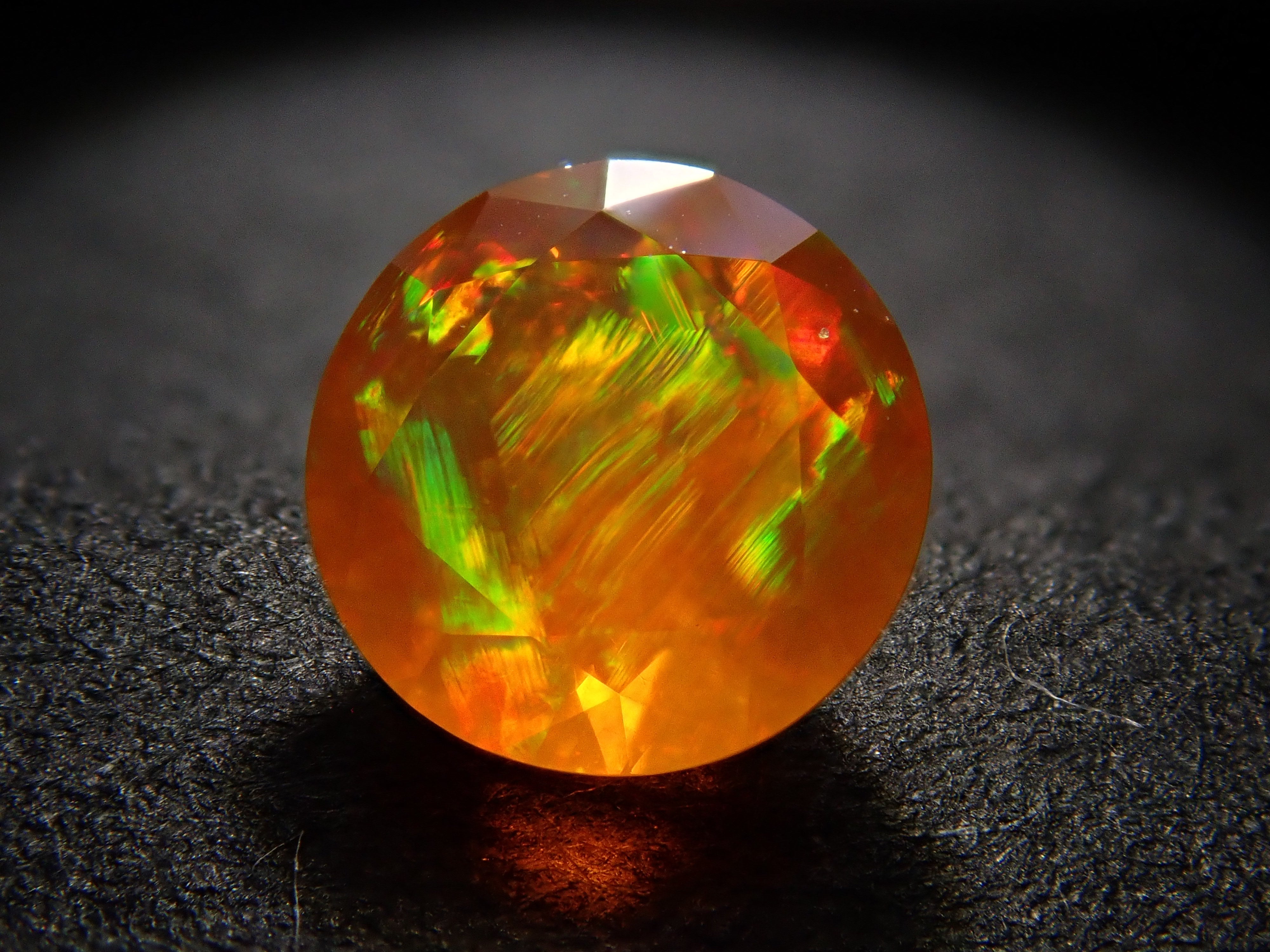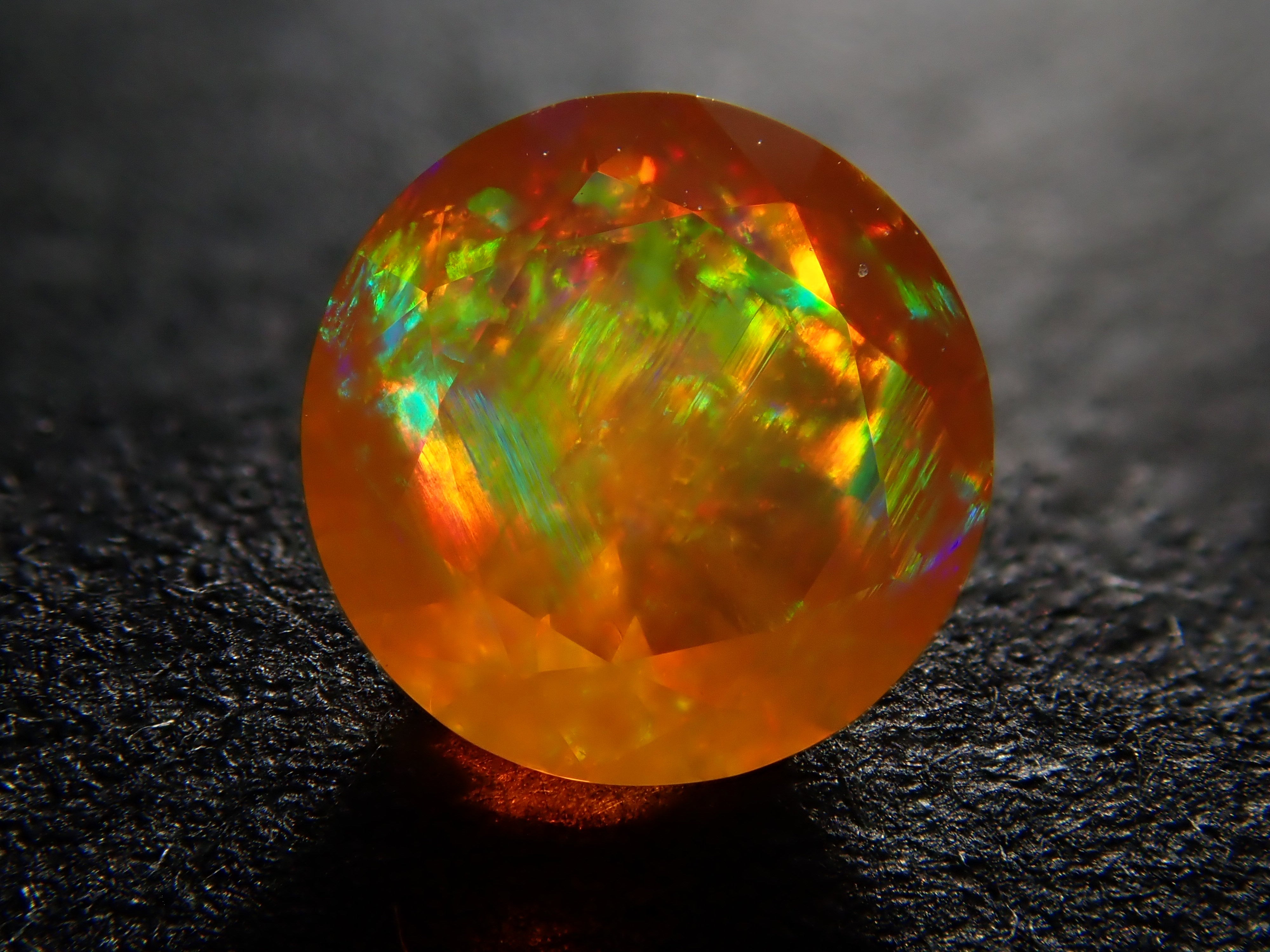 當這種火蛋白石在黑色背景下暴露在光線下時,會呈現出奇妙的色彩變化。