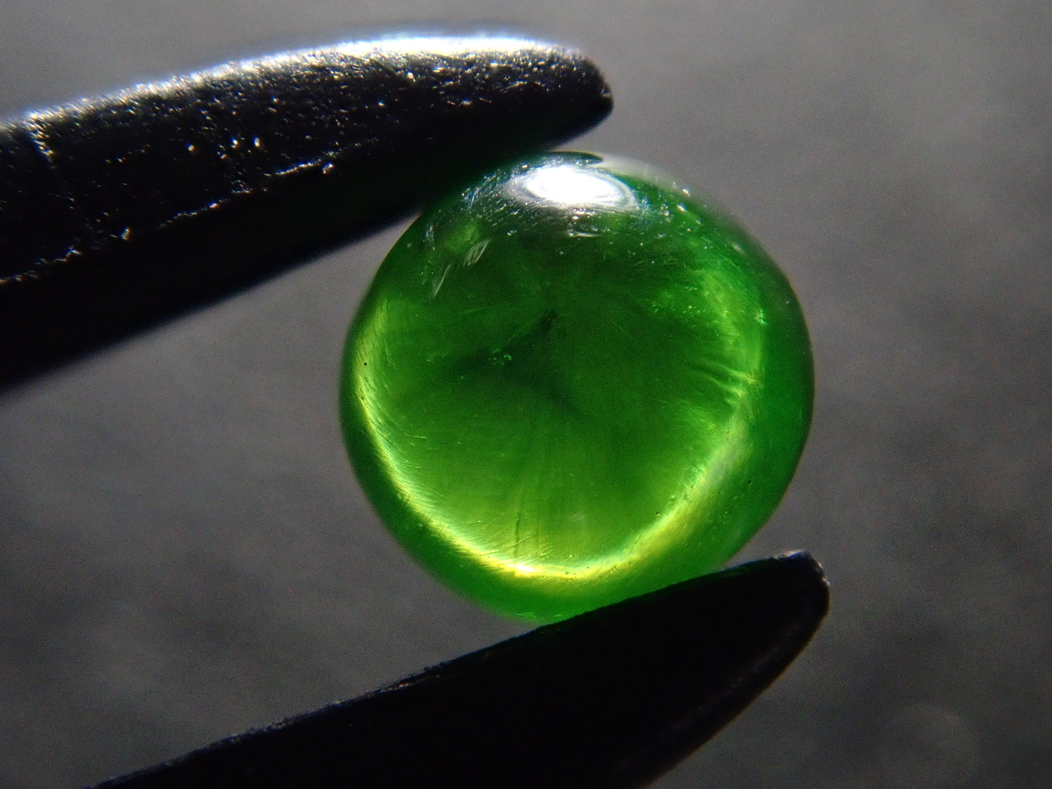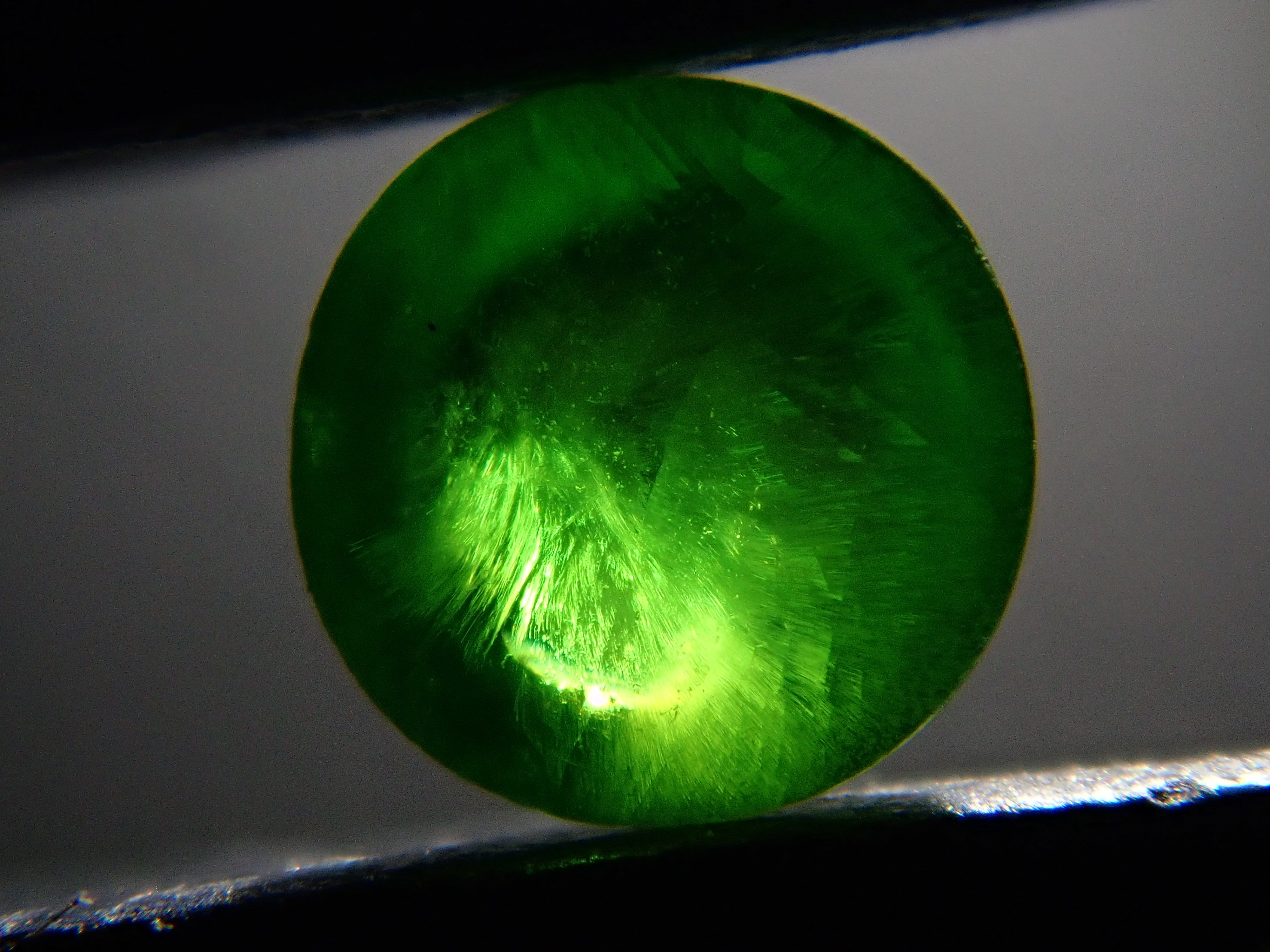 石榴石具有強烈的光色散和強烈的閃光。其中,這顆綠色的「濃綠榴石」是一種特別美麗且稀有的石榴石。這種類型的內含物被稱為“馬尾”,看起來像馬尾巴,甚至有貓眼效果。而且,這在俄羅斯也是很少見的。筆燈用於攝影。石頭的背面基本上是未拋光的。透過顯微鏡檢查證實了馬尾草的存在。