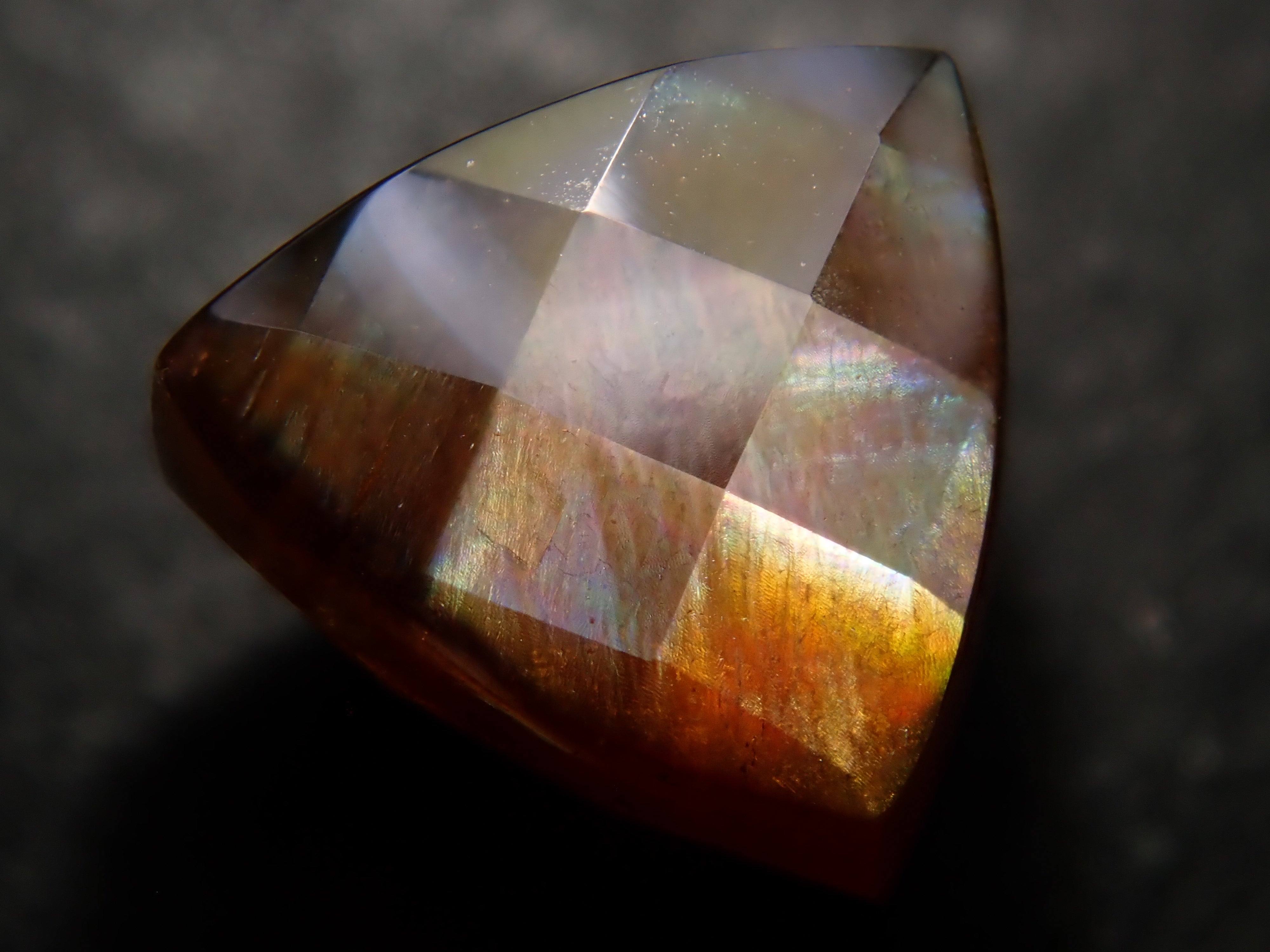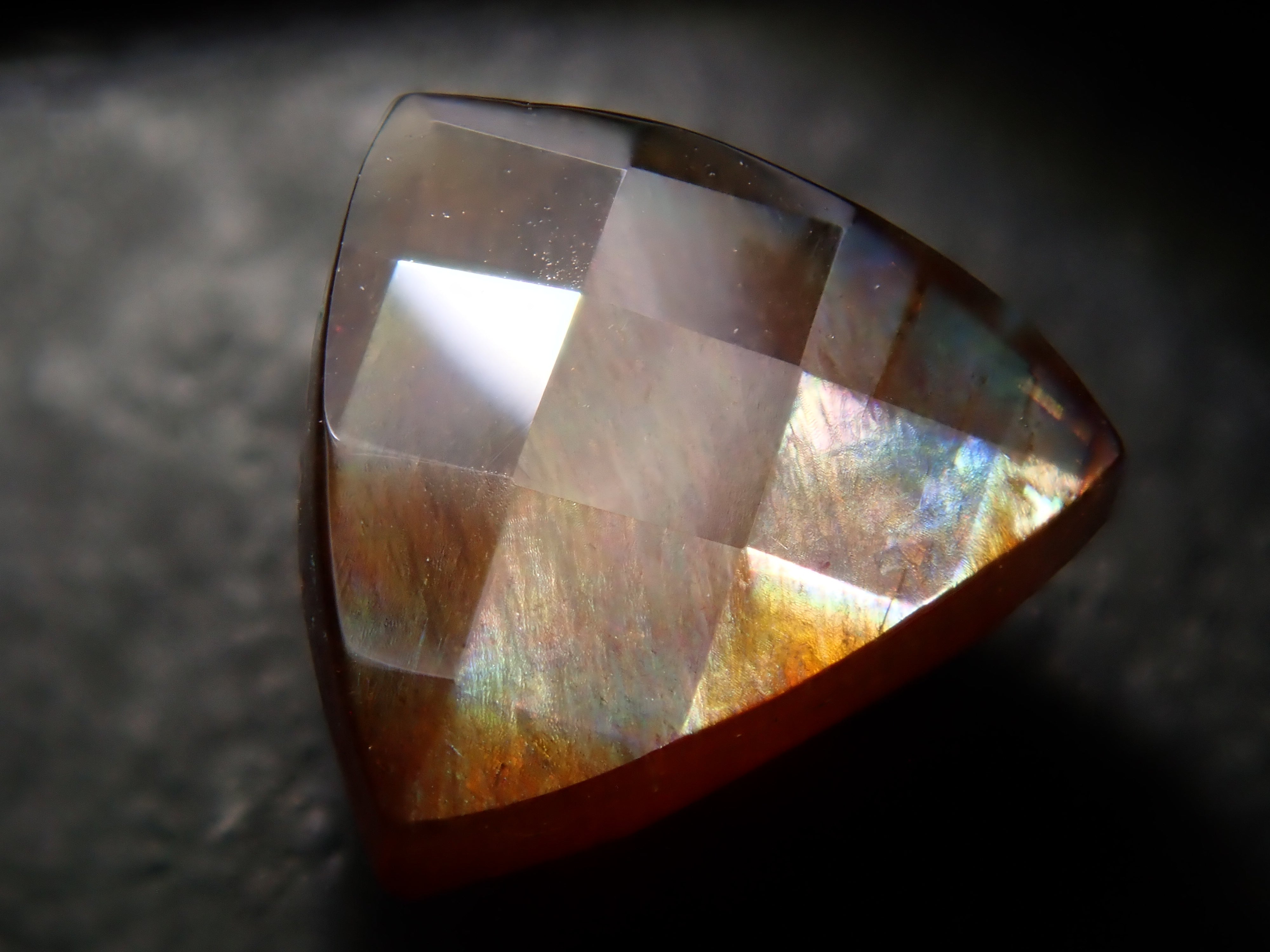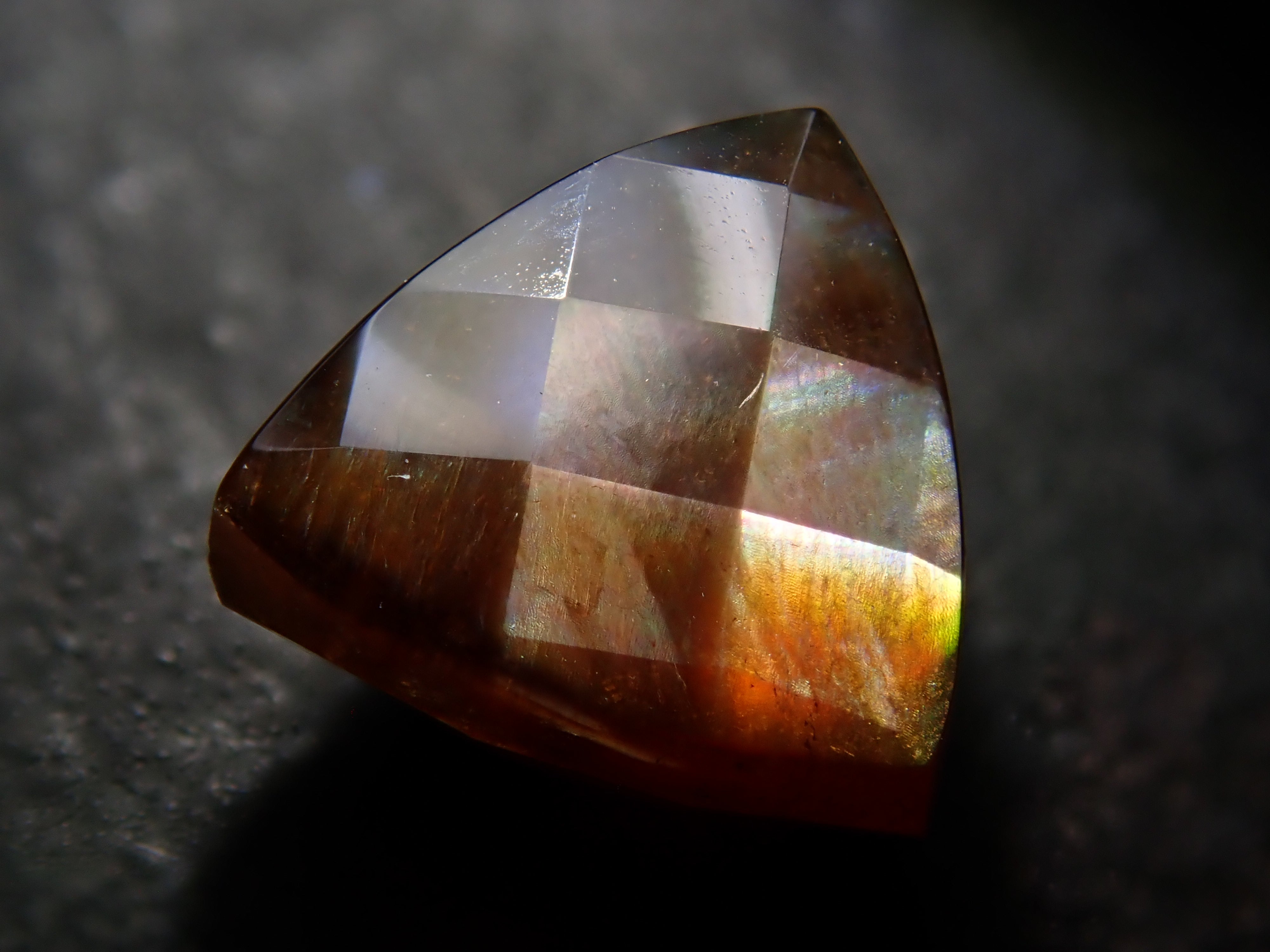 石榴石是一月的生日石。這是一種稍微不尋常的類型,您可以看到虹彩效果。由於其外觀,它被俗稱為“彩虹石榴石”和“虹彩鈣鐵榴石石榴石”。這是產自奈良縣天川村的棋盤形切割彩虹石榴石(鈣鐵榴石石榴石)。
