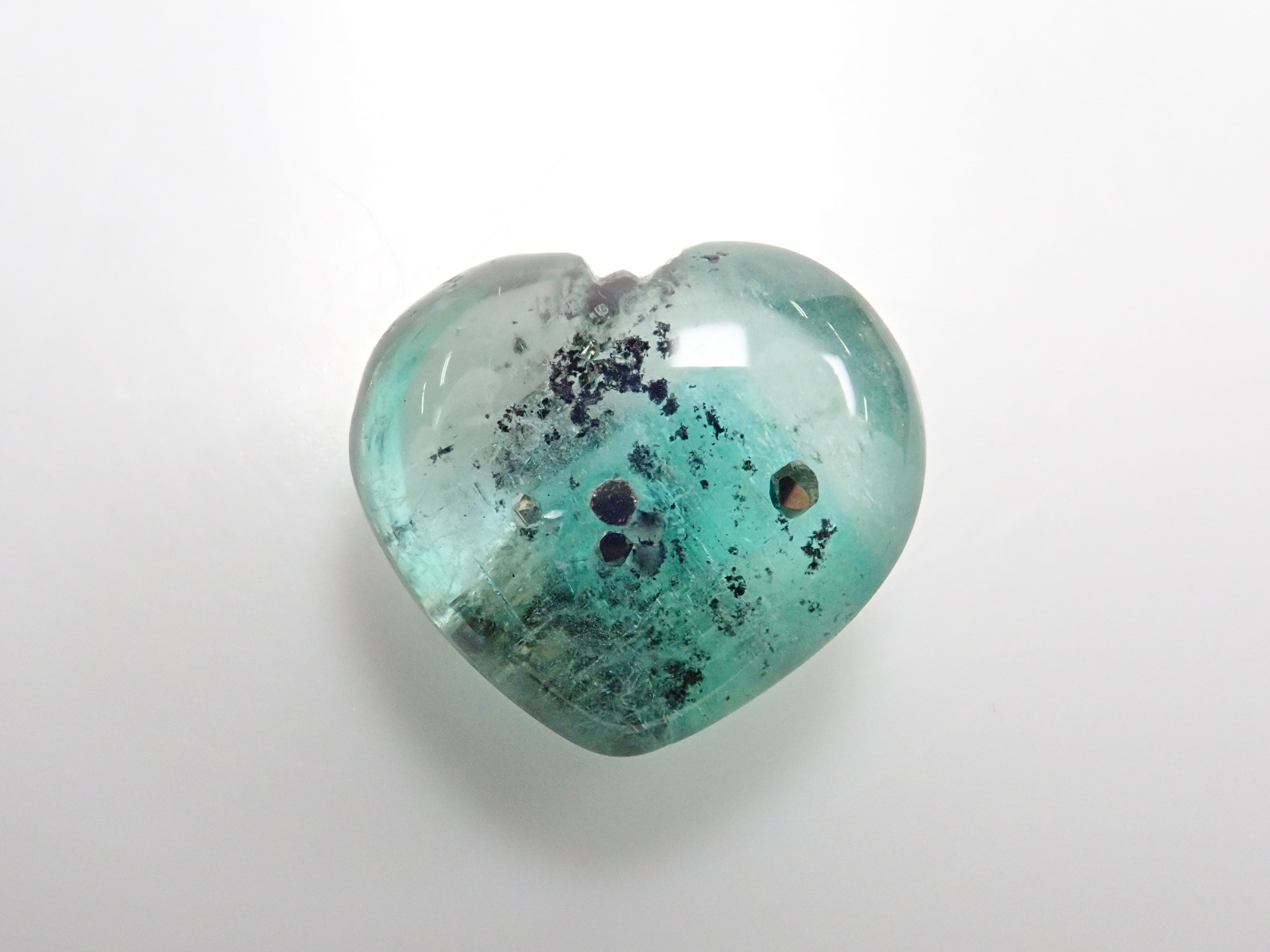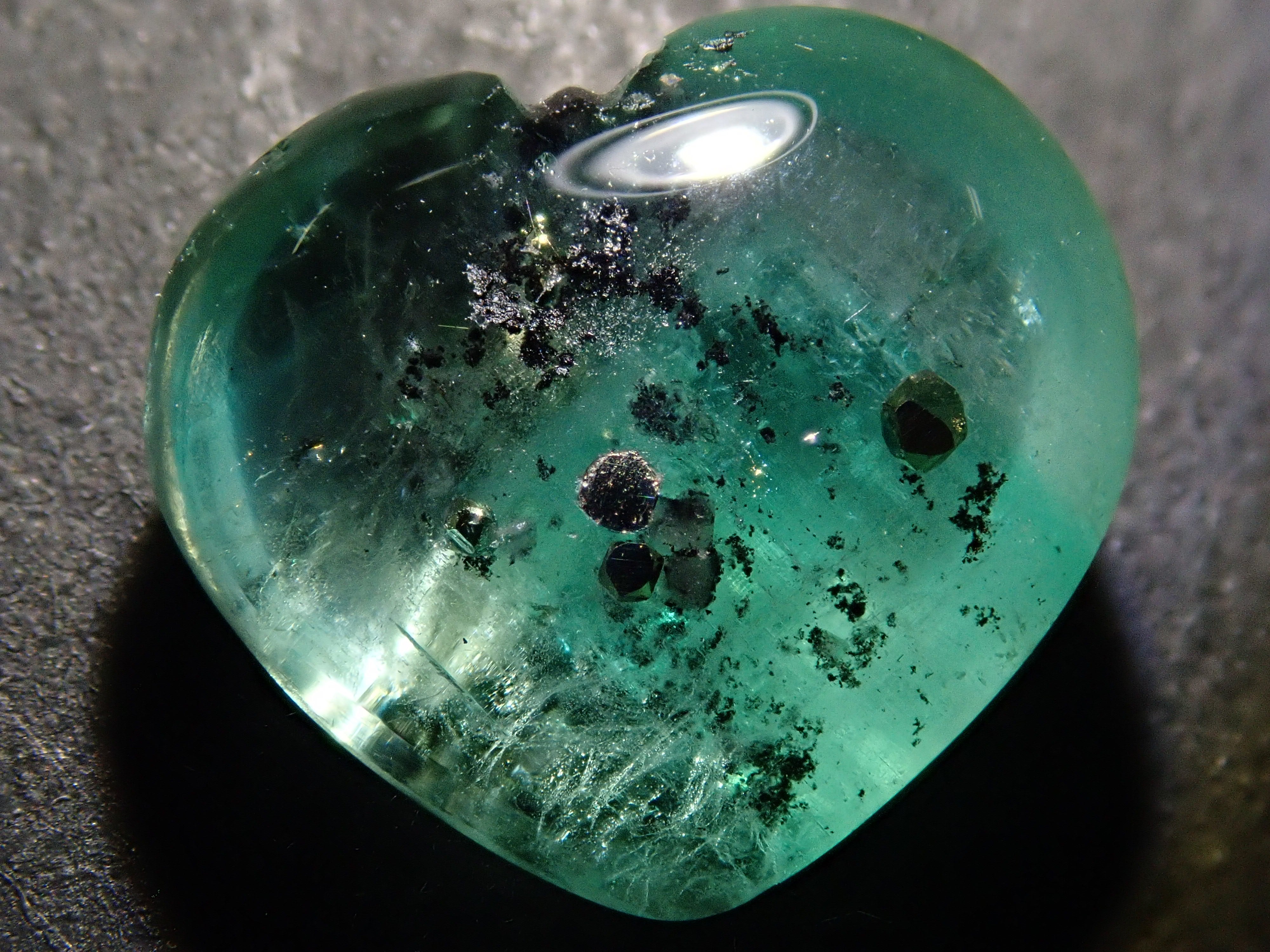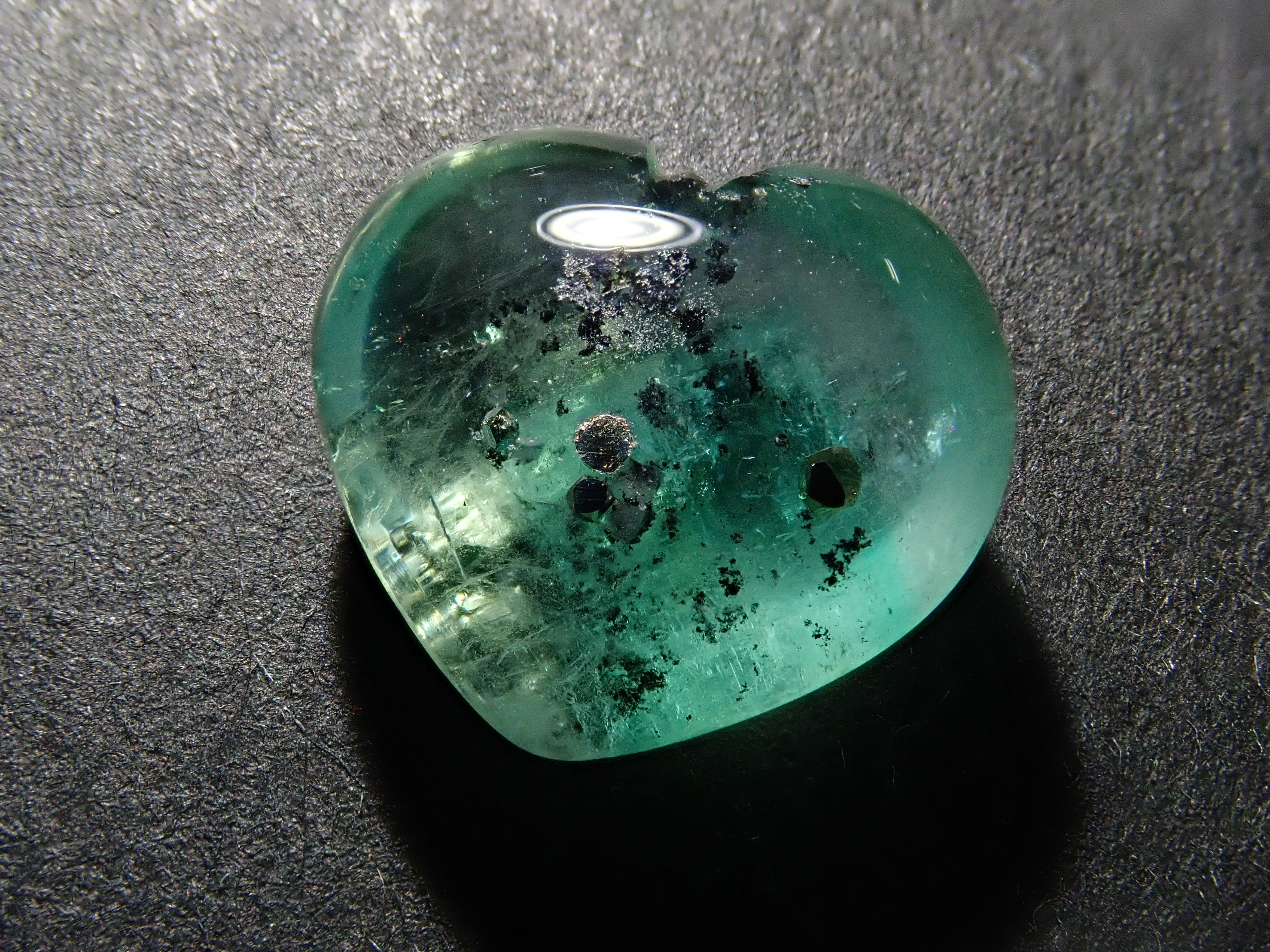 據說祖母綠美麗的綠色會根據其生長地點的不同而改變。這是產自哥倫比亞的祖母綠,據說有特別深的綠色。祖母綠通常是一種有很多划痕的寶石,因此通常會用油對其進行處理,以使划痕不那麼明顯。享受優雅的綠色。這是祖母綠中的黃鐵礦,祖母綠中含有非常稀有的黃鐵礦。這是心形切割。
