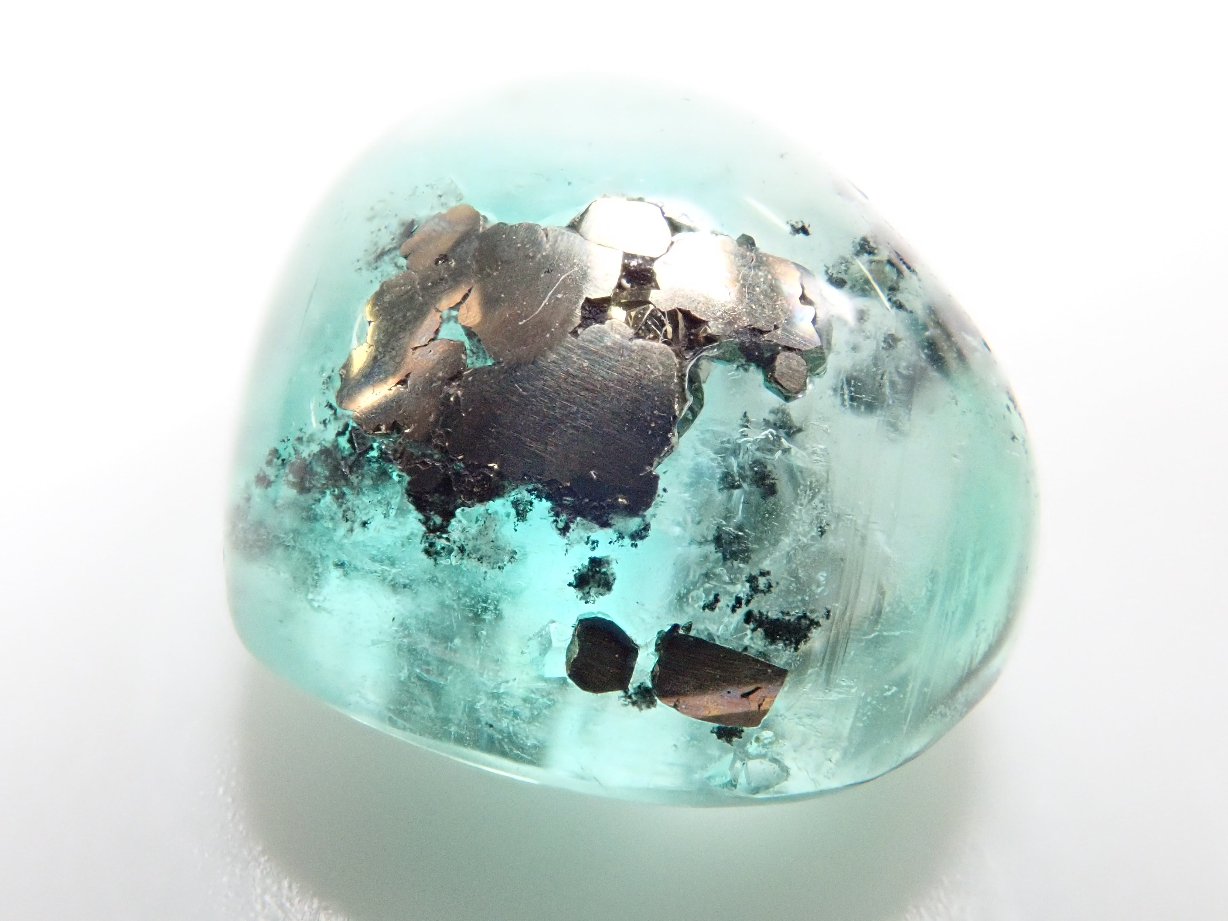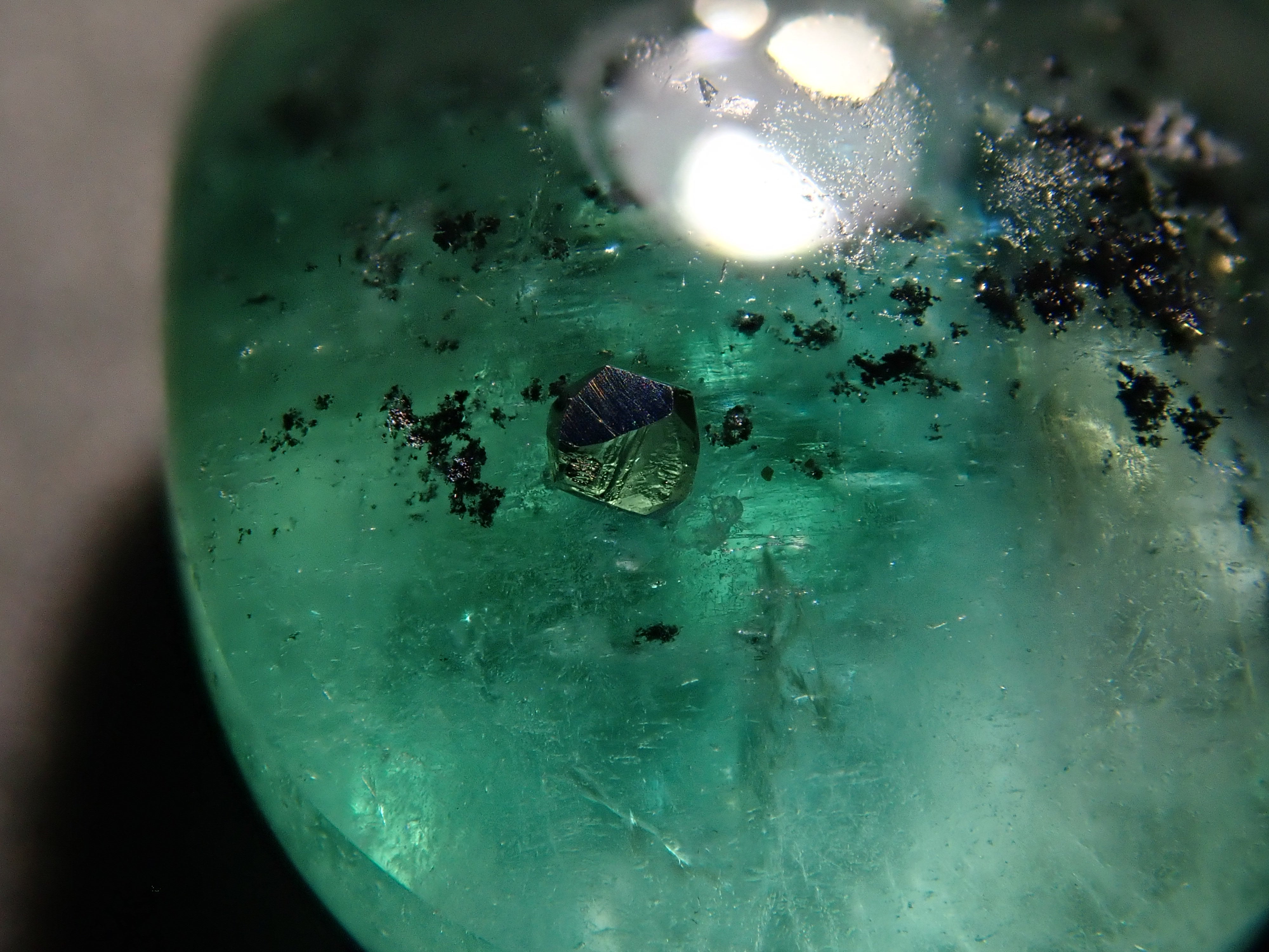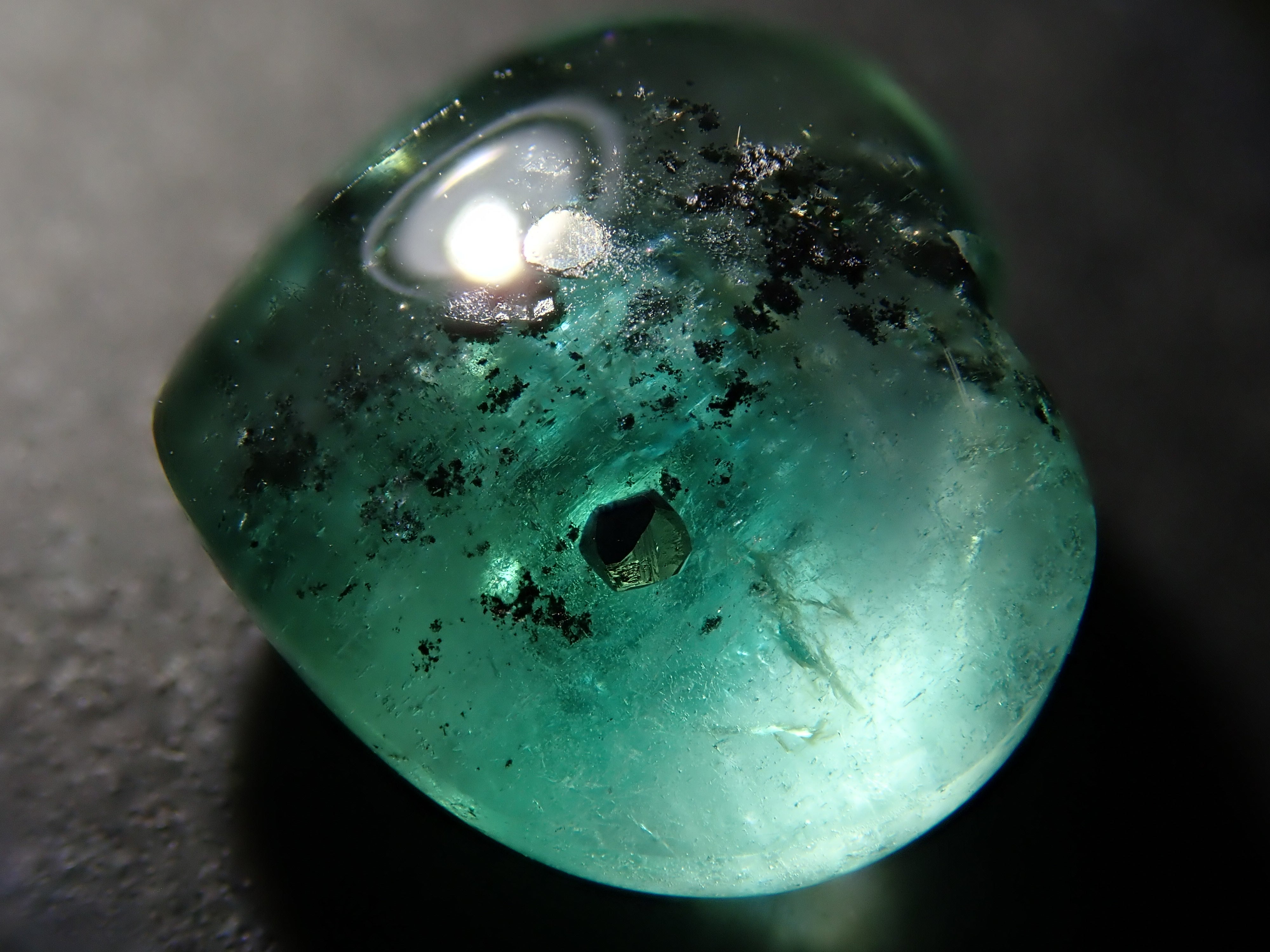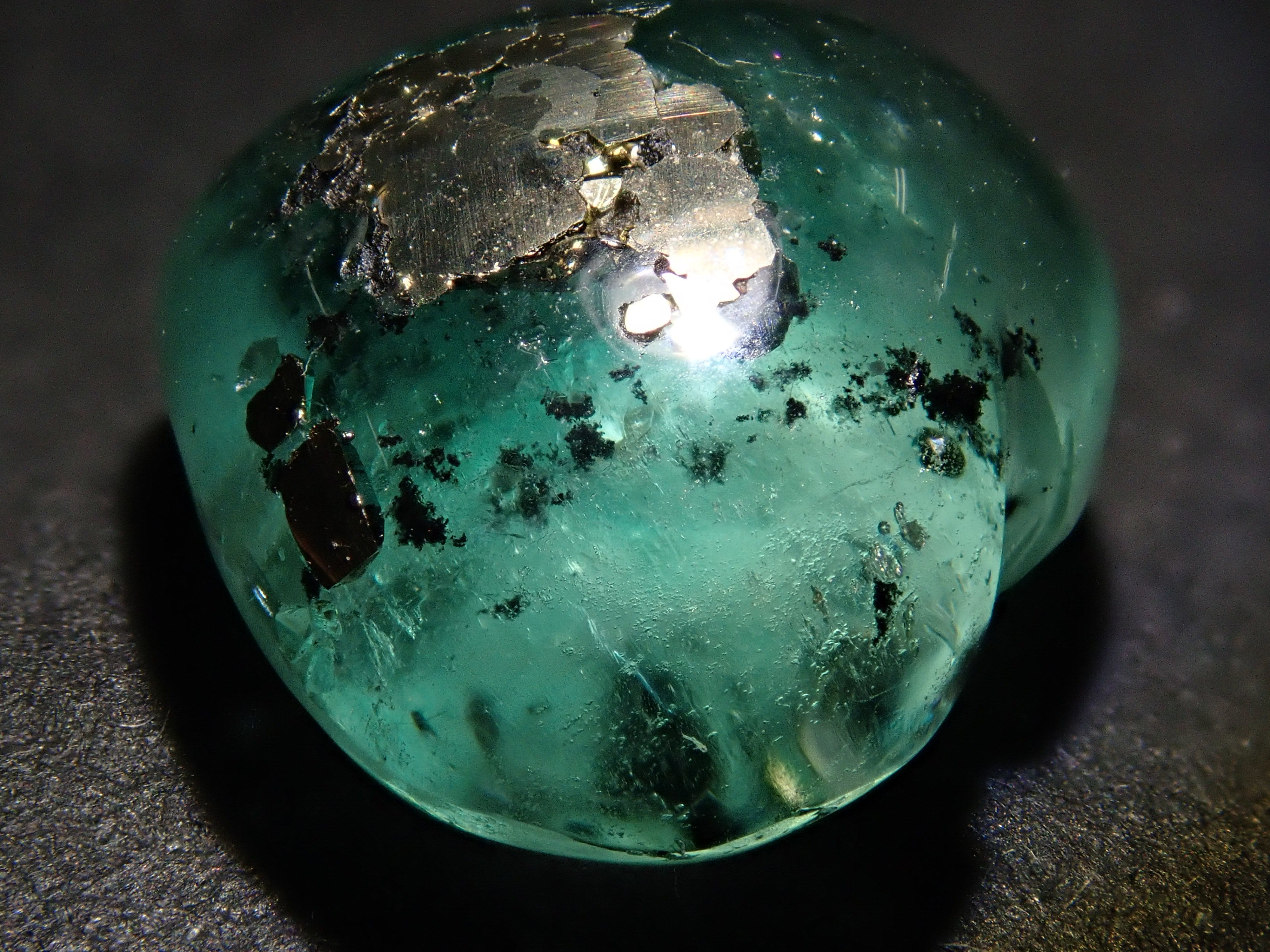 據說祖母綠美麗的綠色會根據其生長地點的不同而改變。這是產自哥倫比亞的祖母綠,據說有特別深的綠色。祖母綠通常是一種有很多划痕的寶石,因此通常會用油對其進行處理,以使划痕不那麼明顯。享受優雅的綠色。這是祖母綠中的黃鐵礦,祖母綠中含有非常稀有的黃鐵礦。這是心形切割。