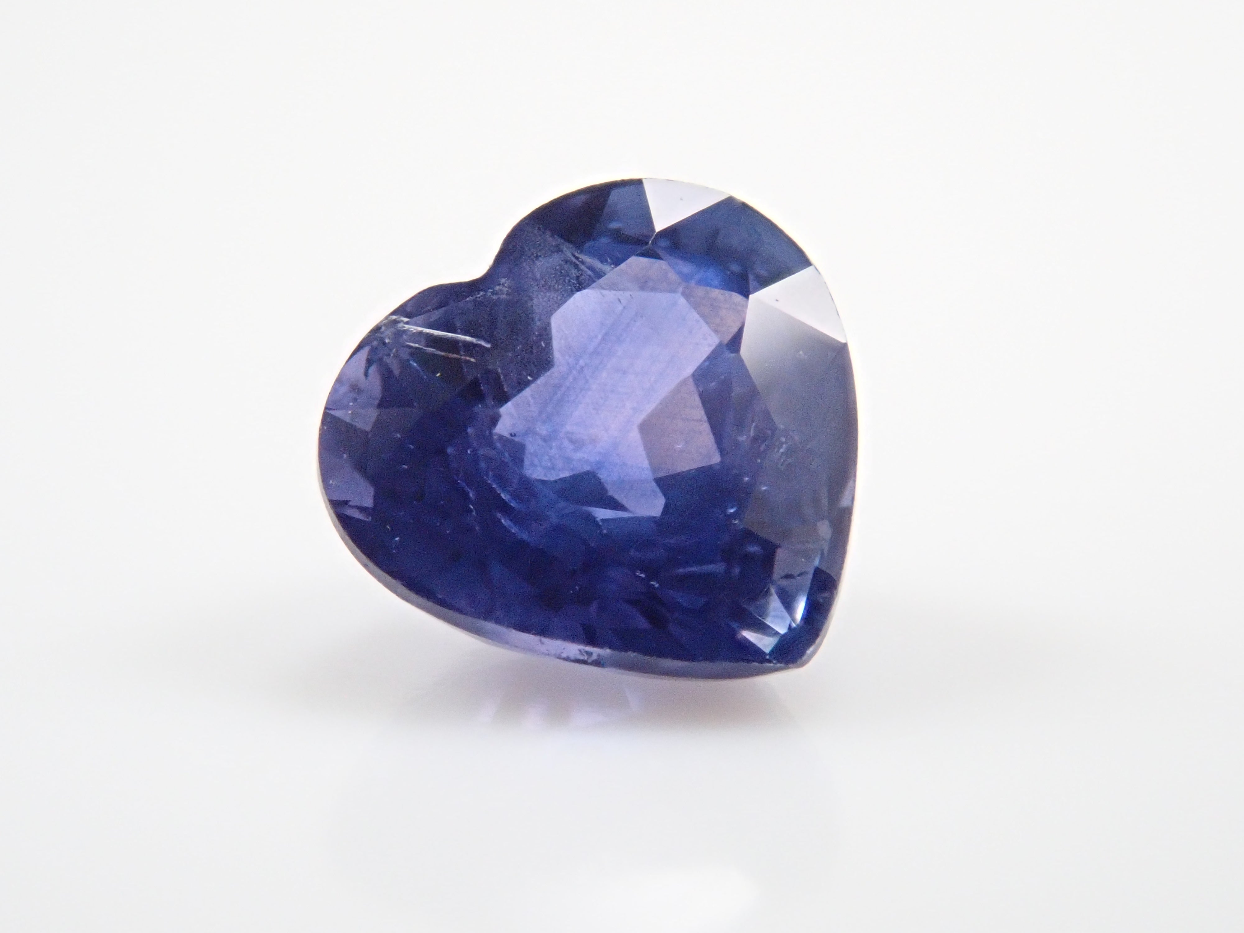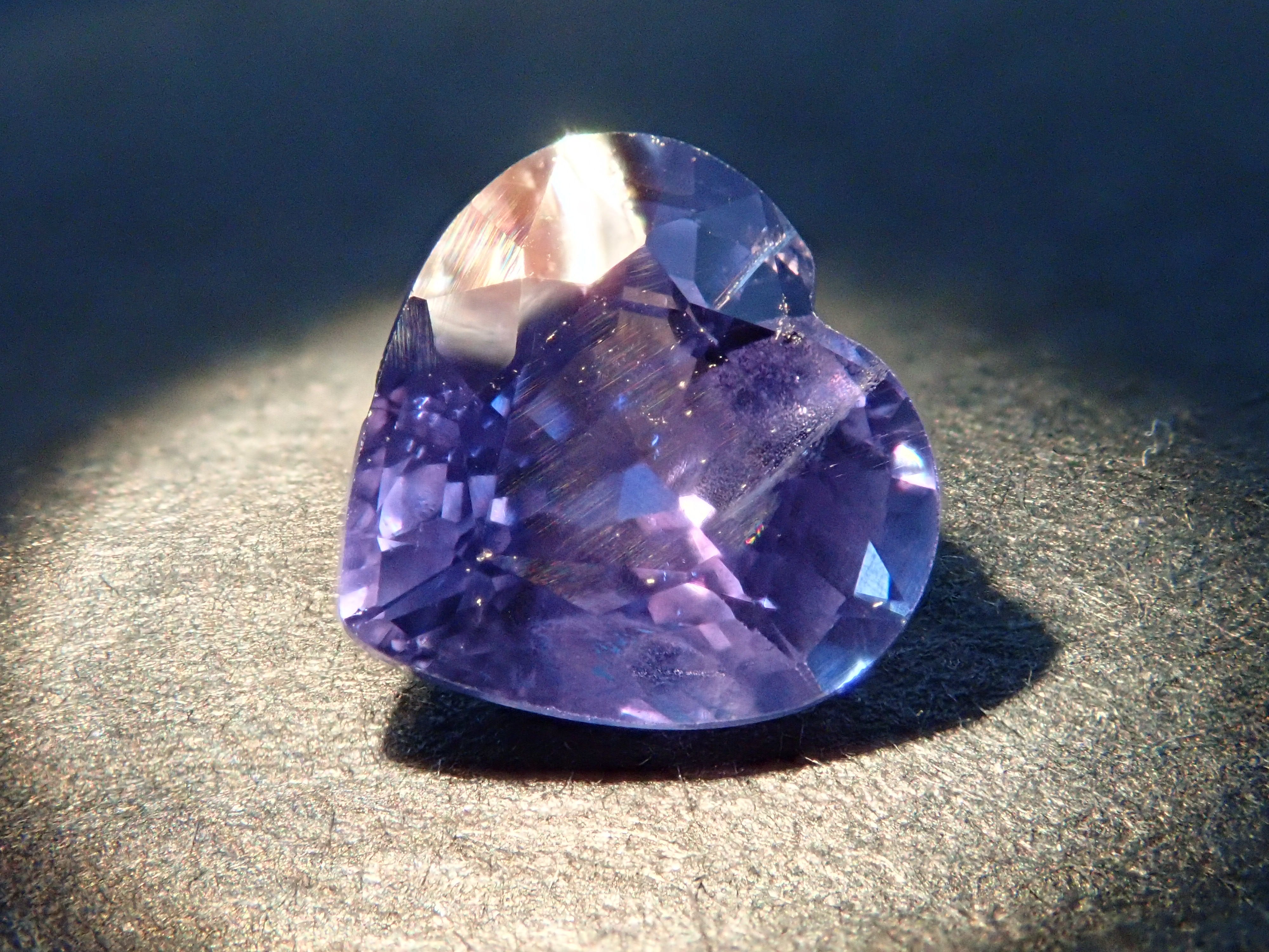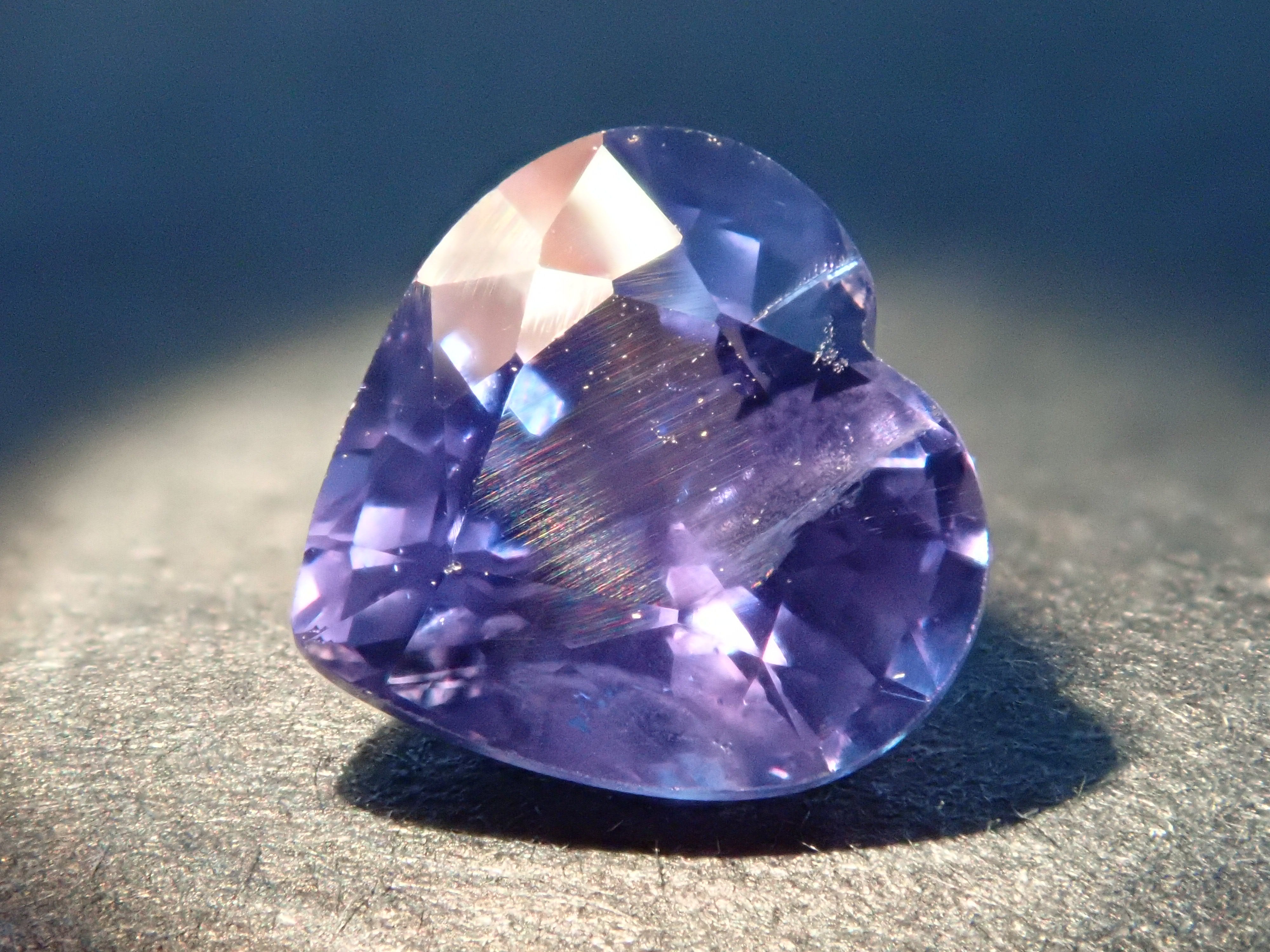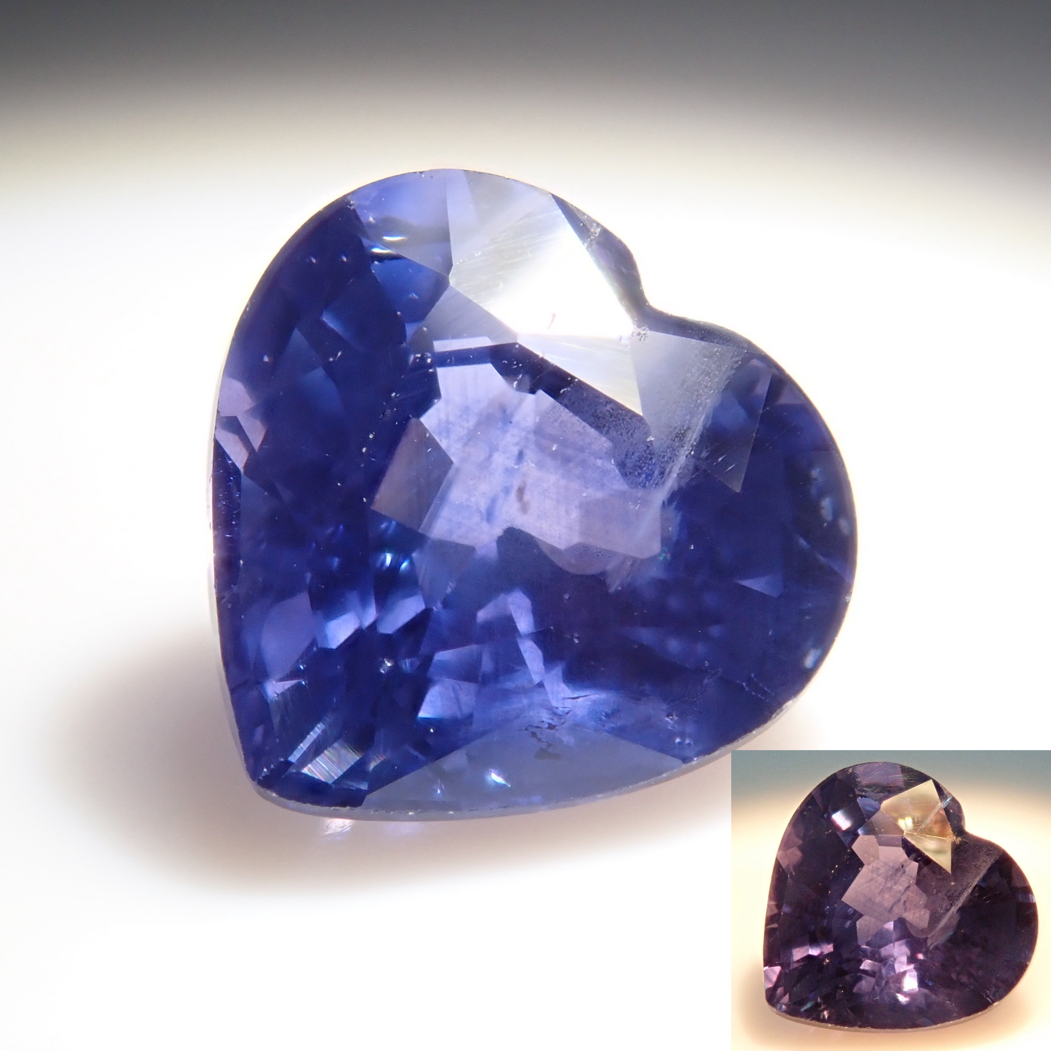 藍寶石是一種著名的寶石。礦物為剛玉,與紅寶石相同,但除紅色以外的所有剛玉稱為藍寶石。其中,這是一種罕見的會變色的藍寶石。藍寶石的硬度為 9,是僅次於鑽石的第二硬寶石,是一種高度堅韌、穩定且易於護理的寶石。請使用紅色變色筆燈欣賞變色效果。一顆心形切割變色藍寶石,尺寸接近 1 克拉。