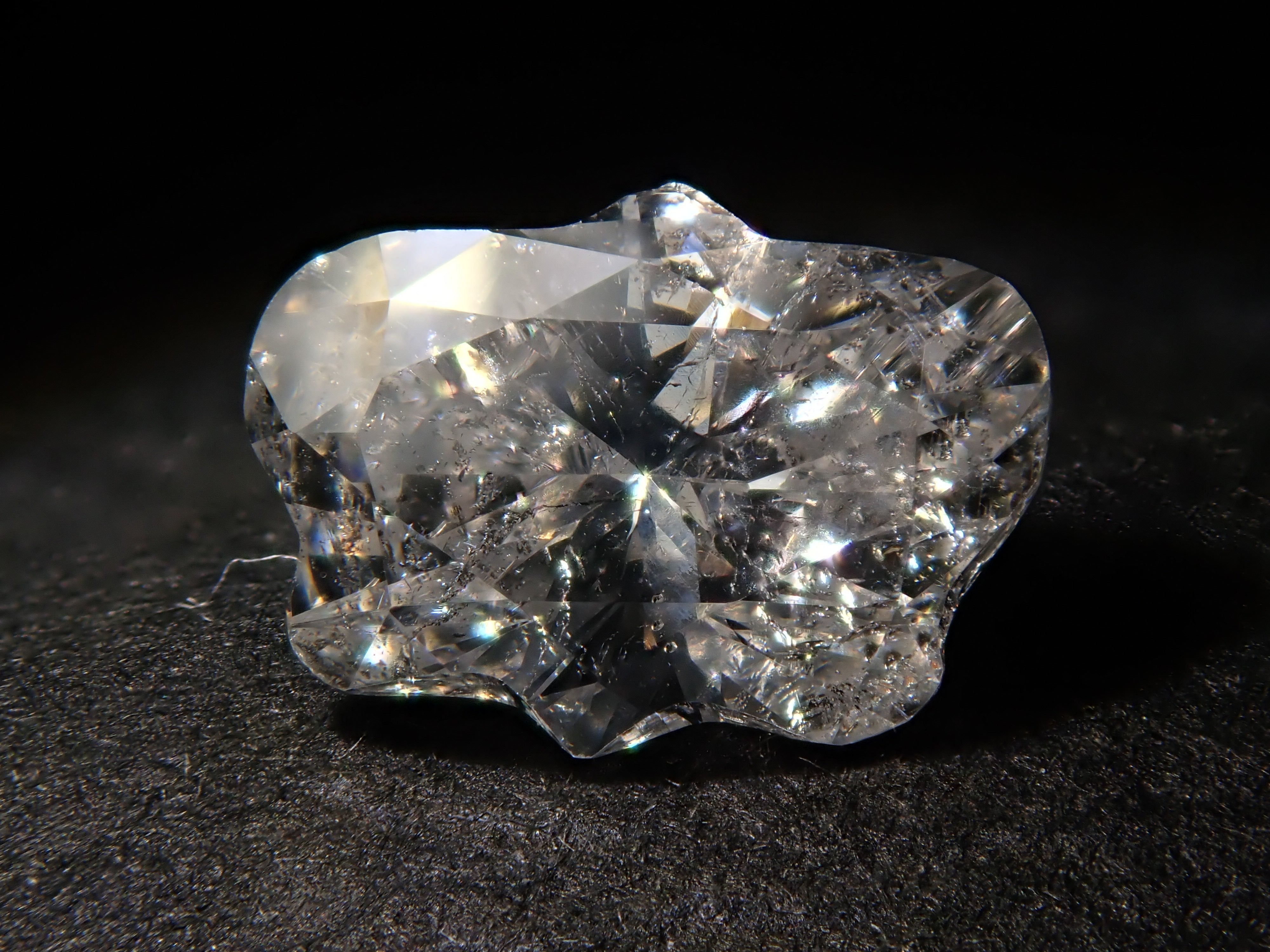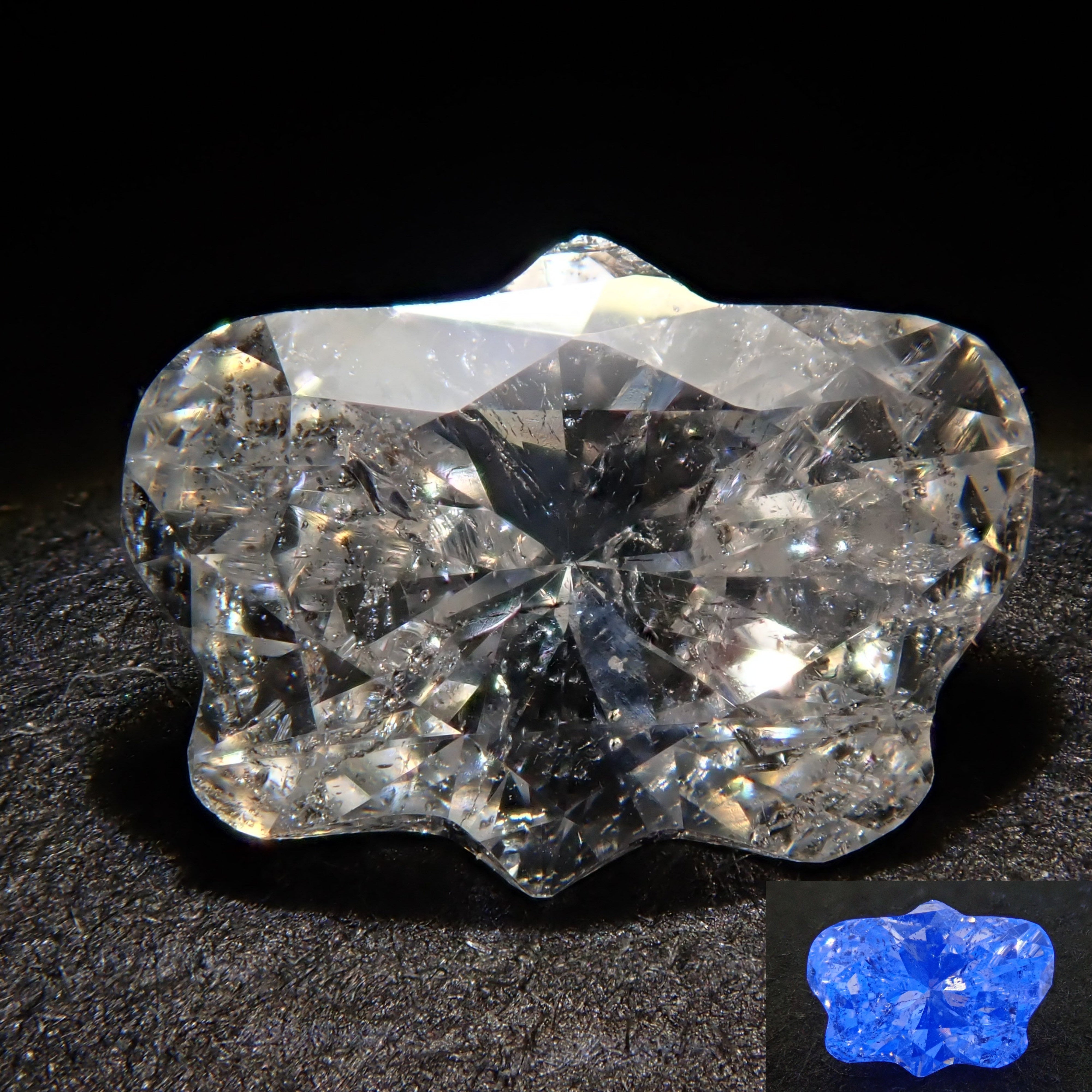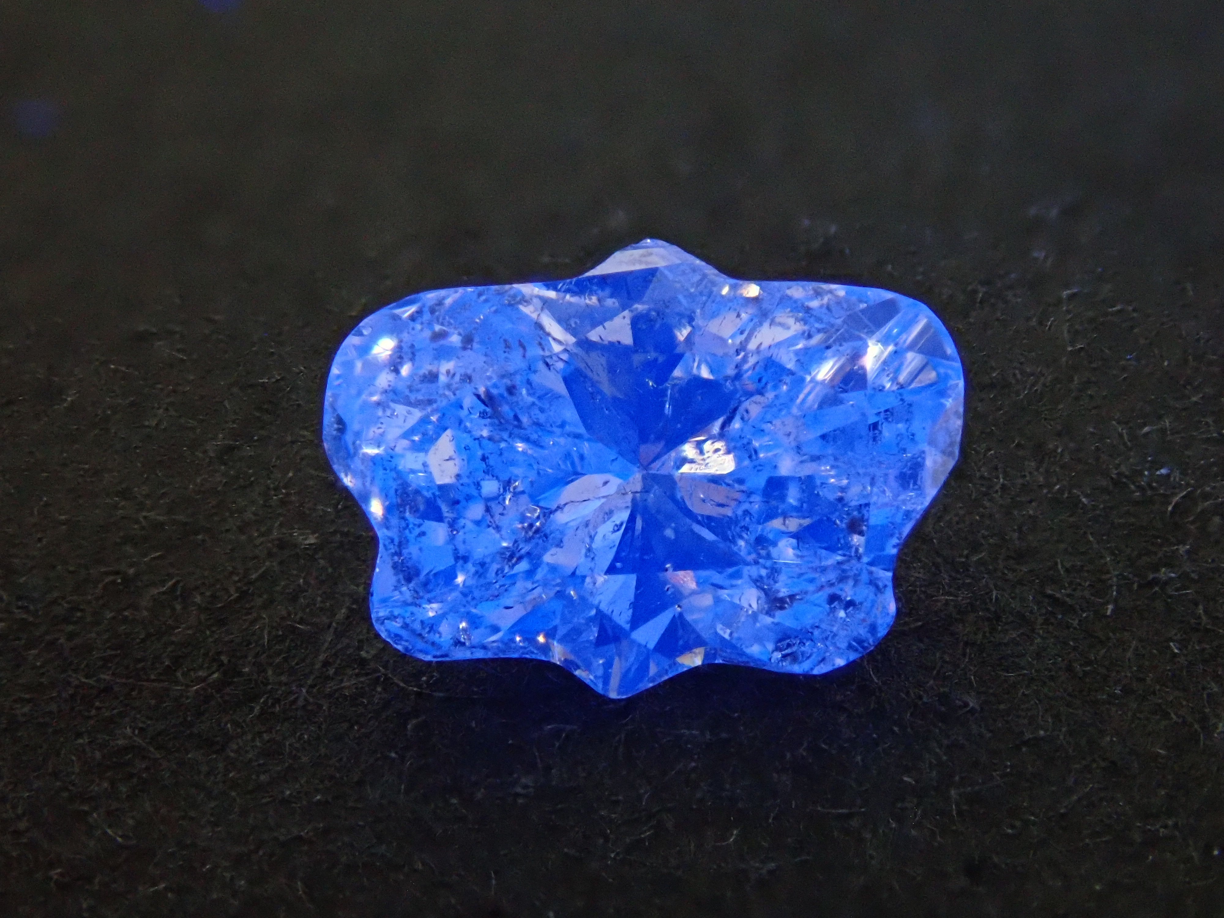 如果有螢光照片,它們是在暗室中在強黑光下拍攝的。如果您想在家中觀看螢光,可以透過將房間調暗或用手掌遮住珠寶來欣賞美麗的螢光。它是相當於 I 級的無色鑽石。當暴露在黑光下時,蝴蝶切割會發出螢光。