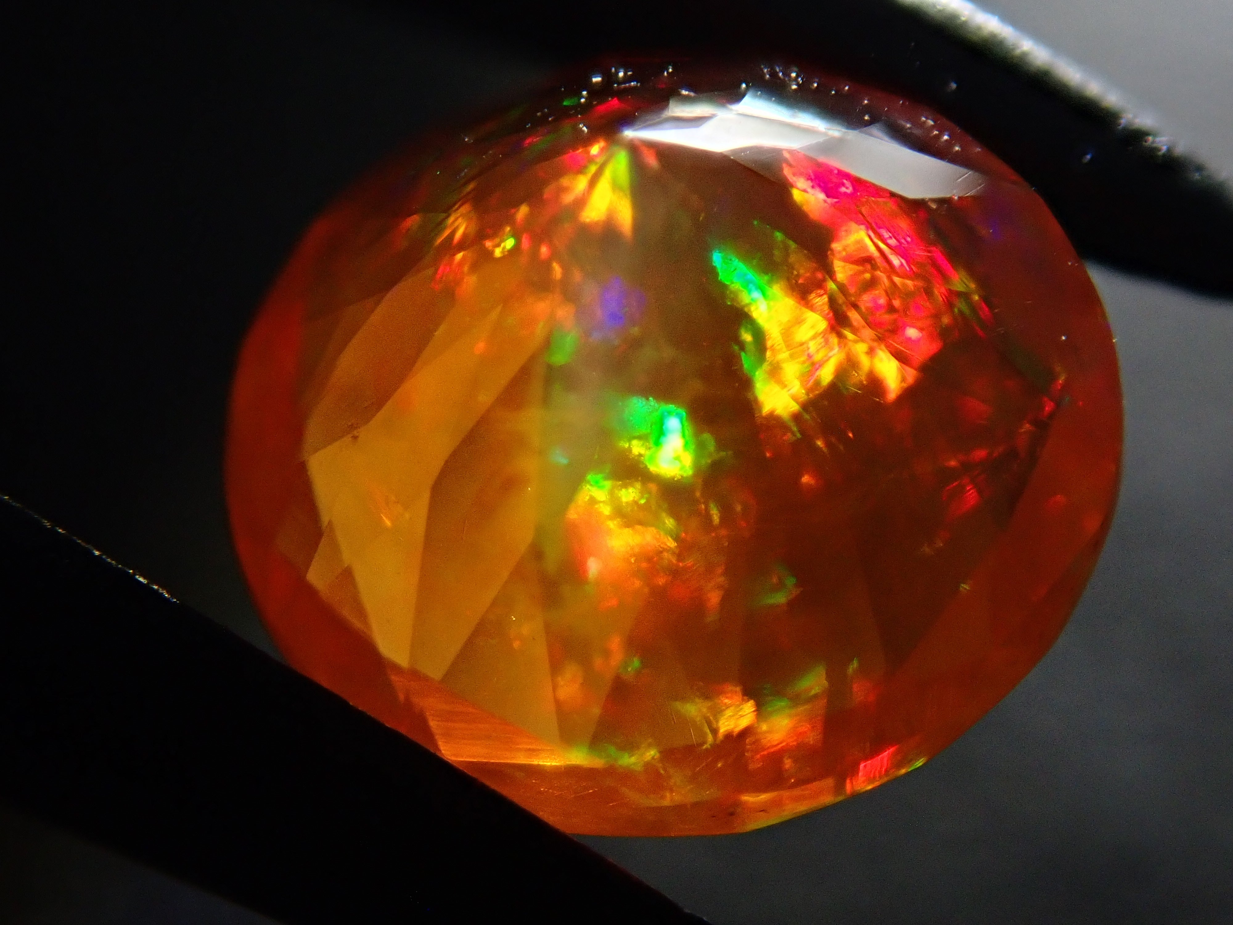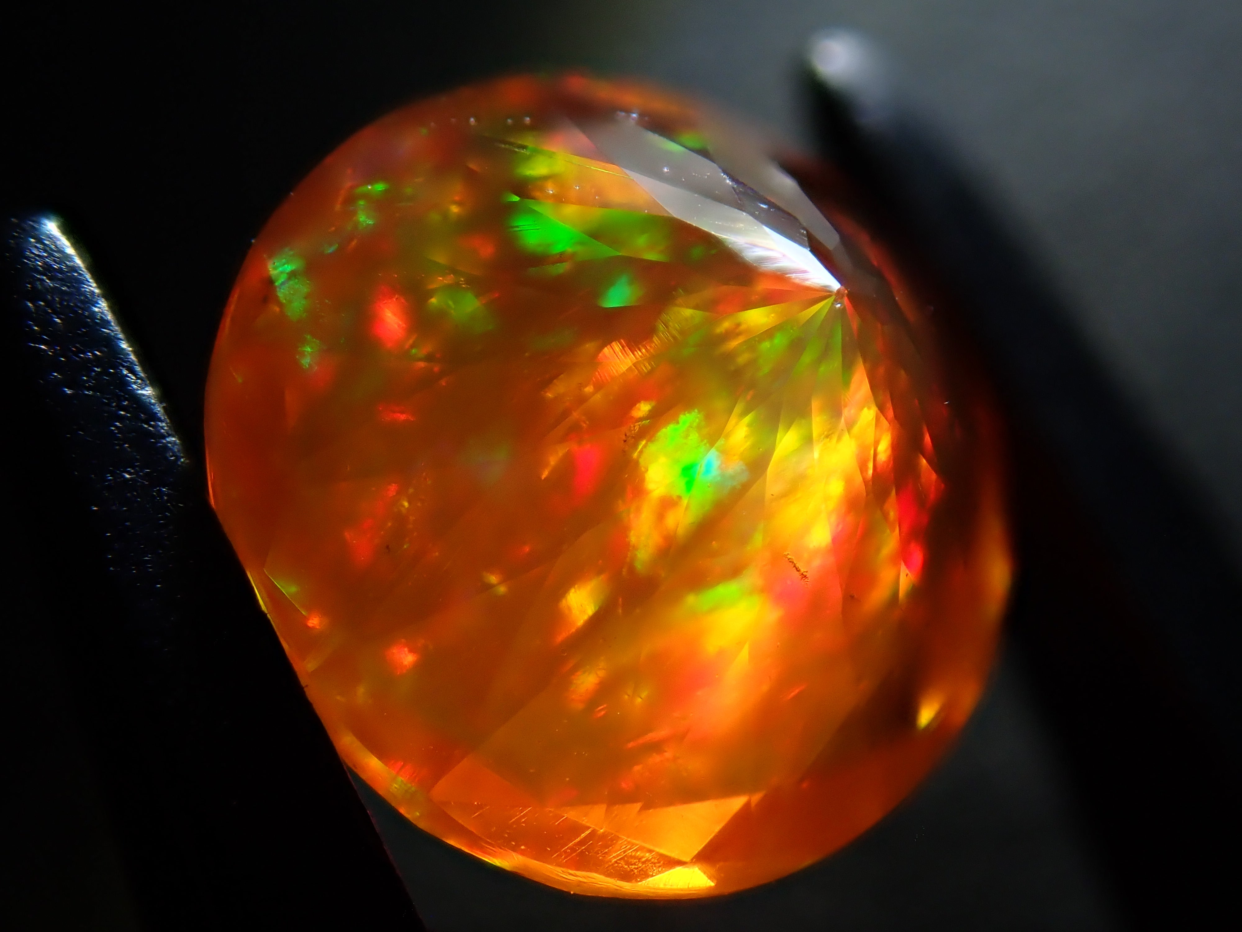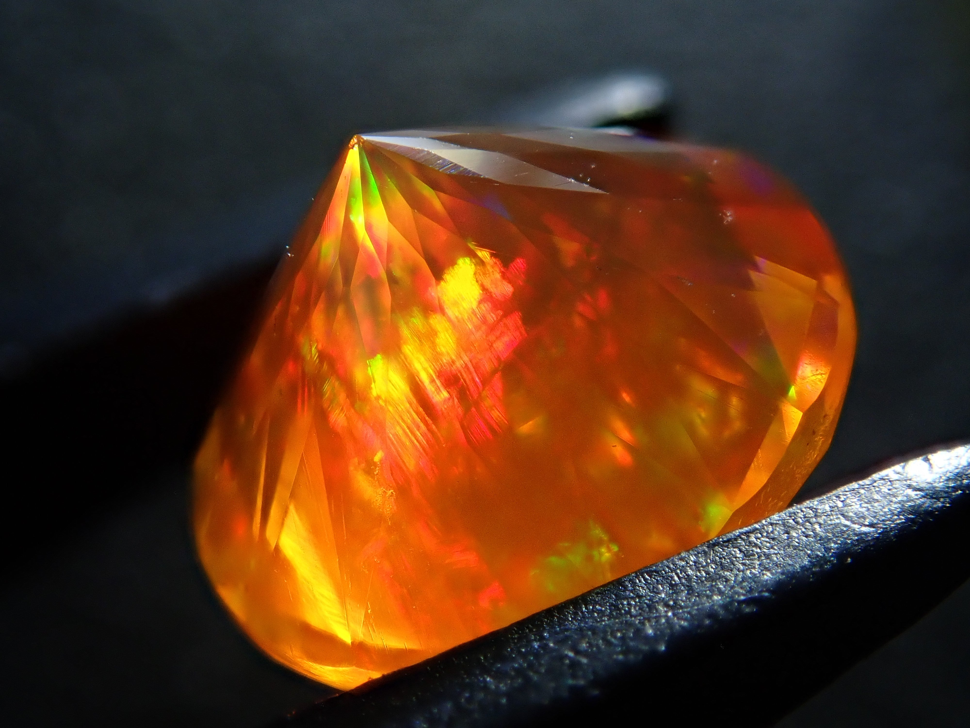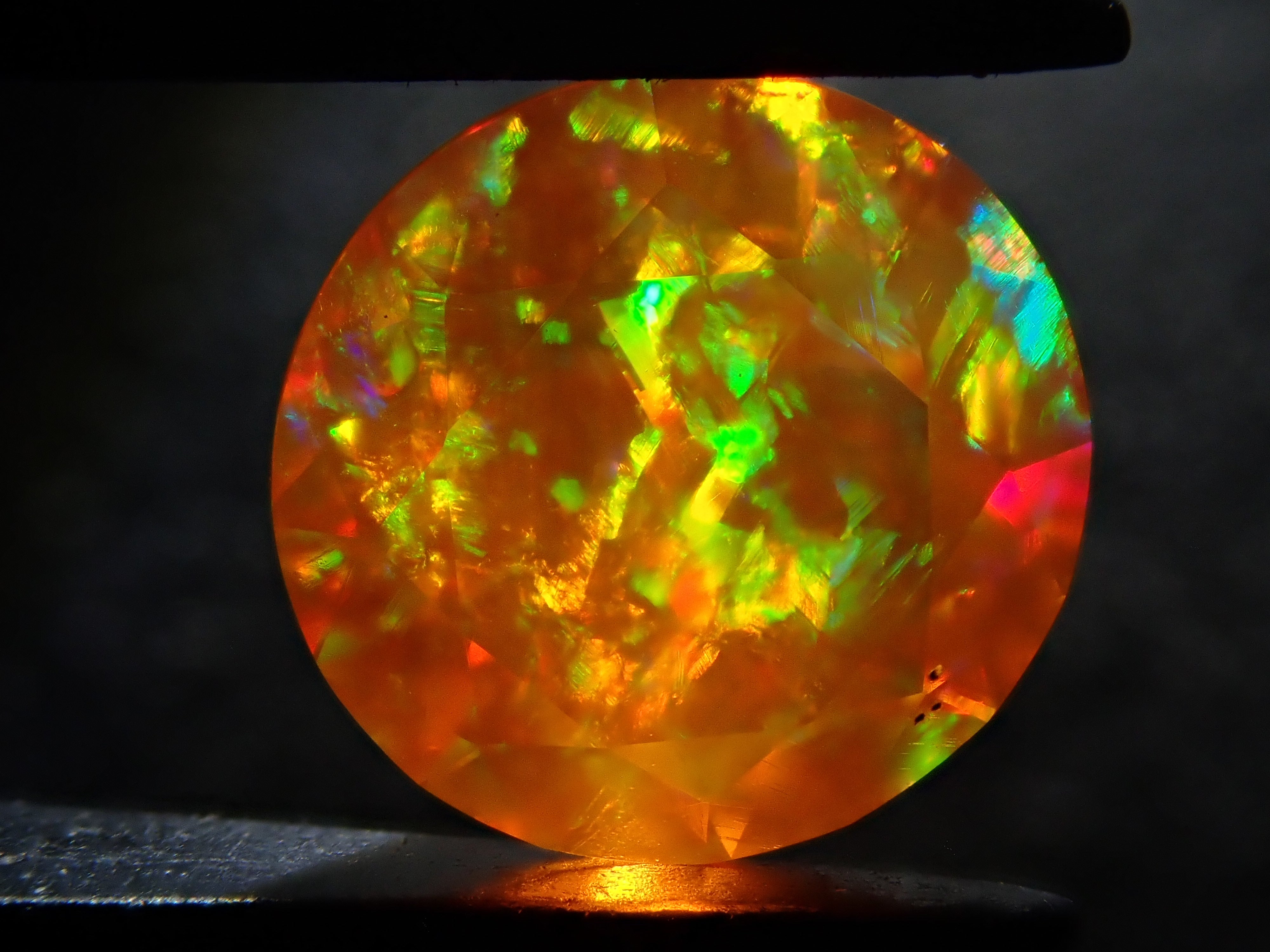 蛋白石自古羅馬時代以來就很受歡迎。火蛋白石是指底色從紅色到橘色,給人火的印象的蛋白石。照片是使用筆燈拍攝的。