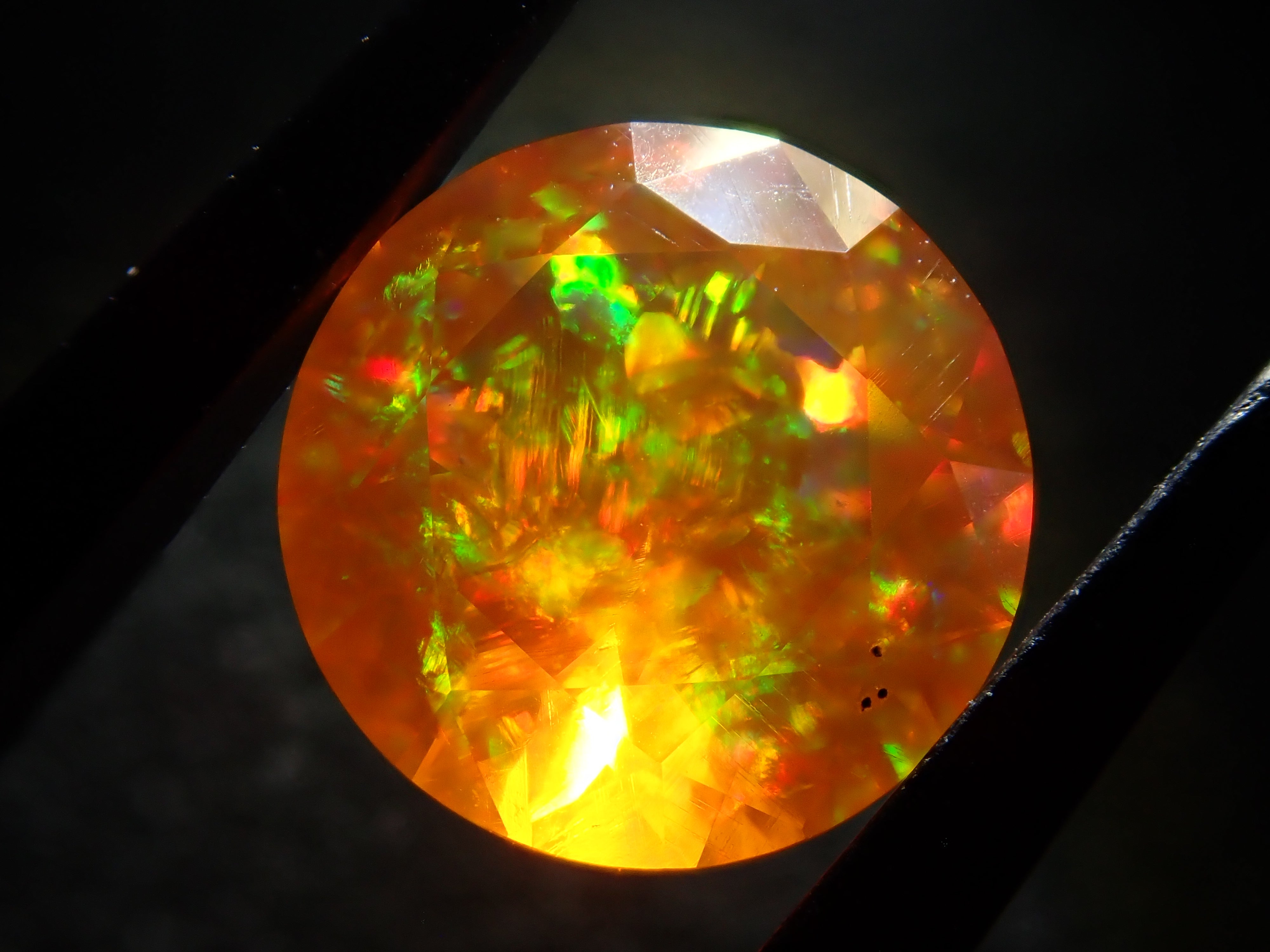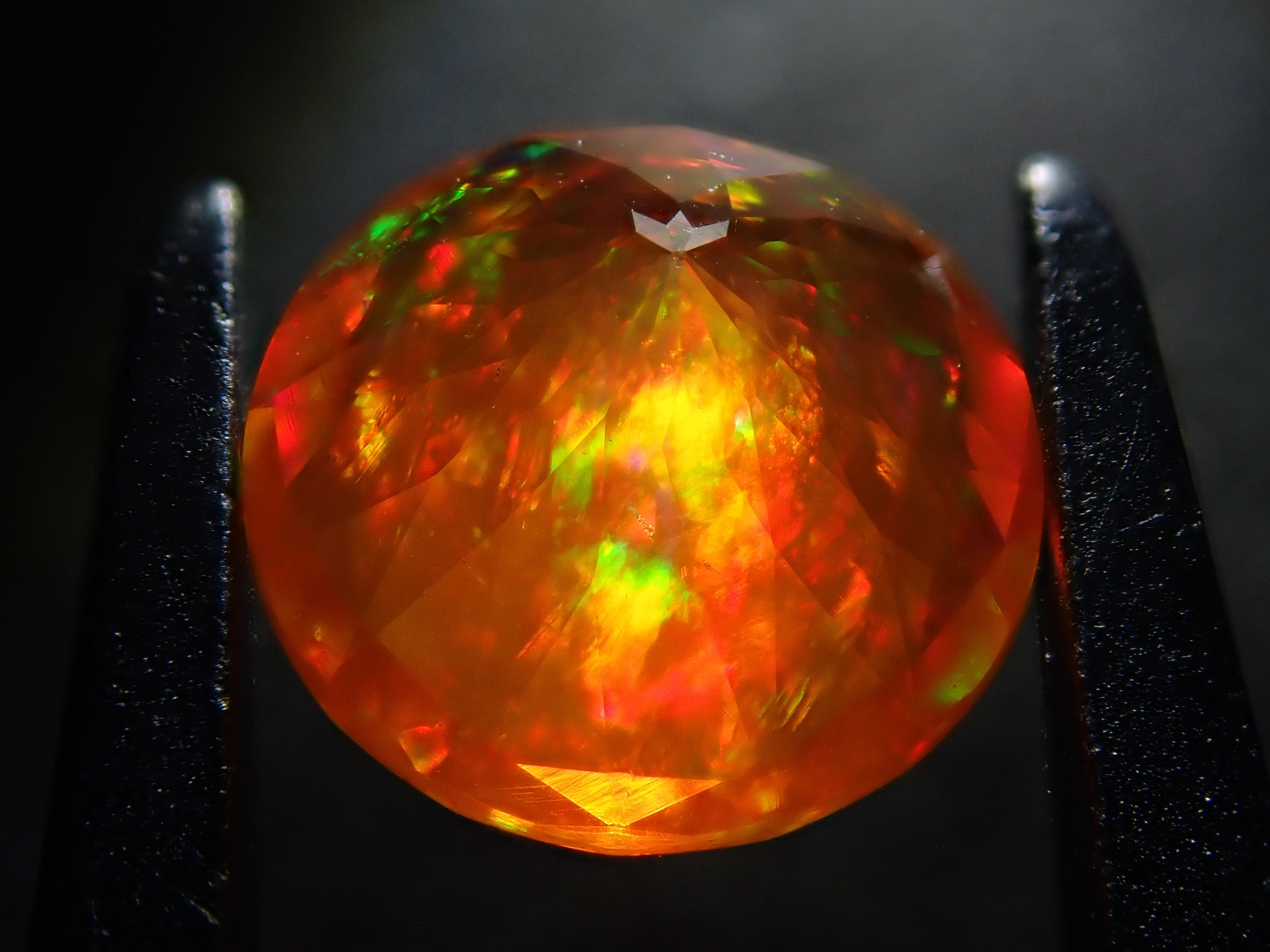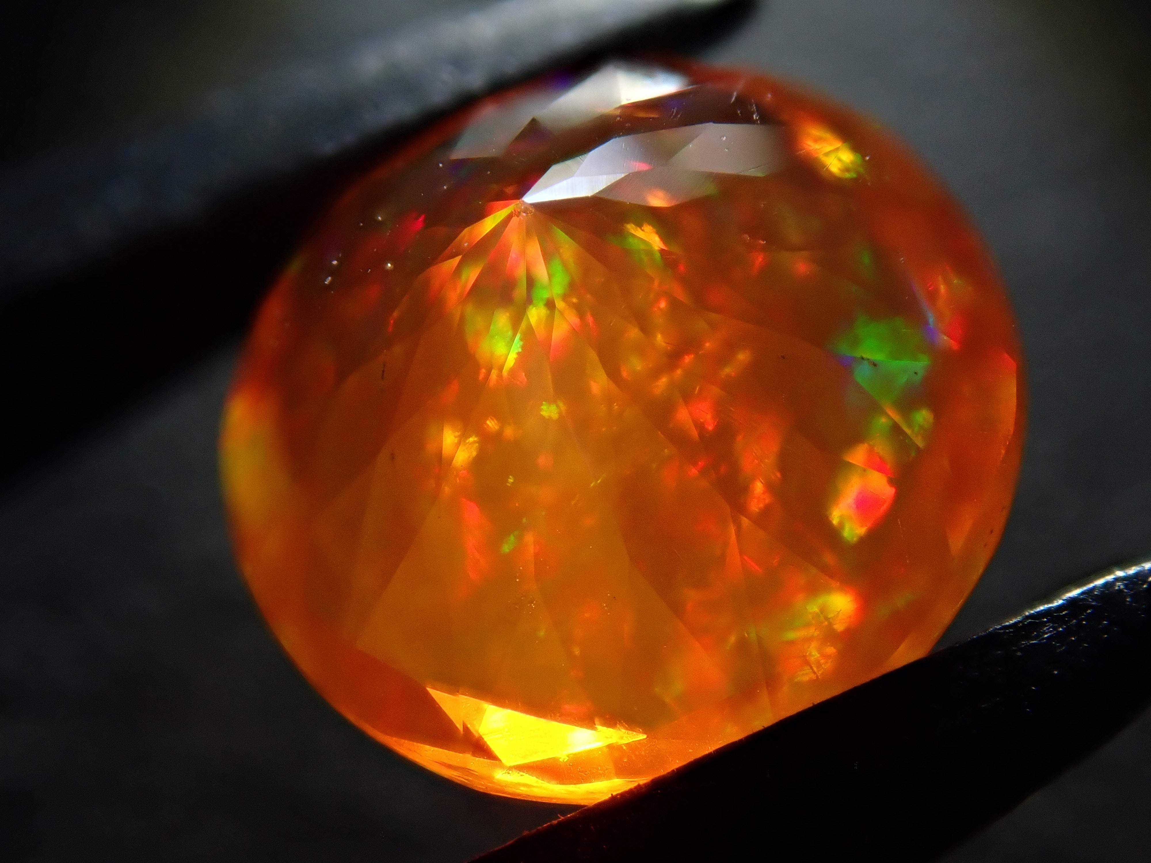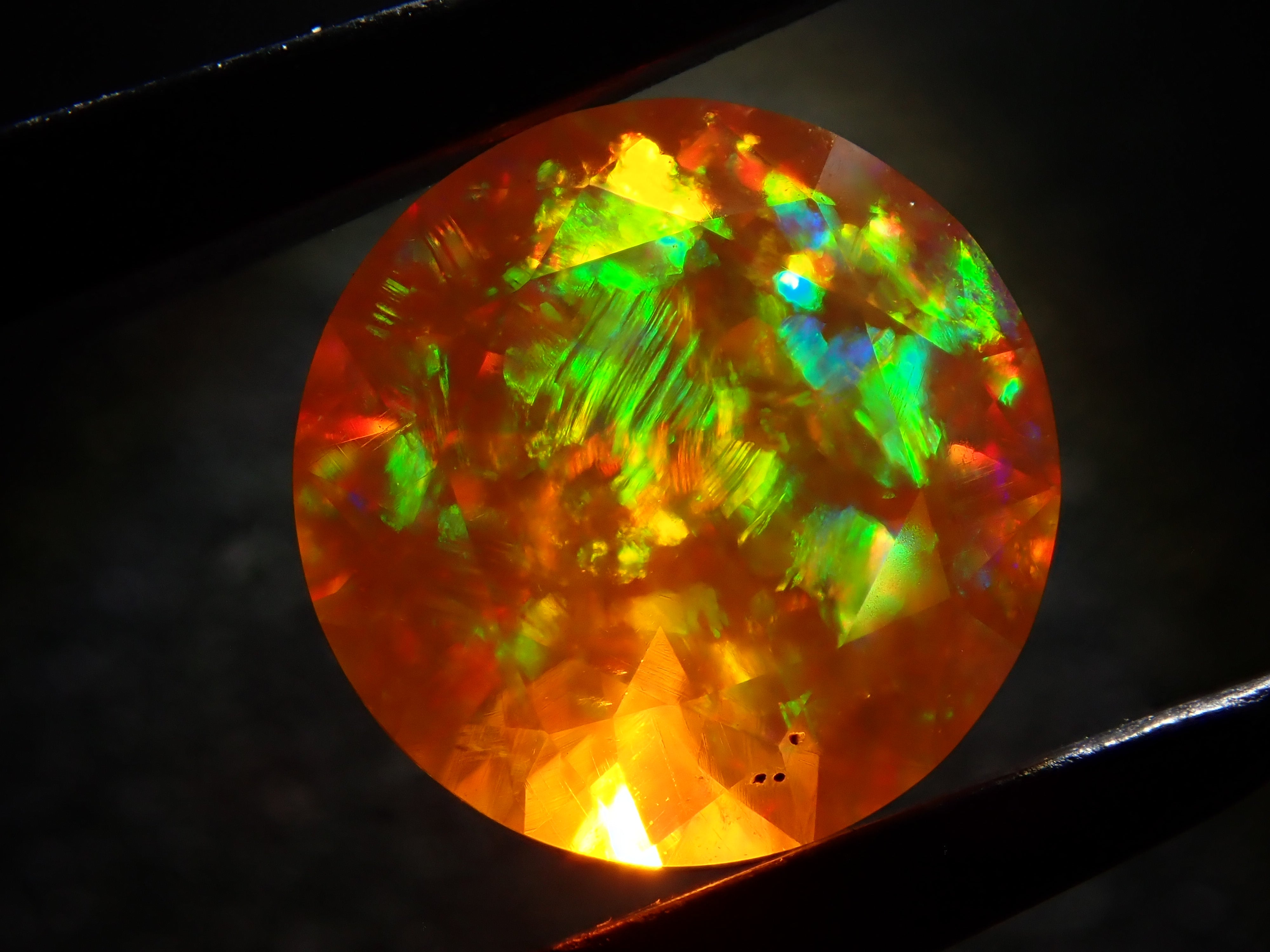 蛋白石自古羅馬時代以來就很受歡迎。火蛋白石是指底色從紅色到橘色,給人火的印象的蛋白石。照片是使用筆燈拍攝的。