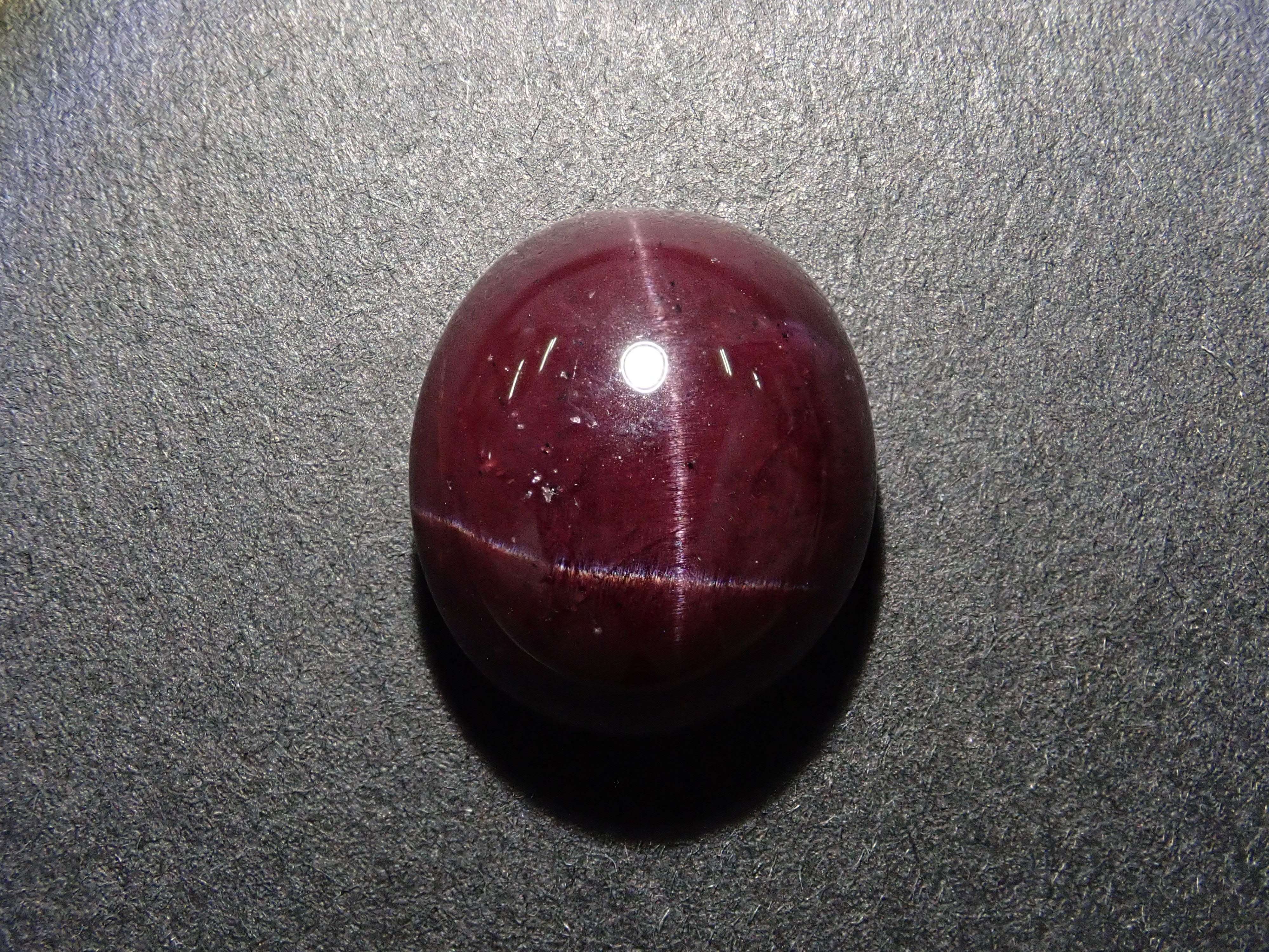 有幾種寶石可以看到星星,例如星光石英、星光藍寶石和星光紅寶石,但這一種是星光石榴石。中間會出現一顆有四條紋的星星。我還用筆燈拍照。石頭的背面基本上是未拋光的。刮痕/缺口的評估不包括背面。