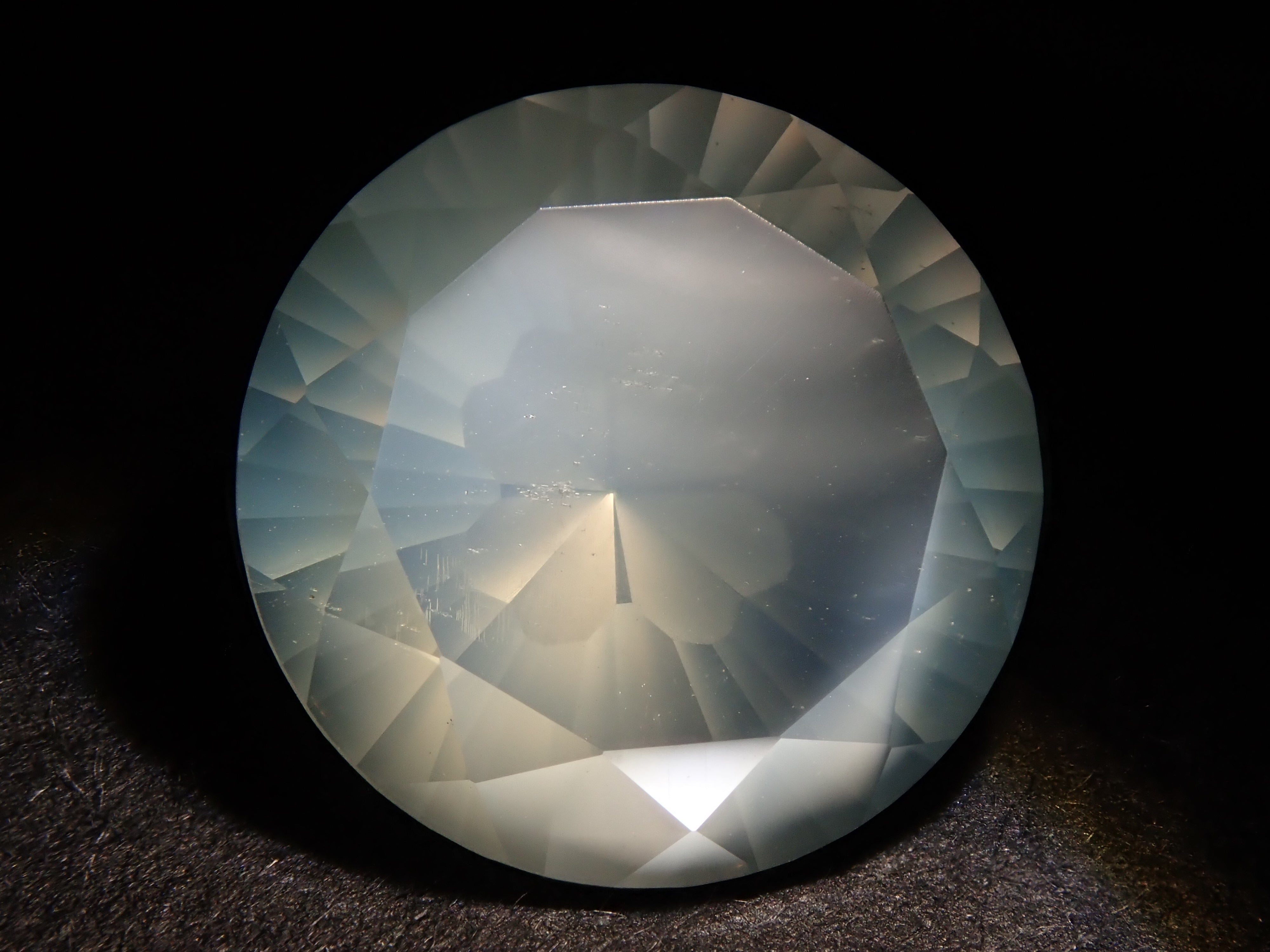 一顆看起來像聚光燈一樣的綠色月光石在中間閃閃發光。這種類似月光的明亮光學效果是月光石的標誌。月光石以其白色和藍色而聞名,因此這種綠色可能很罕見。照片是使用筆燈拍攝的。
