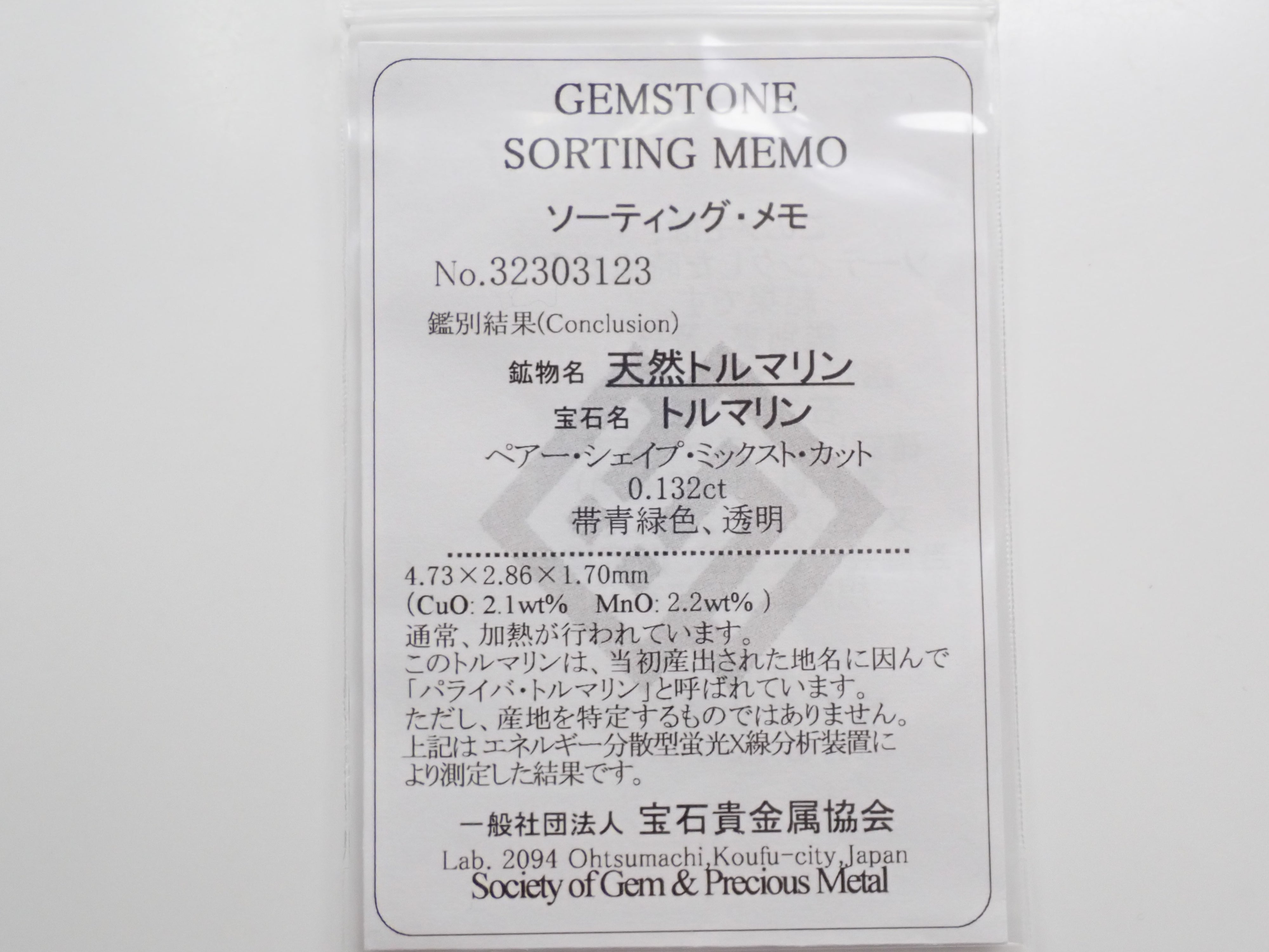 帕拉伊巴碧璽有著不同於大海的藍色或天空的藍色的精緻色彩。它在日本的定義是“含有銅的藍色到綠色碧璽(無論產地)。”它是一種非常受歡迎的寶石。 CuO:2.1%.MnO:2.2%。包括來自珠寶和貴金屬協會的分類資訊。