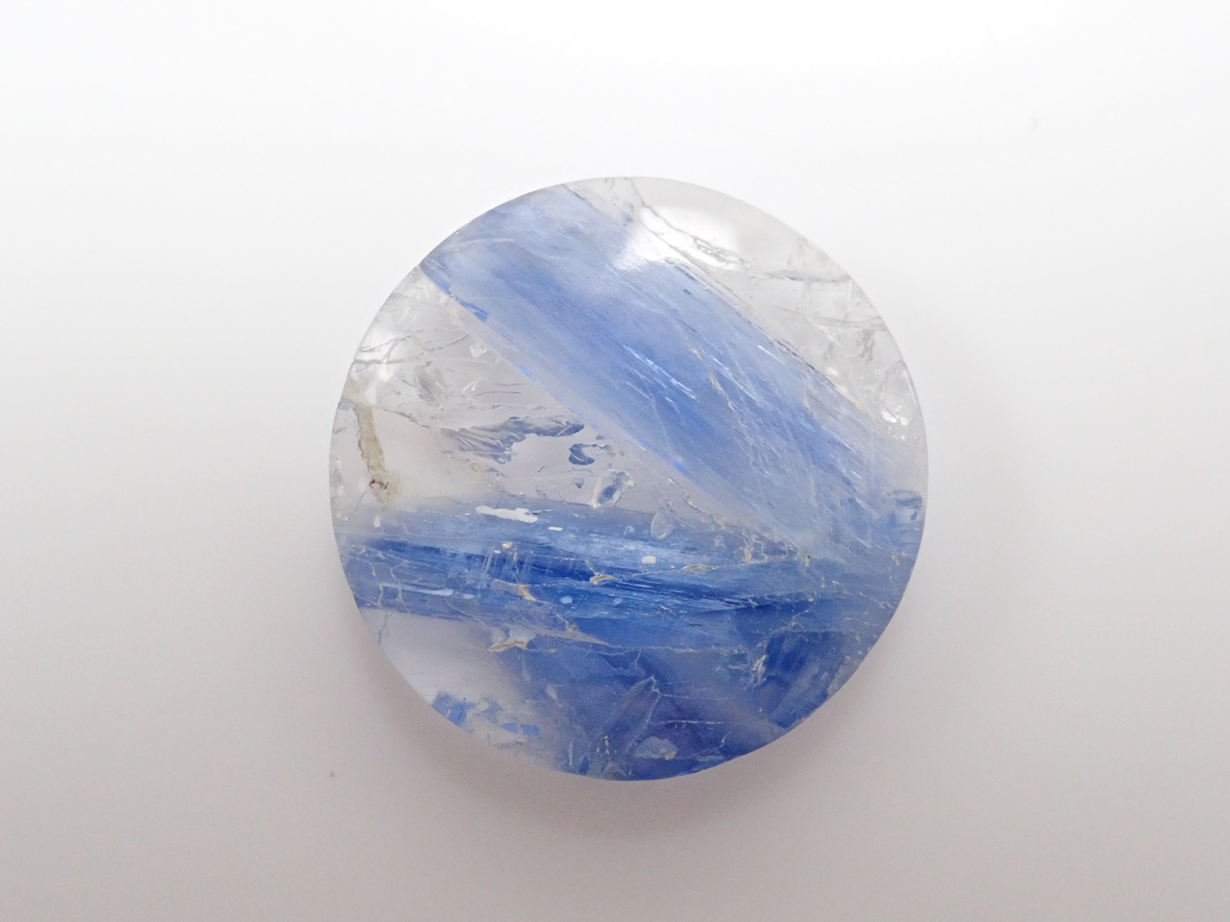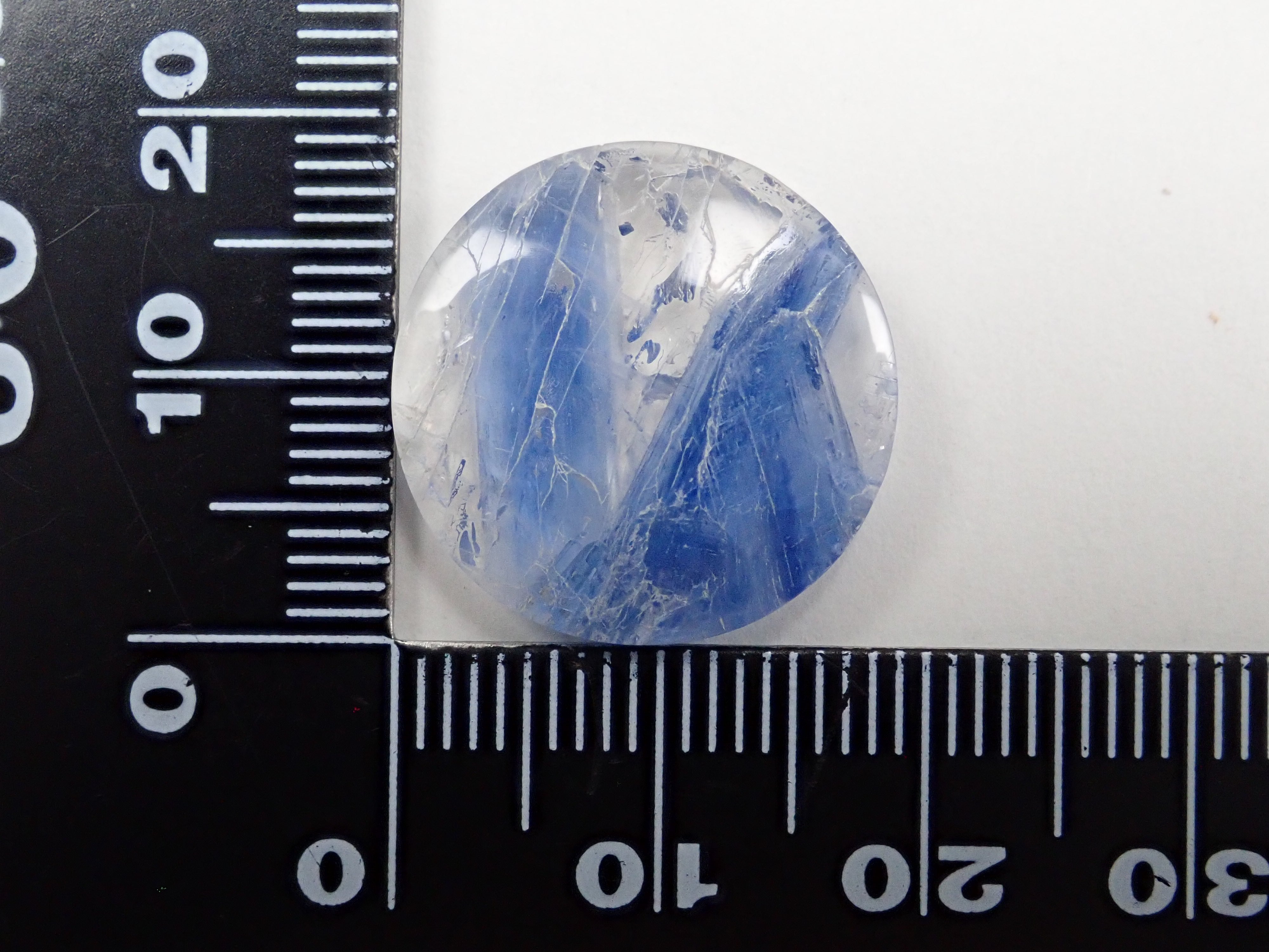 石英在日文中稱為水晶。這是一塊石英,裡面鑲嵌著耀眼的深藍色藍晶石。藍晶石與透明石英共存的種類較為罕見,是流通量很少的寶石。 18.9毫米。