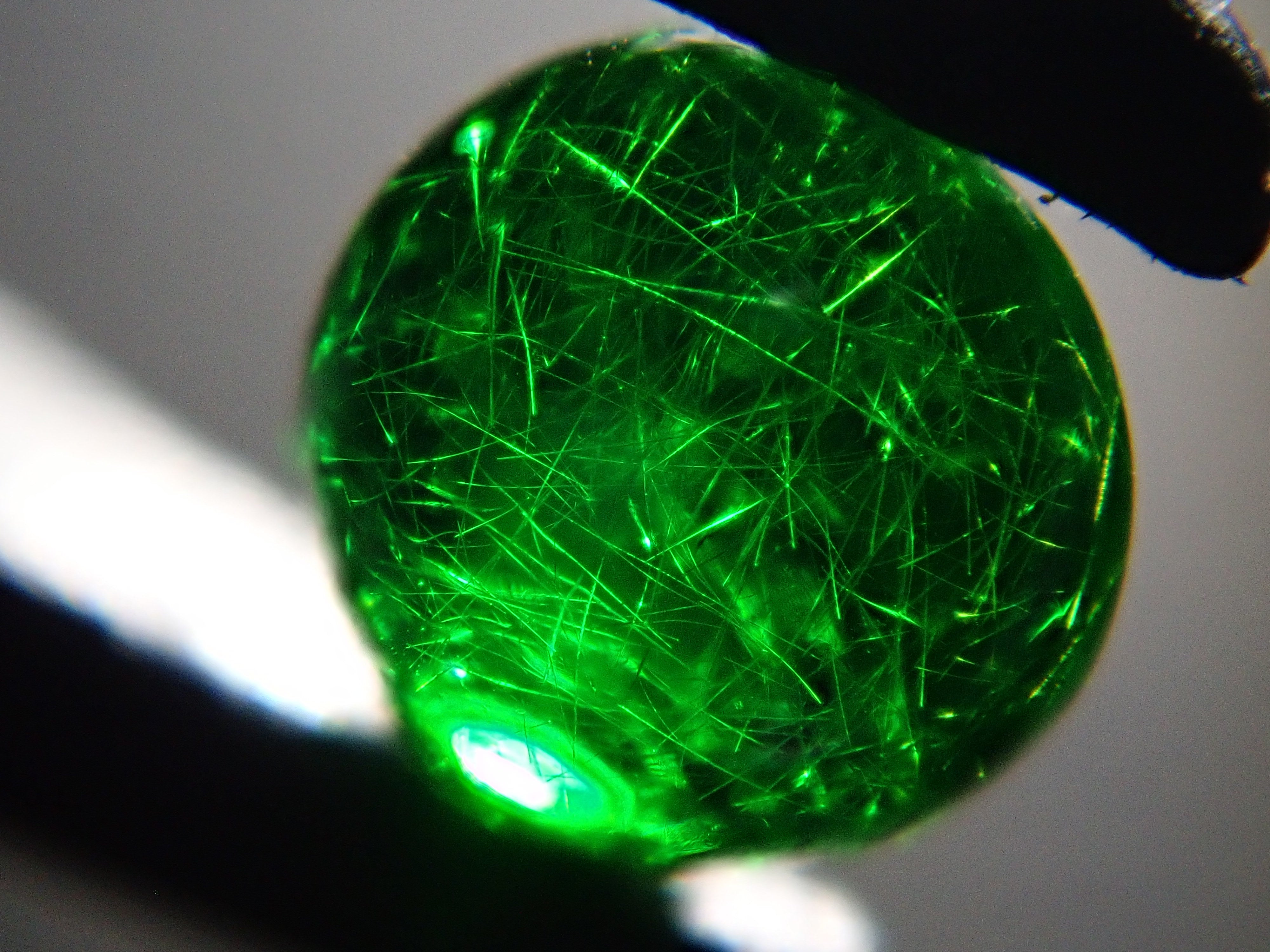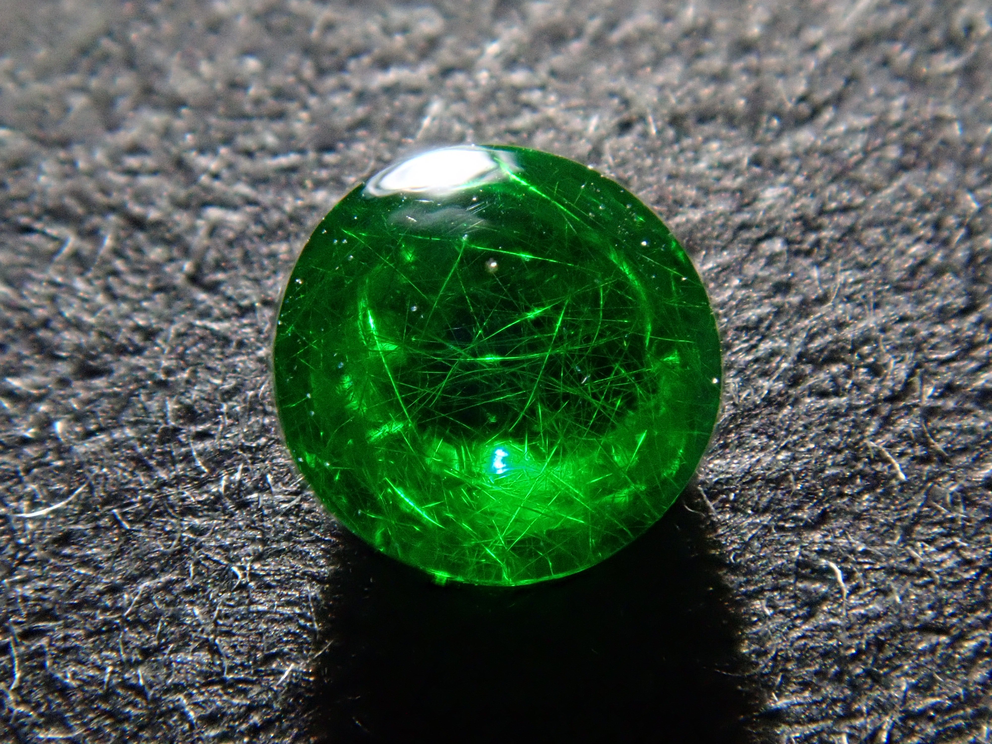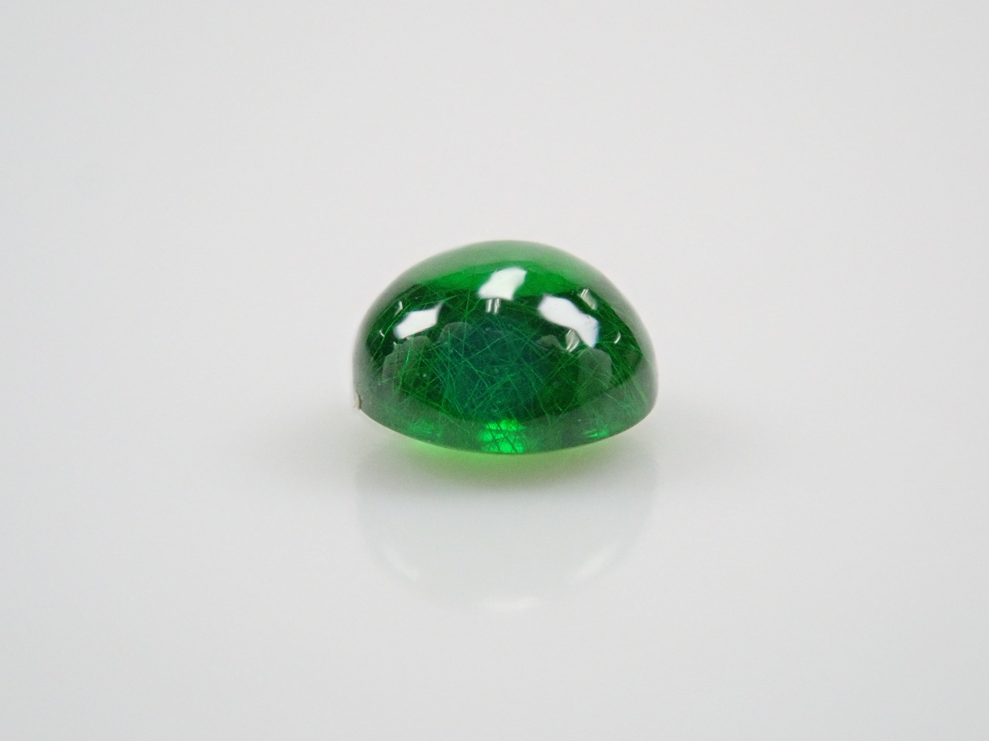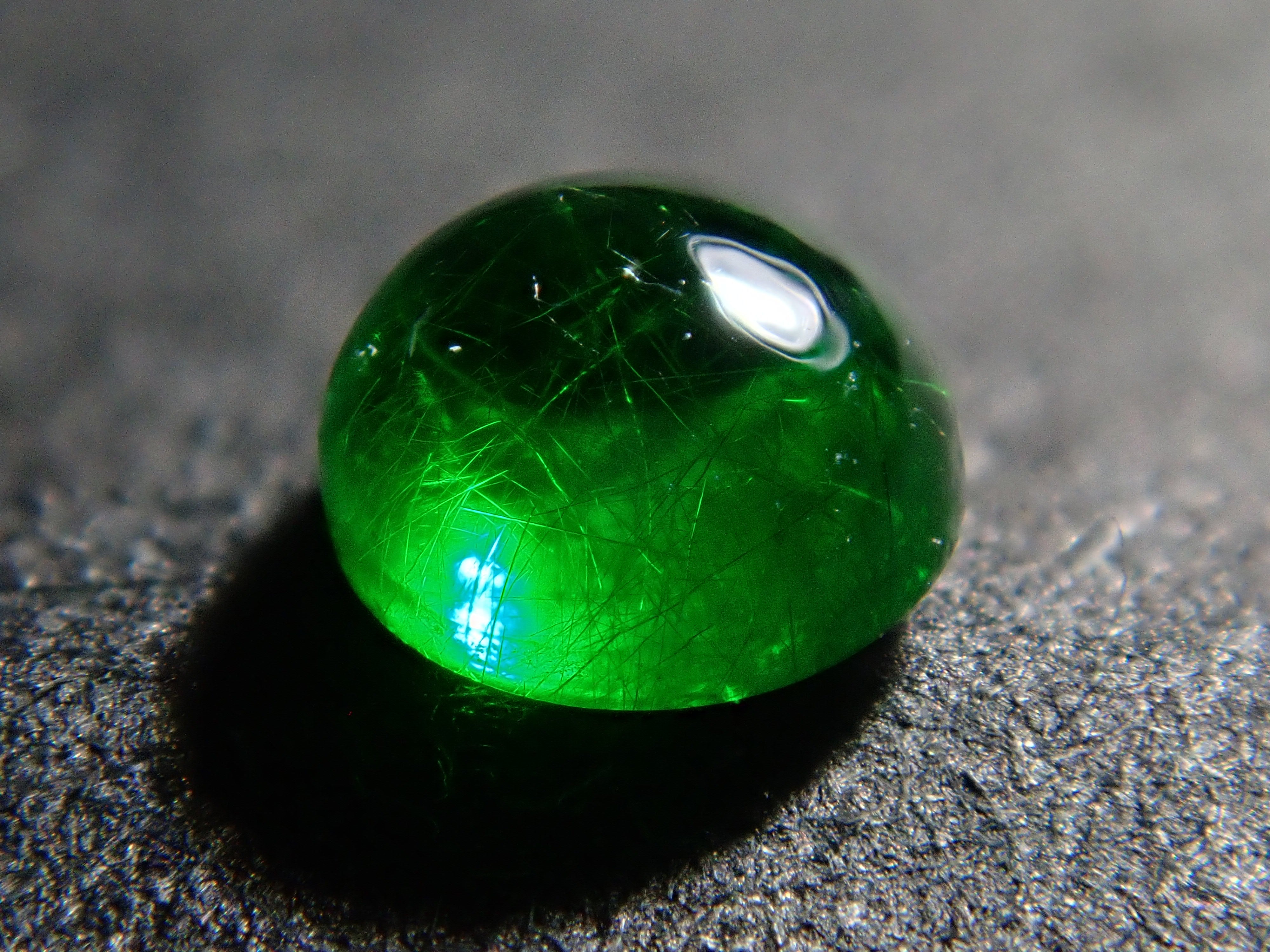 石榴石具有強烈的光色散和強烈的閃光。其中,這顆綠色的「濃綠榴石」是一種特別美麗且稀有的石榴石。這種類型的內含物被稱為“馬尾”,看起來像馬尾巴,甚至有貓眼效果。筆燈用於攝影。石頭的背面基本上是未拋光的。透過顯微鏡檢查證實了馬尾草的存在。