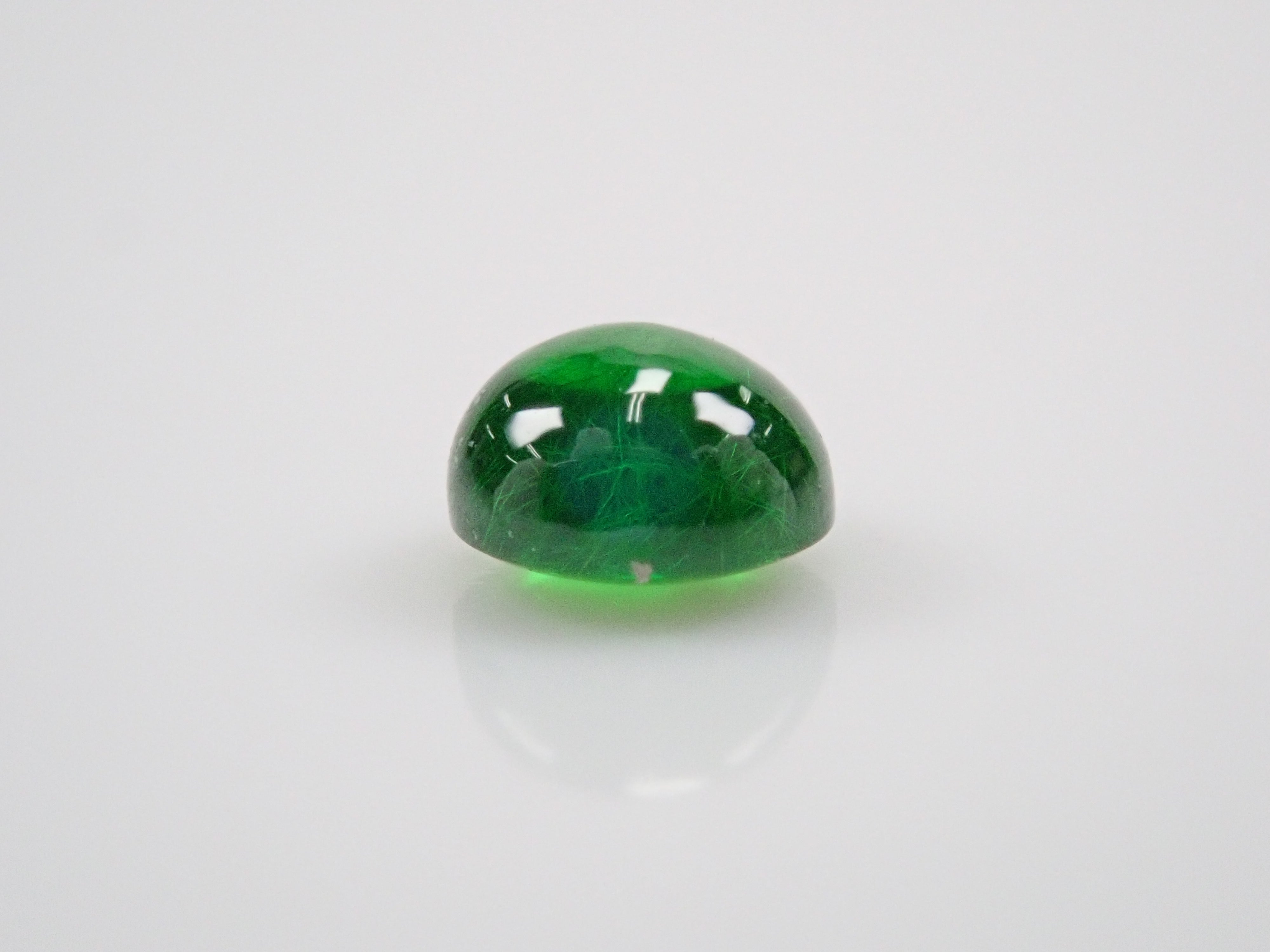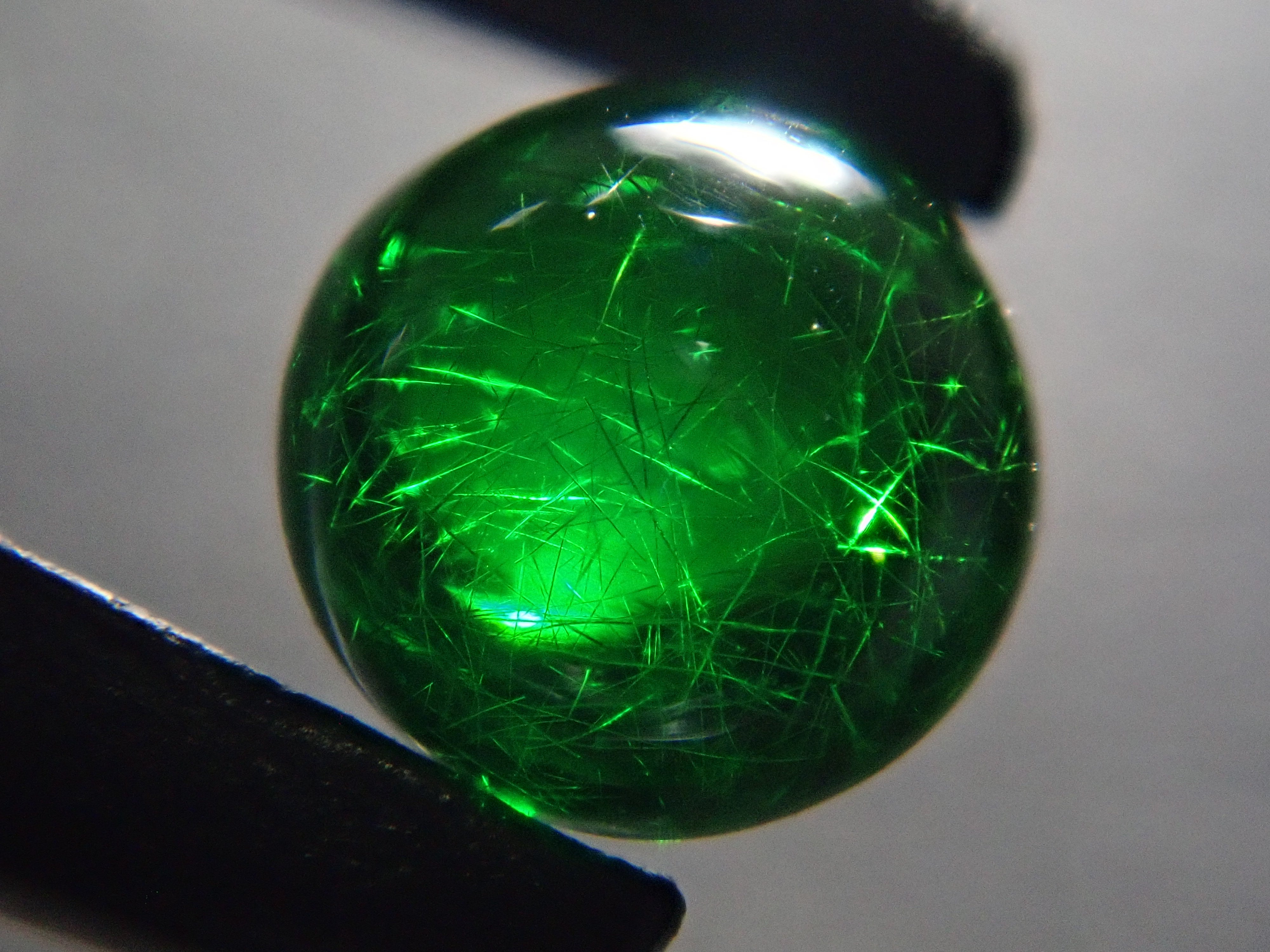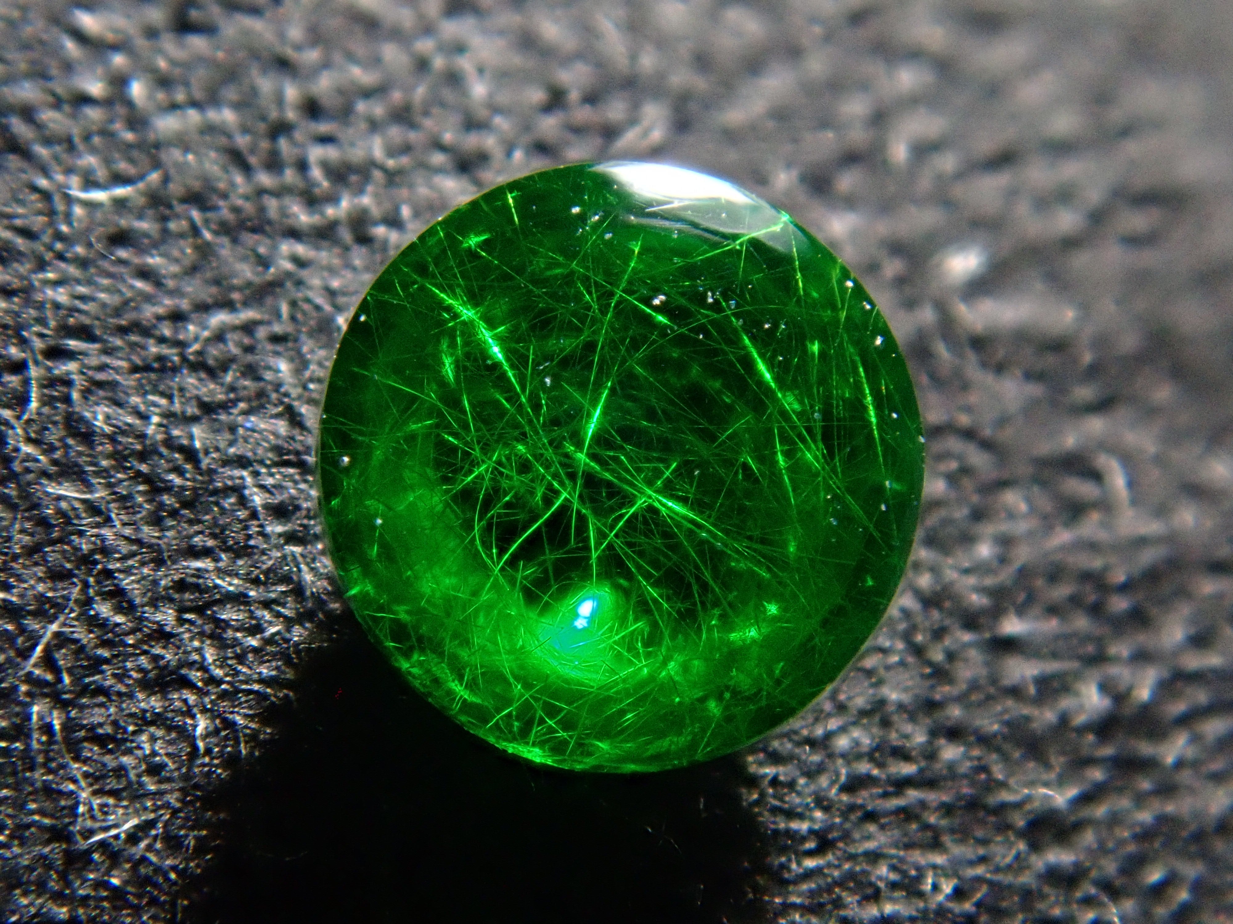 石榴石具有強烈的光色散和強烈的閃光。其中,這顆綠色的「濃綠榴石」是一種特別美麗且稀有的石榴石。這種類型的內含物被稱為“馬尾”,看起來像馬尾巴,甚至有貓眼效果。筆燈用於攝影。石頭的背面基本上是未拋光的。透過顯微鏡檢查證實了馬尾草的存在。