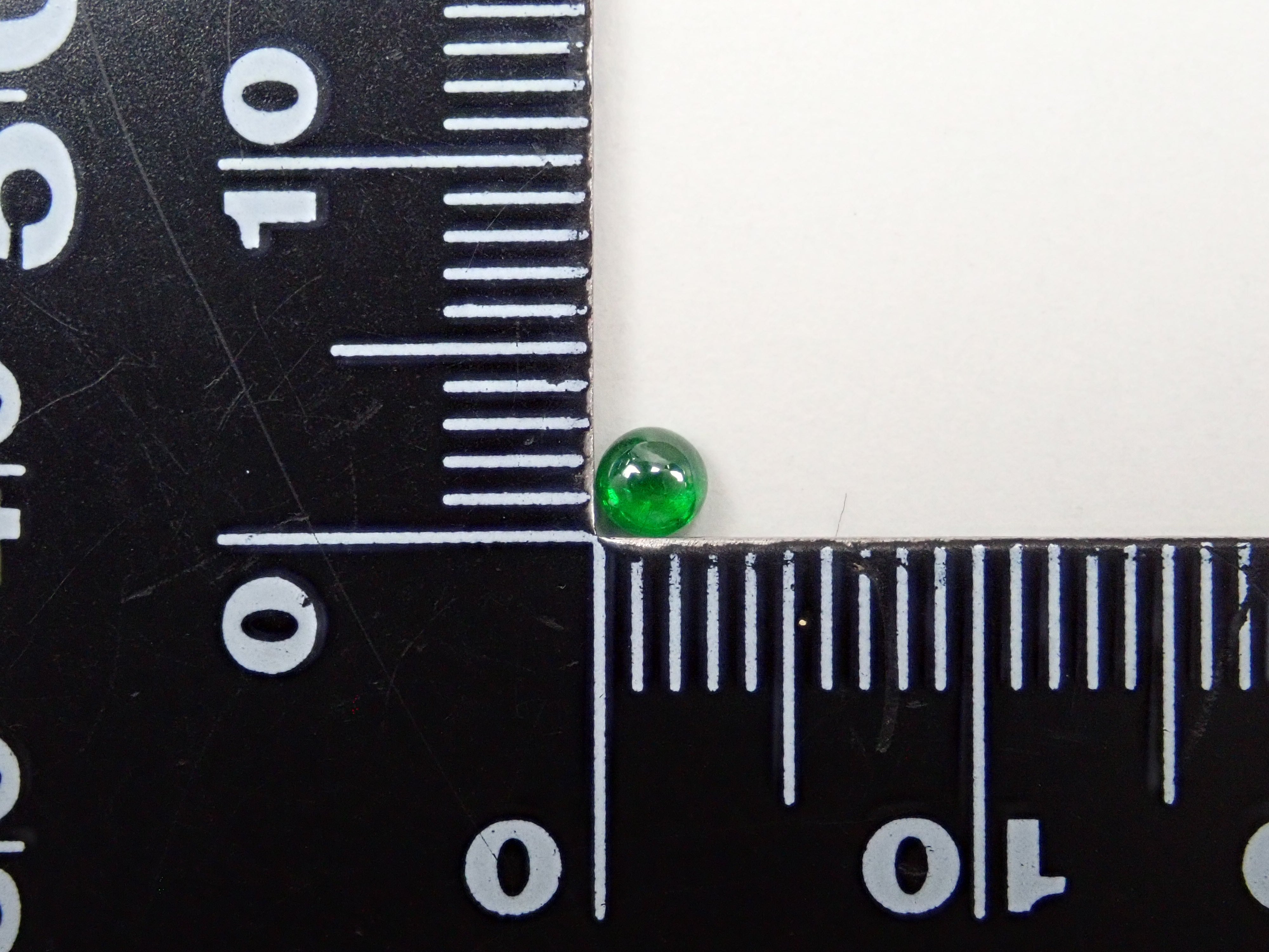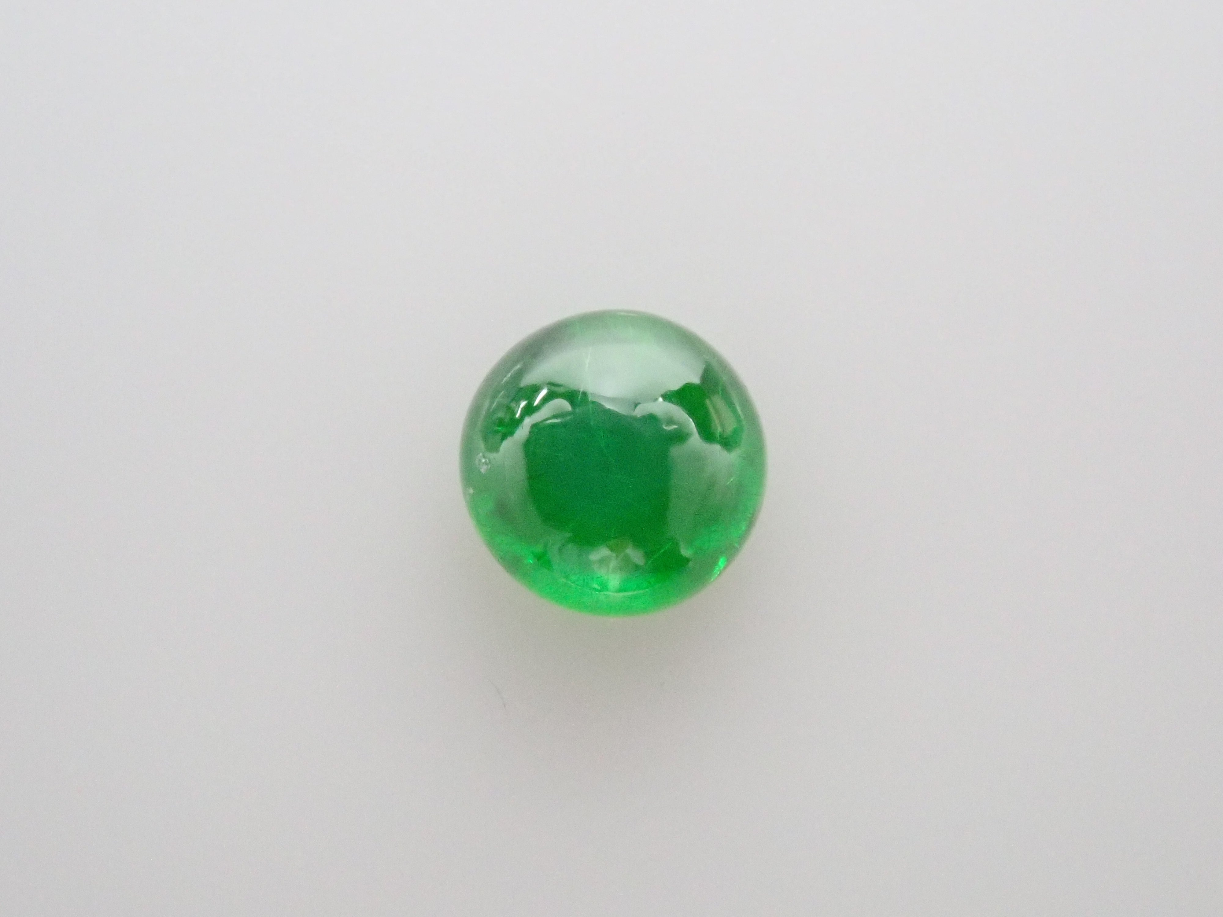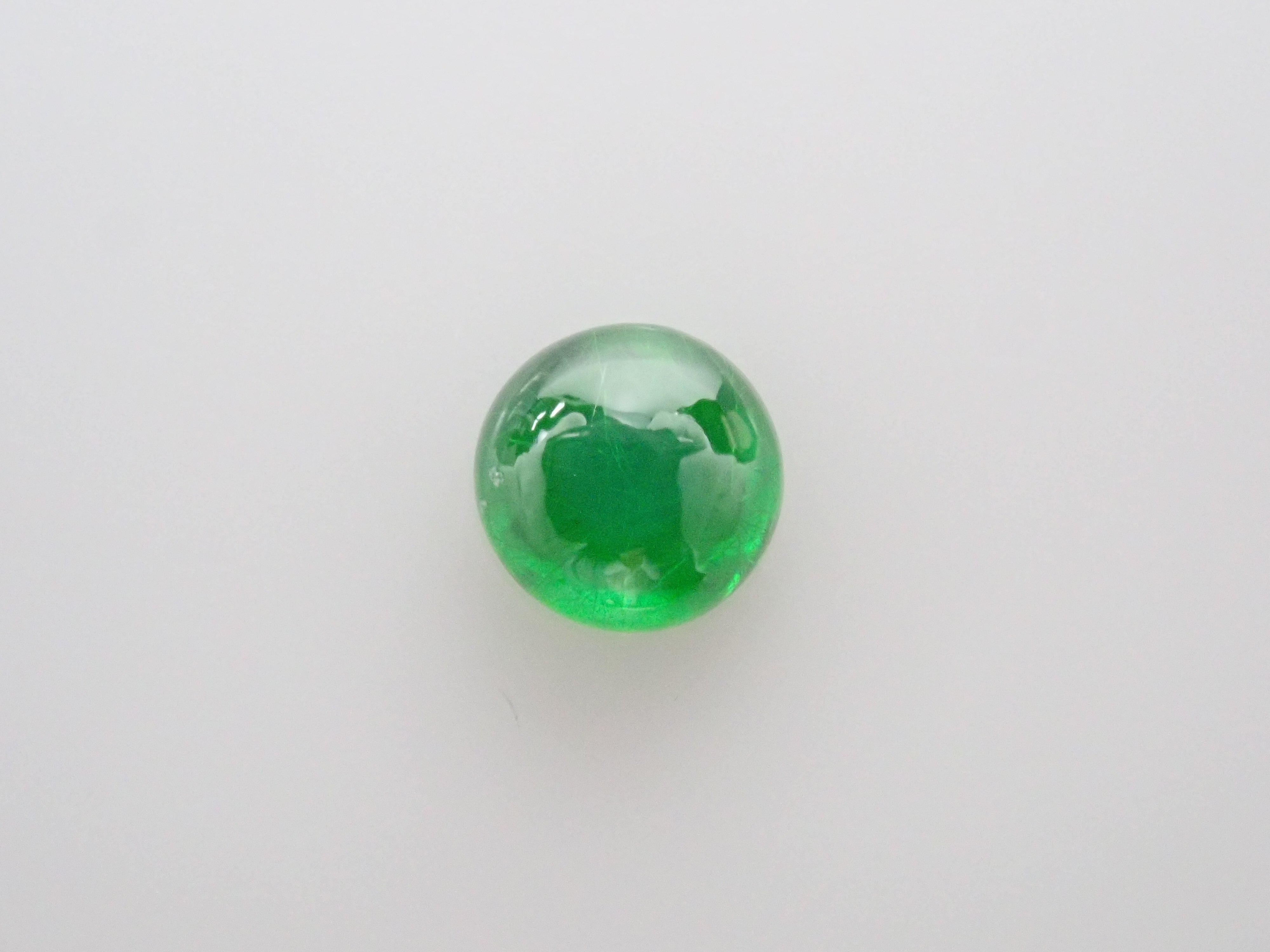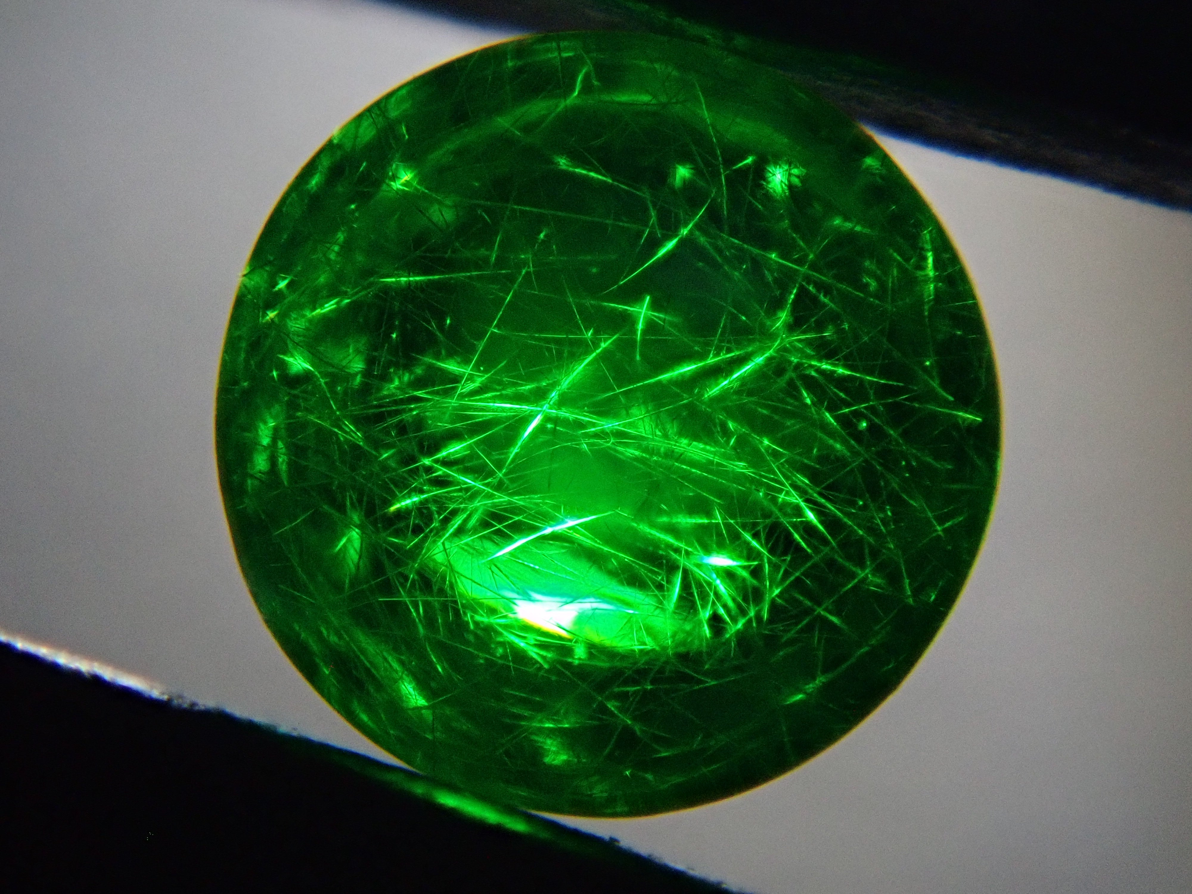 石榴石具有強烈的光色散和強烈的閃光。其中,這顆綠色的「濃綠榴石」是一種特別美麗且稀有的石榴石。這種類型的內含物被稱為“馬尾”,看起來像馬尾巴,甚至有貓眼效果。筆燈用於攝影。石頭的背面基本上是未拋光的。透過顯微鏡檢查證實了馬尾草的存在。