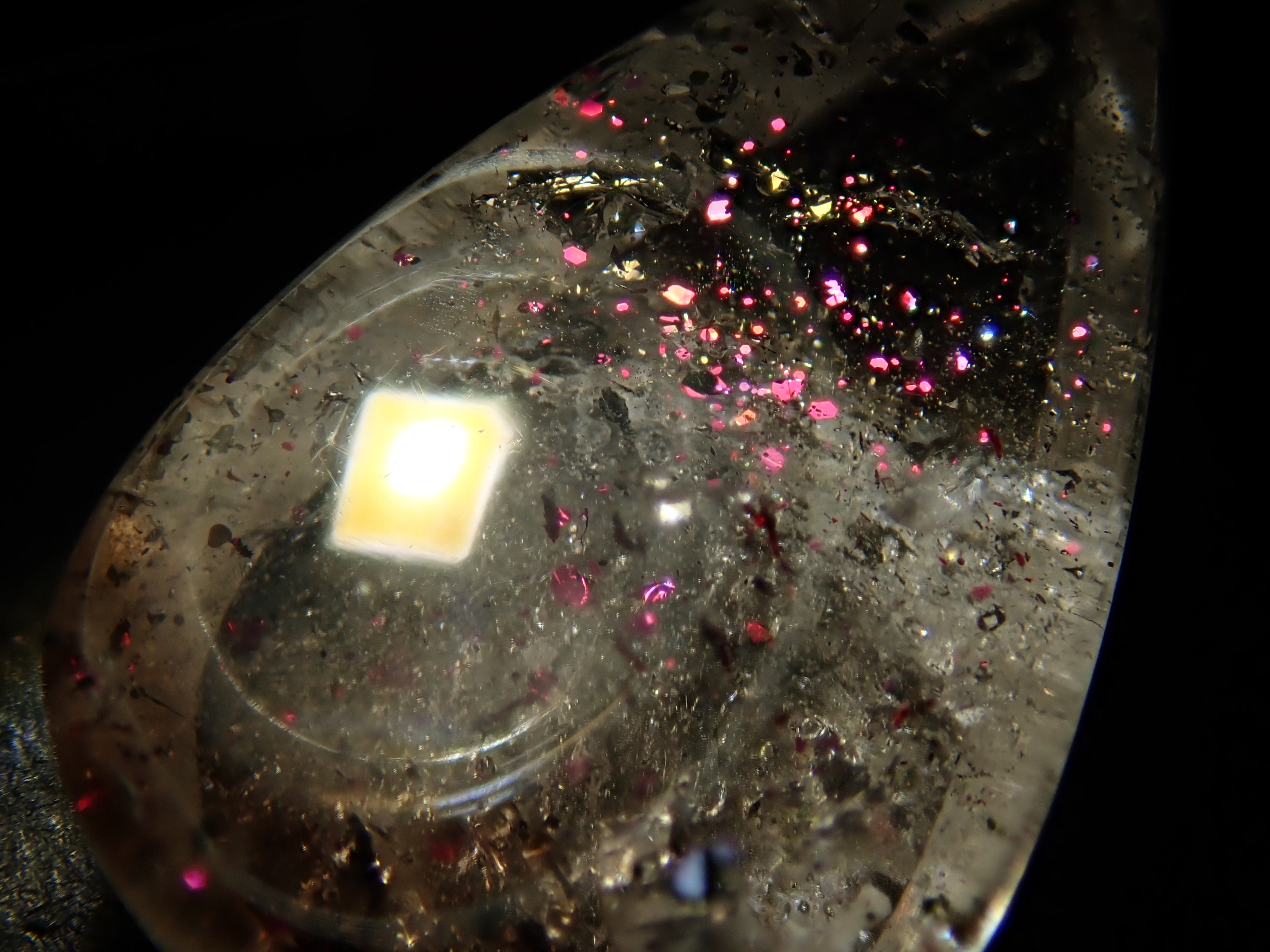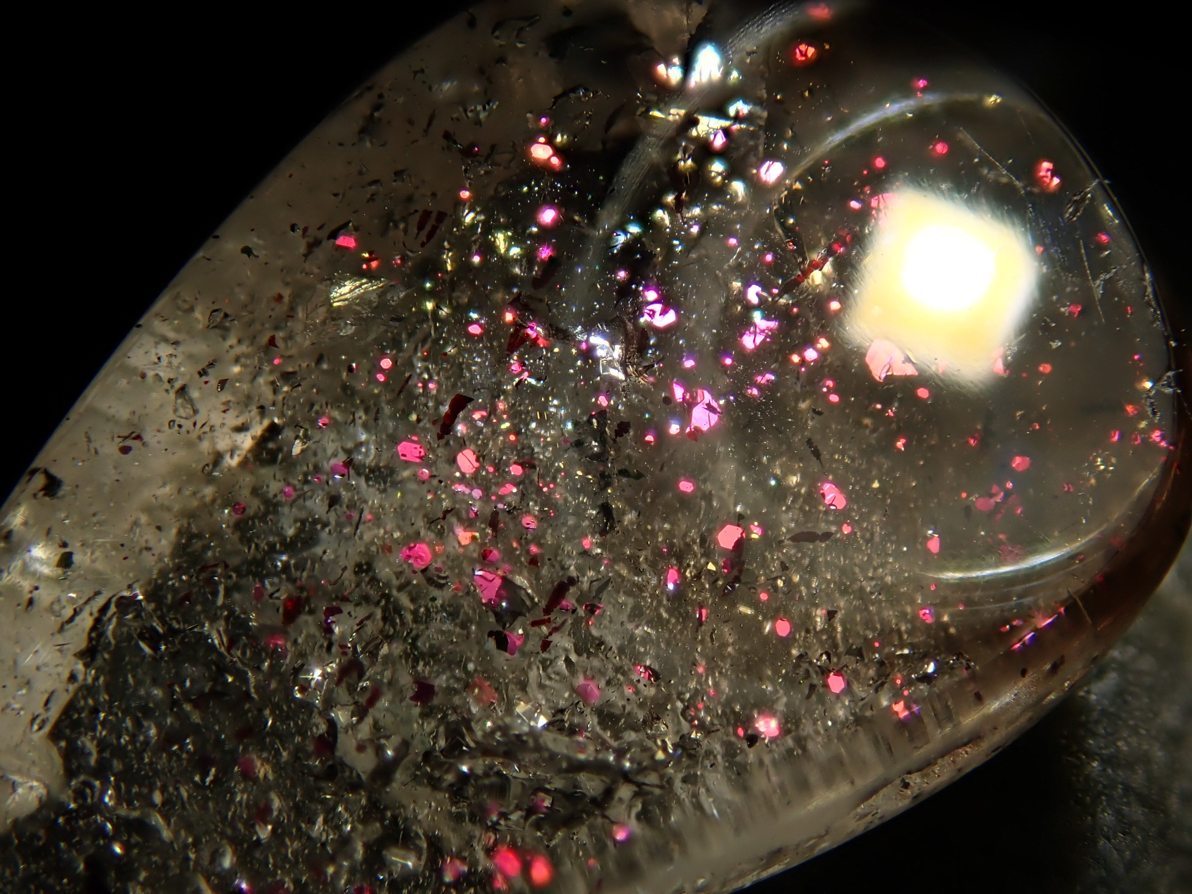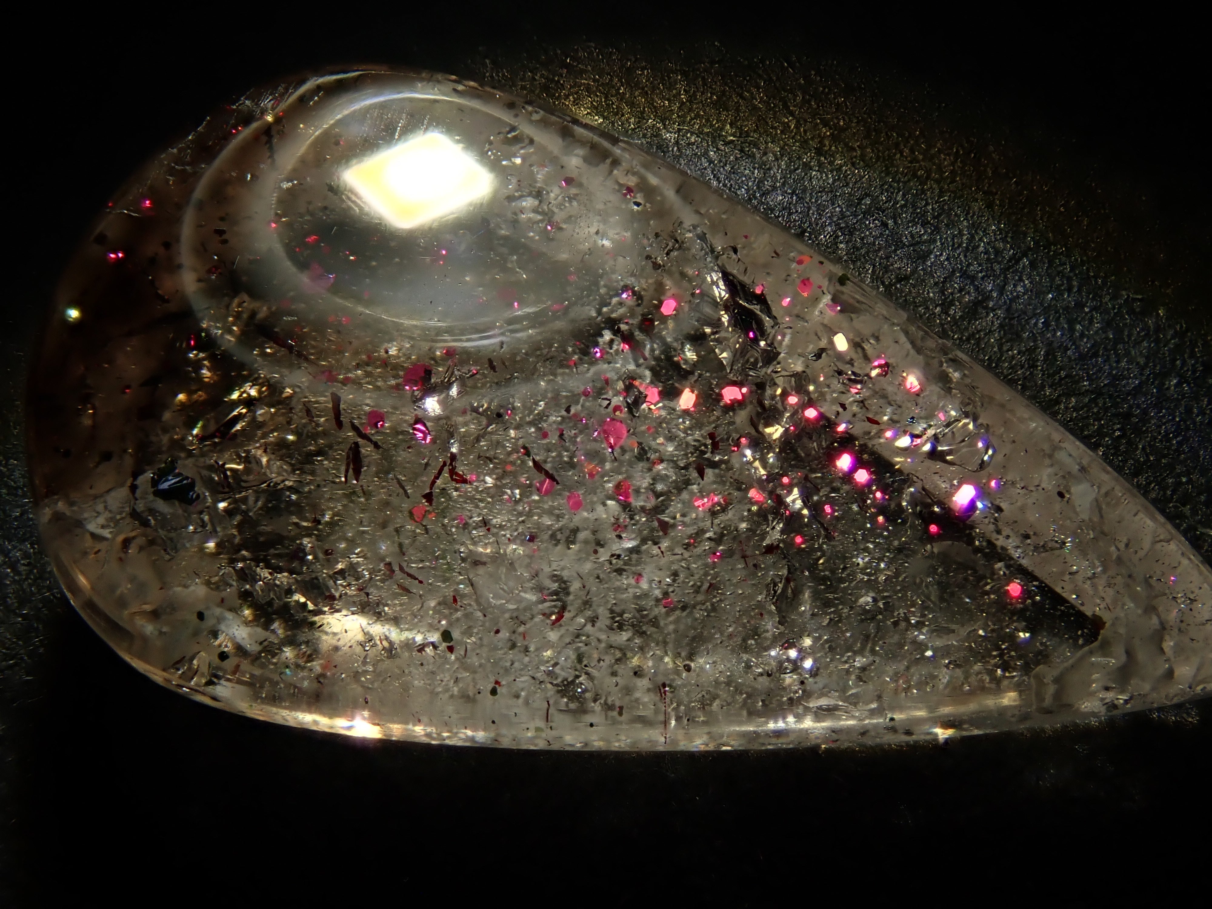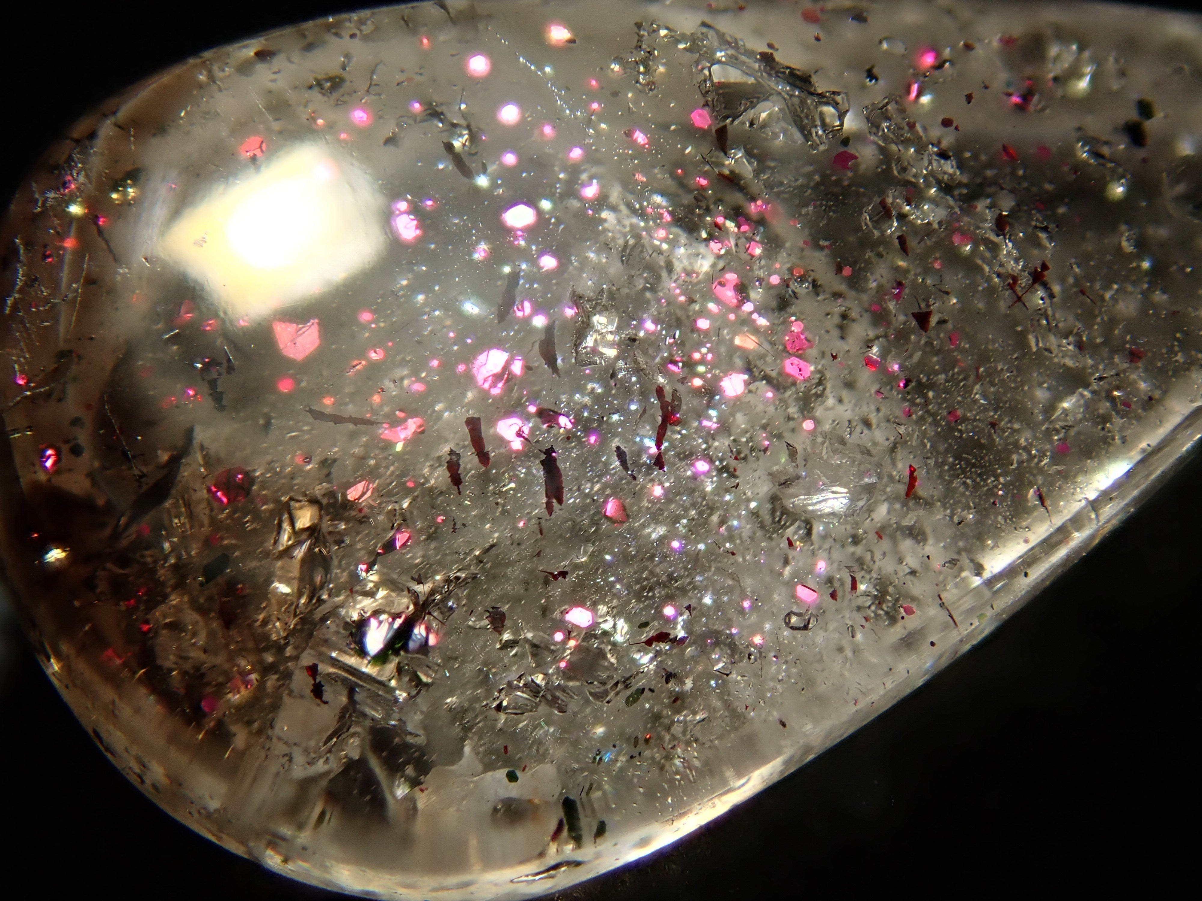 石英在日文中稱為水晶。它是一種在日本非常熟悉的石頭,但它也是一種深寶石,有紫水晶和黃水晶等多種類型。這種晶體看起來像暴風雪般的紅色花朵,被稱為小叮噹石英或粉紅火石英。為了清楚地顯示裡麵包裹體的樣子,我用了筆電筒拍照。