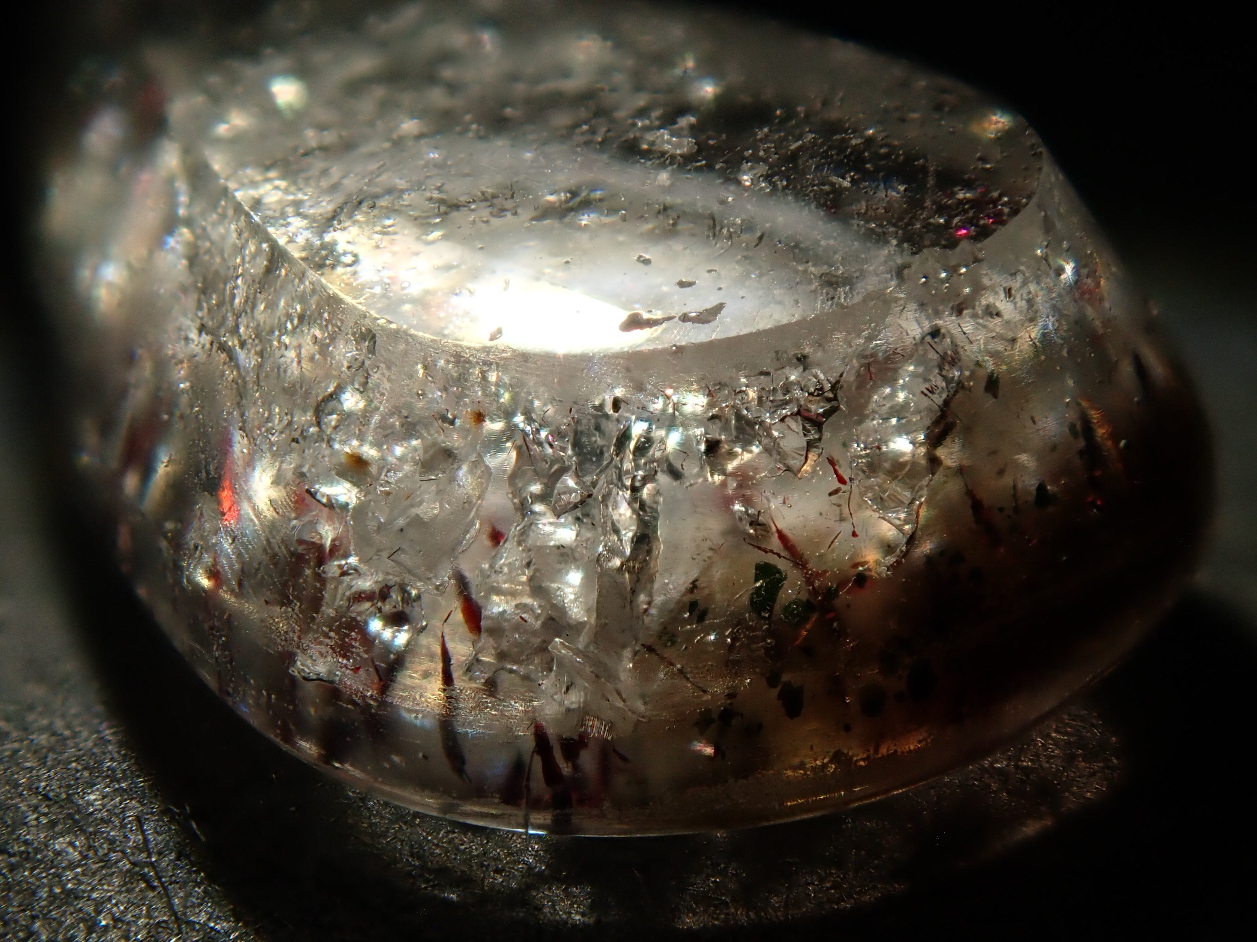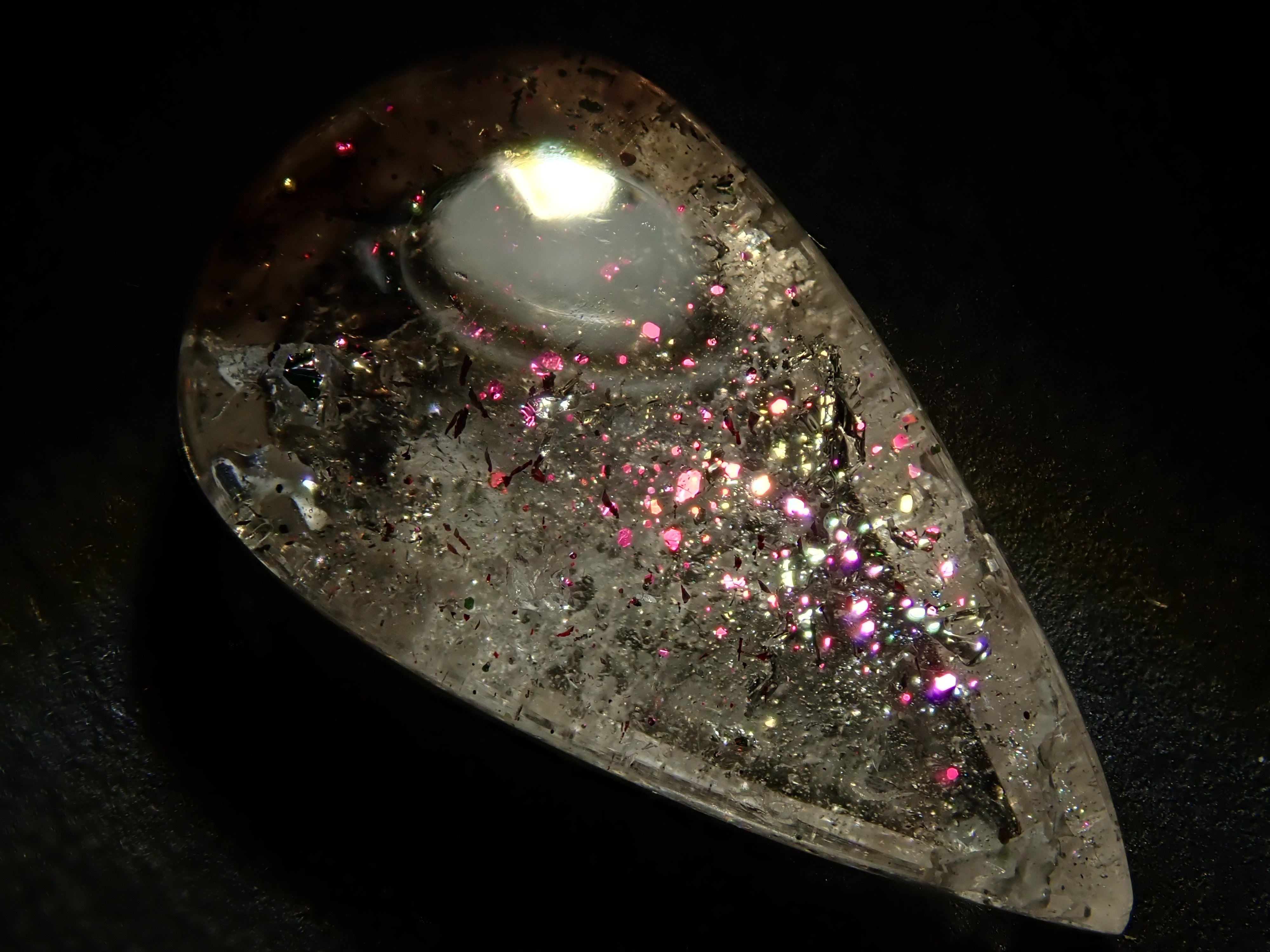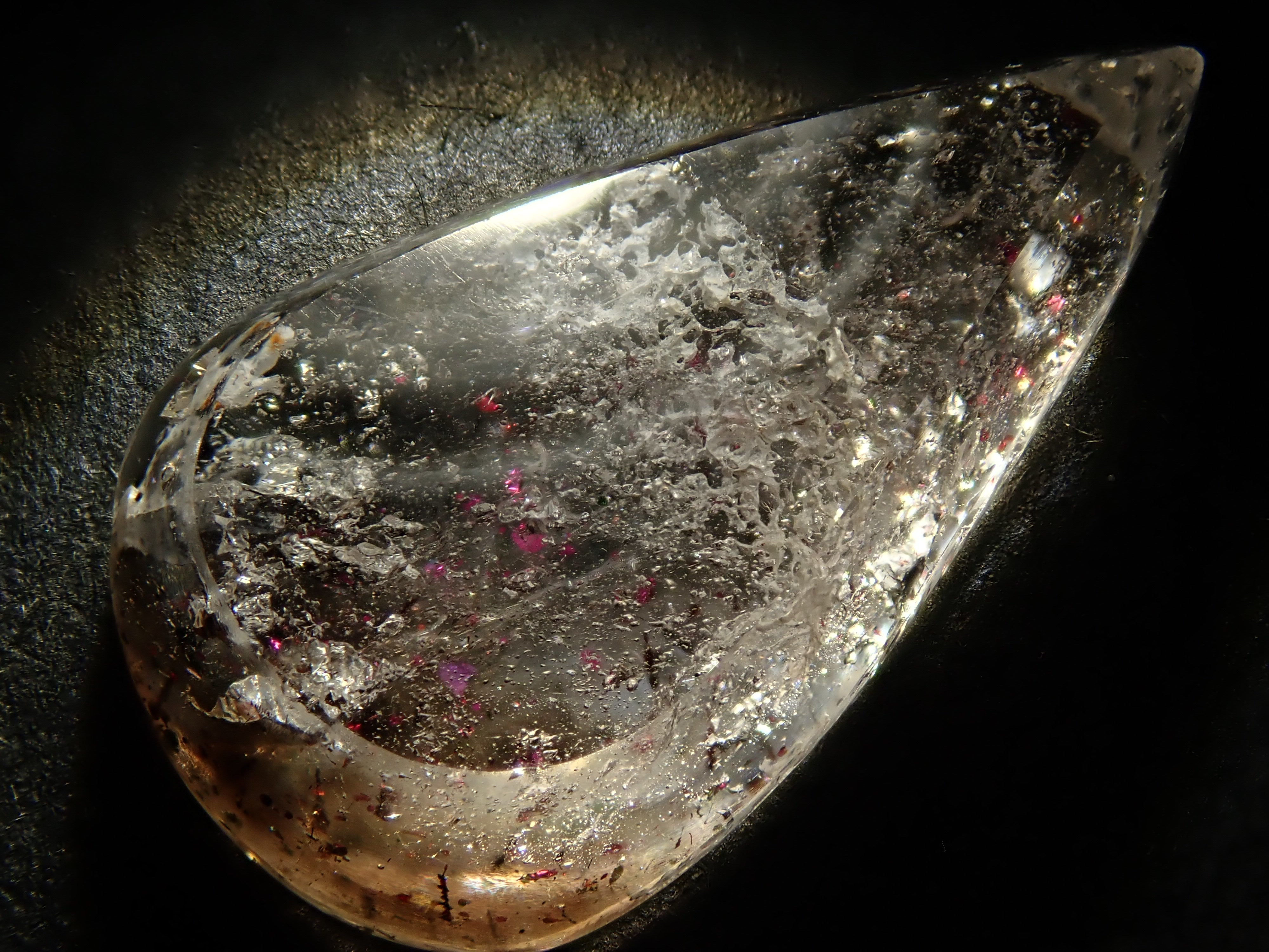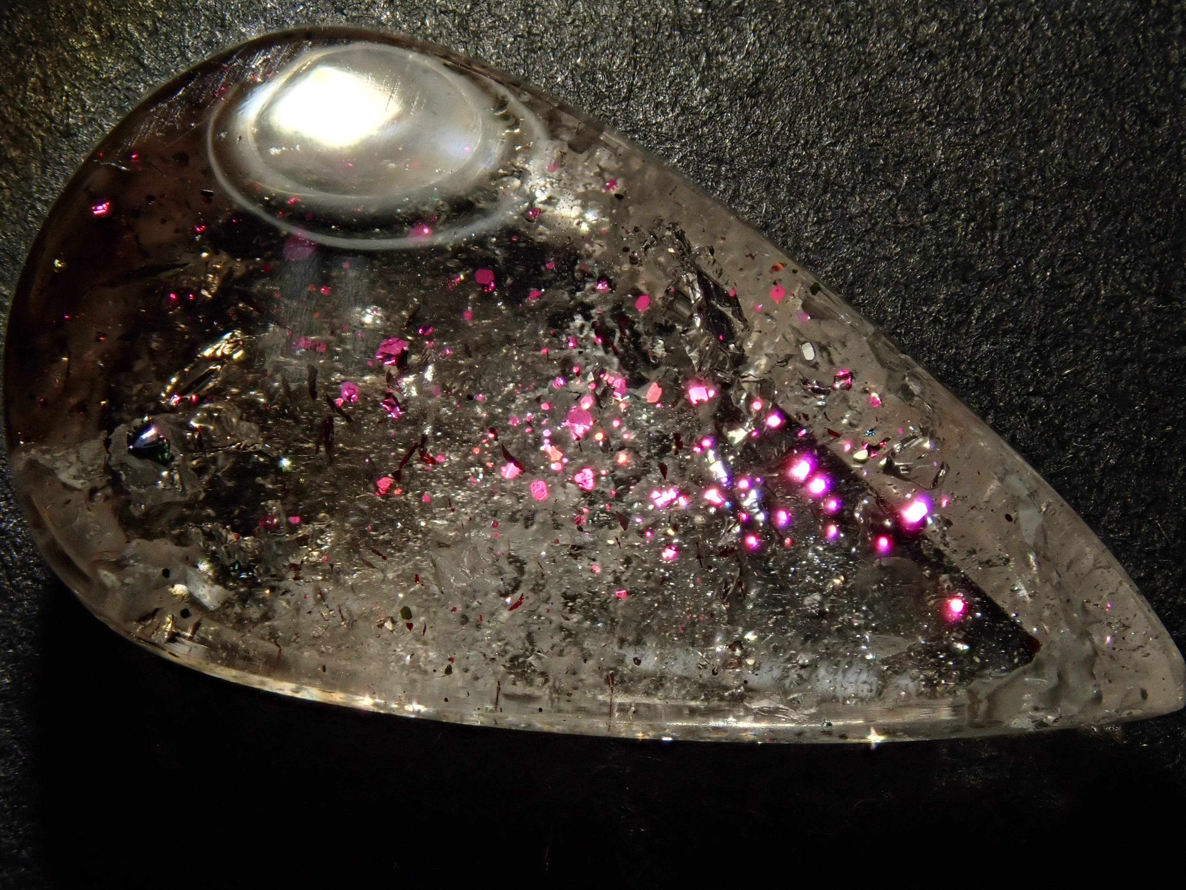 石英在日文中稱為水晶。它是一種在日本非常熟悉的石頭,但它也是一種深寶石,有紫水晶和黃水晶等多種類型。這種晶體看起來像暴風雪般的紅色花朵,被稱為小叮噹石英或粉紅火石英。為了清楚地顯示裡麵包裹體的樣子,我用了筆電筒拍照。