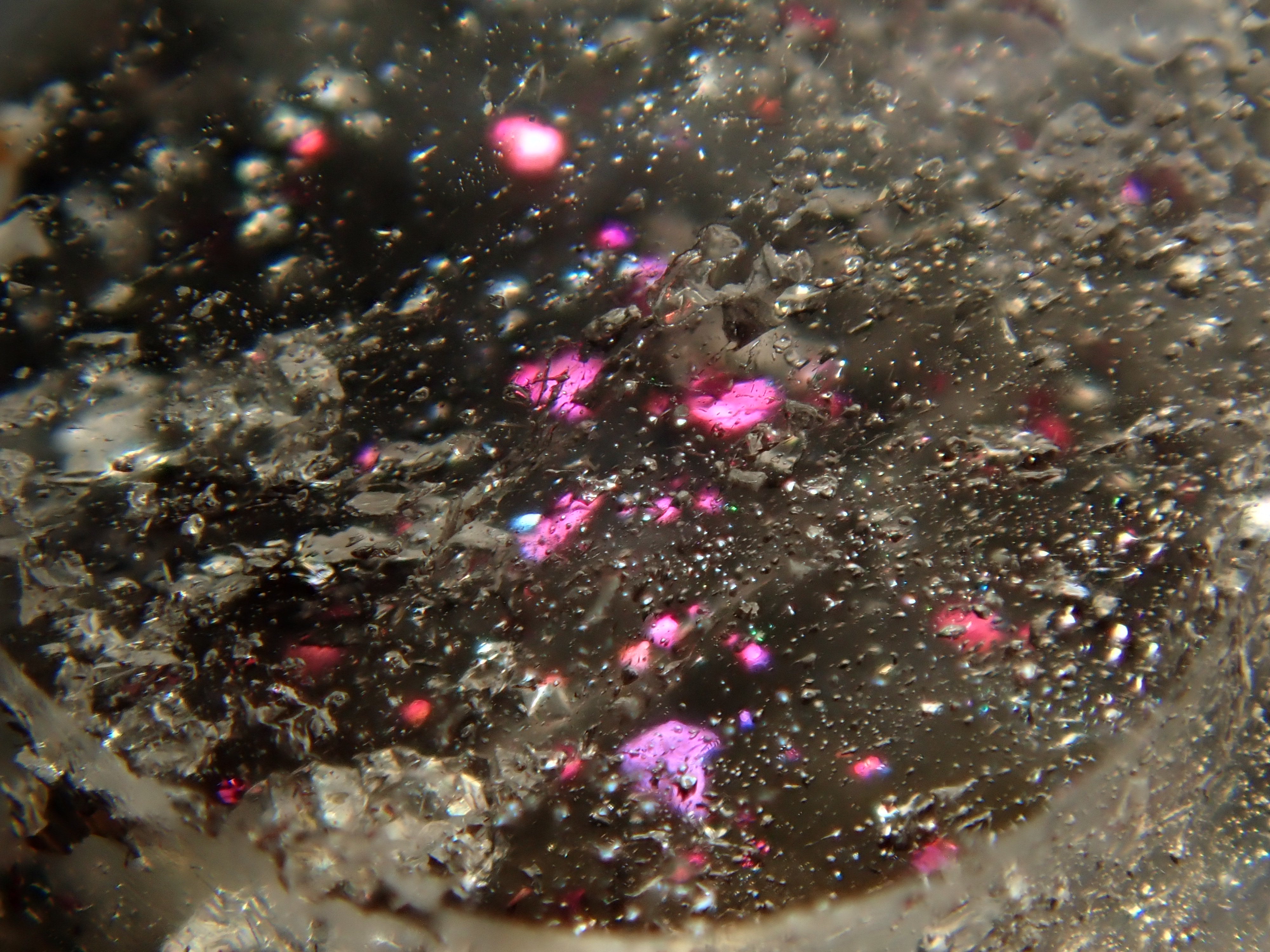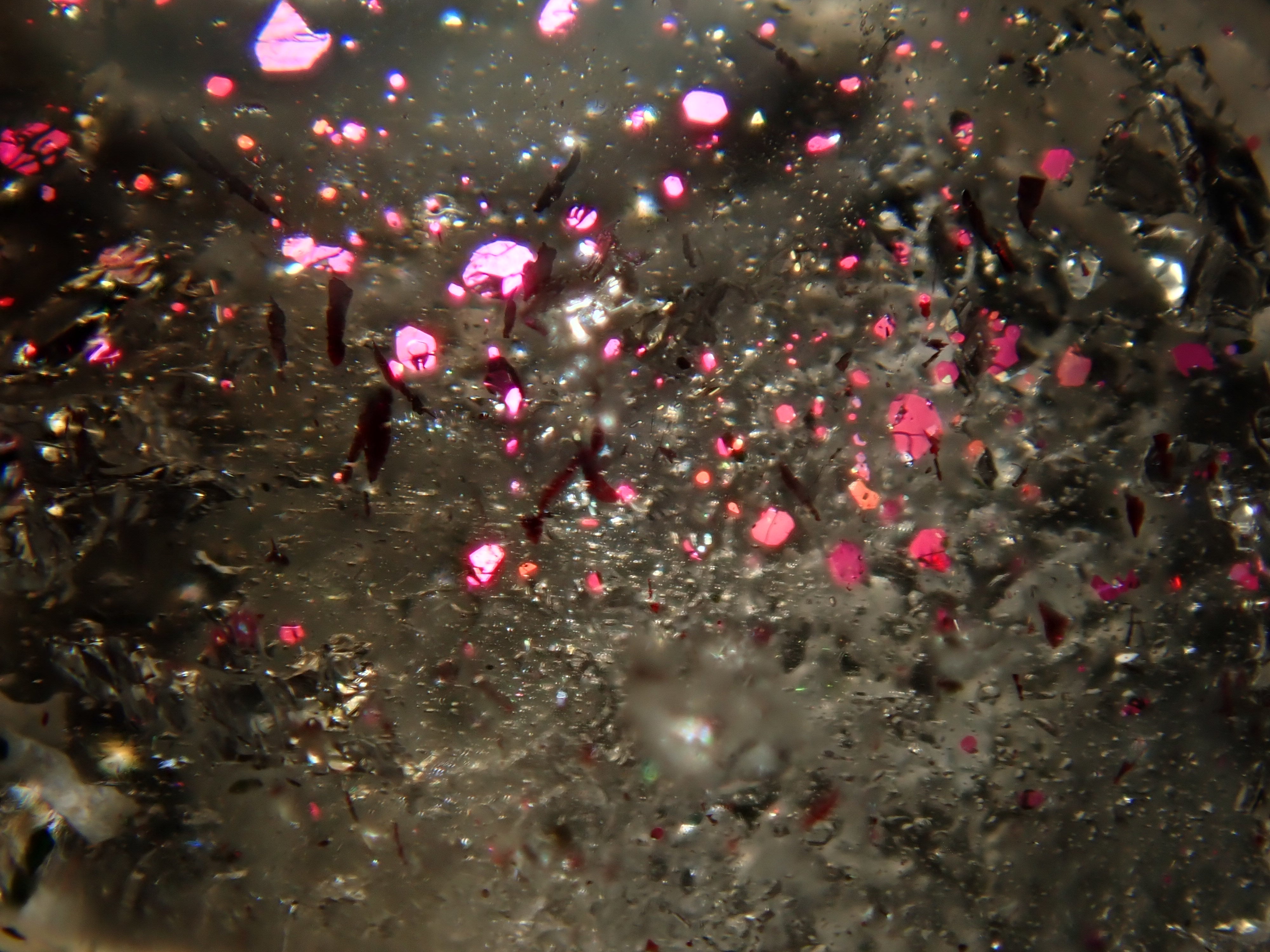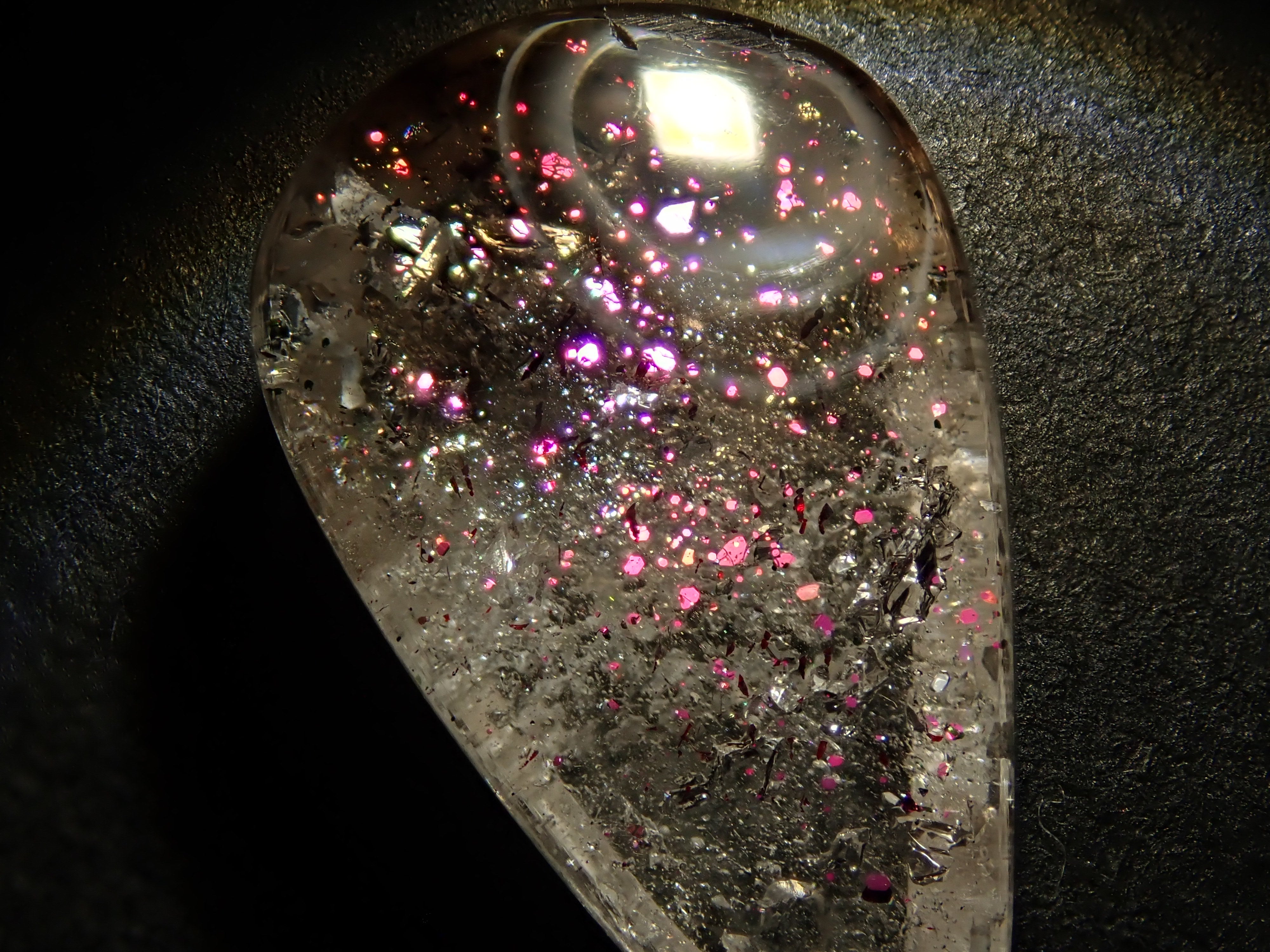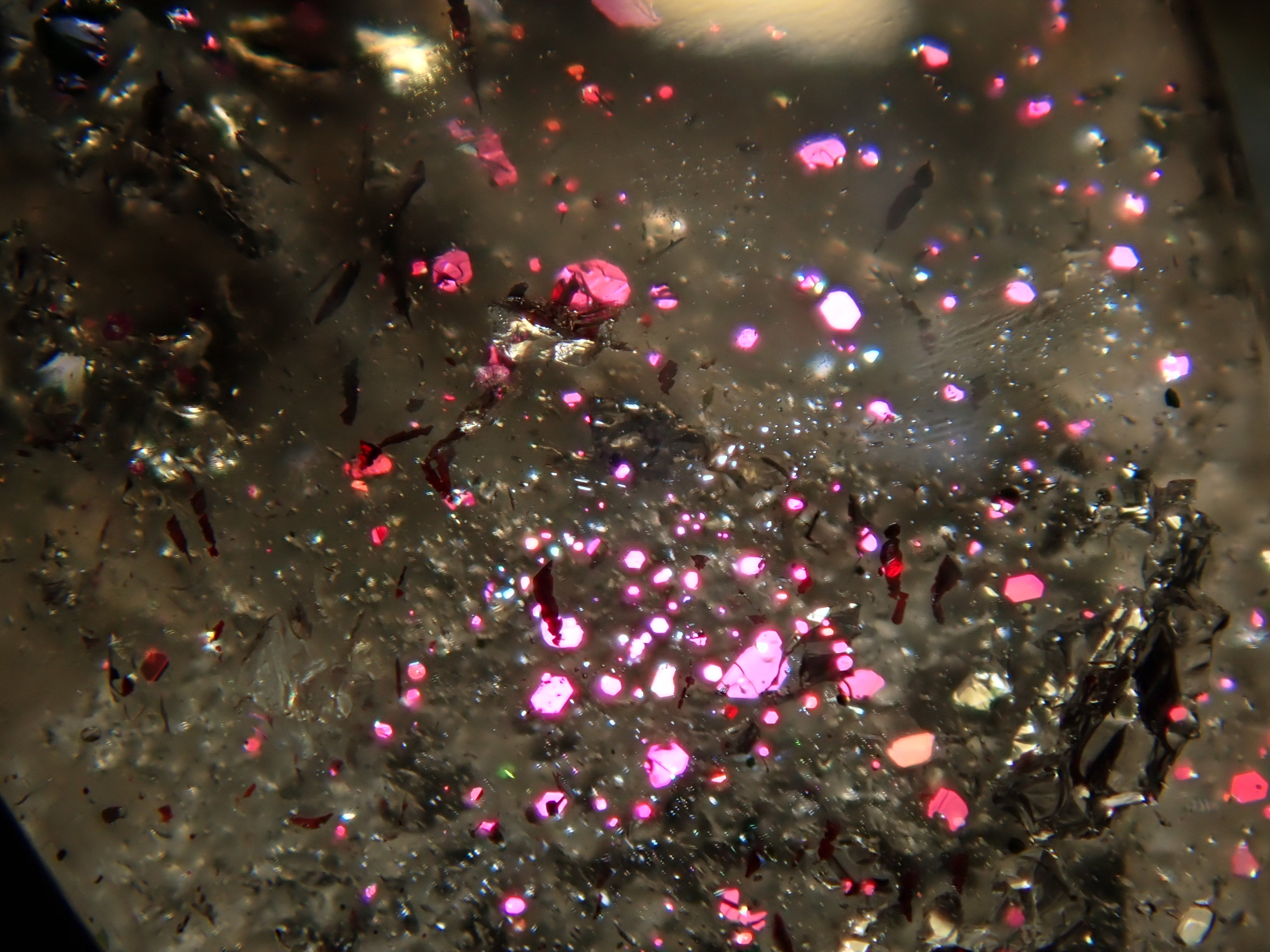 石英在日文中稱為水晶。它是一種在日本非常熟悉的石頭,但它也是一種深寶石,有紫水晶和黃水晶等多種類型。這種晶體看起來像暴風雪般的紅色花朵,被稱為小叮噹石英或粉紅火石英。為了清楚地顯示裡麵包裹體的樣子,我用了筆電筒拍照。