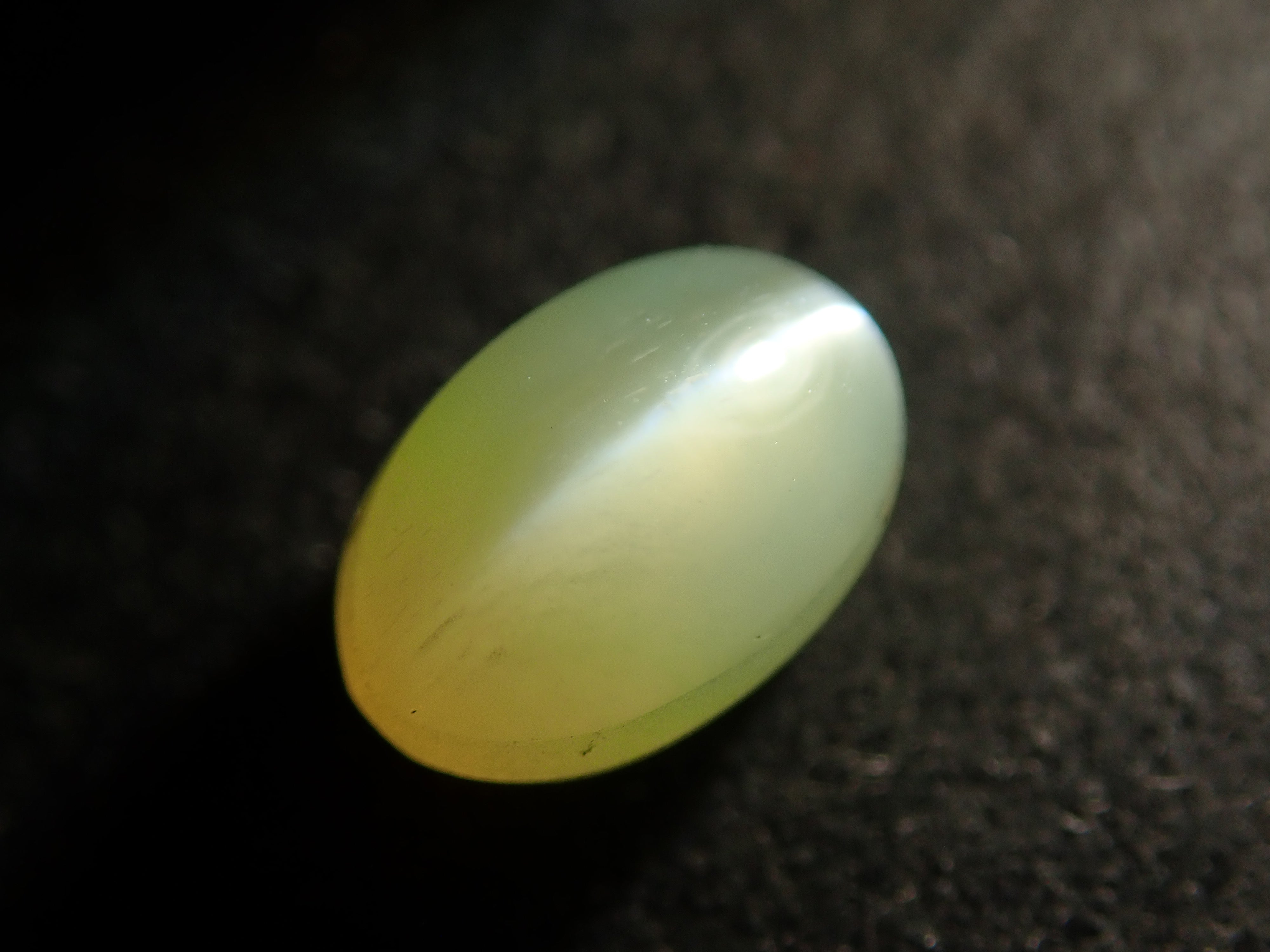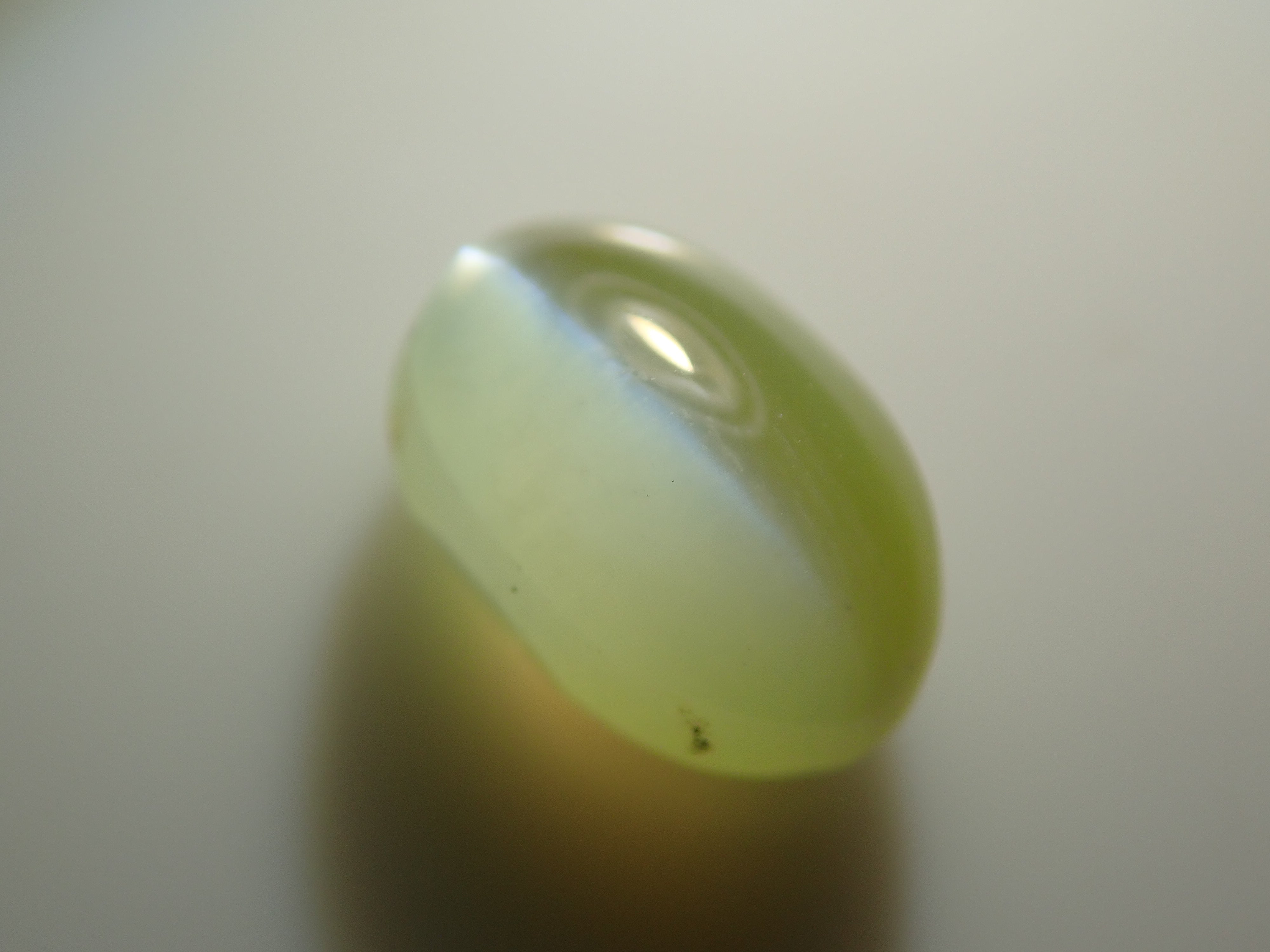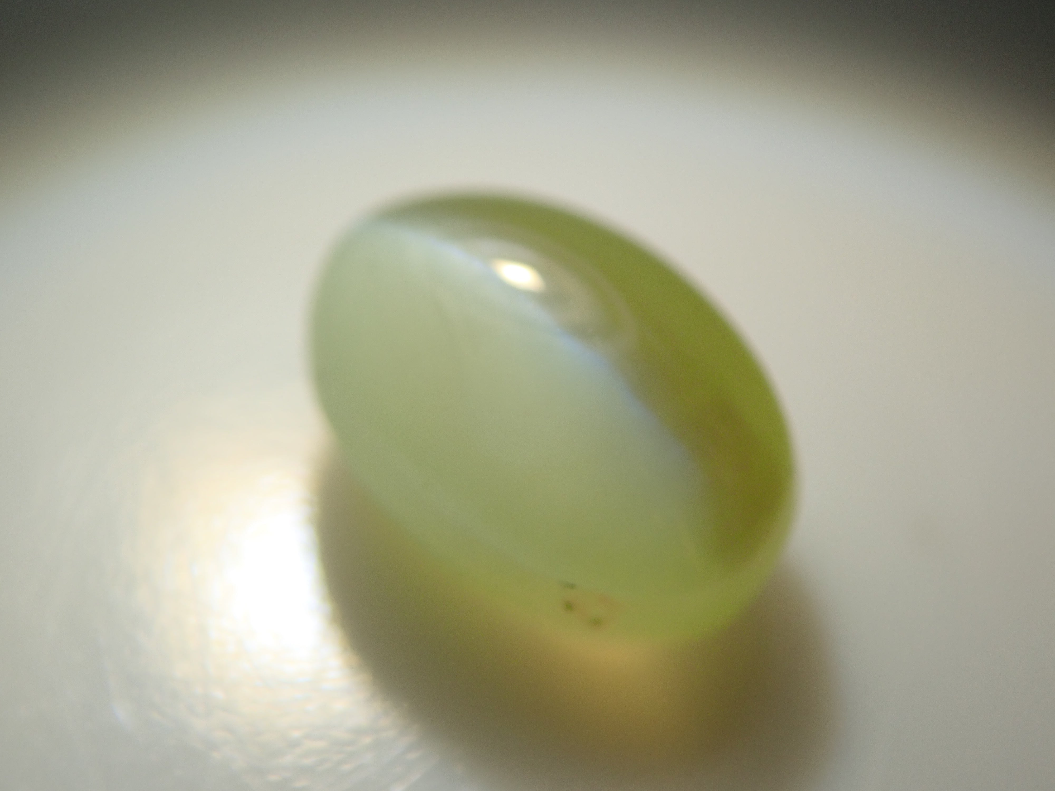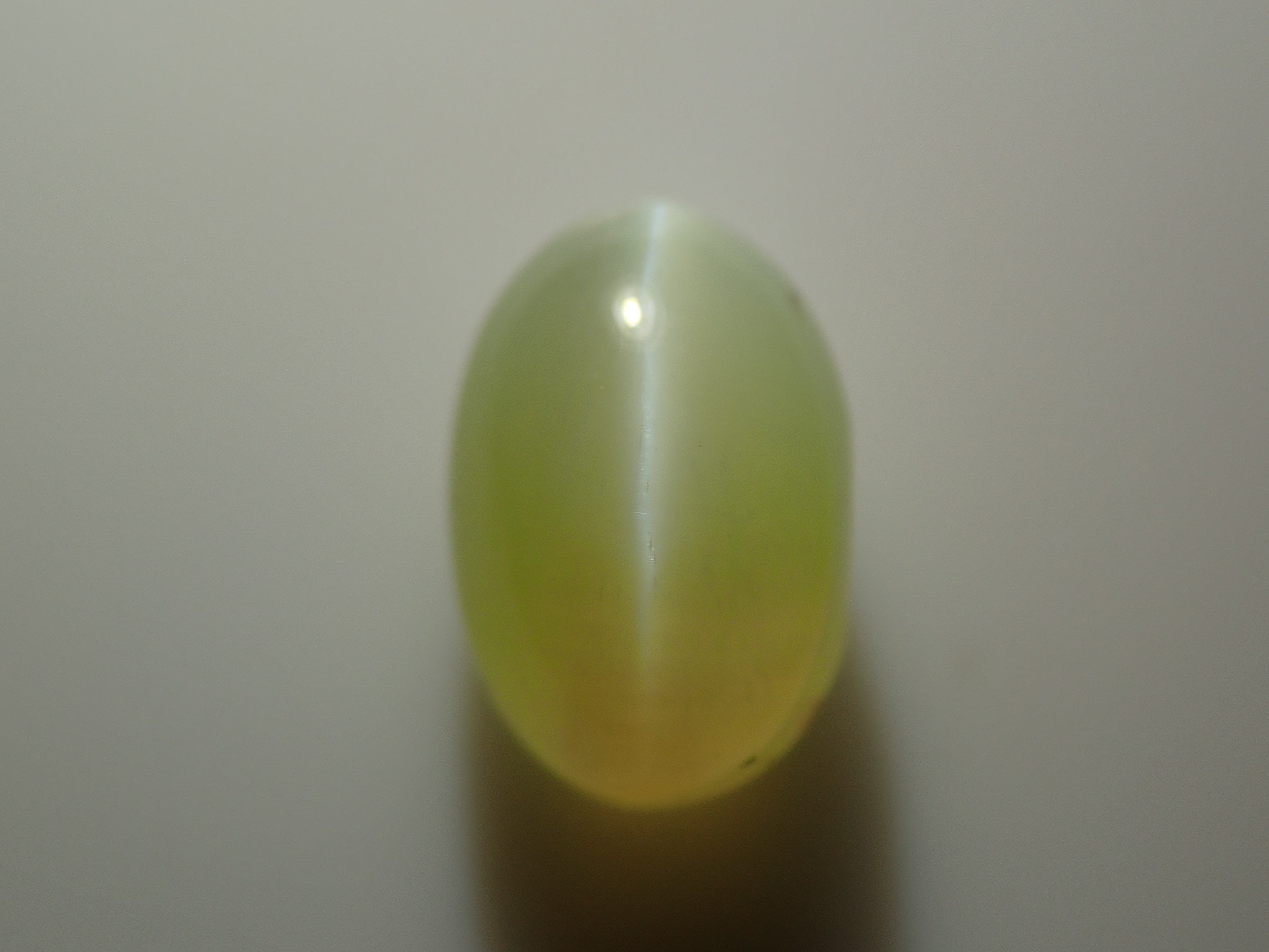 金綠寶石是一種有多種色調的寶石,從淺黃色到綠色再到深棕色。它是一種堅硬耐用的寶石。這是可以看到貓眼效果的類型,使用筆燈拍攝。石頭的背面基本上是未拋光的。