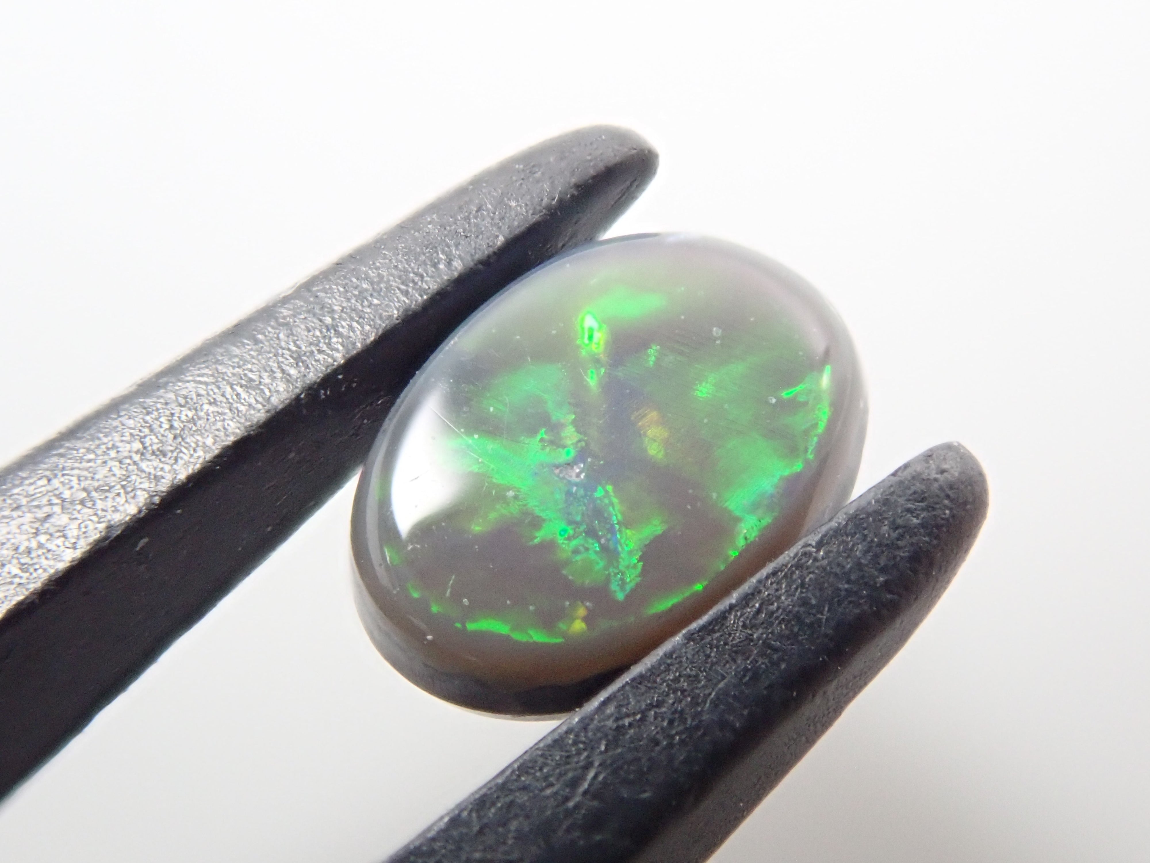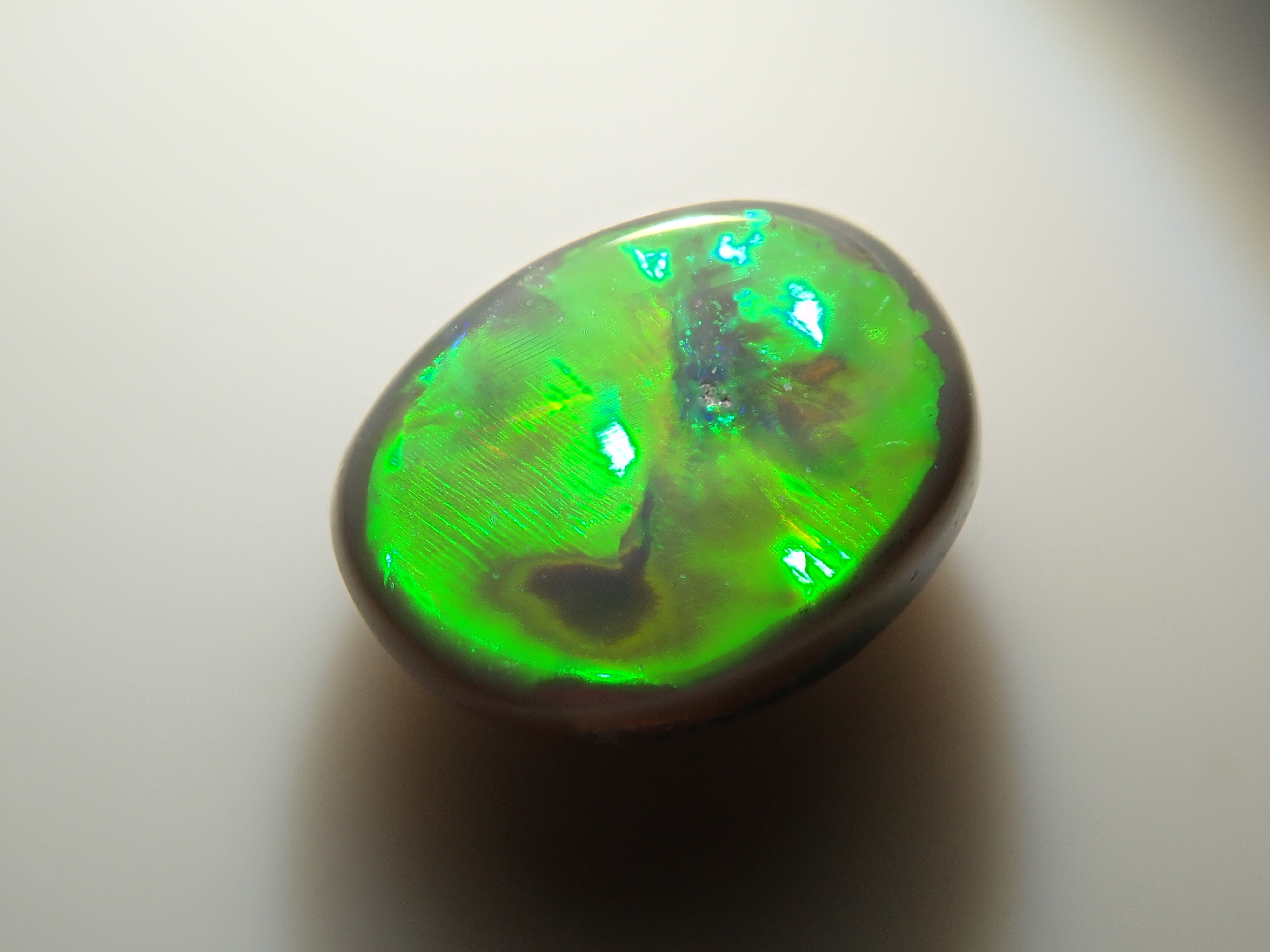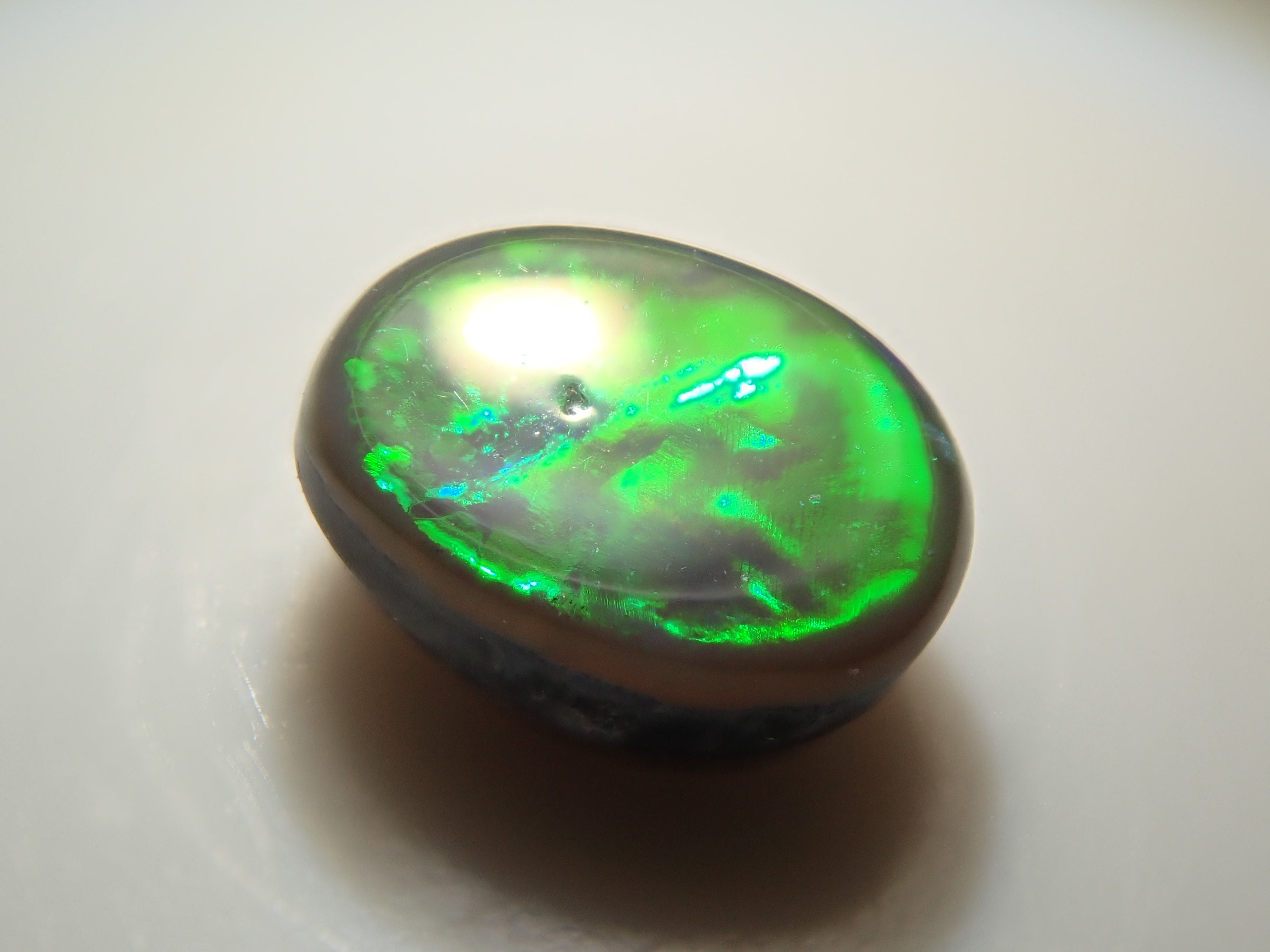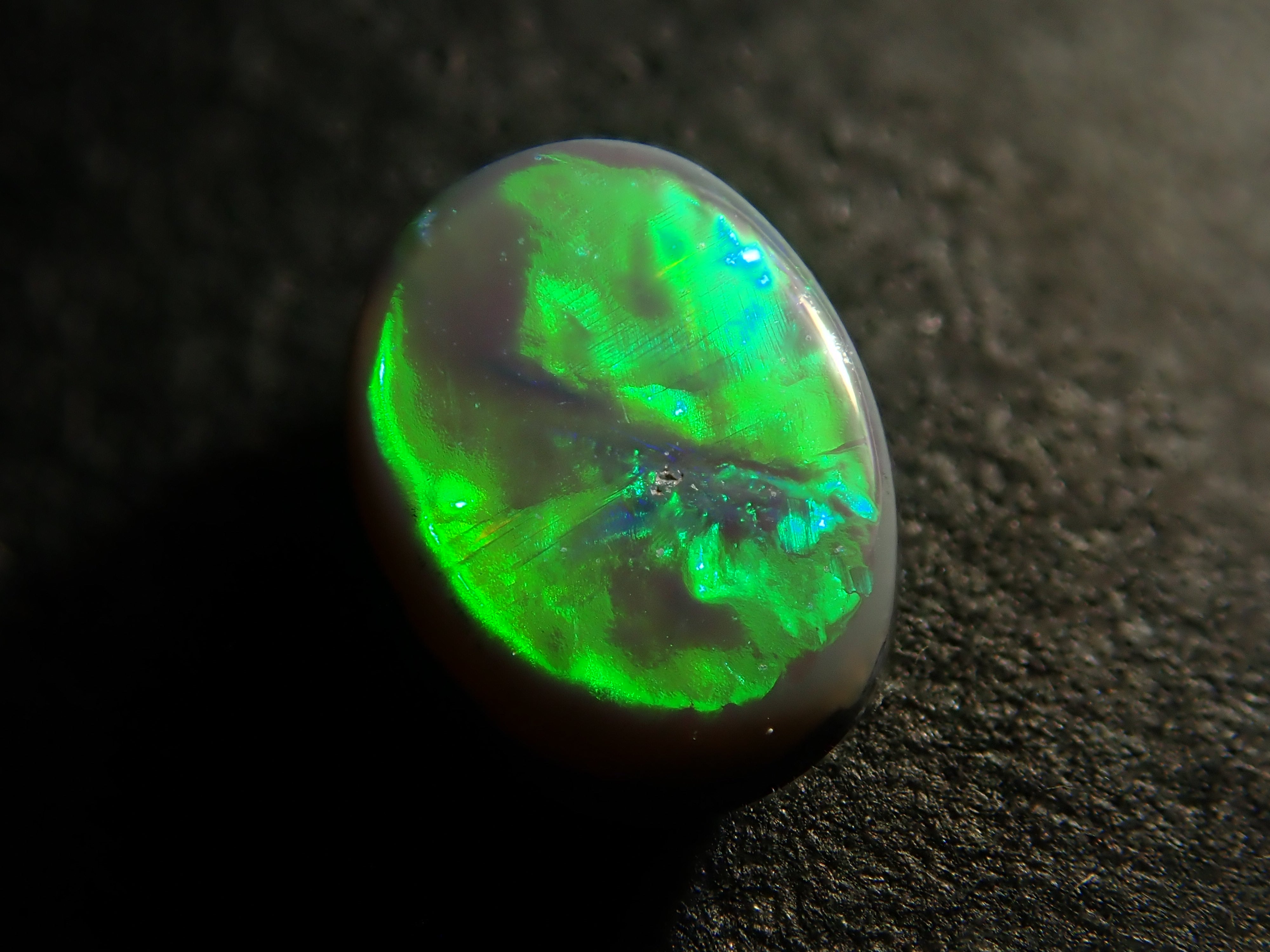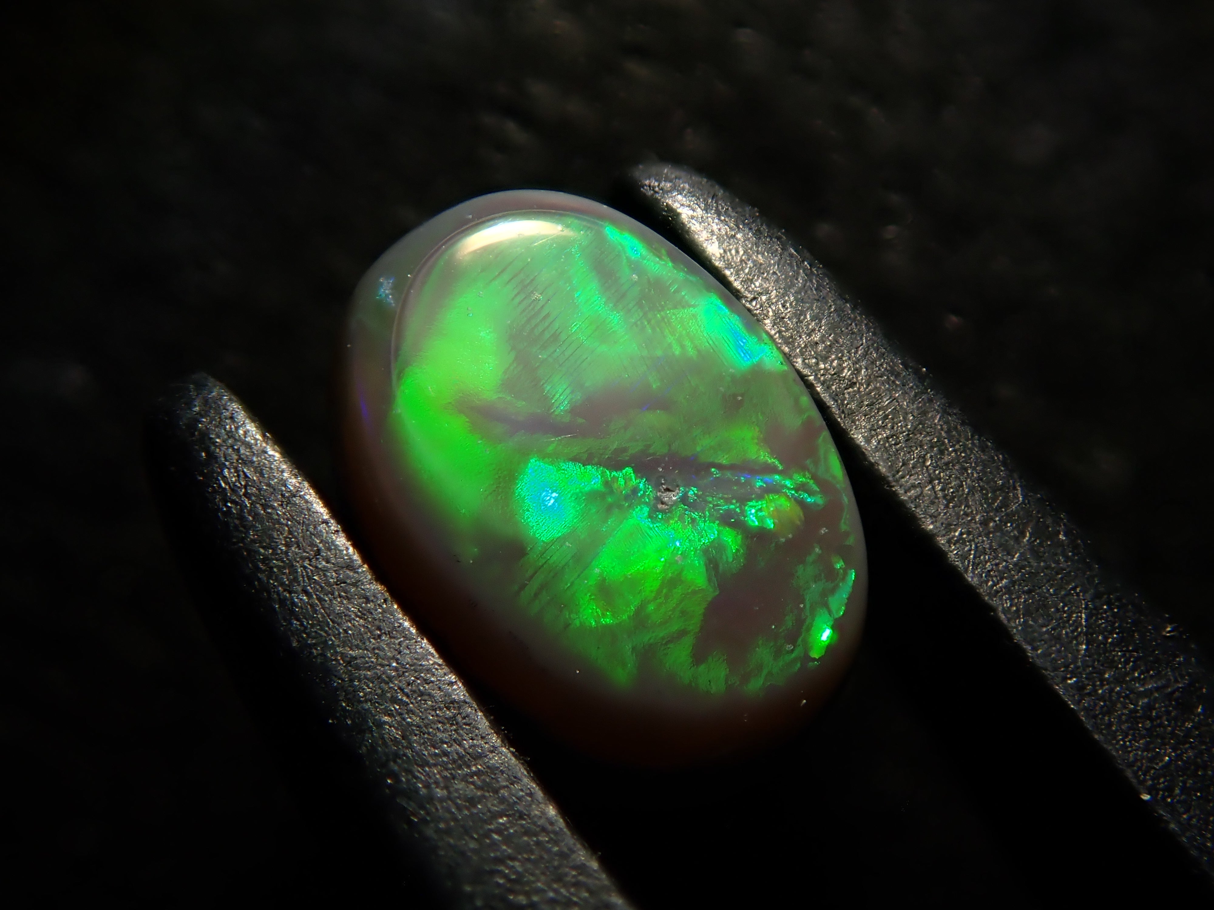 蛋白石是一種閃爍著彩虹色光芒的寶石。蛋白石有好幾種類型,但其中,黑蛋白石漆黑的黑暗中搖曳的紅色火焰美得讓人無法移開目光。底色包括黑色、藍色和灰色。照片是使用筆燈拍攝的。美麗的黑蛋白石,帶有充滿活力的綠色色彩。