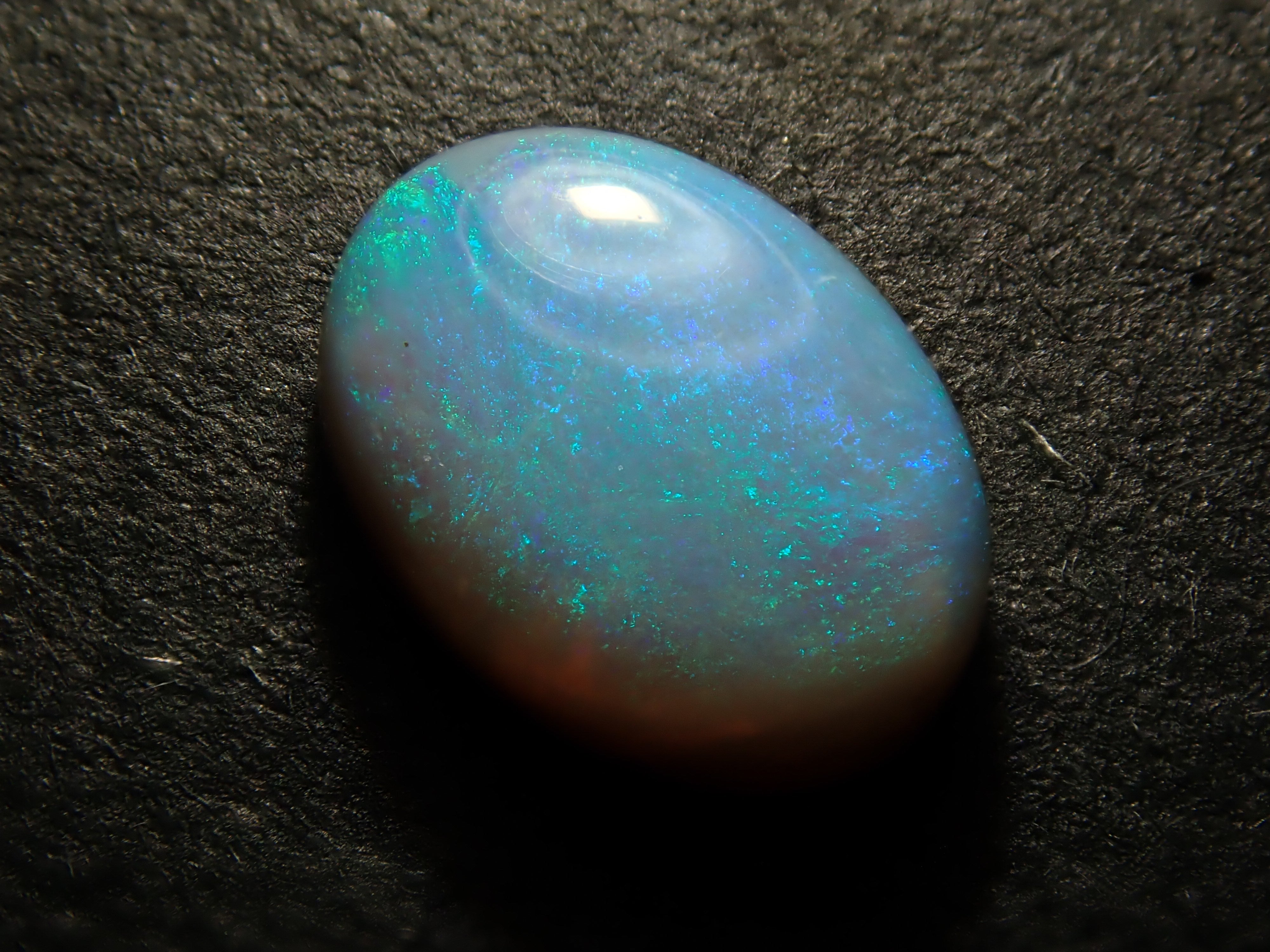 蛋白石是一種閃爍著彩虹色光芒的寶石。蛋白石有好幾種類型,但其中,黑蛋白石漆黑的黑暗中搖曳的紅色火焰美得讓人無法移開目光。底色包括黑色、藍色和灰色。照片是使用筆燈拍攝的。
