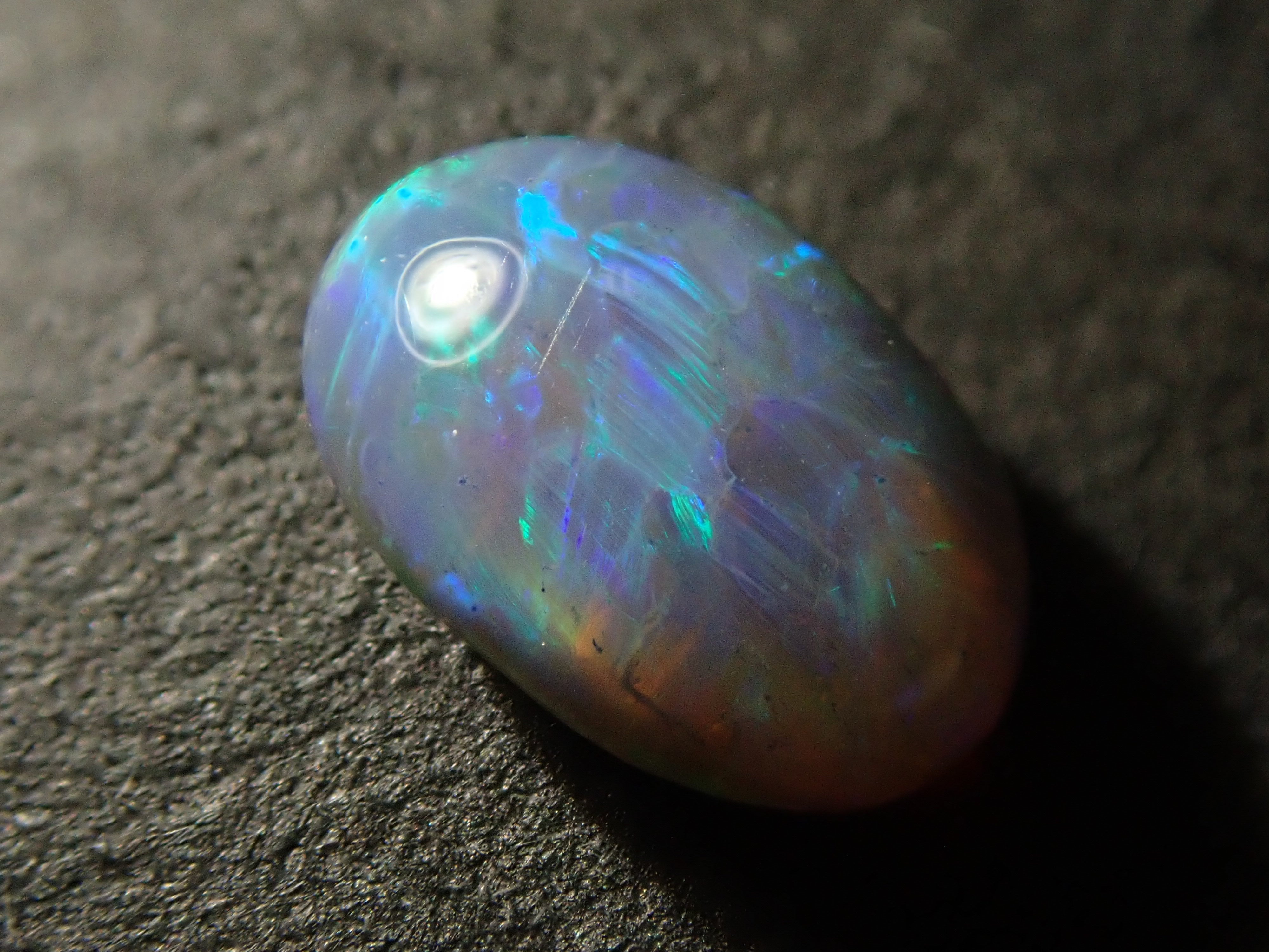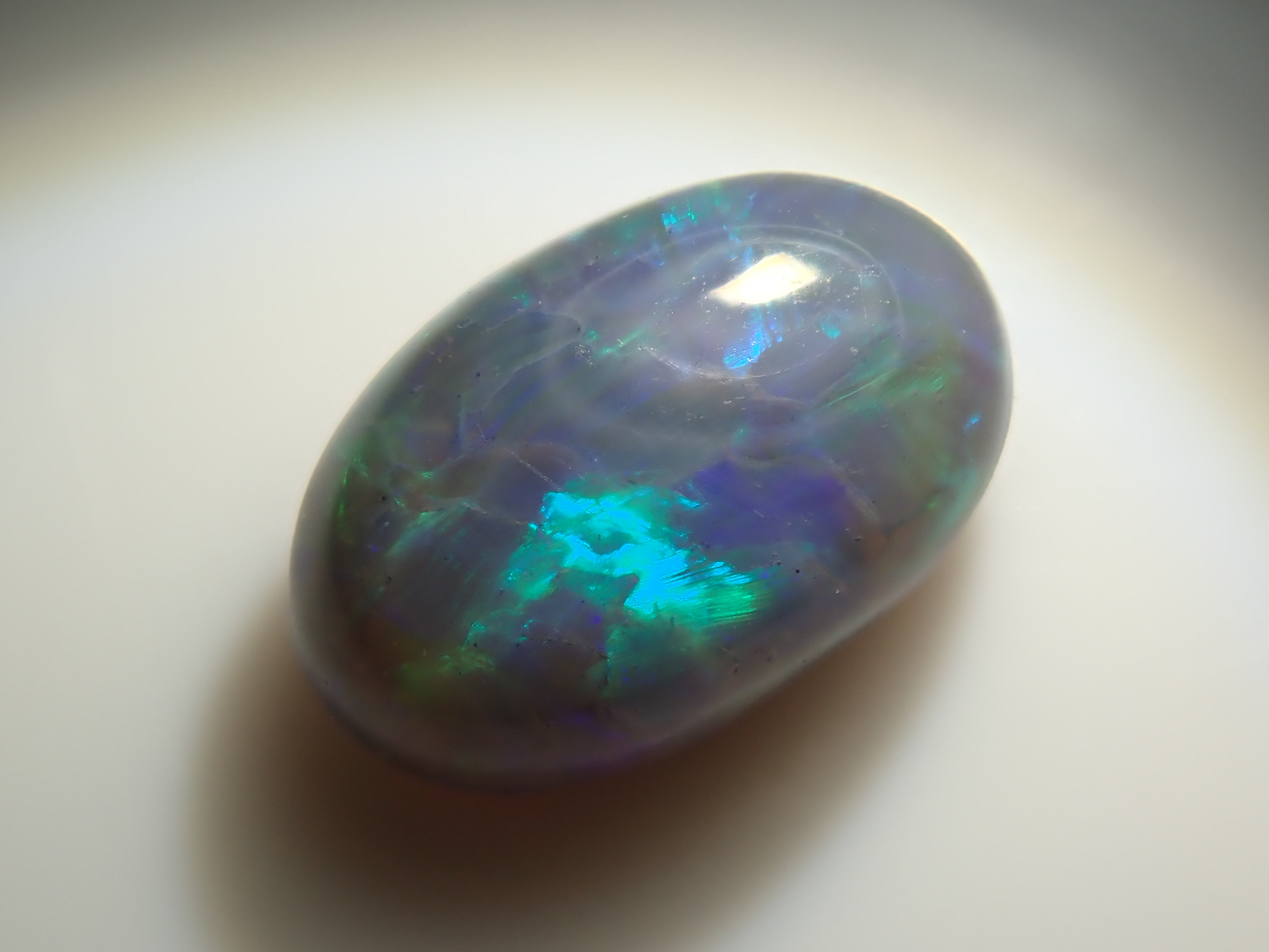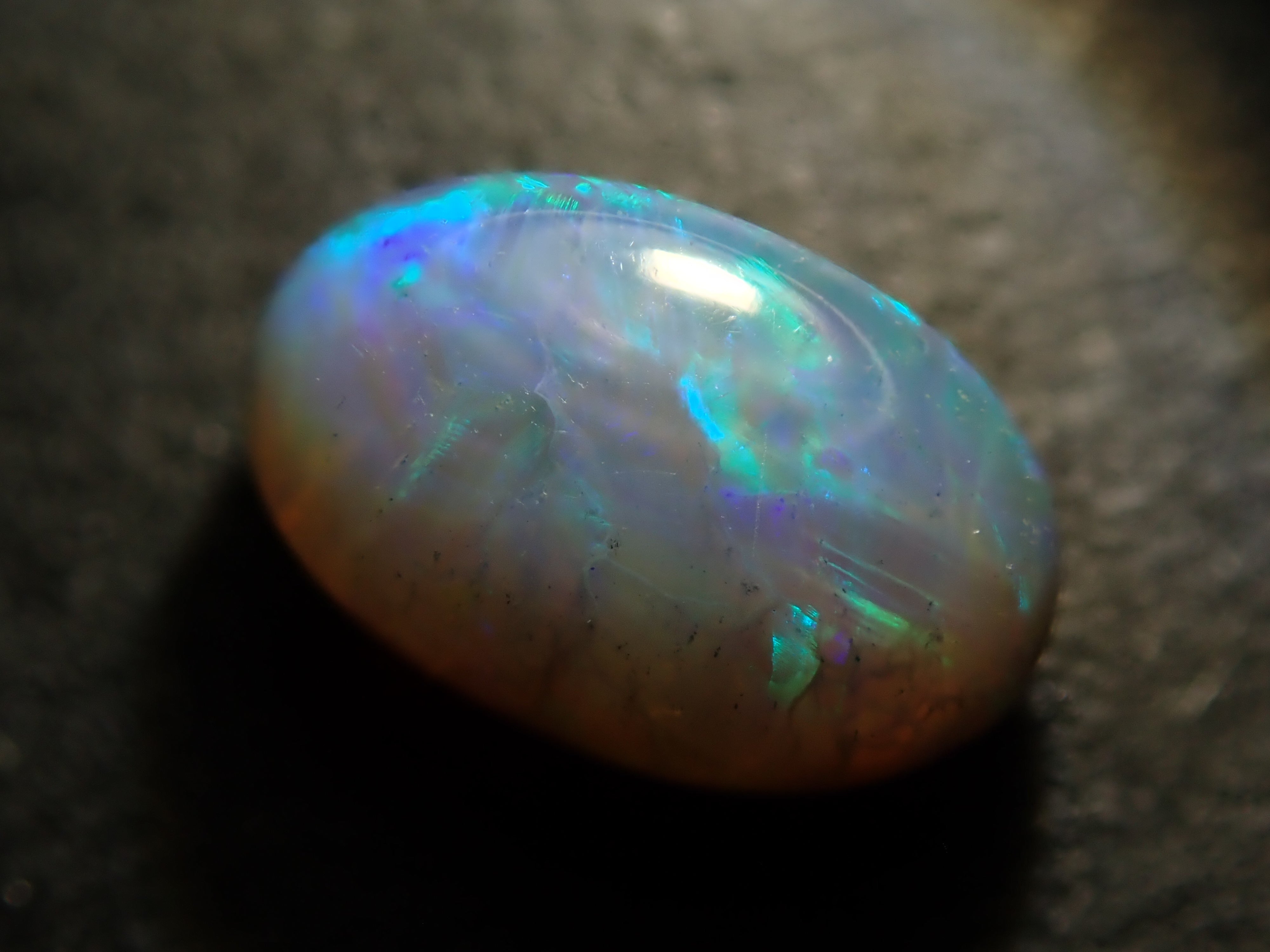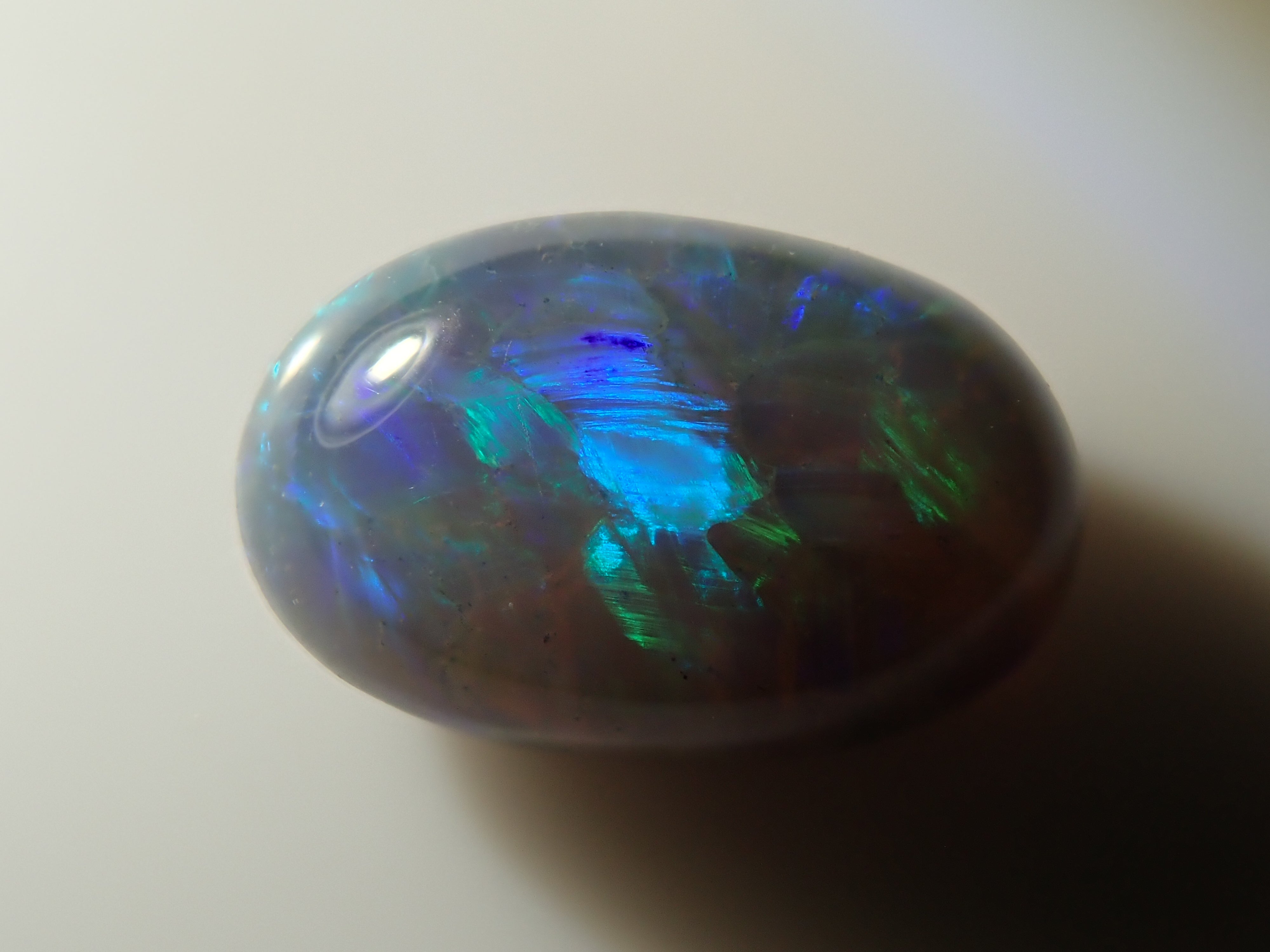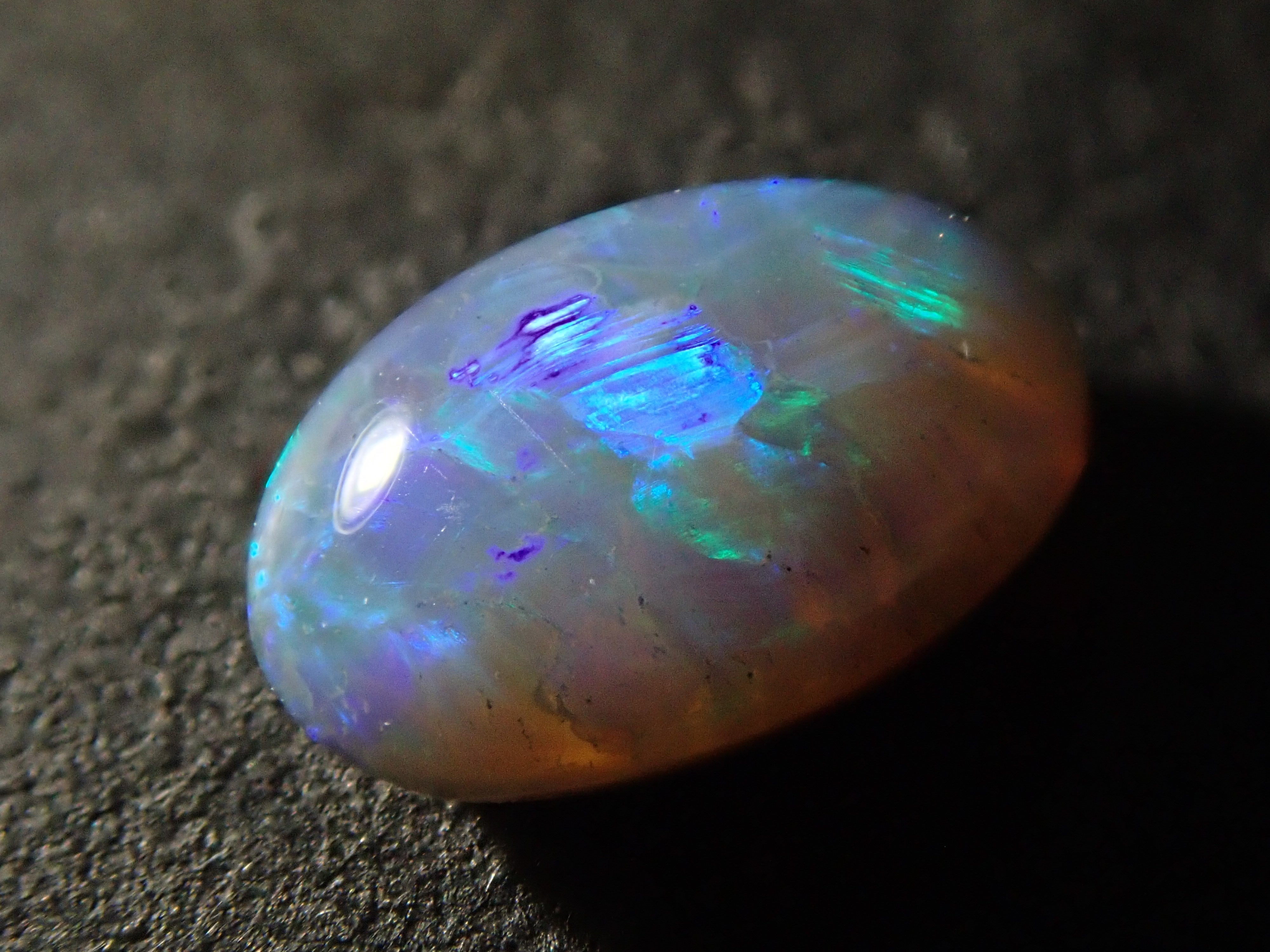 蛋白石是一種閃爍著彩虹色光芒的寶石。蛋白石有好幾種類型,但其中,黑蛋白石漆黑的黑暗中搖曳的紅色火焰美得讓人無法移開目光。底色包括黑色、藍色和灰色。照片是使用筆燈拍攝的。