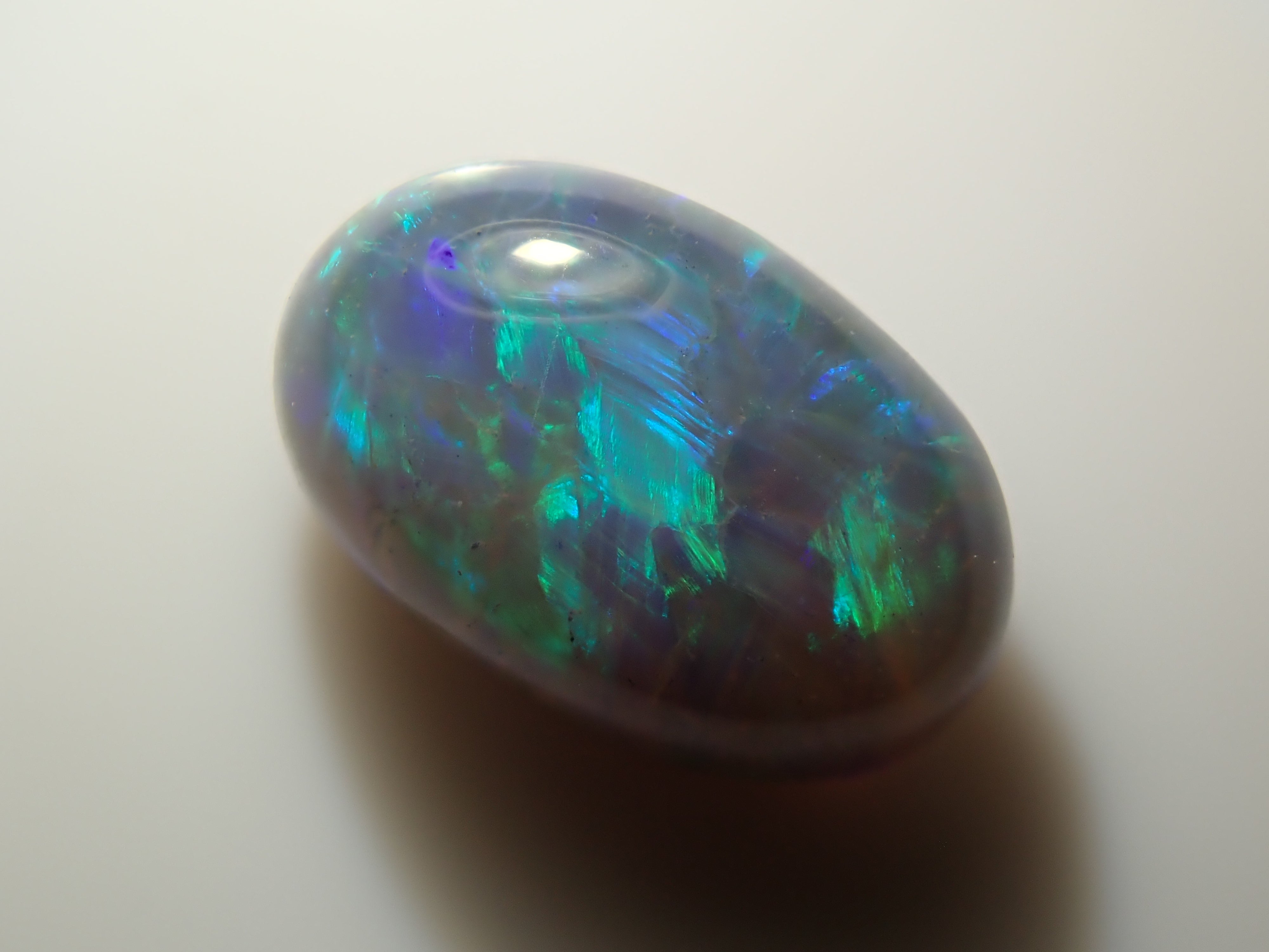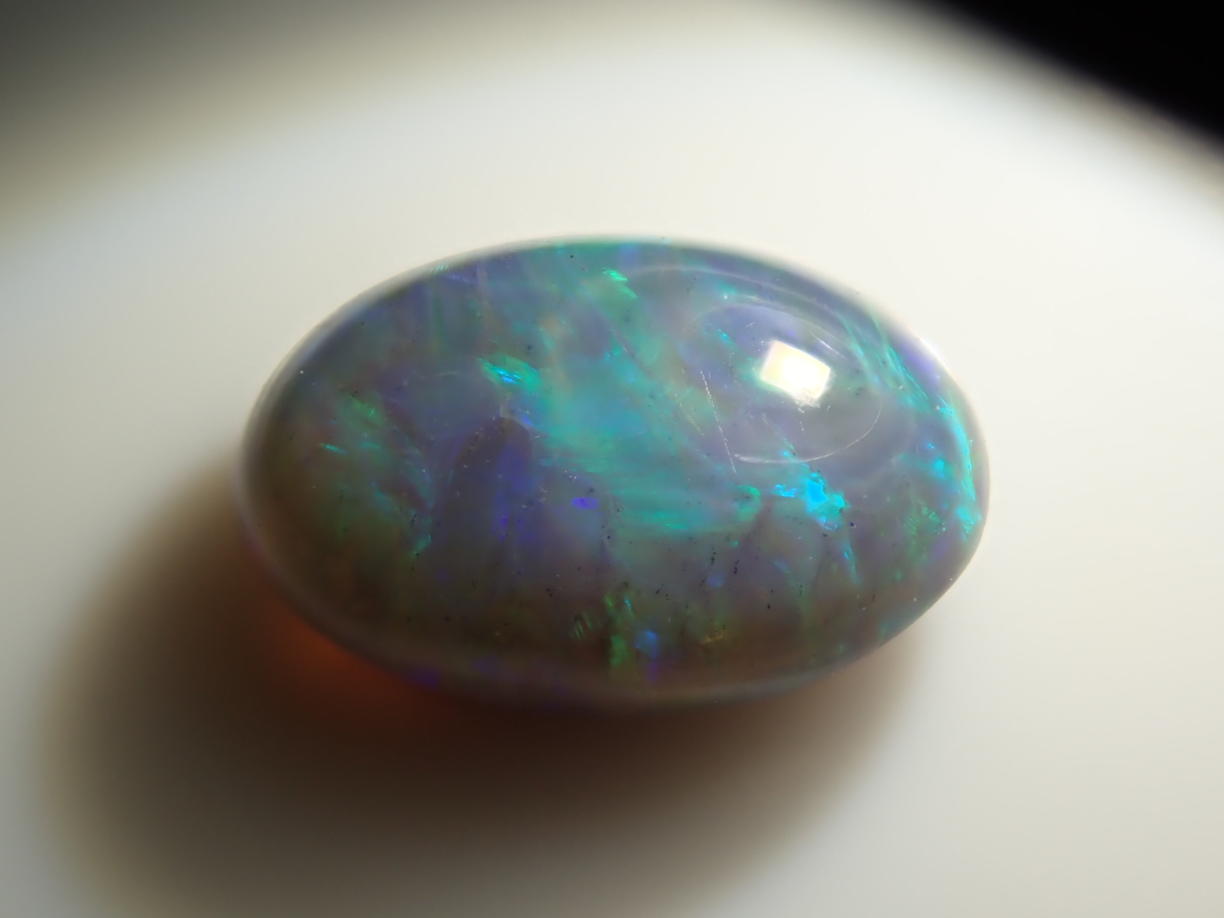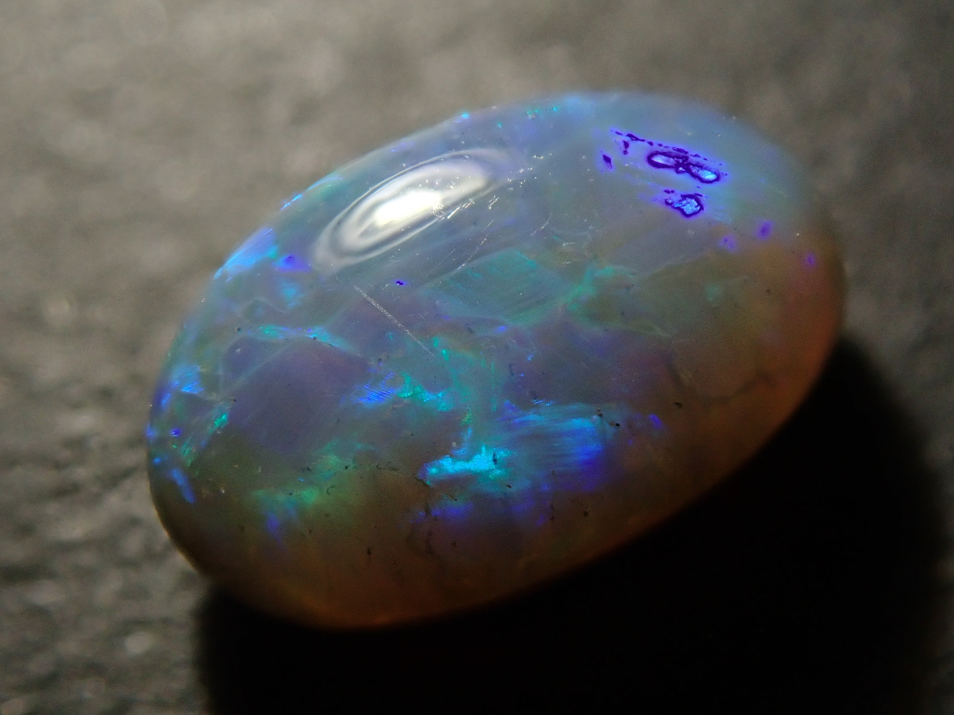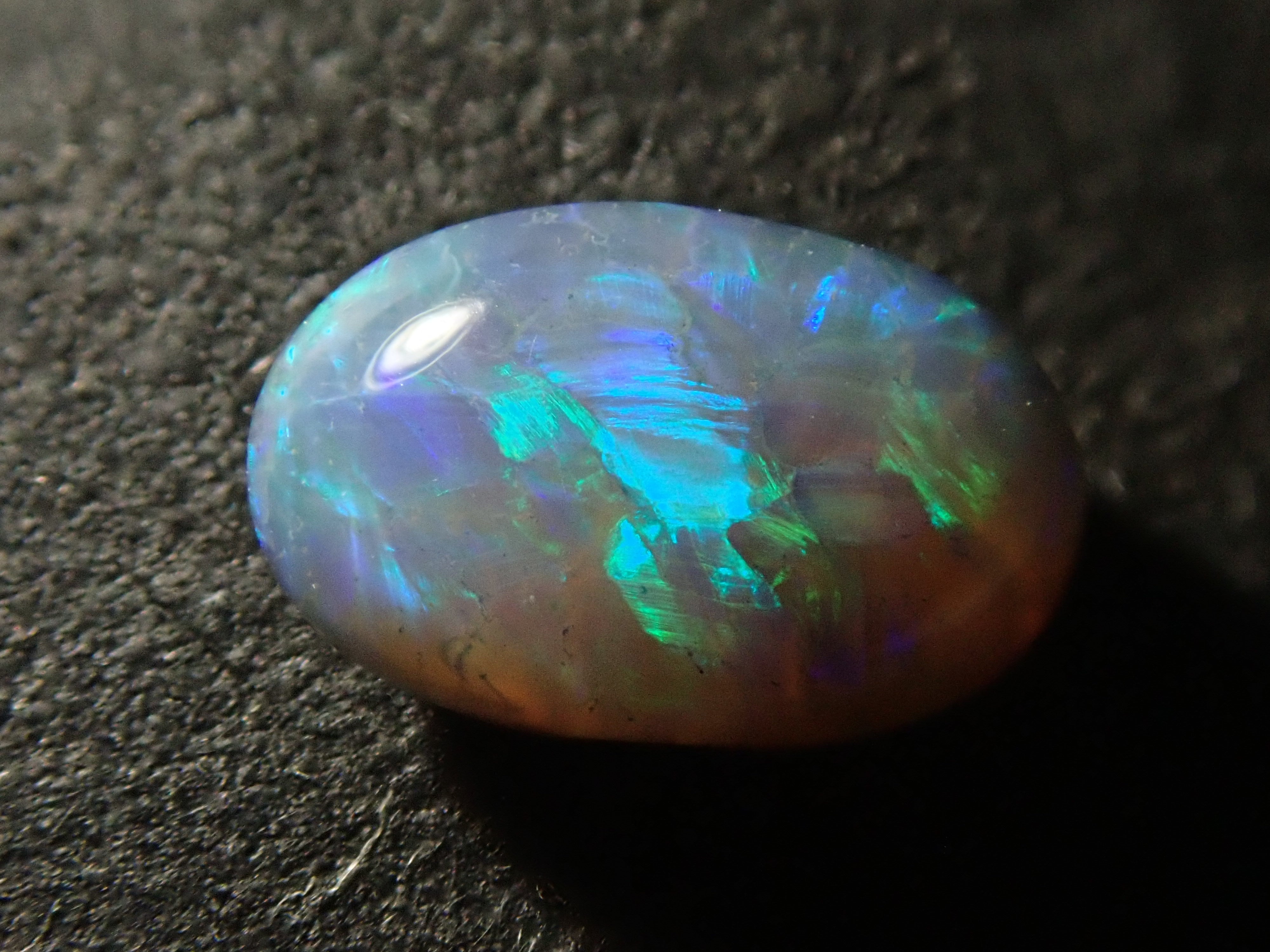 蛋白石是一種閃爍著彩虹色光芒的寶石。蛋白石有好幾種類型,但其中,黑蛋白石漆黑的黑暗中搖曳的紅色火焰美得讓人無法移開目光。底色包括黑色、藍色和灰色。照片是使用筆燈拍攝的。