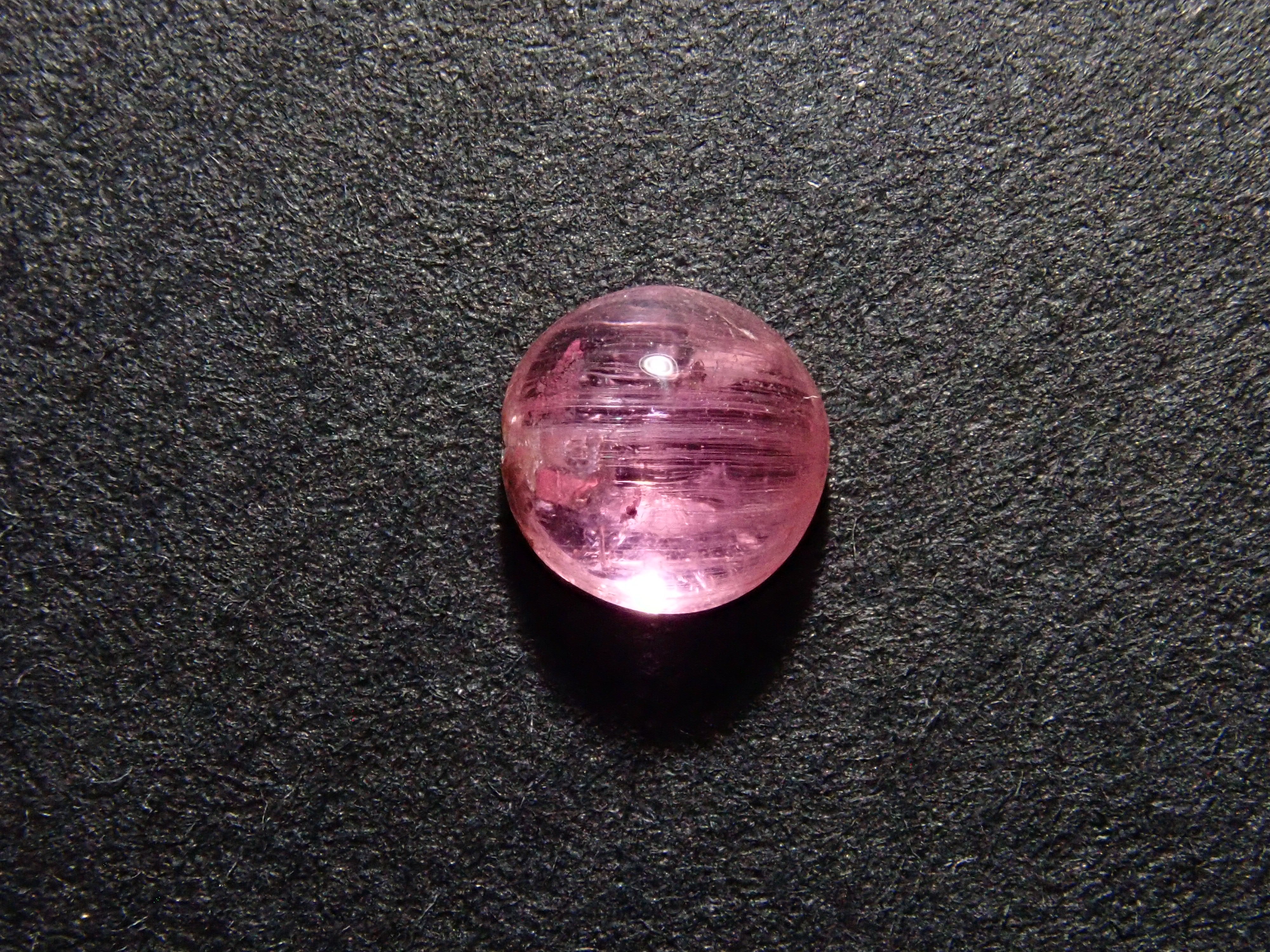 稀有石頭,綠色鋰長石。它是一種新寶石,直到 2003 年才被正式認可為礦物。它是一種具有迷人的亮粉色的寶石,在美國礦物展上作為新礦物被介紹,並迅速流行起來。這是可以看到貓眼效果的類型。筆燈用於攝影。石頭的背面基本上是未拋光的。