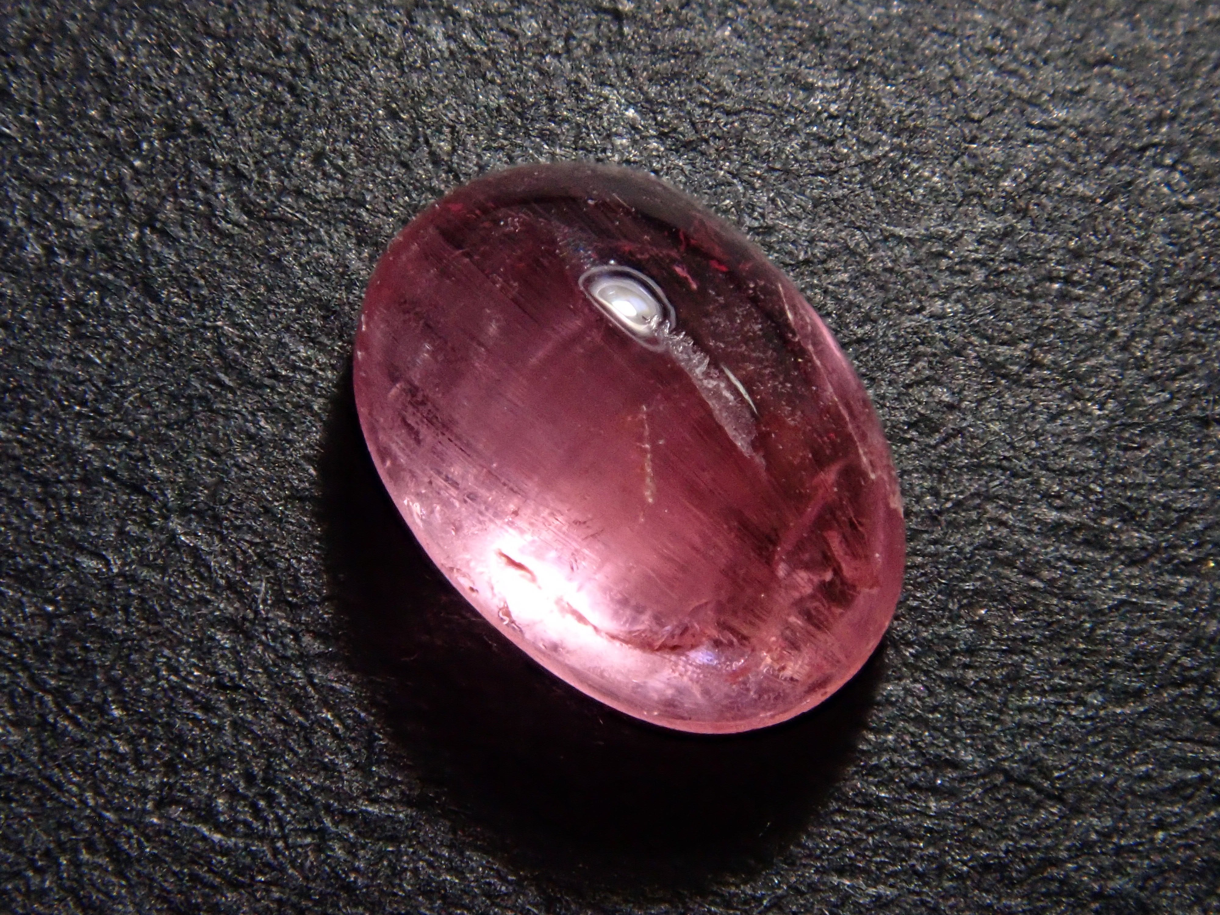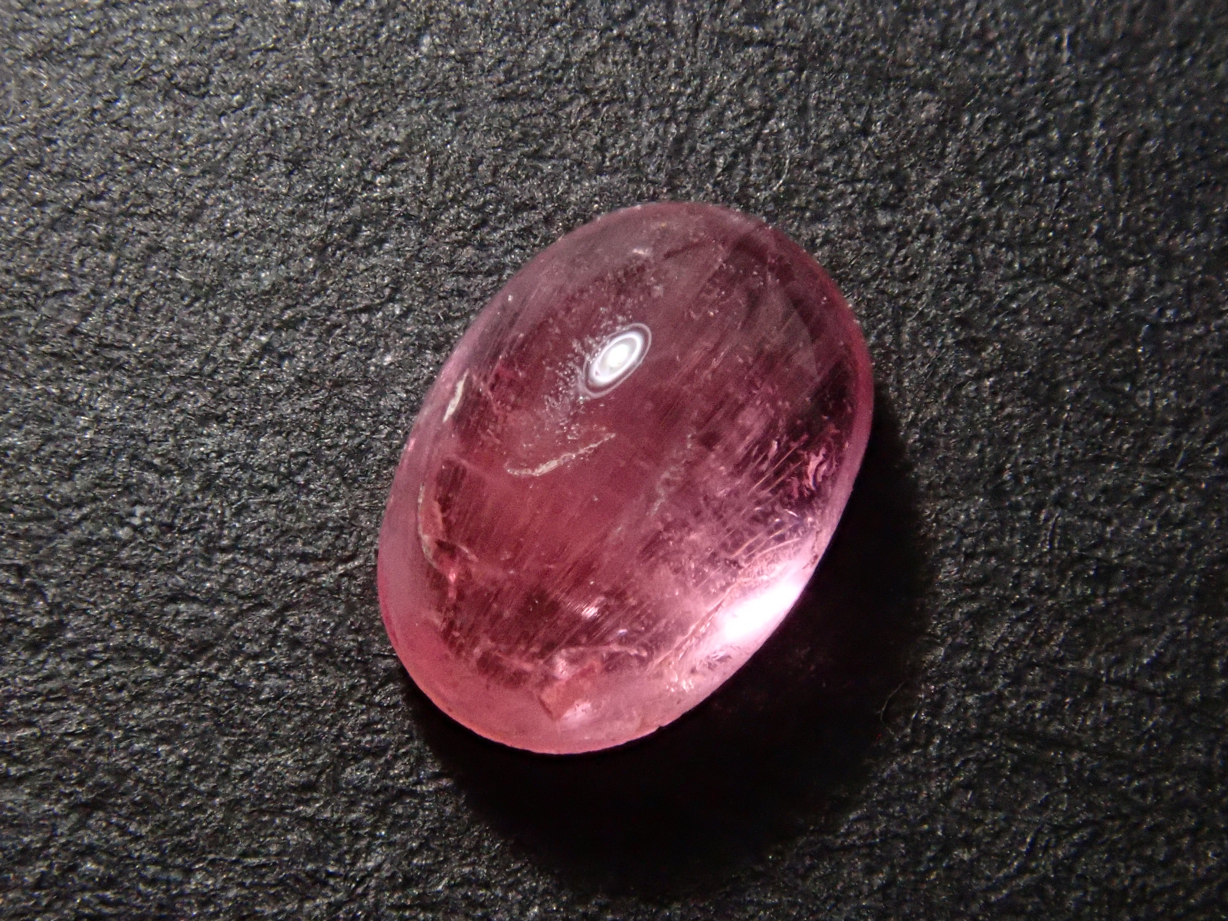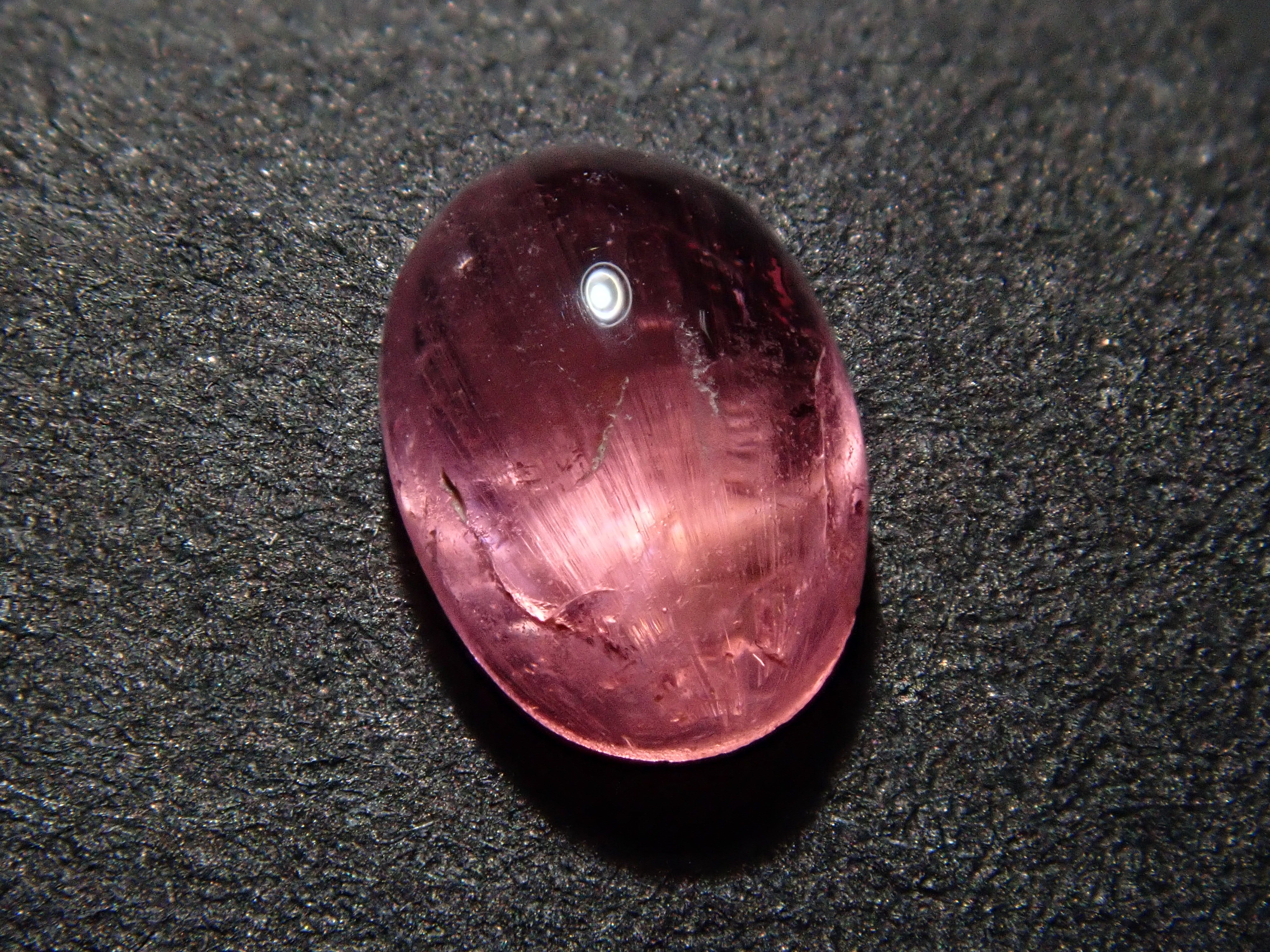 稀有石頭,綠色鋰長石。它是一種新寶石,直到 2003 年才被正式認可為礦物。它是一種具有迷人的亮粉色的寶石,在美國礦物展上作為新礦物被介紹,並迅速流行起來。這是可以看到貓眼效果的類型。筆燈用於攝影。石頭的背面基本上是未拋光的。