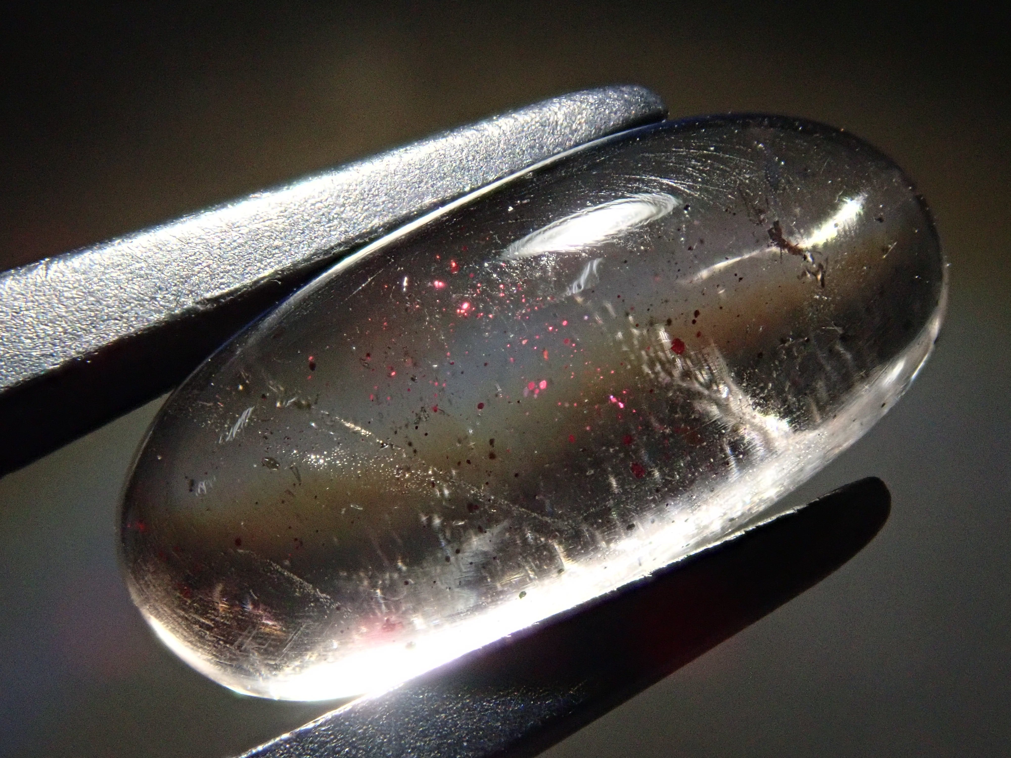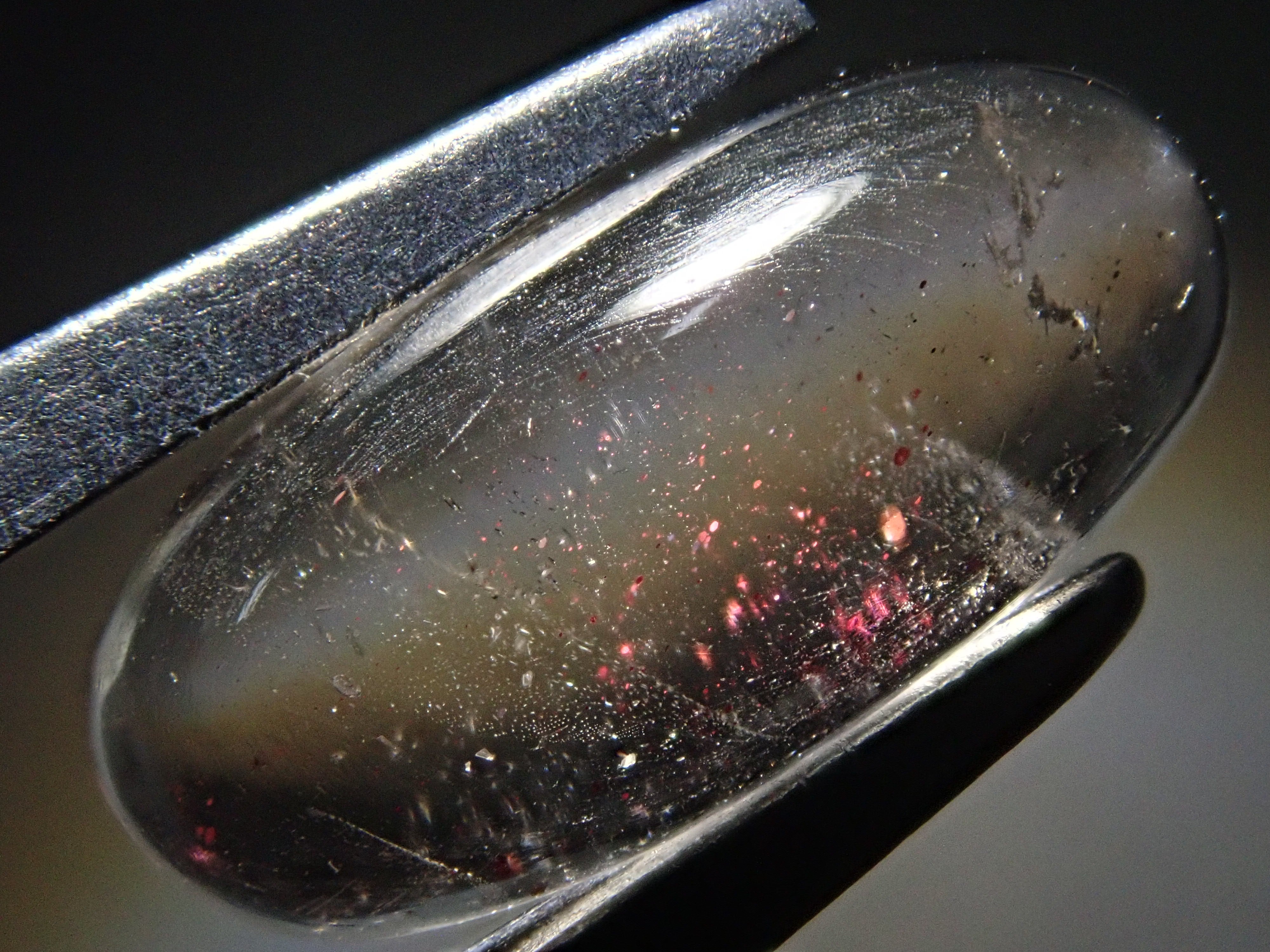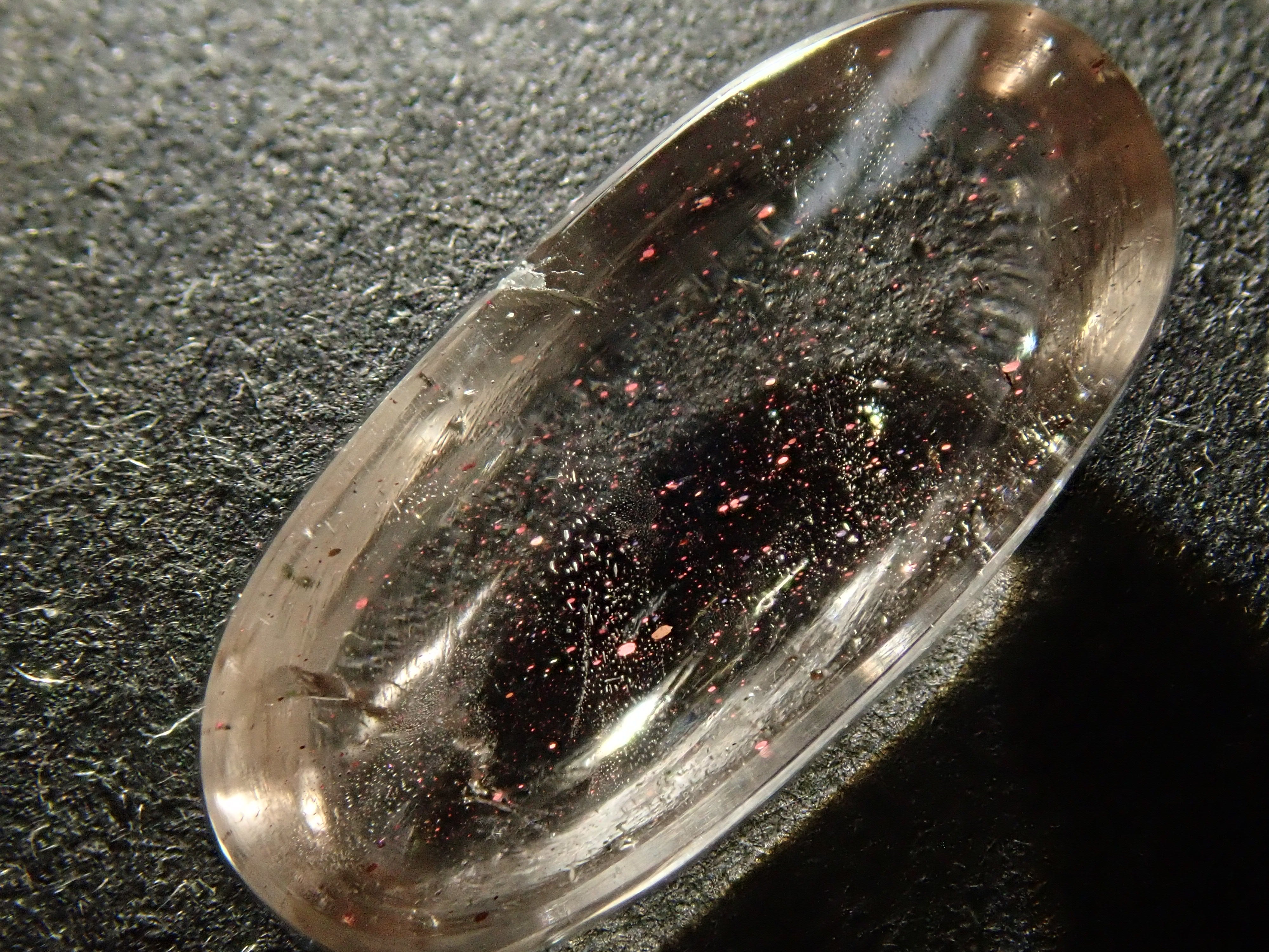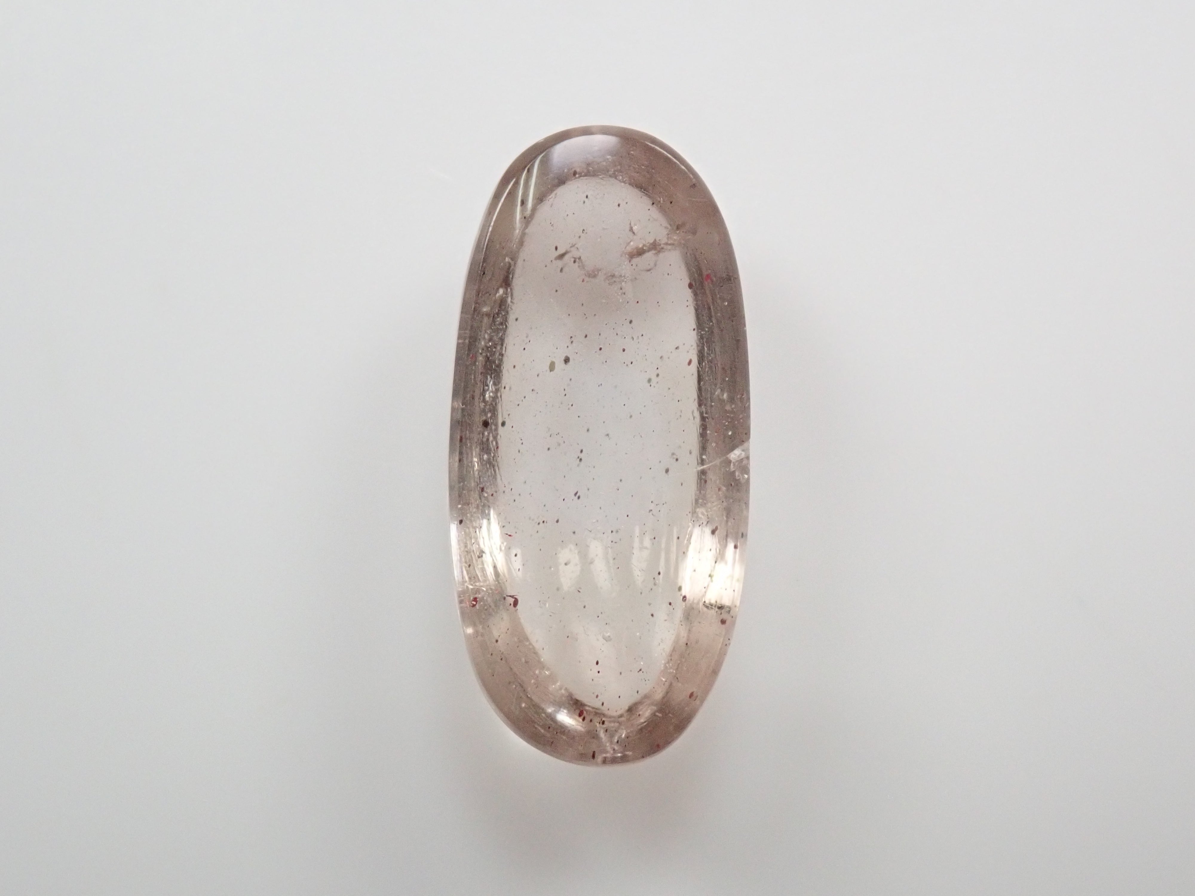 石英在日文中稱為水晶。它是一種在日本非常熟悉的石頭,但它也是一種深寶石,有紫水晶和黃水晶等多種類型。這種晶體看起來像暴風雪般的紅色花朵,被稱為小叮噹石英或粉紅火石英。為了清楚地顯示裡麵包裹體的樣子,我用了筆電筒拍照。