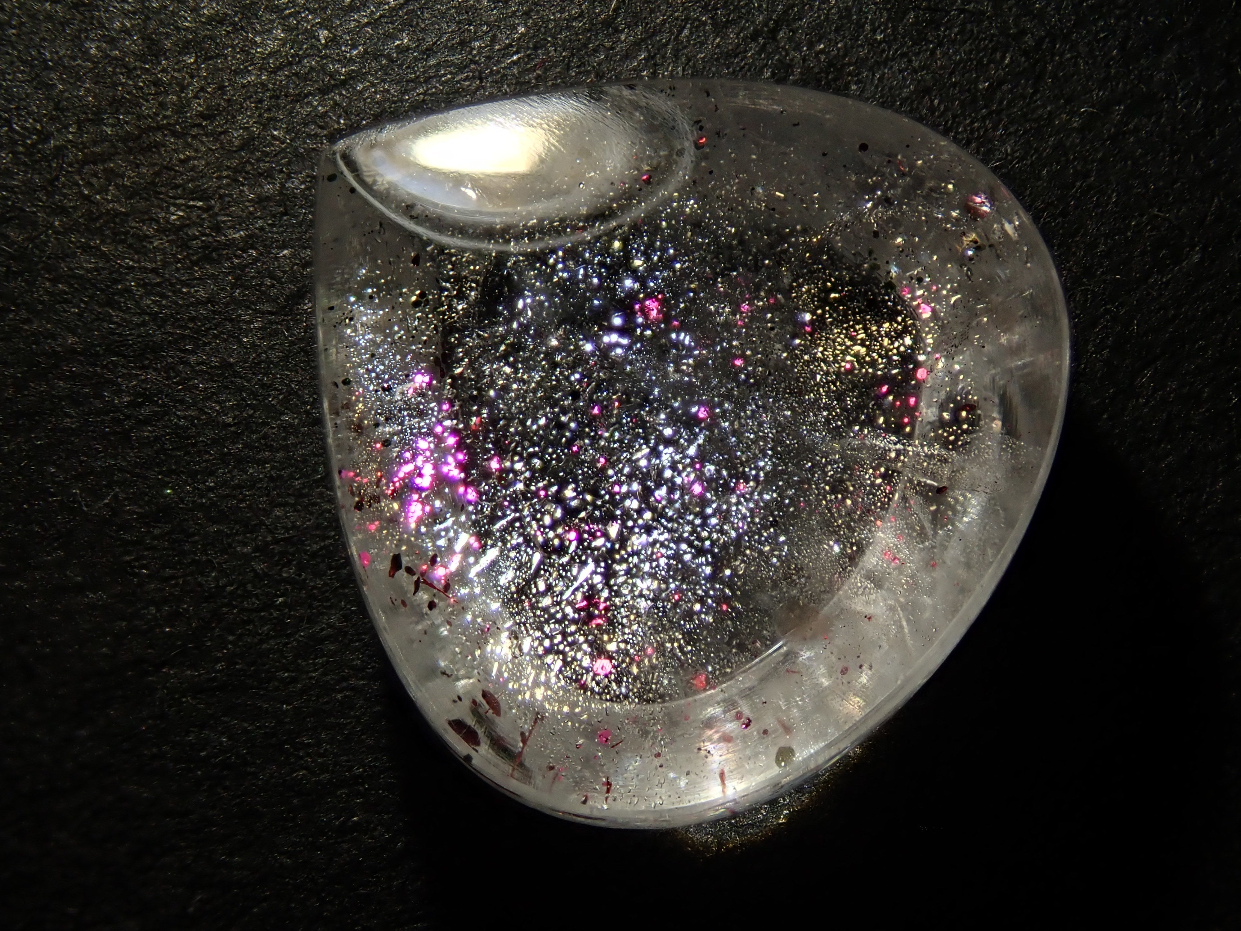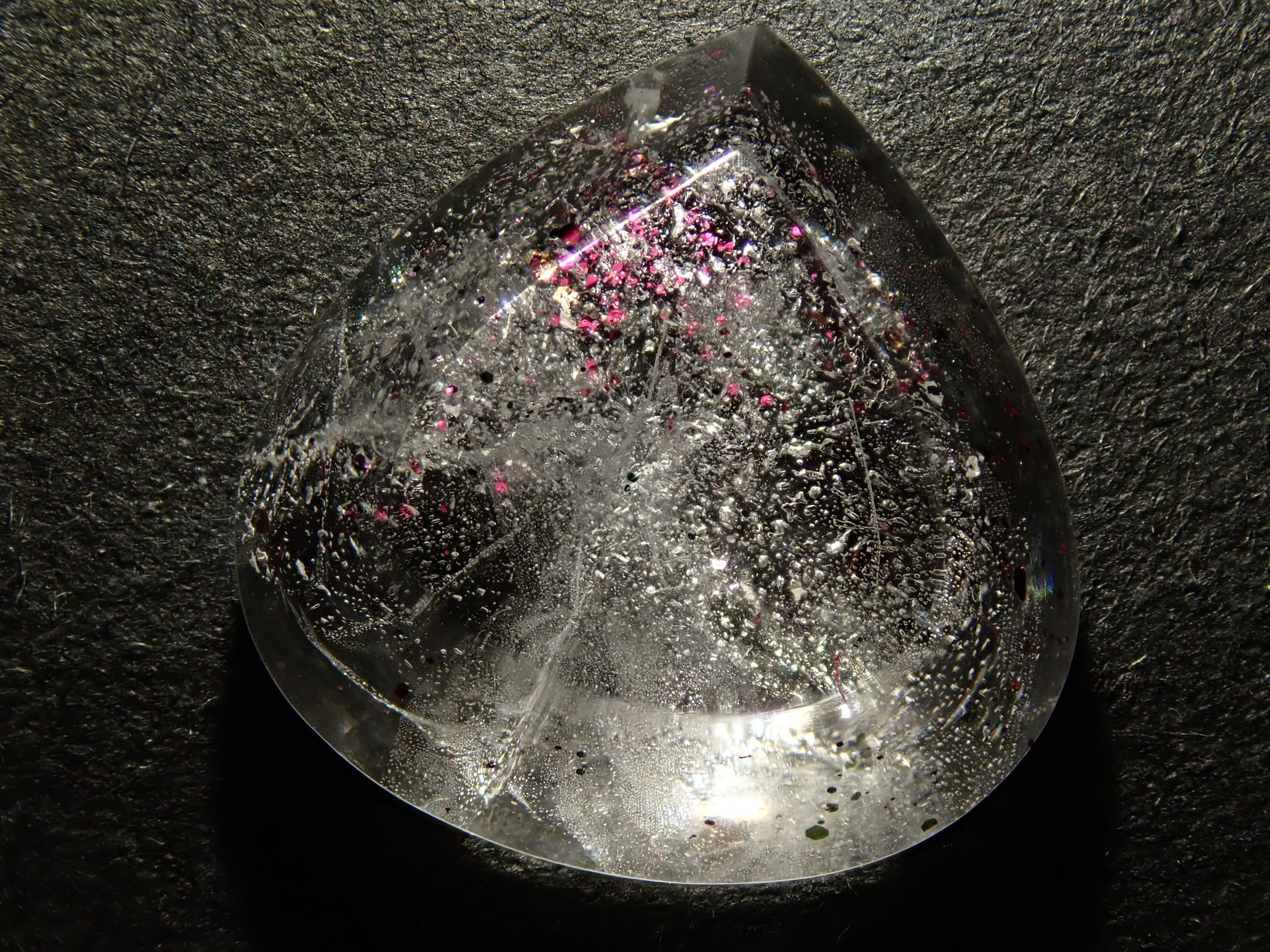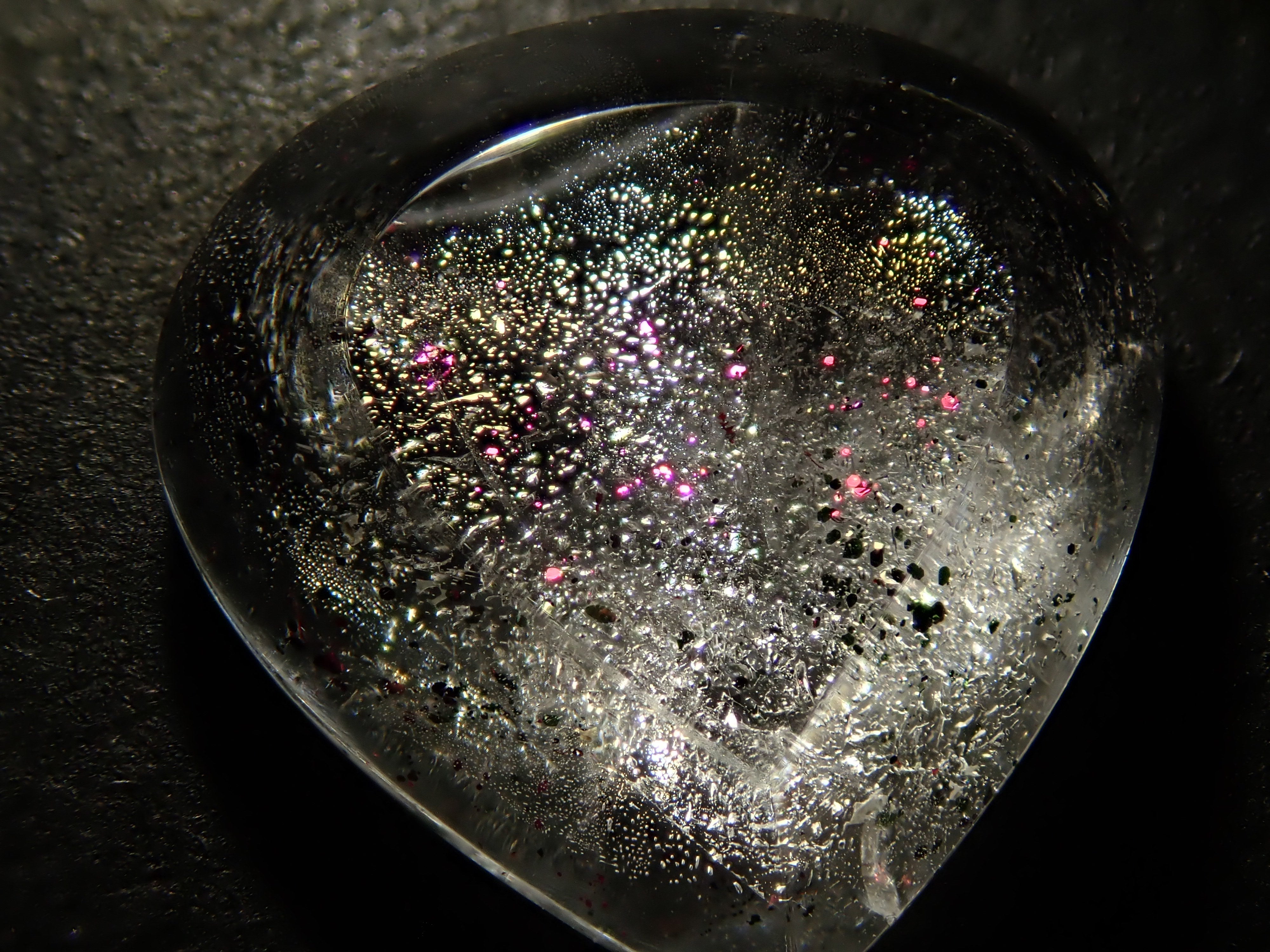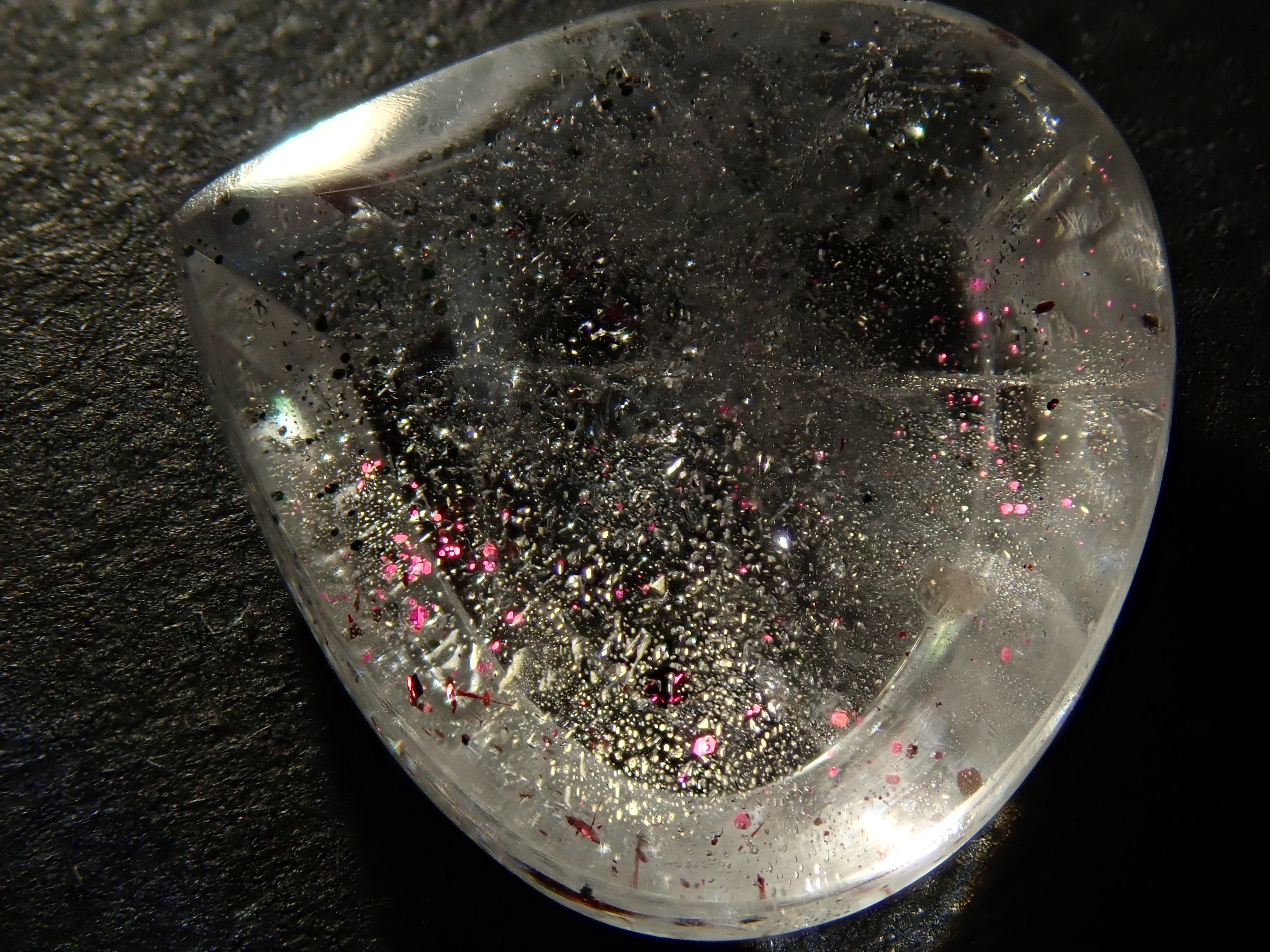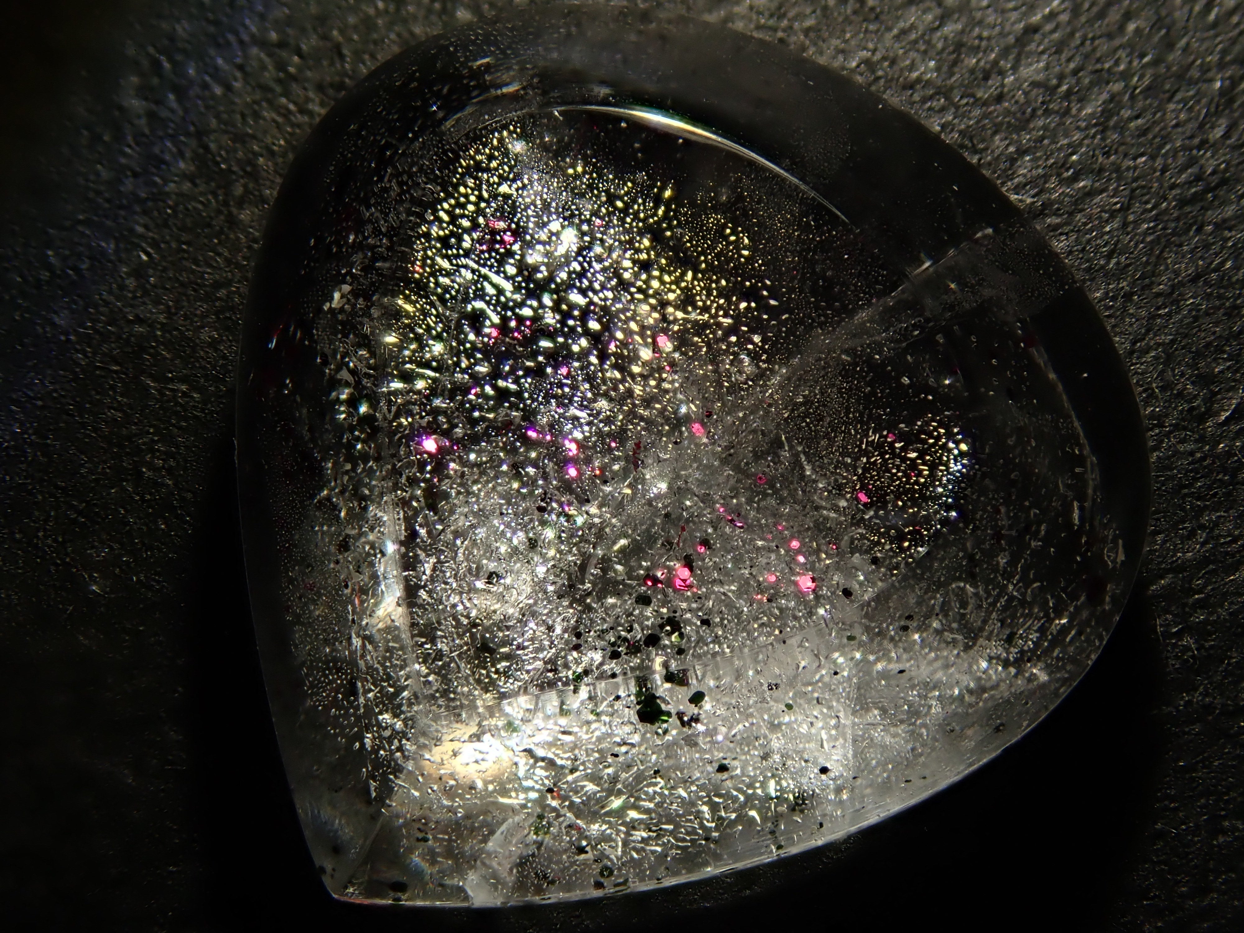 石英在日文中稱為水晶。它是一種在日本非常熟悉的石頭,但它也是一種深寶石,有紫水晶和黃水晶等多種類型。這種晶體看起來像暴風雪般的紅色花朵,被稱為小叮噹石英或粉紅火石英。為了清楚地顯示裡麵包裹體的樣子,我用了筆電筒拍照。