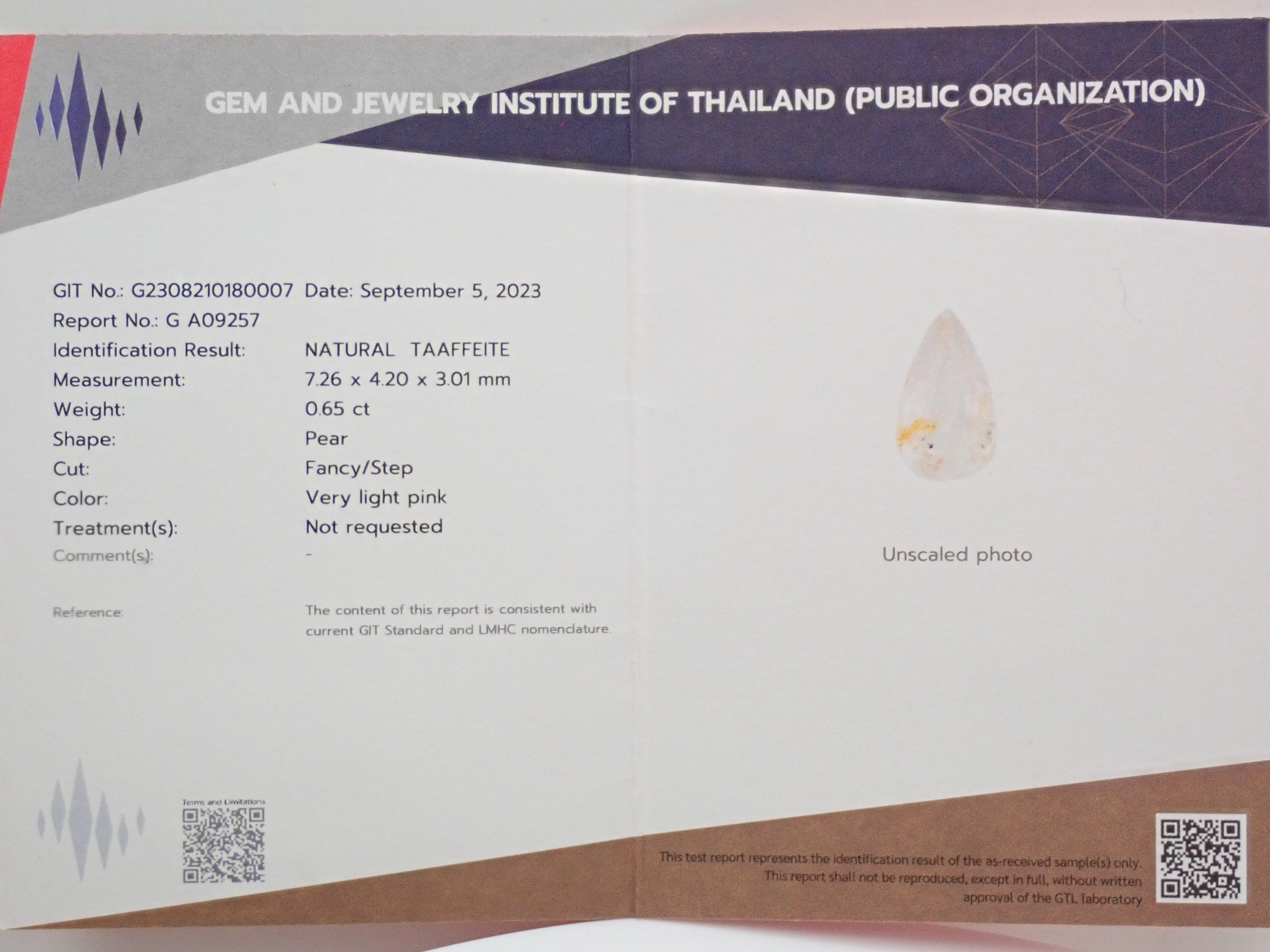 附有泰國國家寶石珠寶研究院頒發的鑑定機構GIT的鑑定證書。產自緬甸抹谷的塔菲石。
