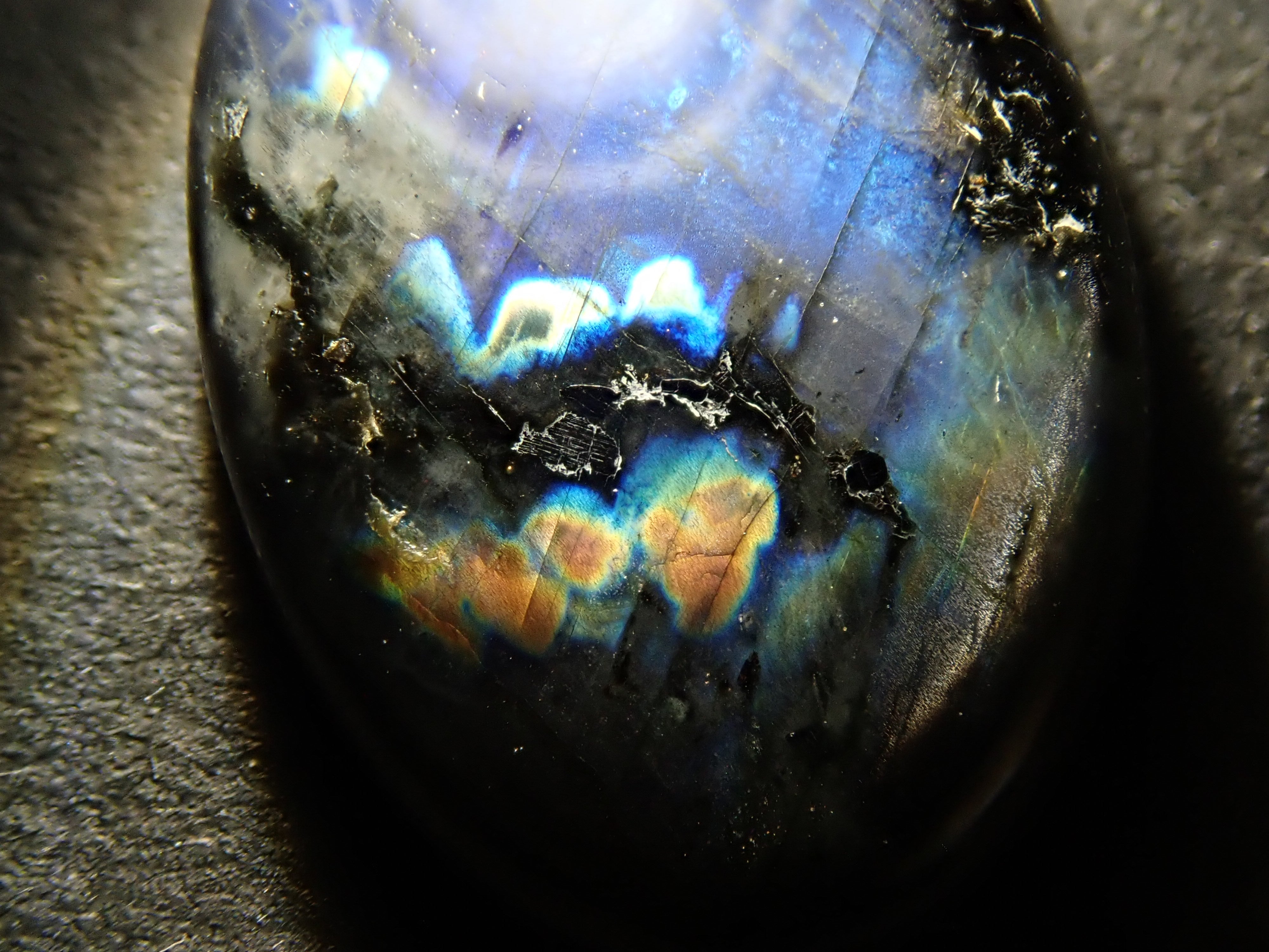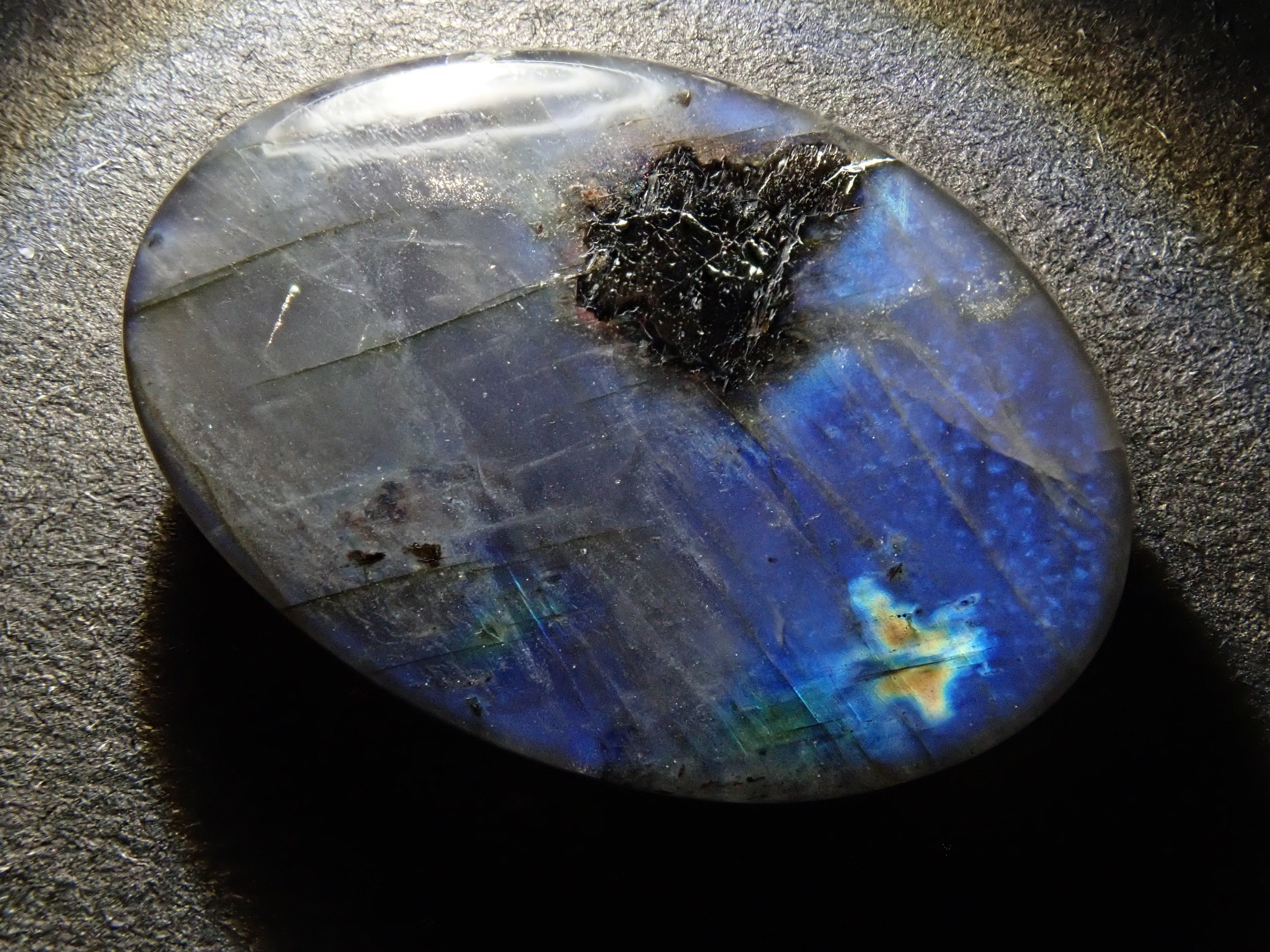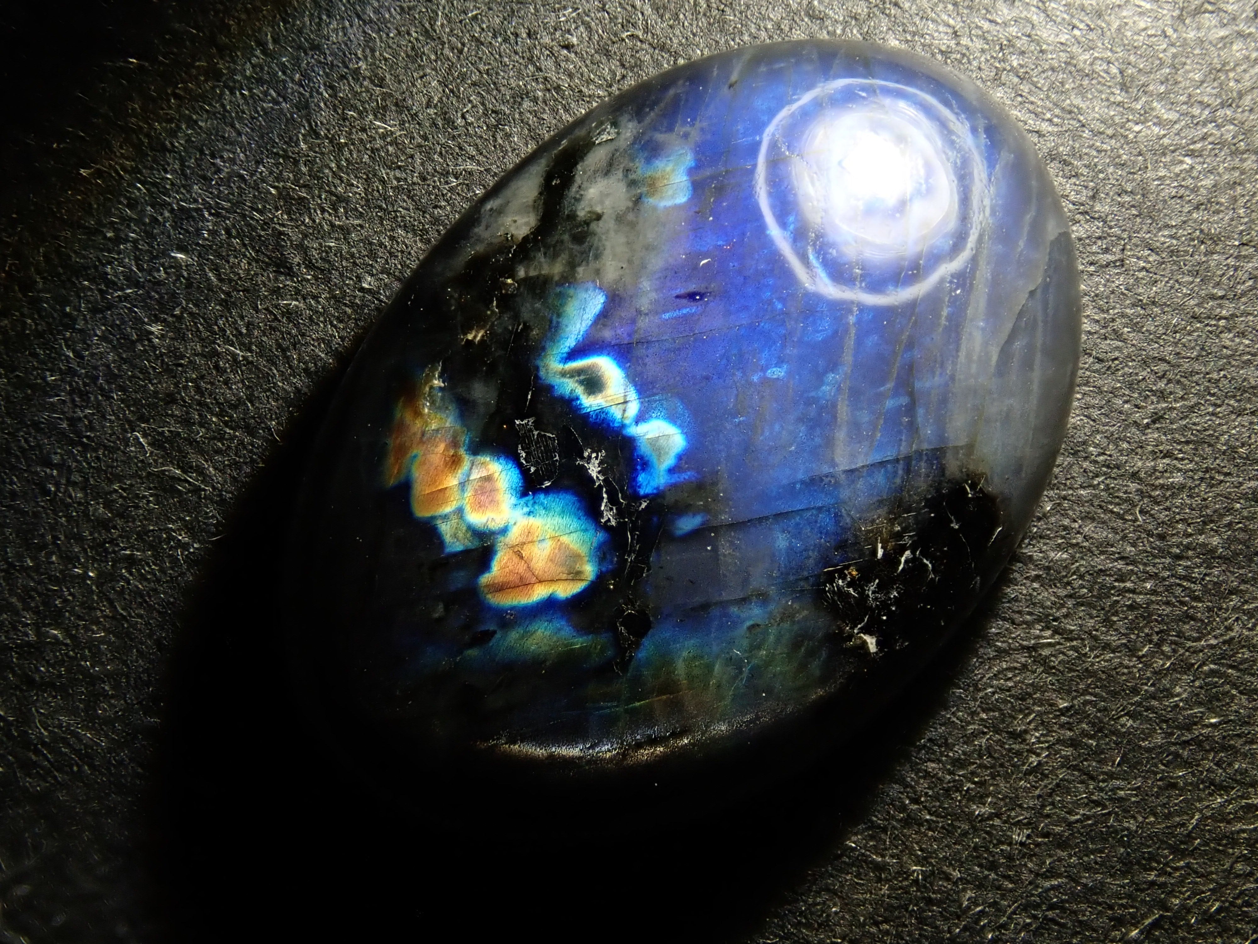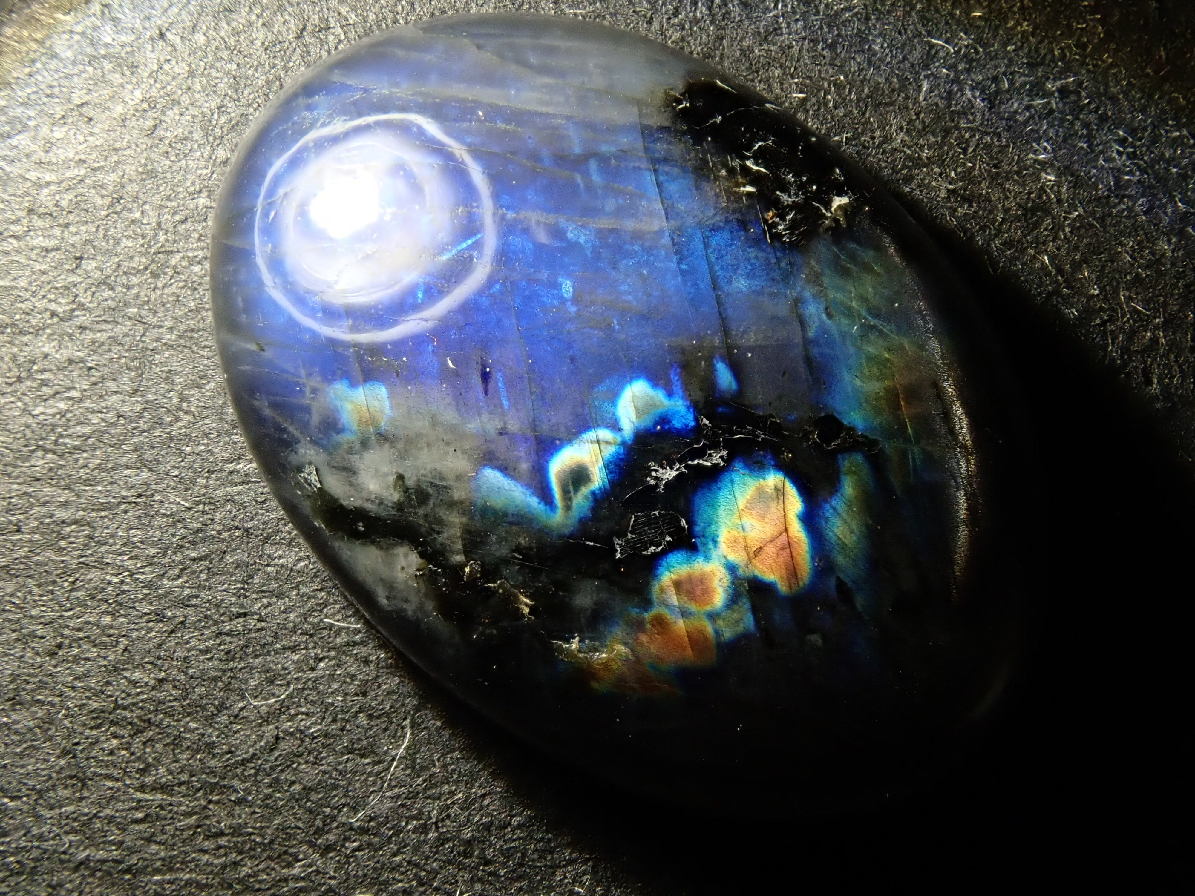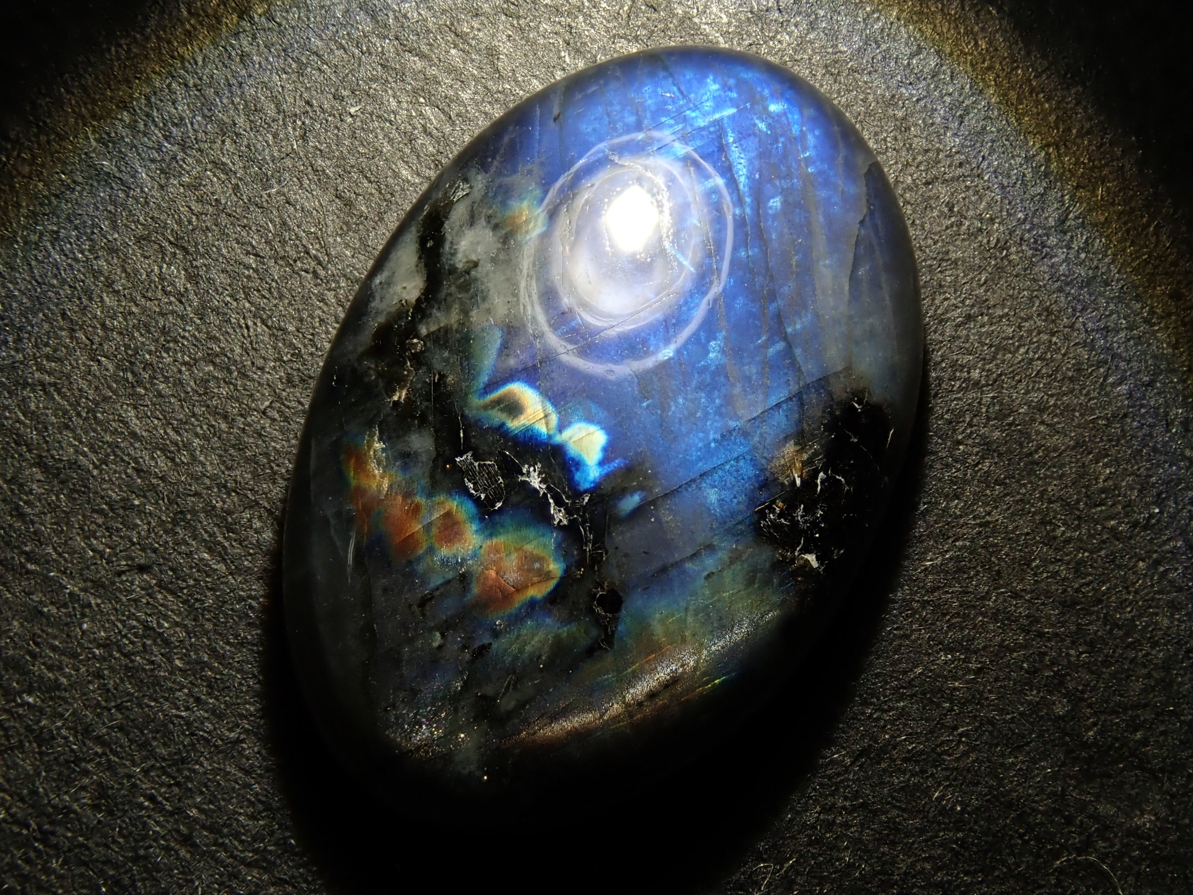 這種蓬鬆的拉長石光芒。拉長石有兩種主要類型:一種產生場景效果,另一種具有虹彩、閃閃發光的效果,稱為拉長石。享受美麗的光學效果。拉長石,也稱為光譜石,產於芬蘭,能產生美麗的閃光。