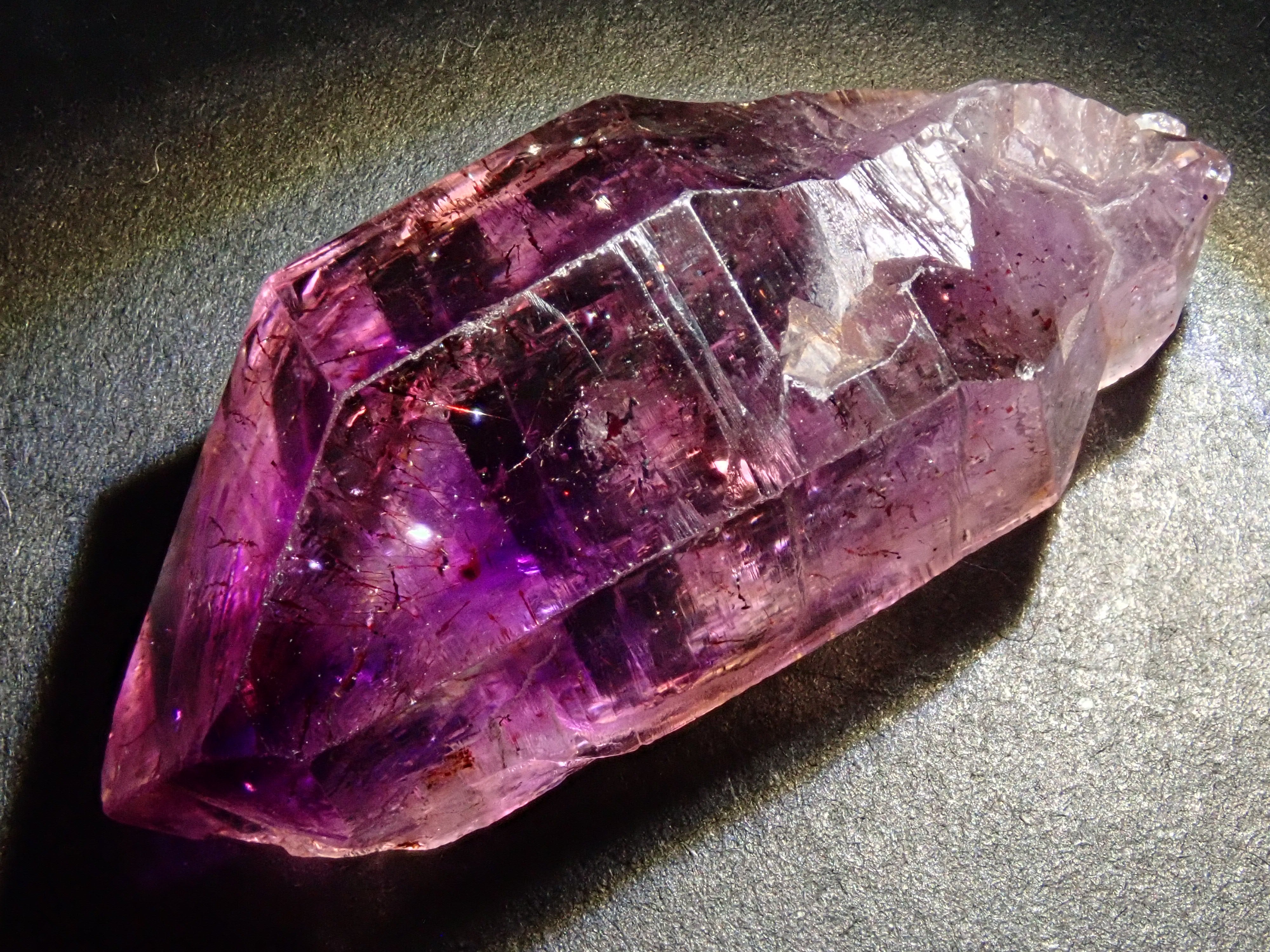 這是產自尚比亞的紫水晶,通常含有纖鐵礦和針鐵礦等礦物質,並且表面閃閃發光。