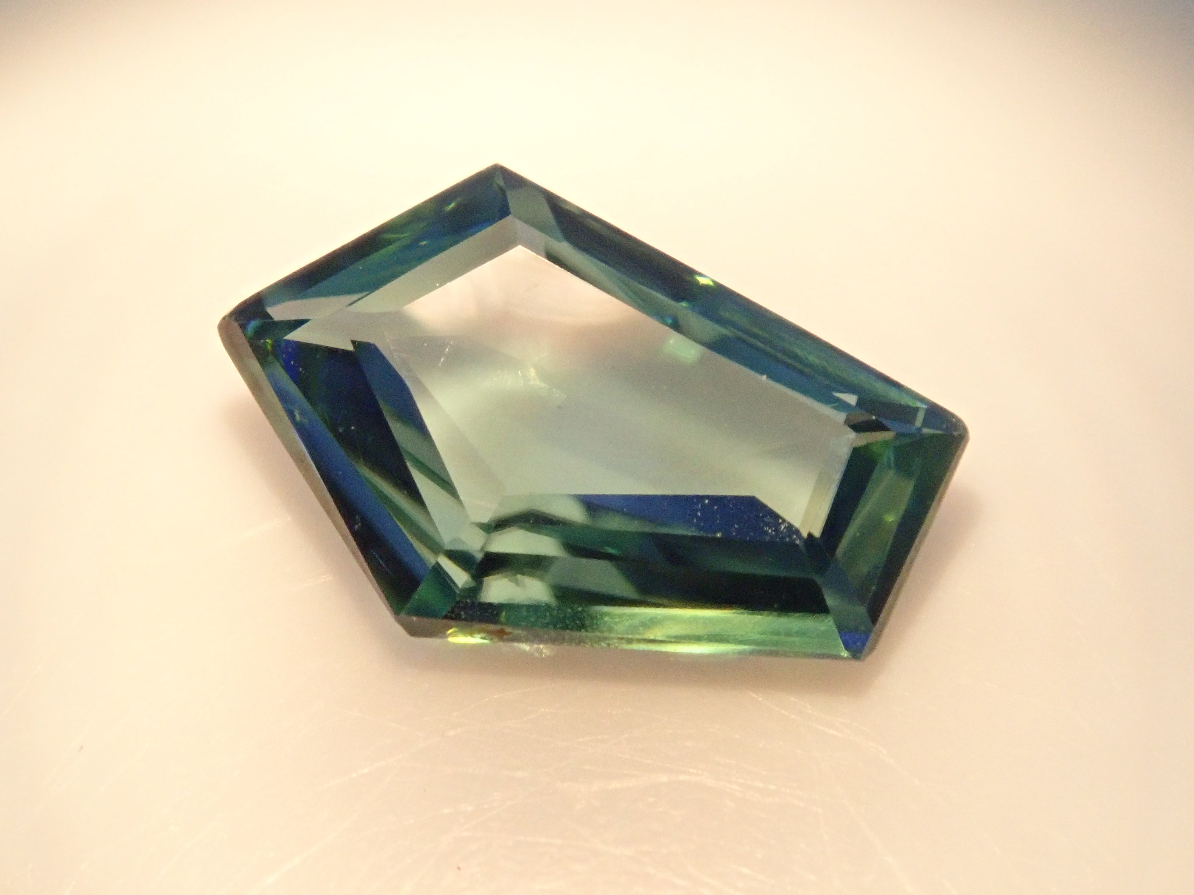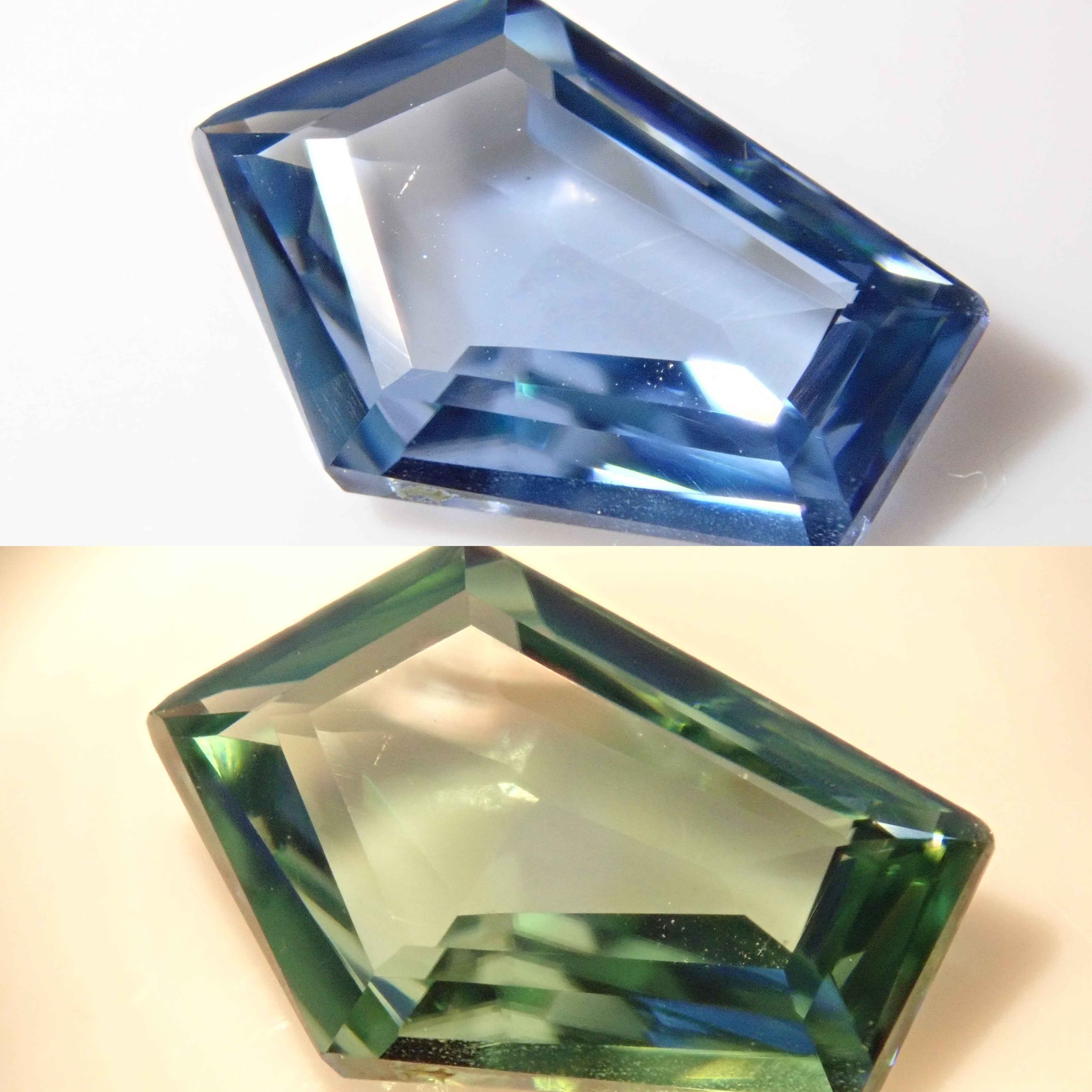 這是一種變色鋯石,也被稱為“逆變色”鋯石,其顏色會根據特定光源而變化。在室內螢光燈下,它呈現出優雅的灰藍色,但在陽光或LED燈下則會變成藍色。此外,如果用筆型手電筒(白熾燈)照射它,還能感受到柔和的綠色,因此,它是一款可以根據光線類型欣賞不同色彩的迷人寶石。