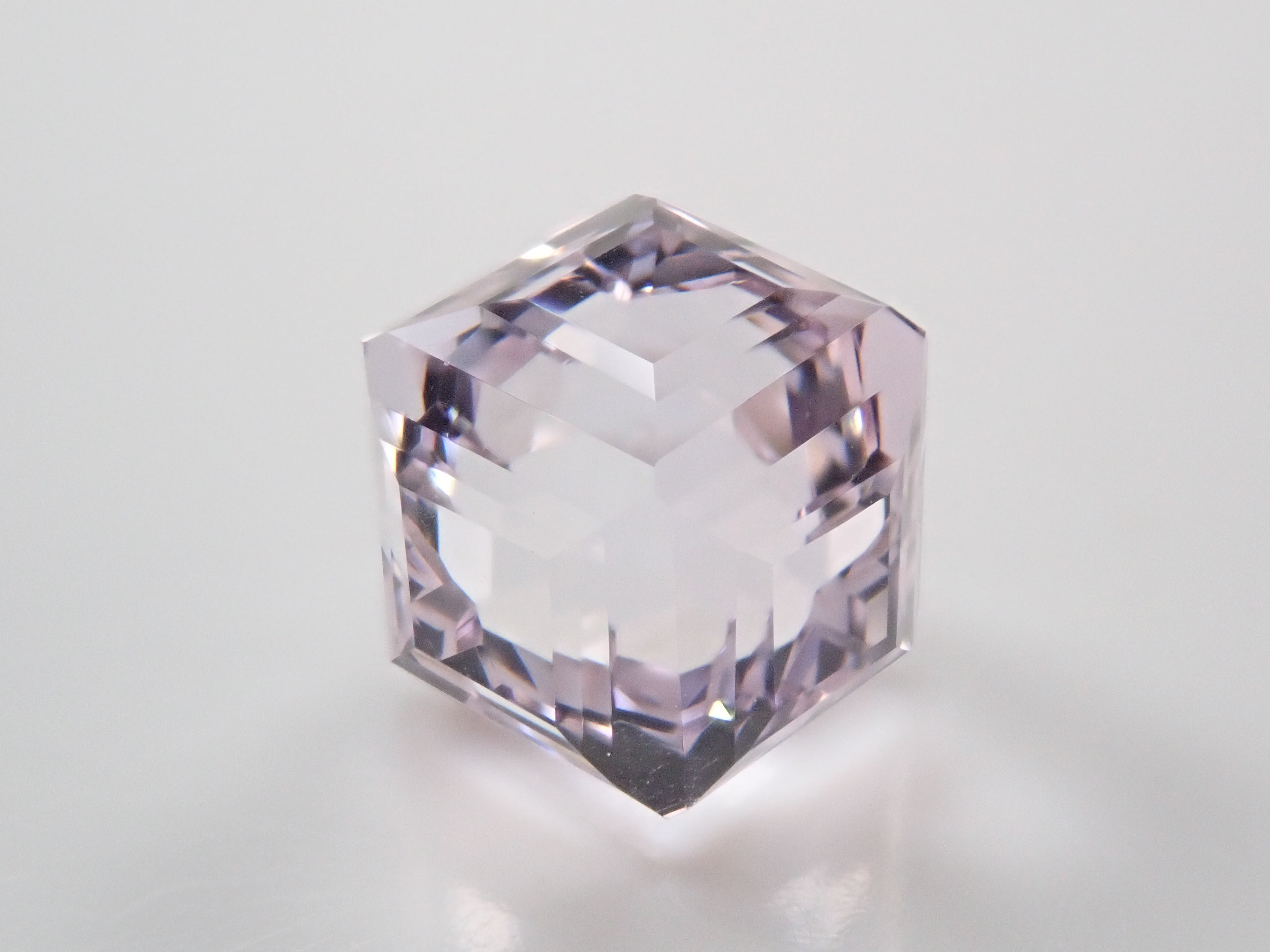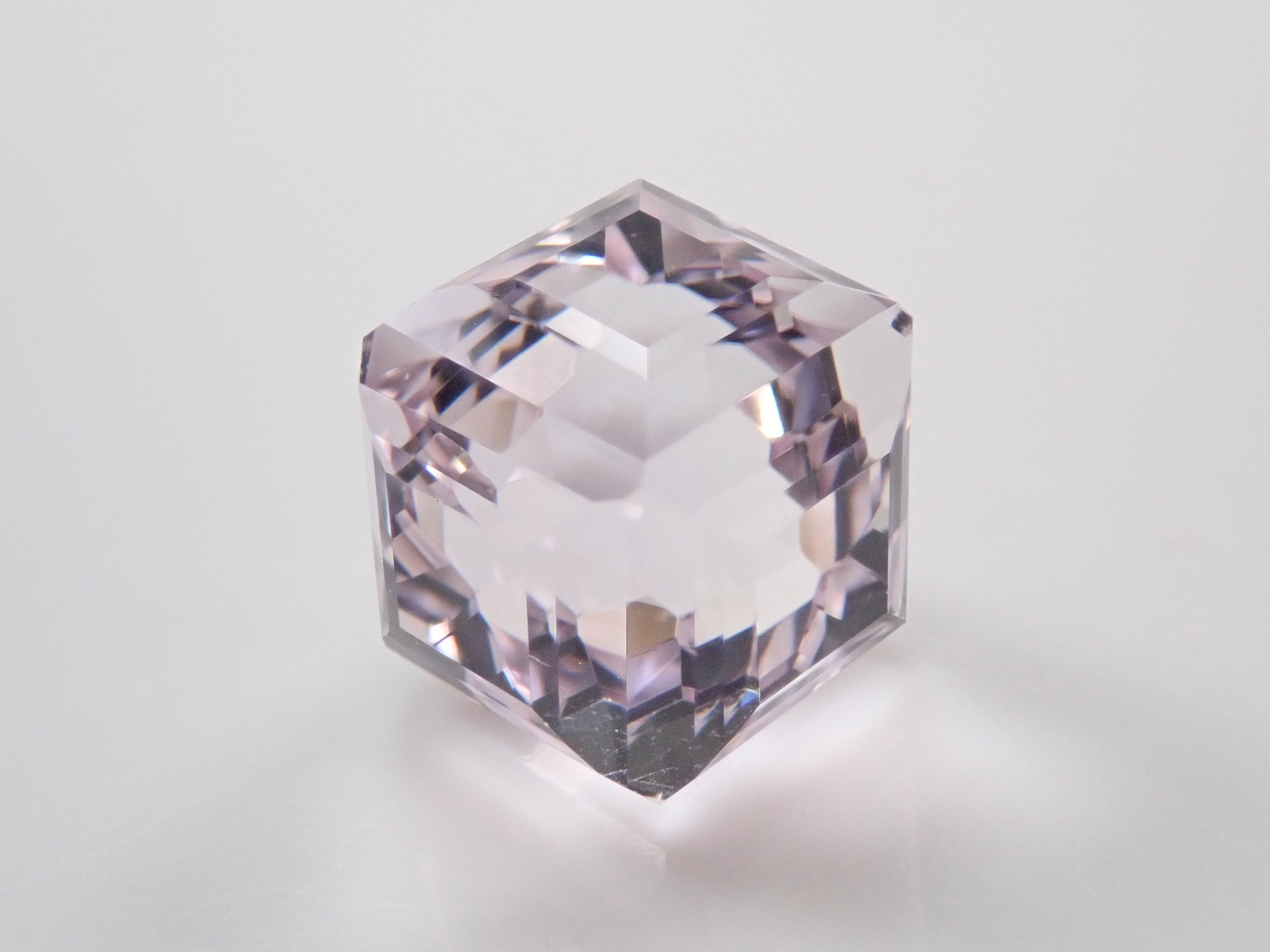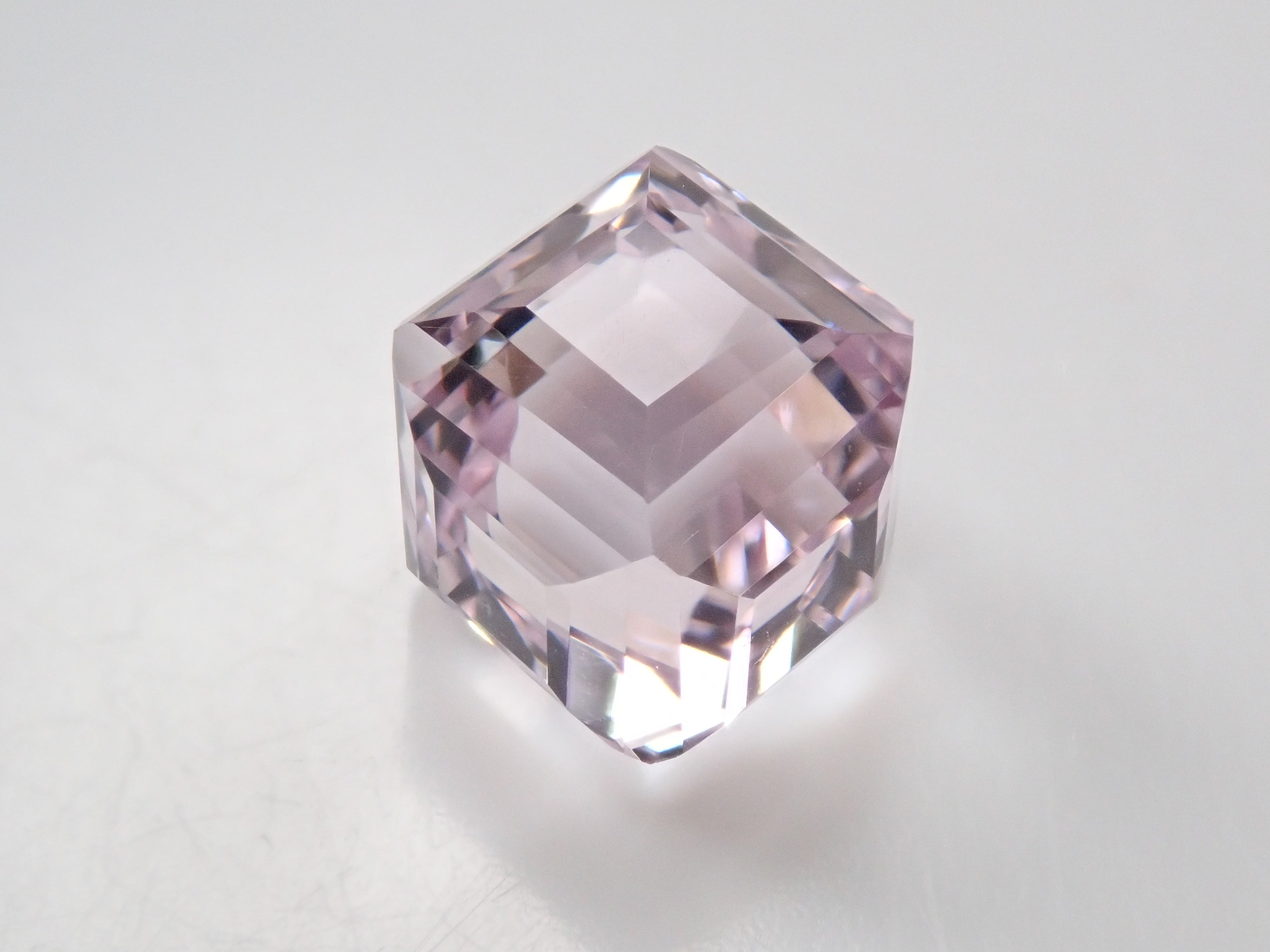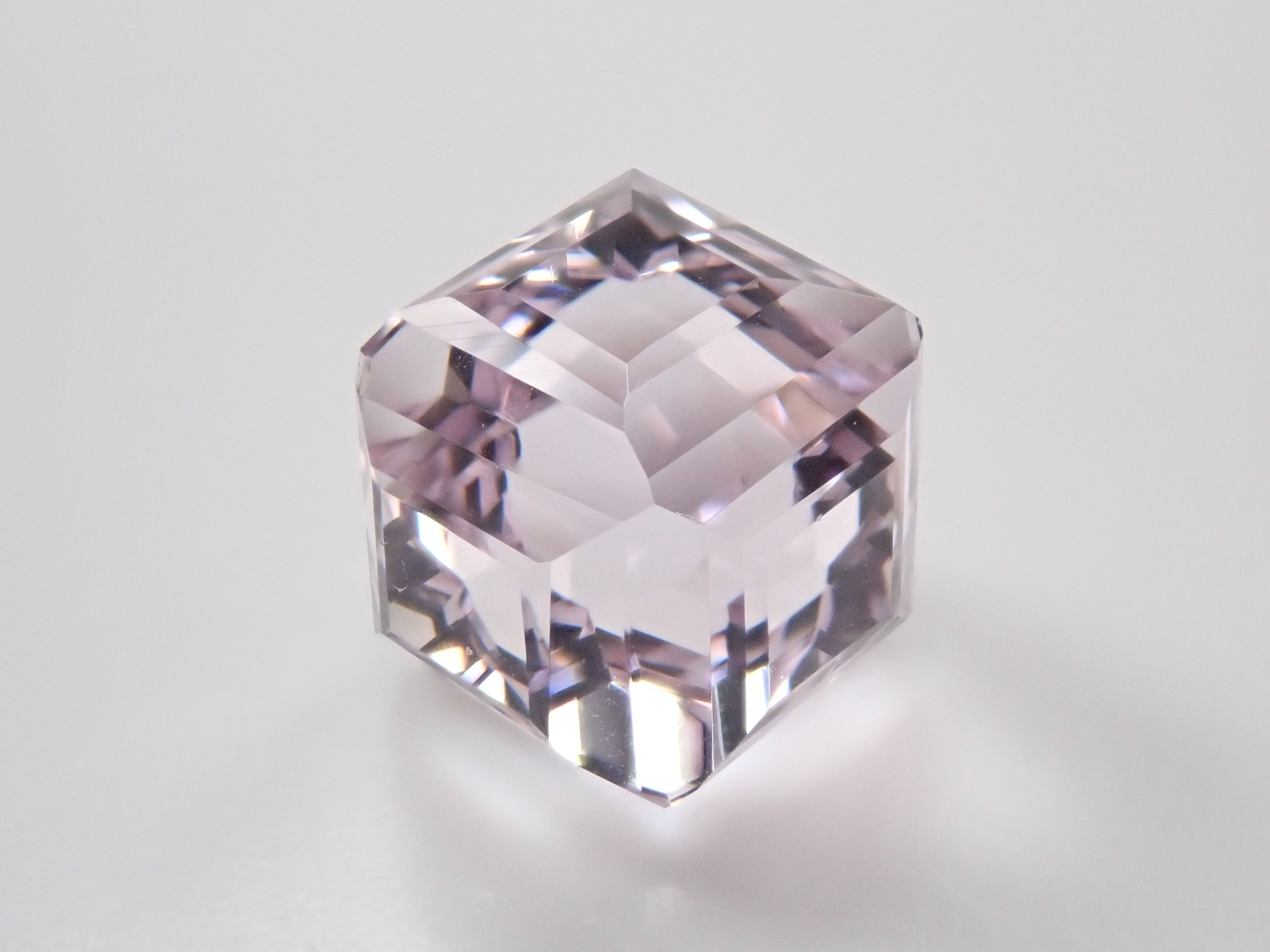 這是一顆立方體切割的紫水晶,顏色清新。也稱為粉紅紫水晶。