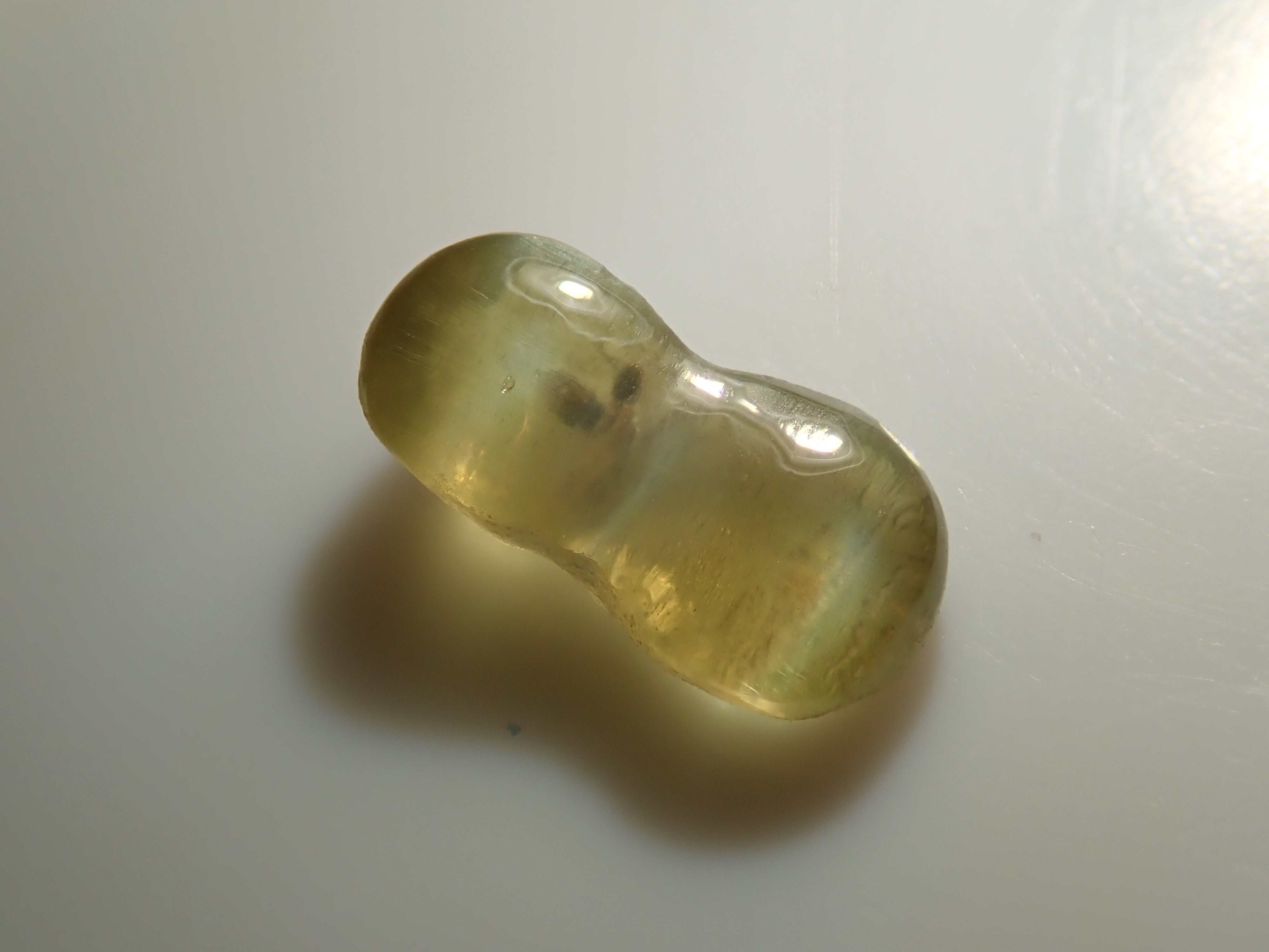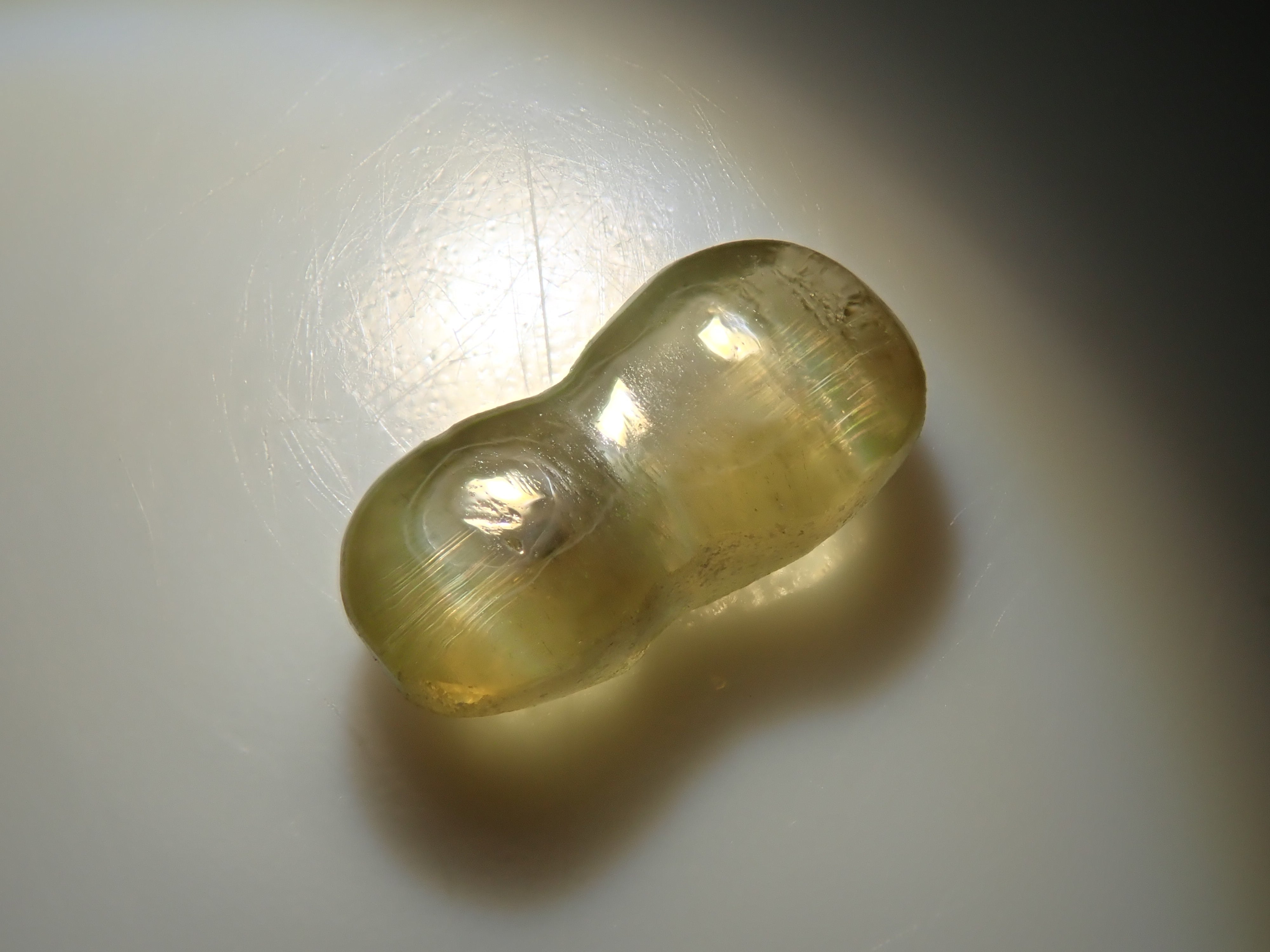 金綠寶石是一種有多種色調的寶石,從淺黃色到綠色再到深棕色。它是一種堅硬耐用的寶石。這是可以看到貓眼效果的類型,使用筆燈拍攝。石頭的背面基本上是未拋光的。